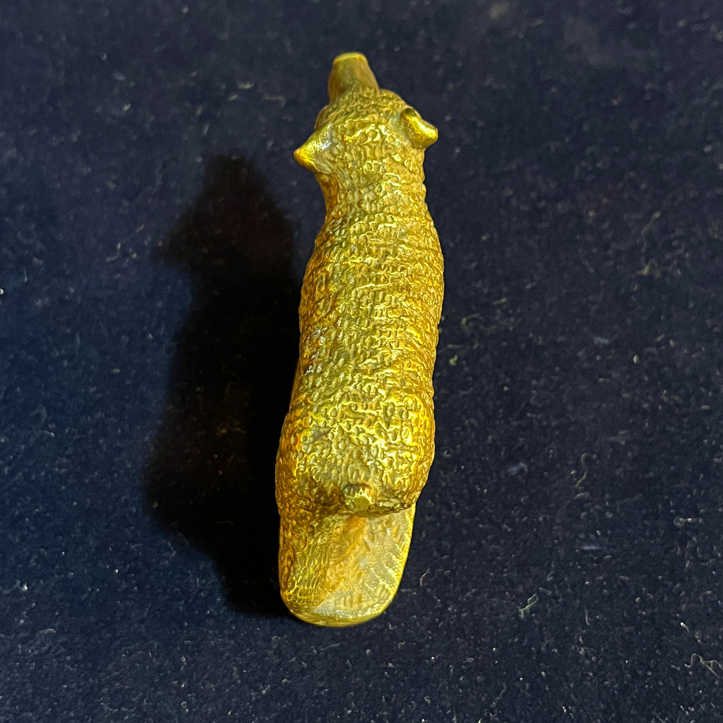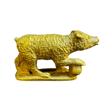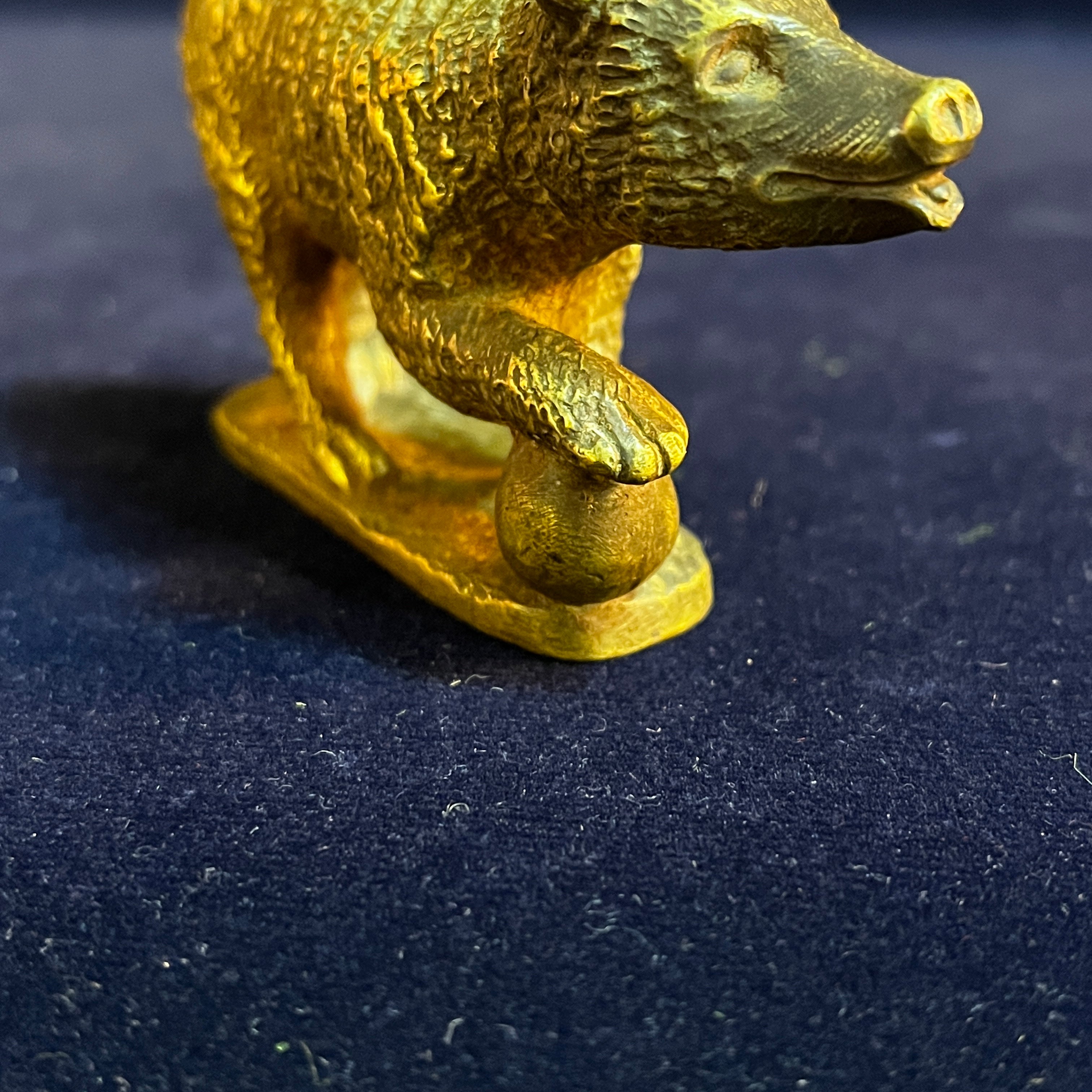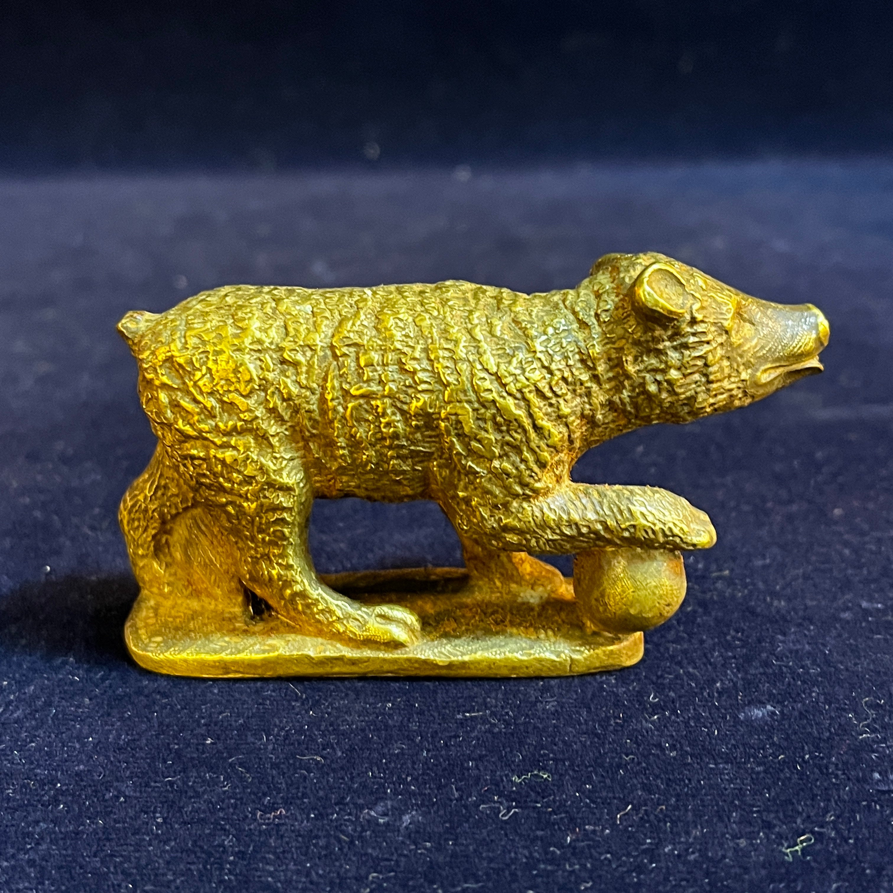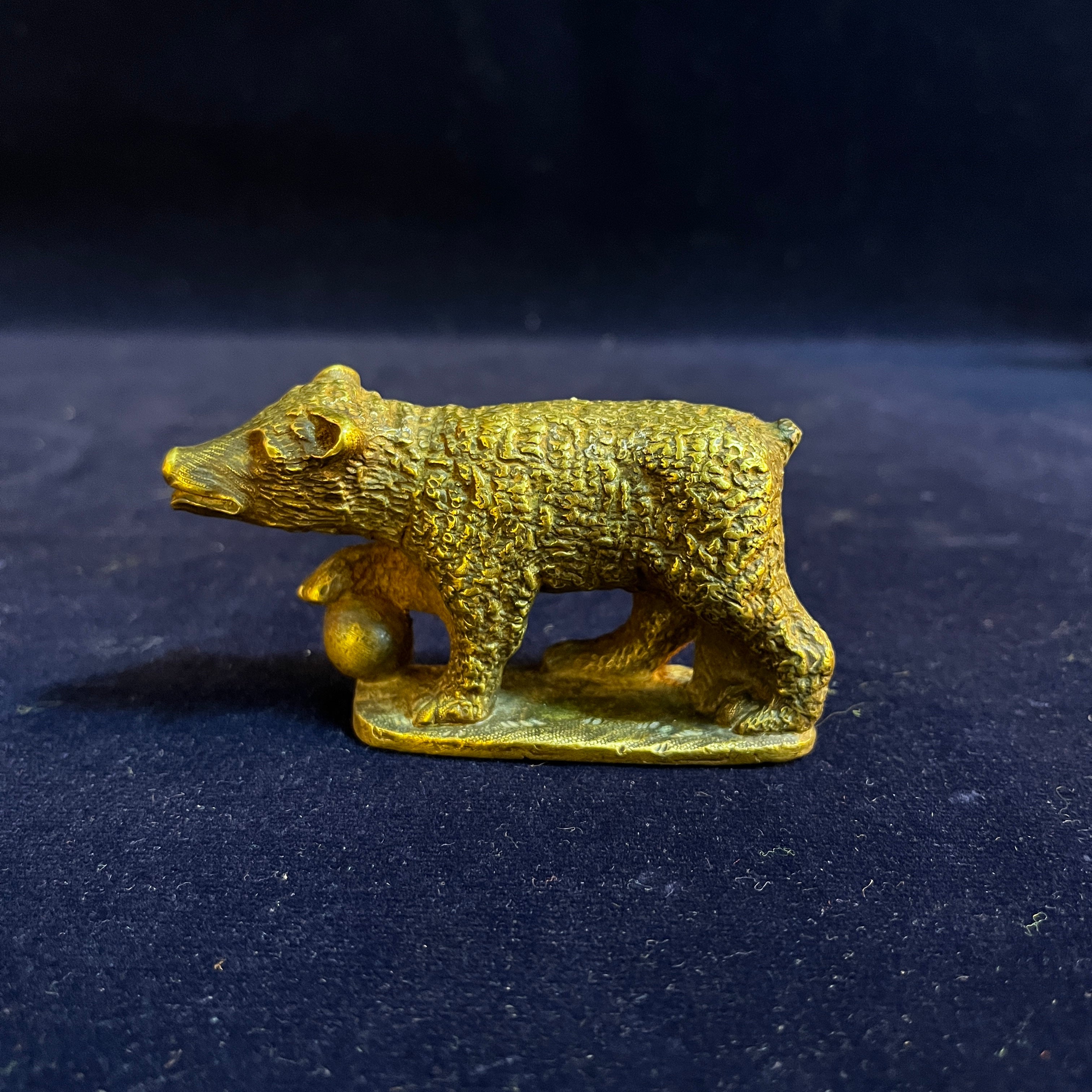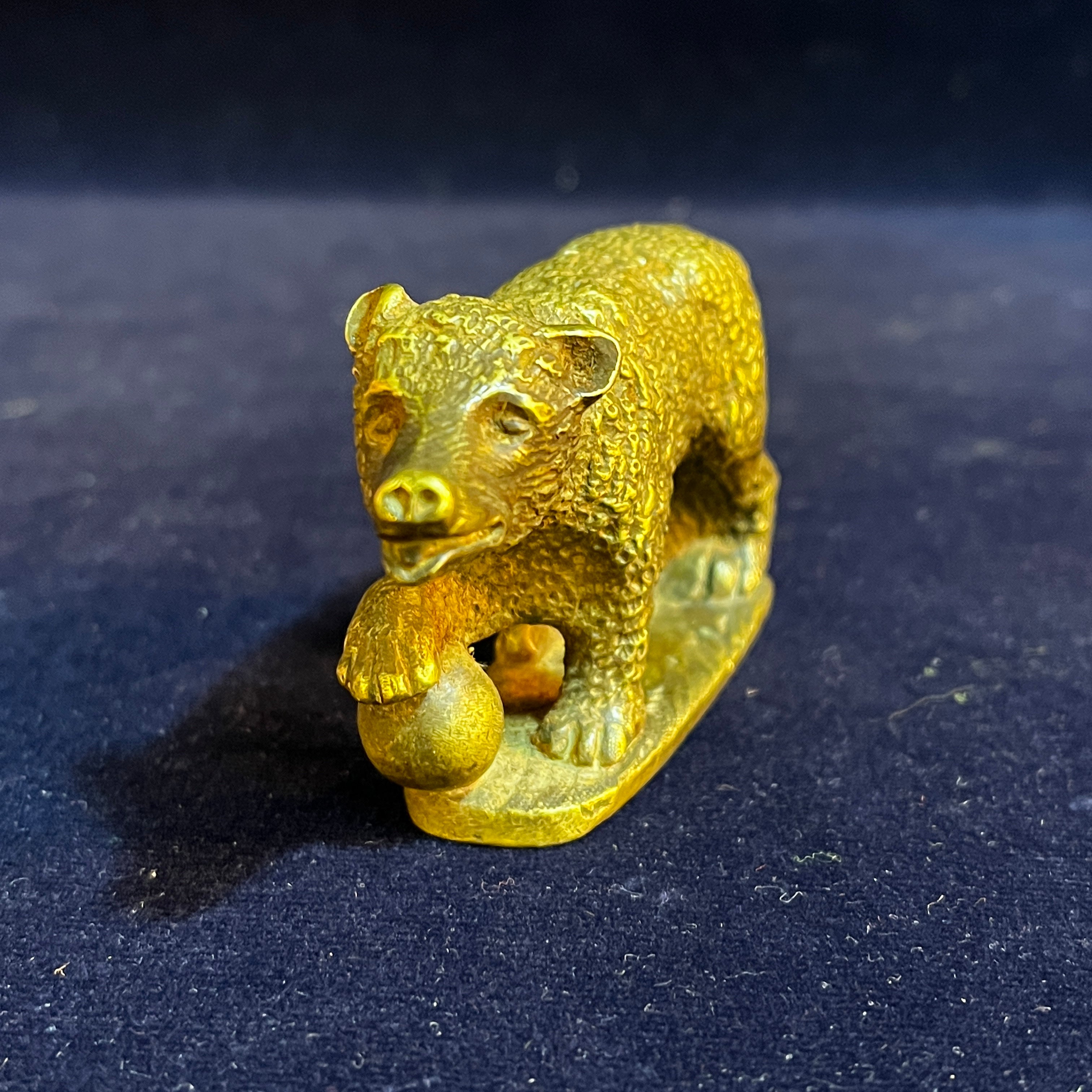 Linda figurita de bronce, de origen francés, representando a un oso jugando con una pelota. La figura captura los relieves y texturas del pelaje del animal, además de un gesto juguetón.