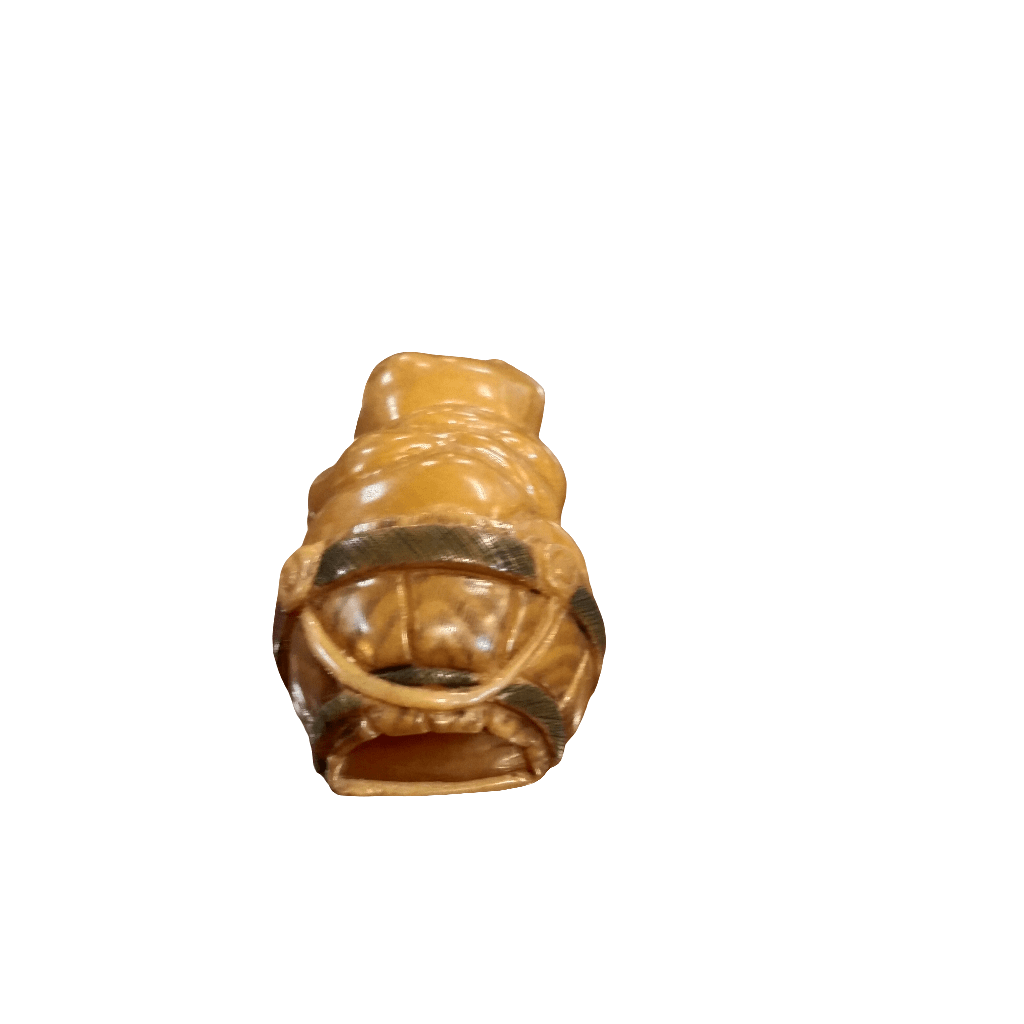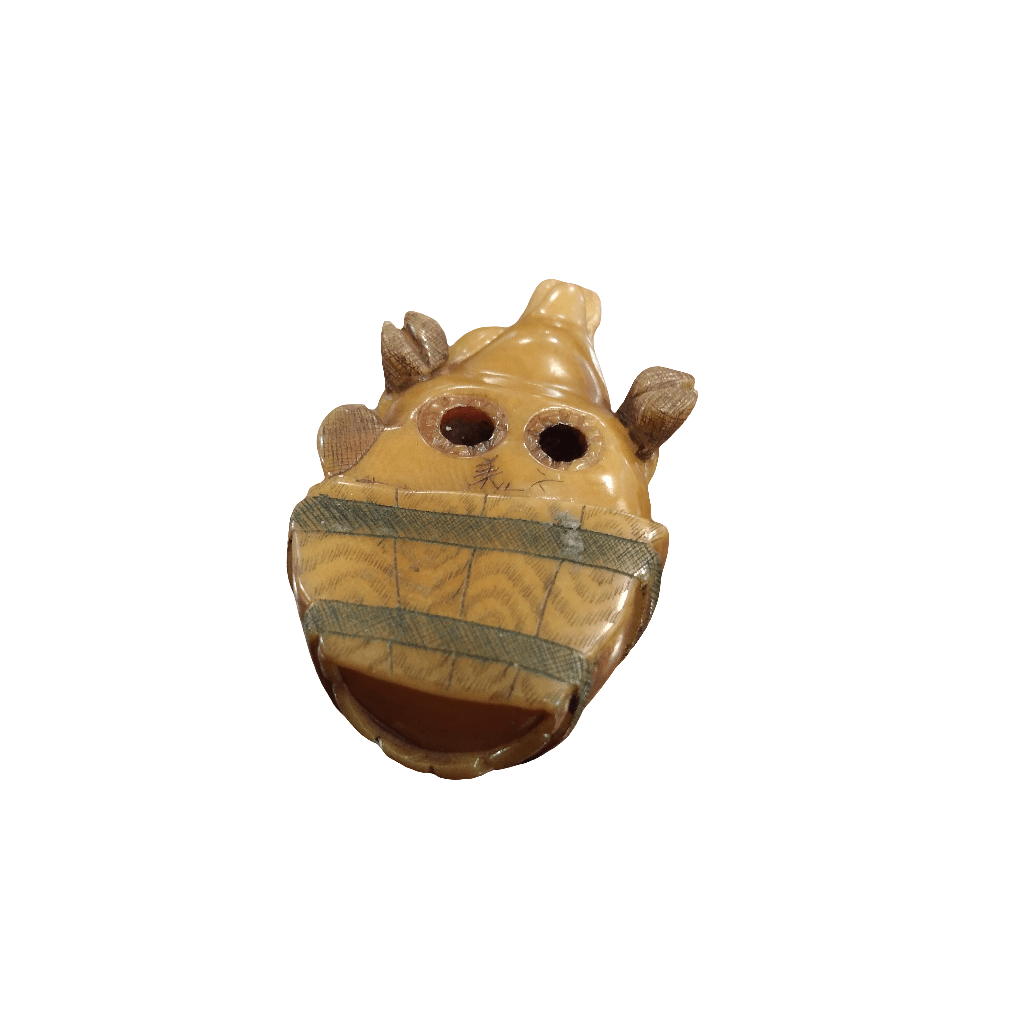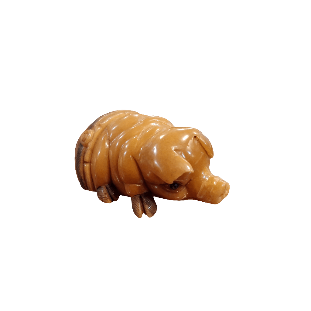 Preciosa figura Netsuke en madera, representando a un cerdo saliendo de un balde. La pieza está tallada detalladamente y tiene las características tradicionales de este singular objeto de la cultura japonesa, cómo su inscripción y sus dos hoyitos para colgarlo al kimono.