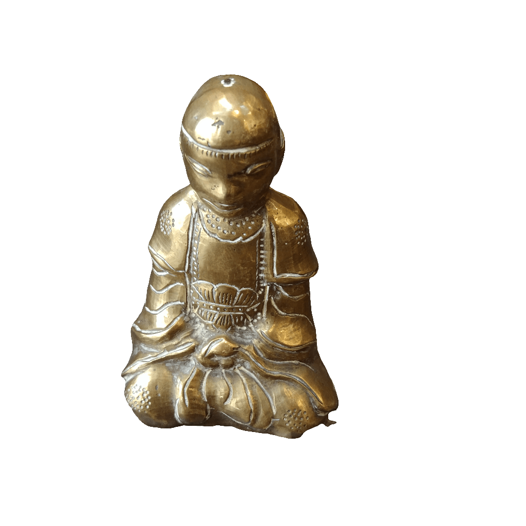 Bella figura en bronce de un monje meditando. Tiene un elegante terminado dorado y detalles tallados a mano.