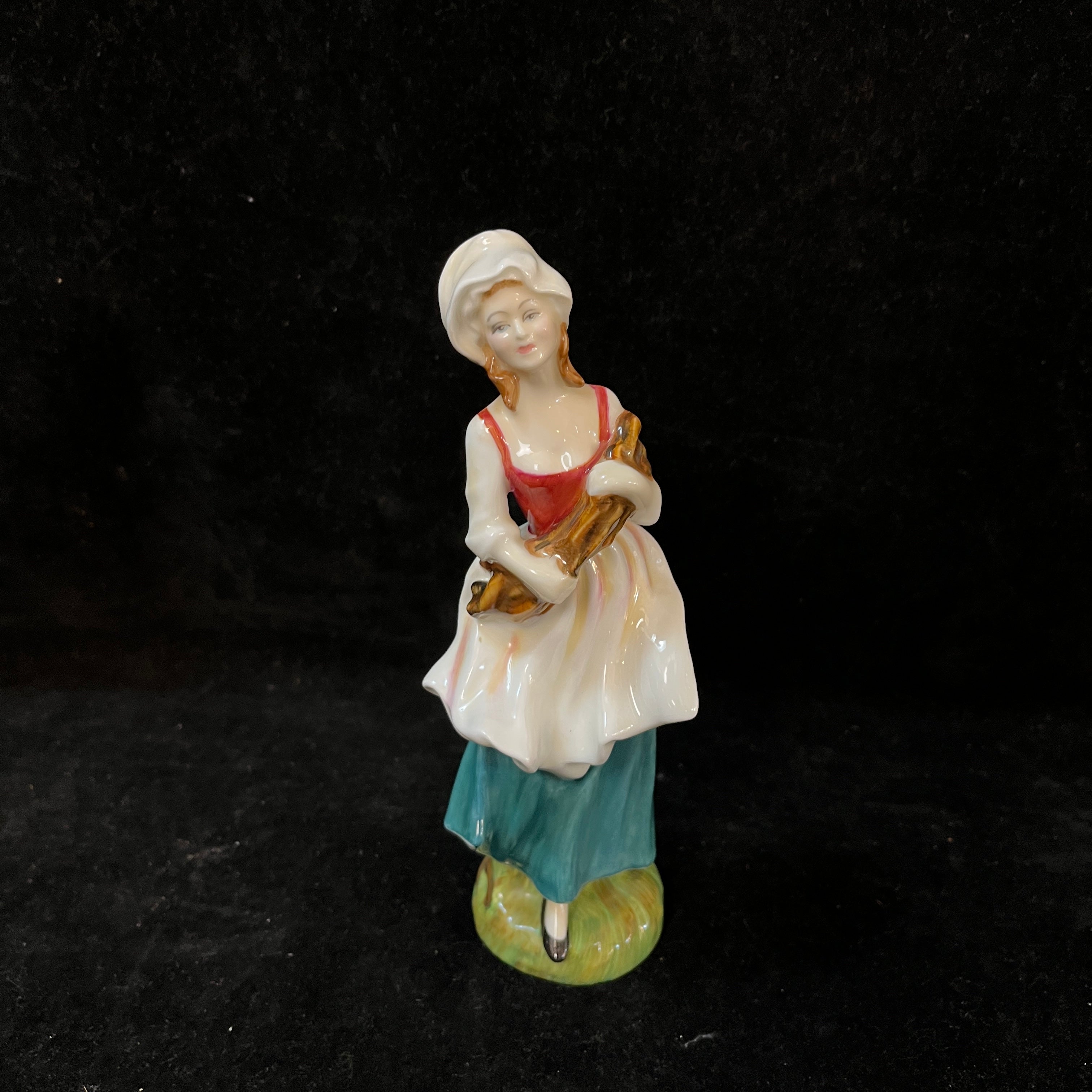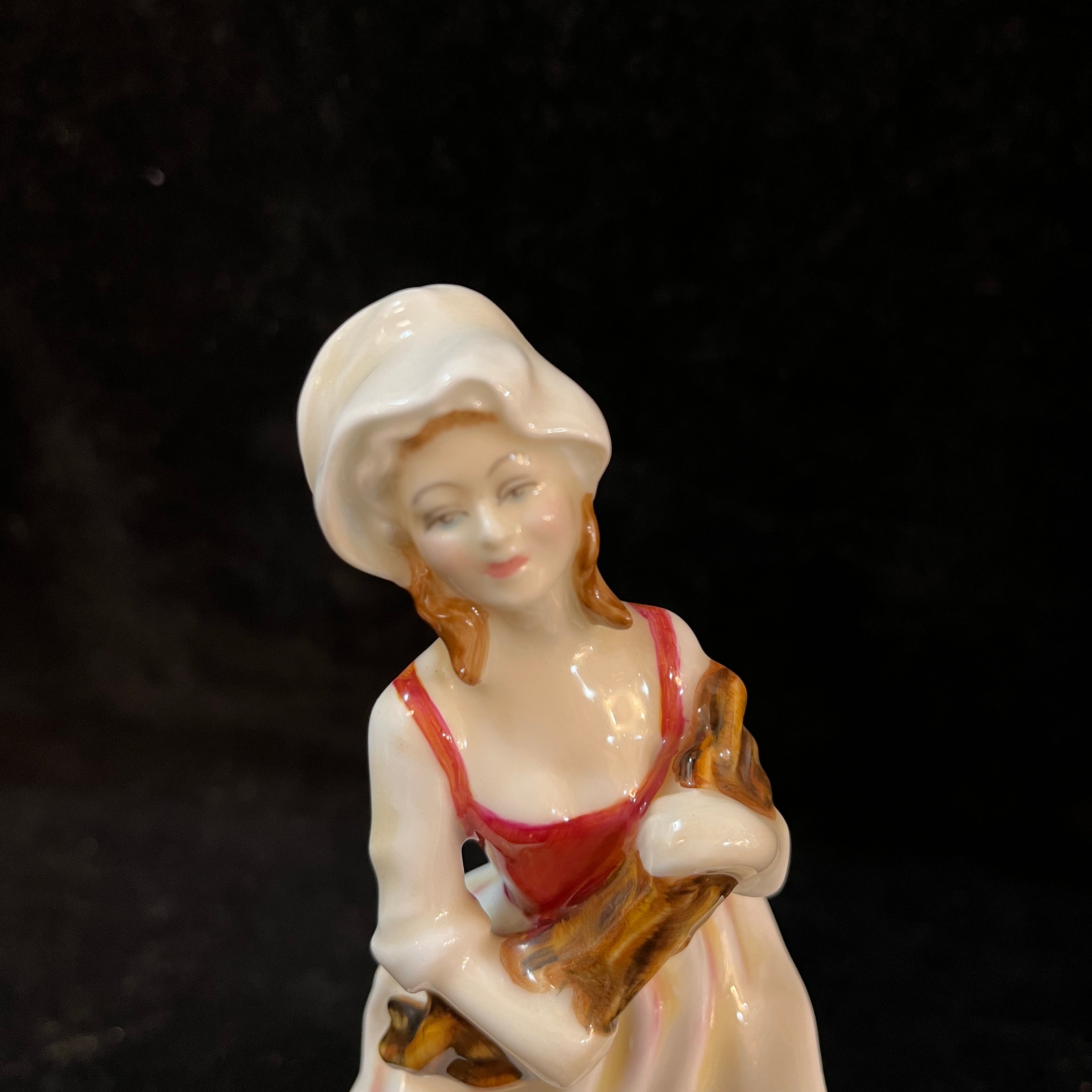 Bella figura inglesa de la famosa marca de porcelana Royal Doulton, representando a Lizzie, una mujer campesina llevando un tronco en sus brazos.