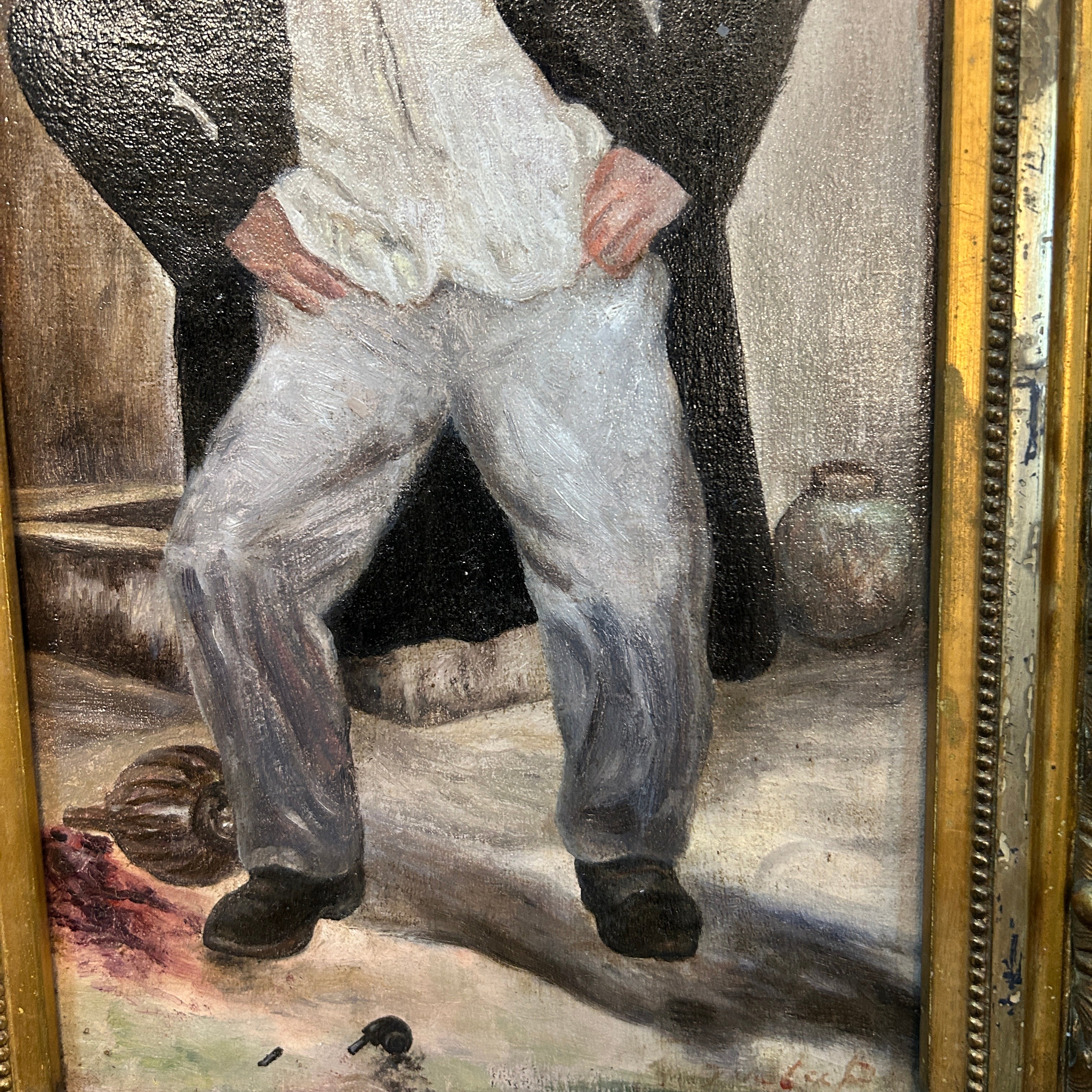 Jocosa y fresca pintura de un hombrecillo algo bebido posando y disfrutando el momento. La escena nos muestra una imagen novedosa y peculiar de una situación atemporal y sin un espacio definido. Lo atractivo de esta pintura es su liviandad y realismo en si. Podemos ver al hombre con una garrafa de vino vertida a sus pies, muy sonriente con las manos en la cintura sin intención de aparentar nada, sólo siendo él.