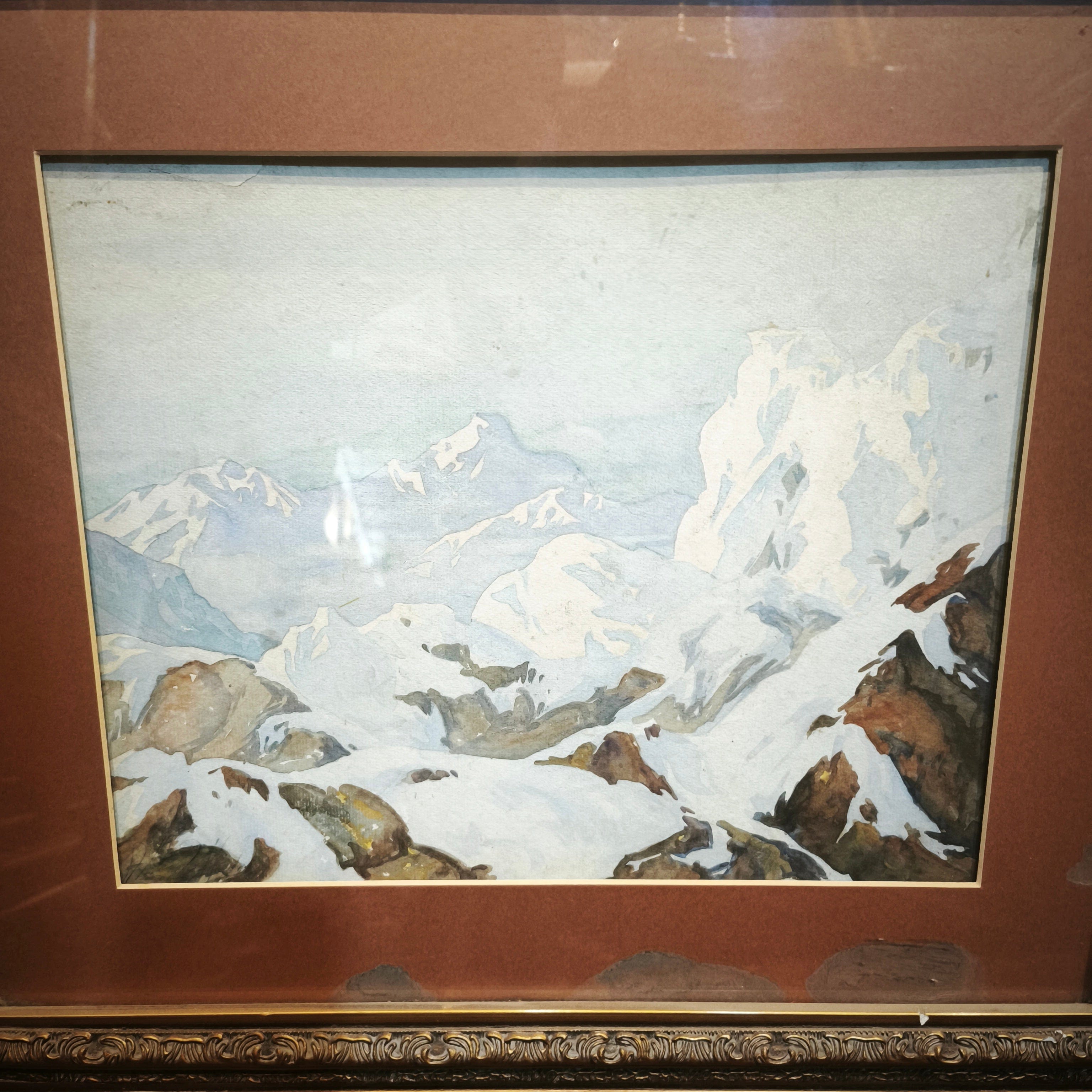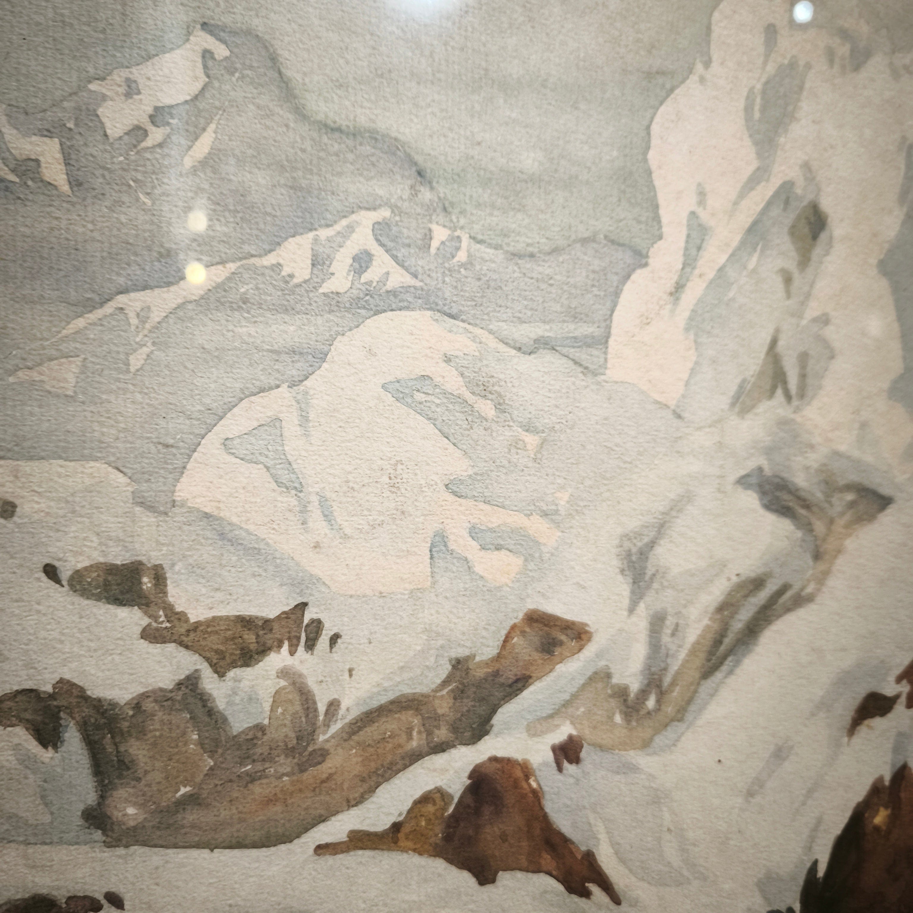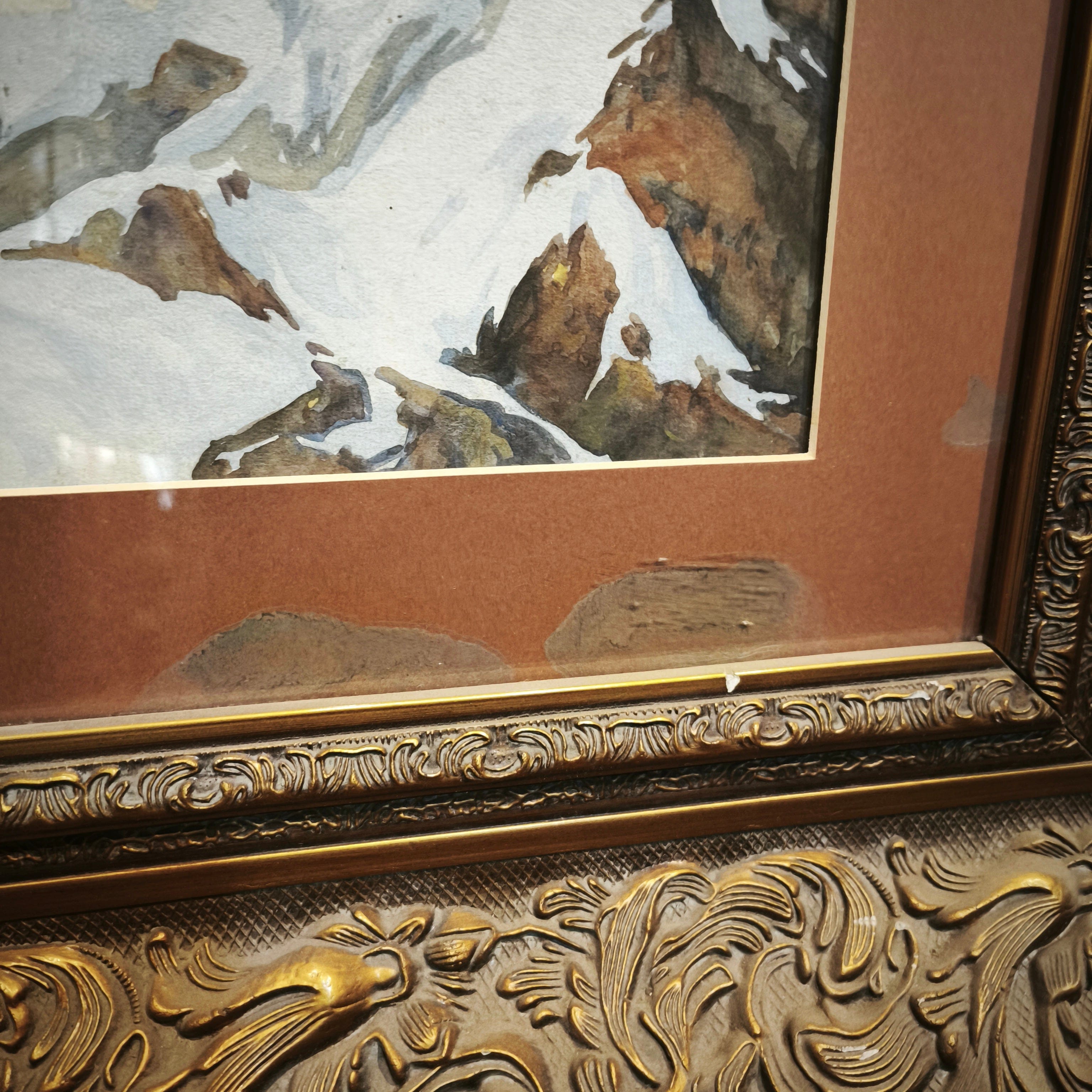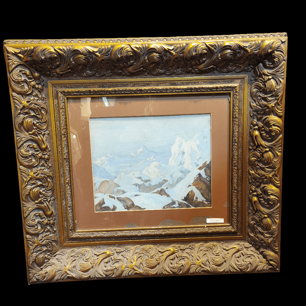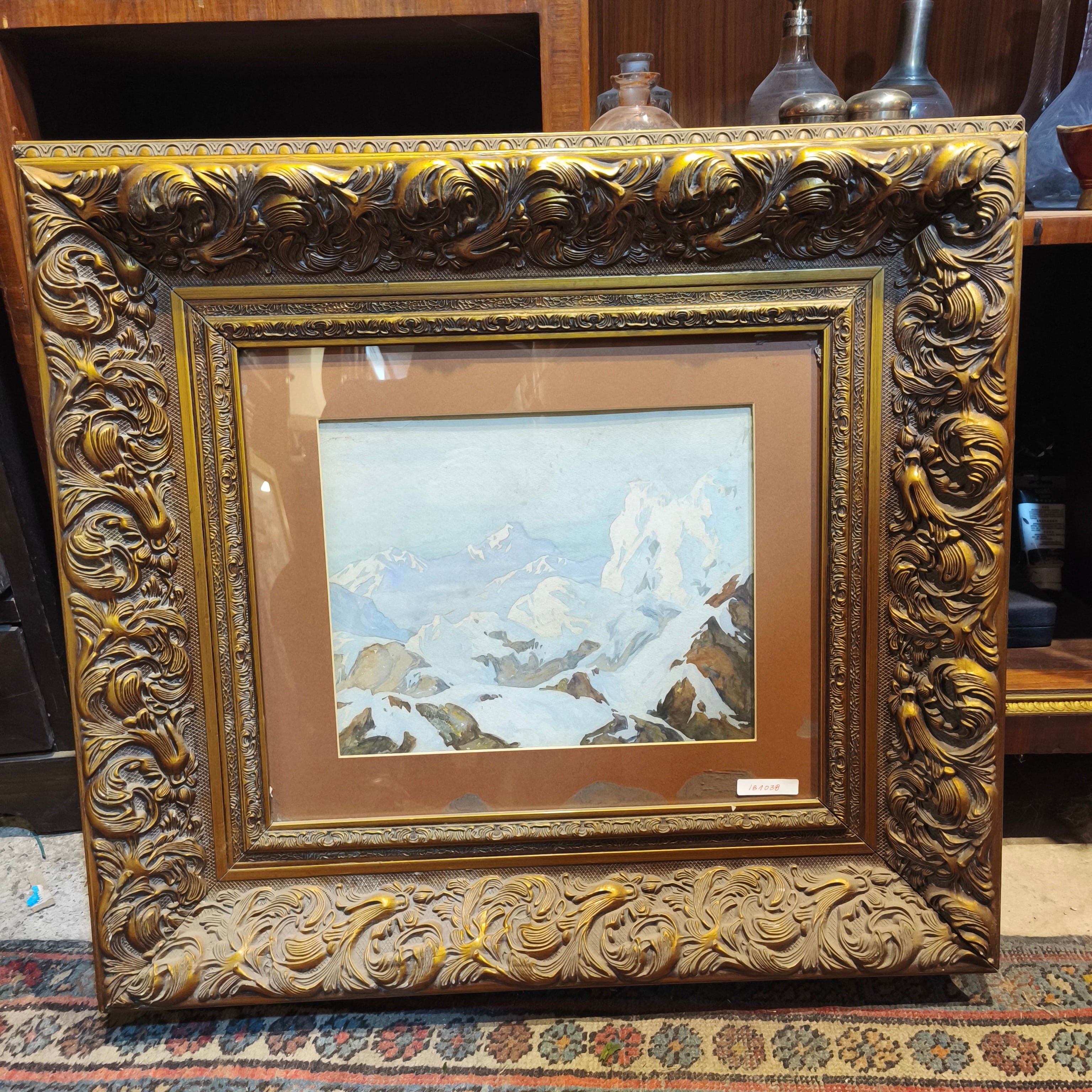 Acuarela en técnica Wash sobre papel, de firma ilegible y origen Europeo, representando un majestuoso paisaje montañoso Europeo con crestas nevadas que se pierden hasta el horizonte, pudiendo tratarse de los Alpes. La obra tiene un robusto marco de madera tallada en exquisitos relieves y terminada con una pintura dorada, que le entrega mucho carácter a la pieza.
