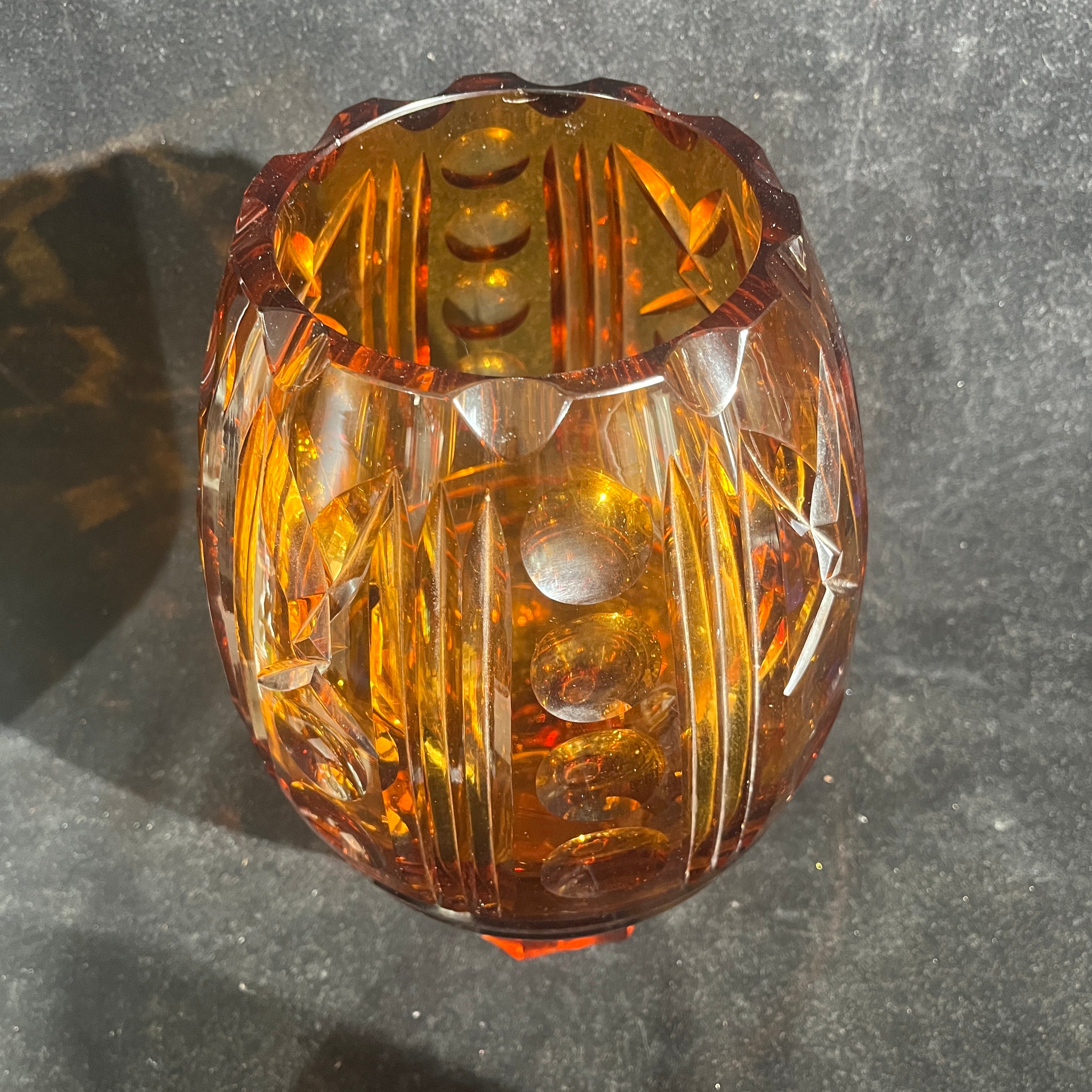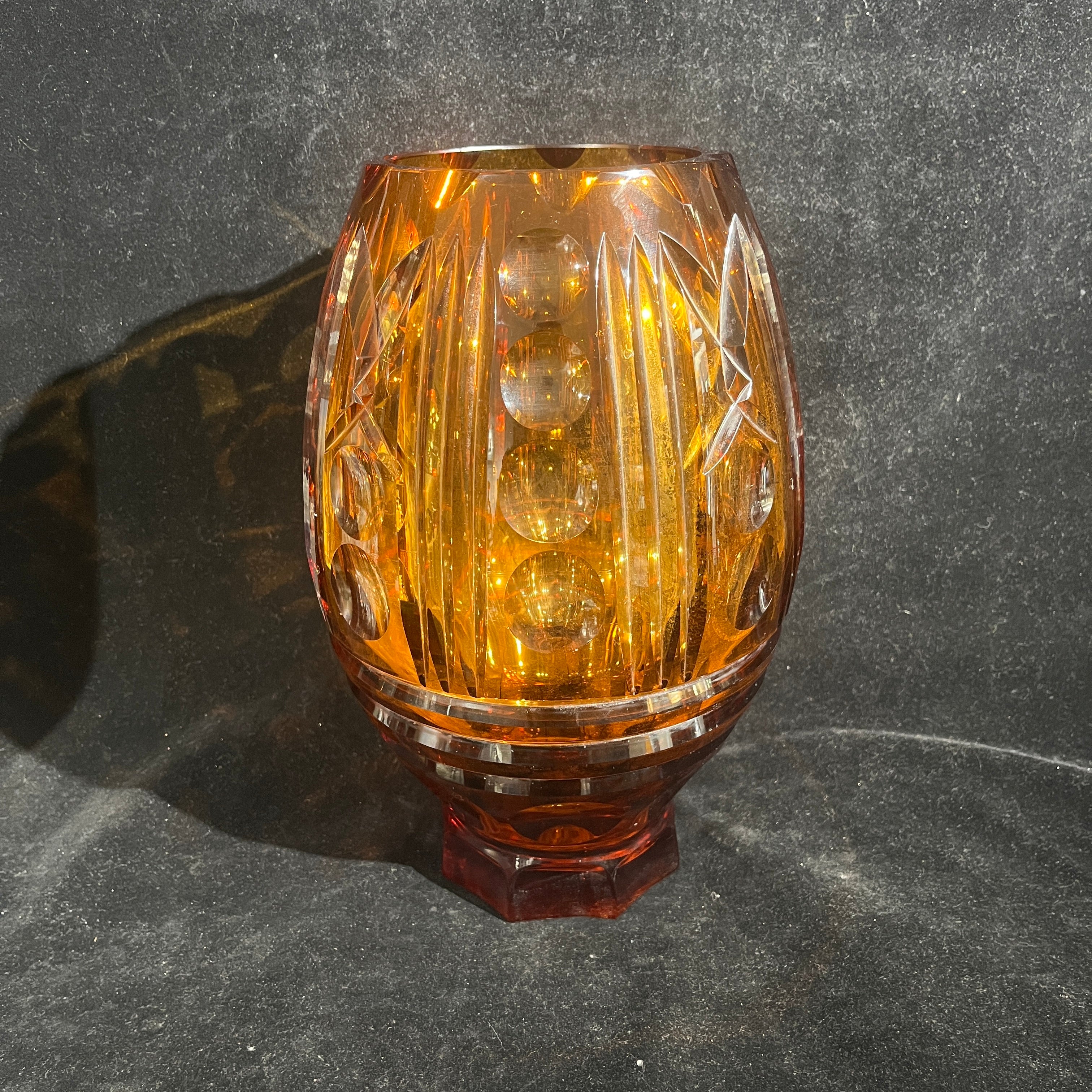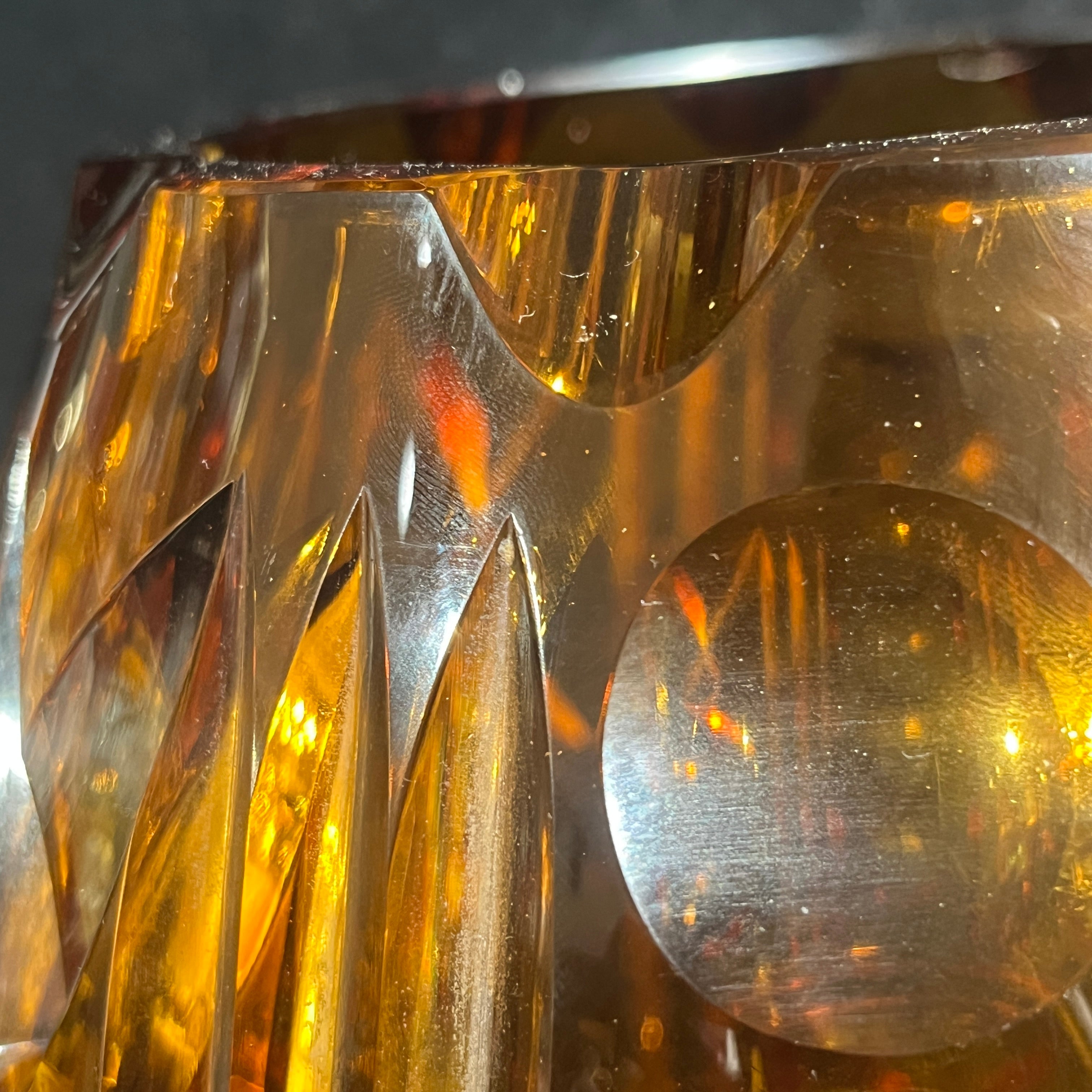 Espectacular florero de origen europeo posible s. XX hecho de vidrio de color ámbar, tallado en molde con patrones geométricos. El diseño, que mezcla lías rectas y esferas, hace un degradé entre un tono más claro de ámbar, transitando a un color rojizo más oscuro en su base de corte hexagonal, que hace un interesante contrapunto con su cuerpo curvo.