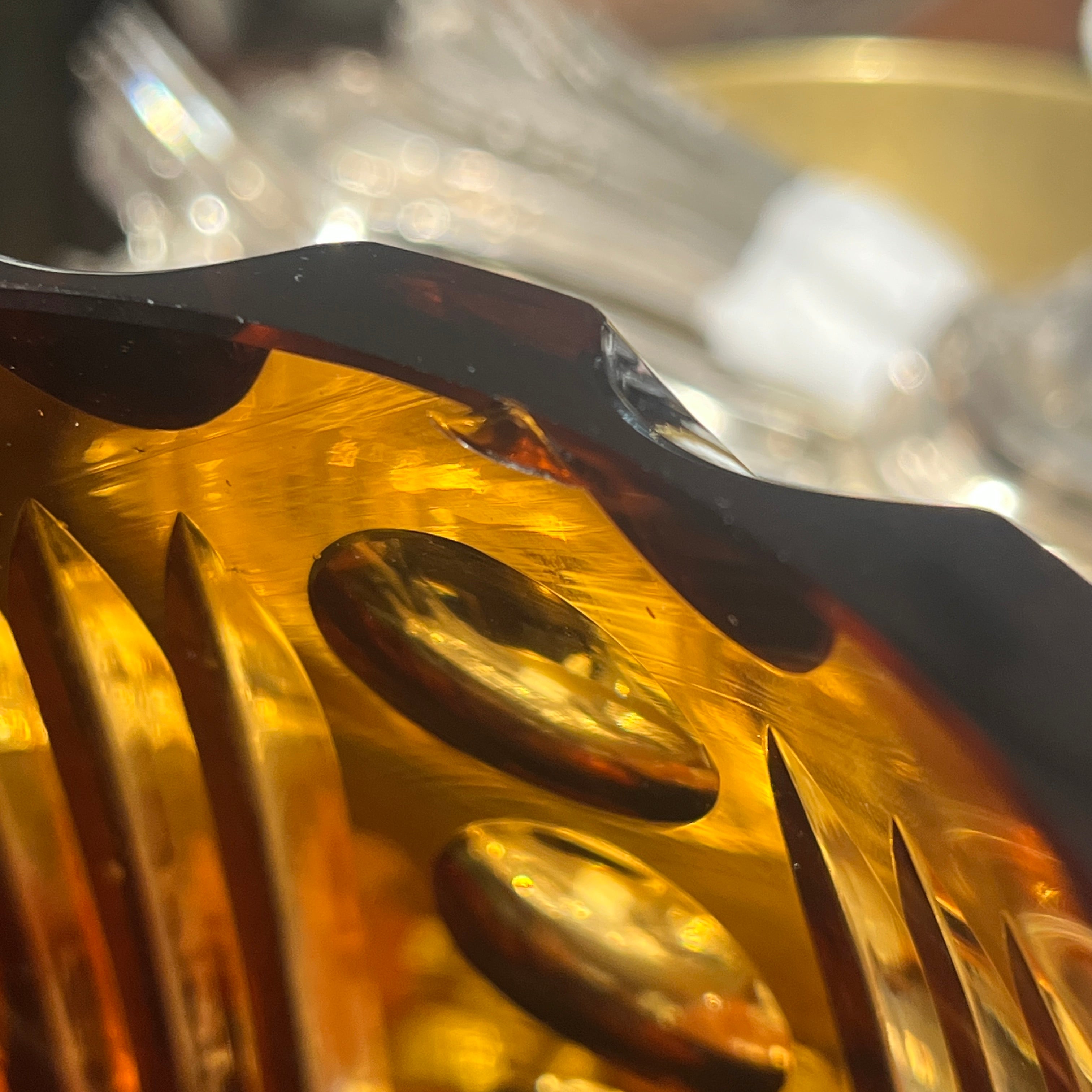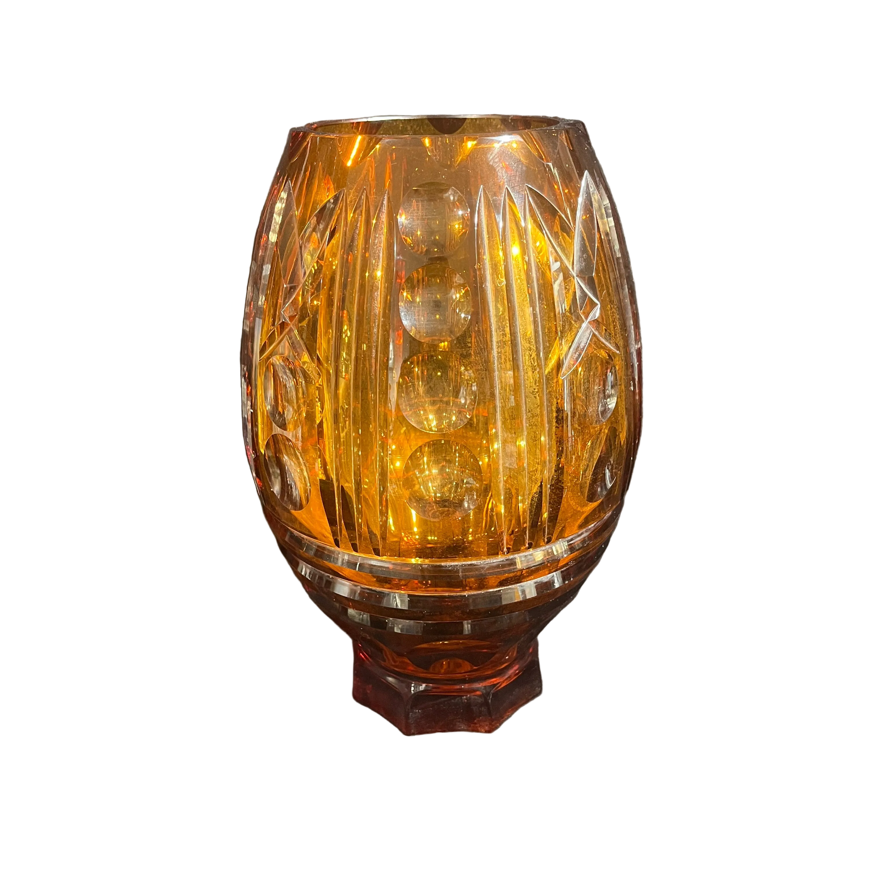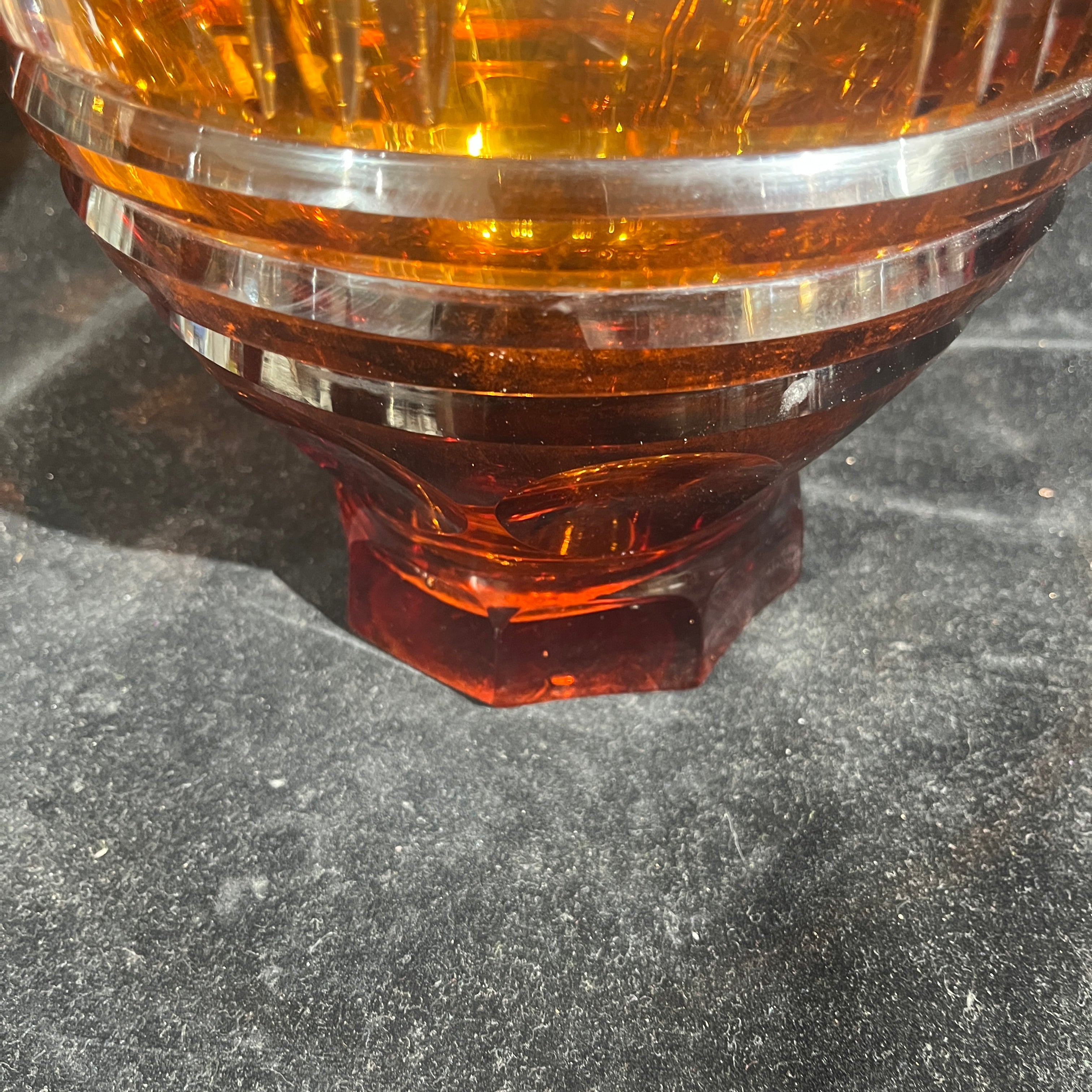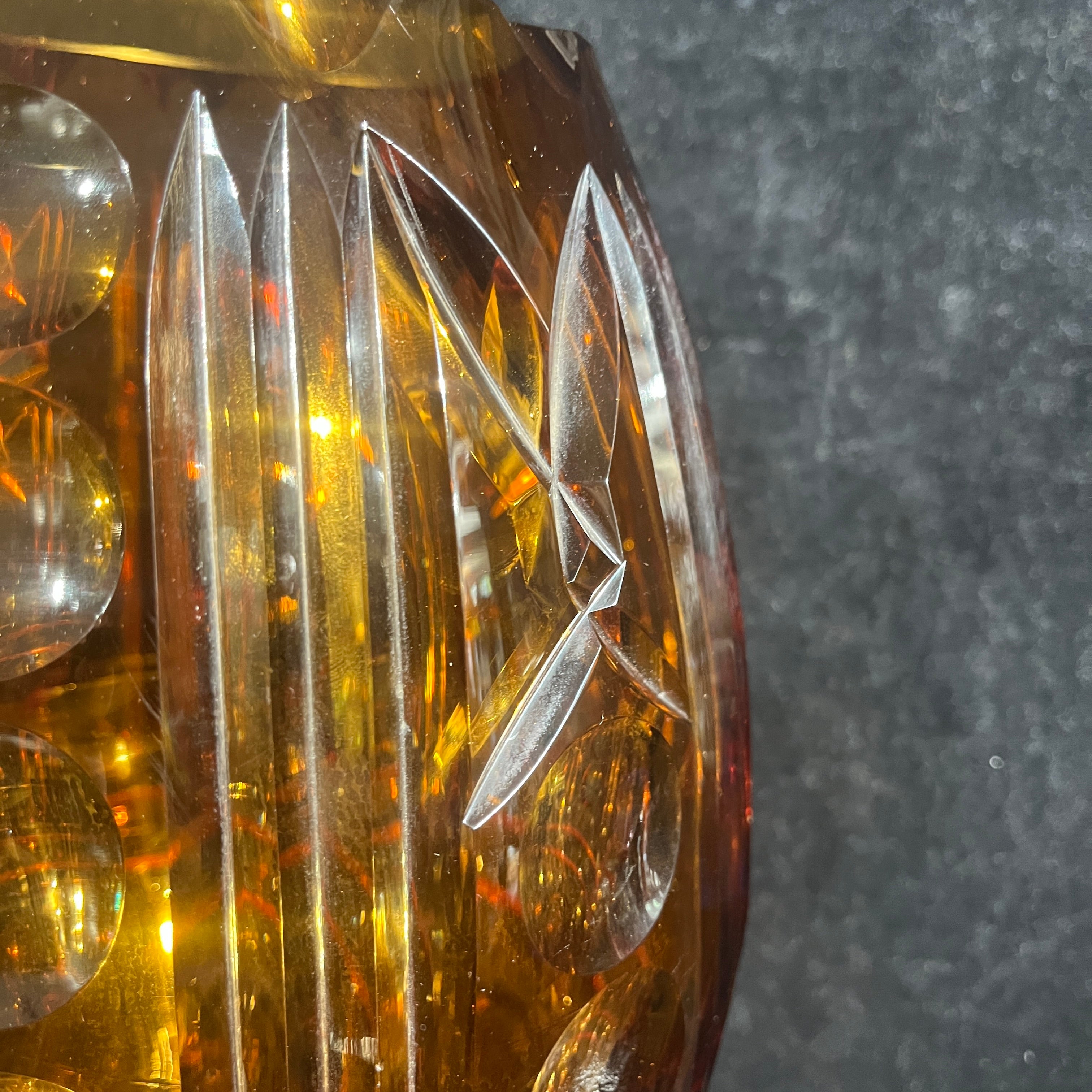 Espectacular florero de origen europeo posible s. XX hecho de vidrio de color ámbar, tallado en molde con patrones geométricos. El diseño, que mezcla lías rectas y esferas, hace un degradé entre un tono más claro de ámbar, transitando a un color rojizo más oscuro en su base de corte hexagonal, que hace un interesante contrapunto con su cuerpo curvo.