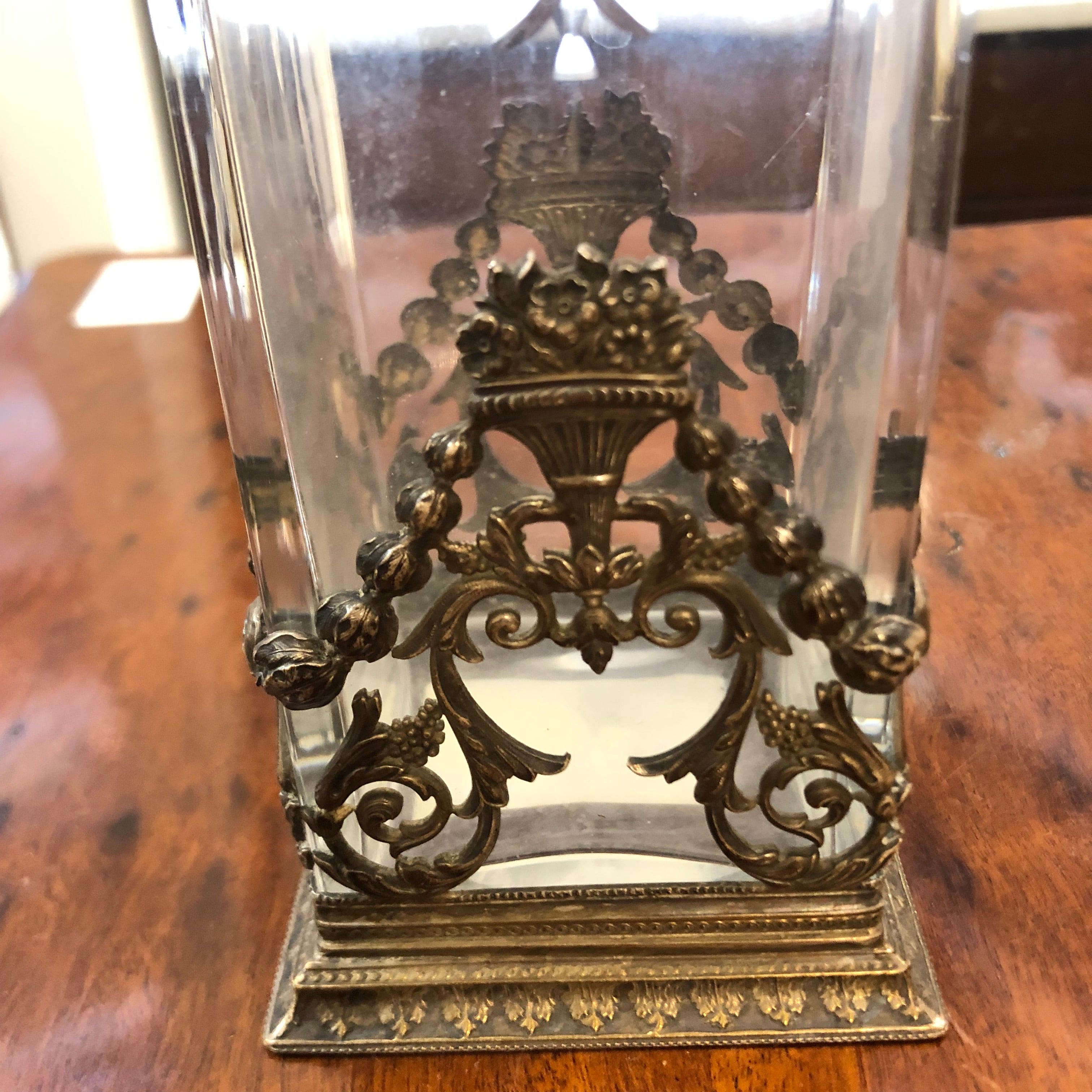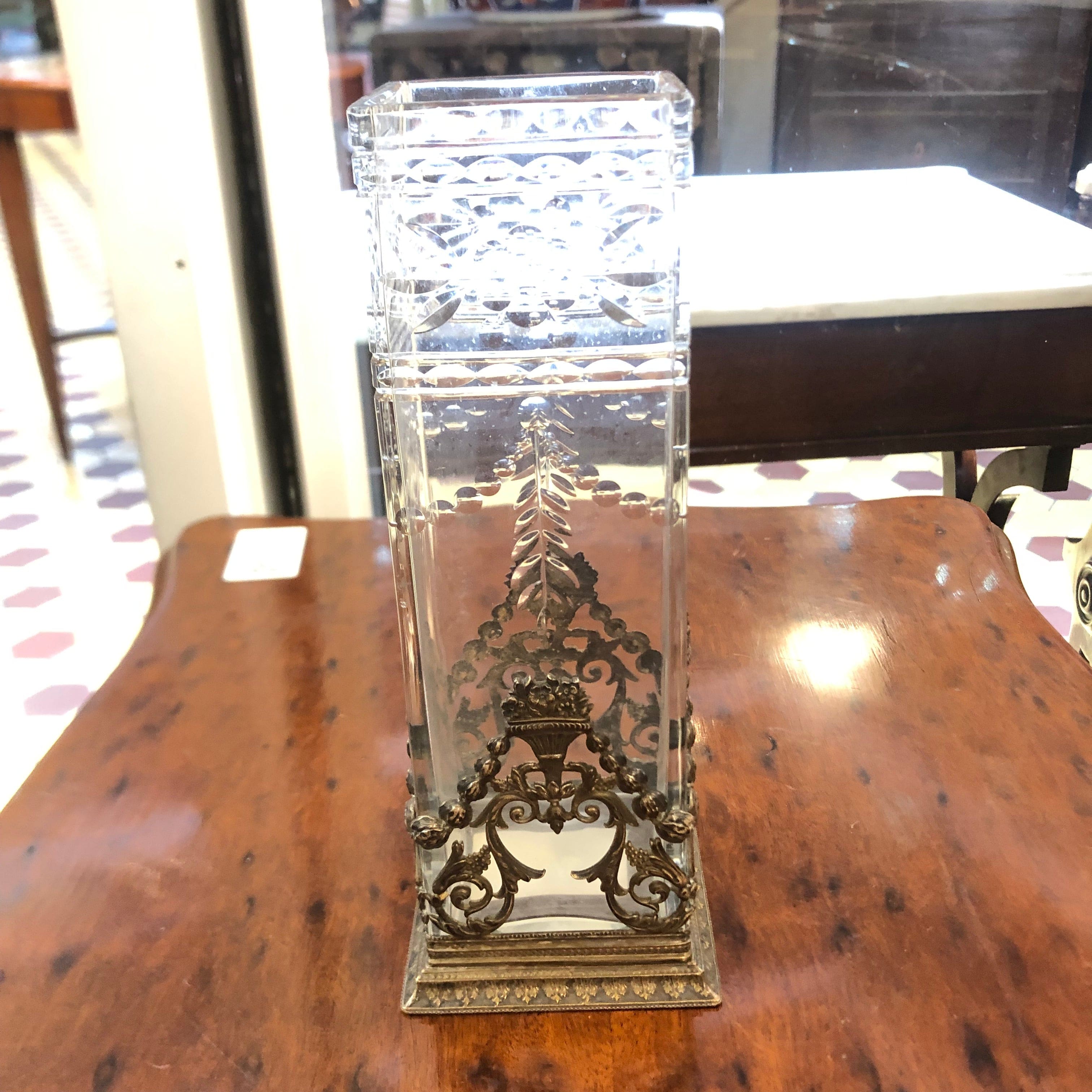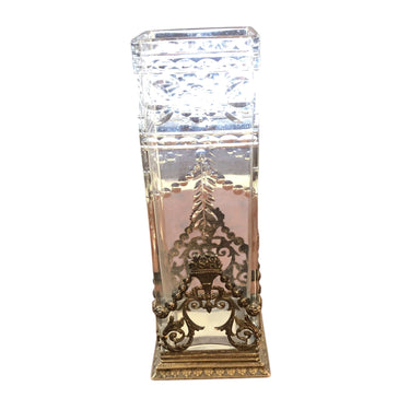 Llamativo florero rectangular hecho de vidrio tallado con una base de estaño y bellos decorados florales, también en estaño.