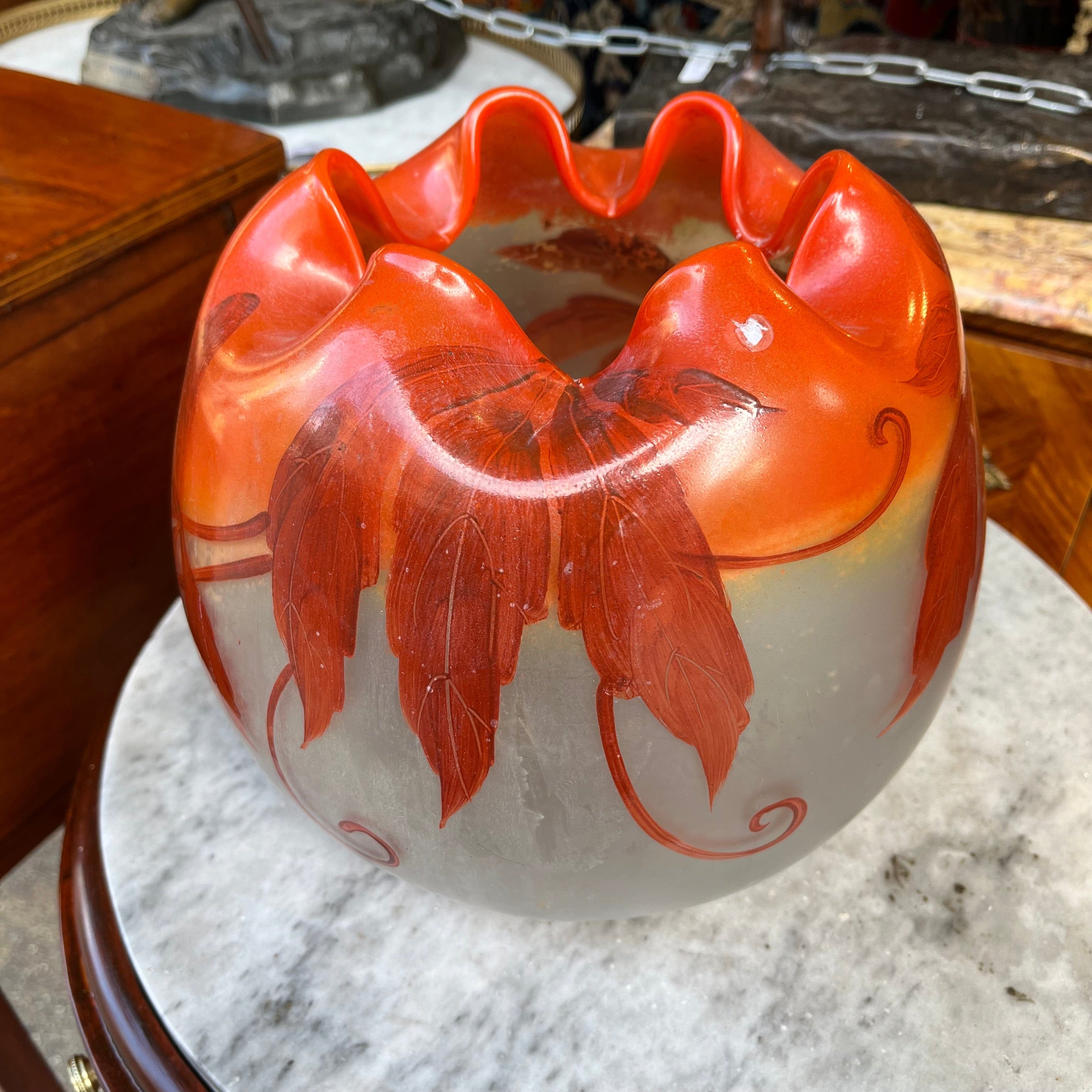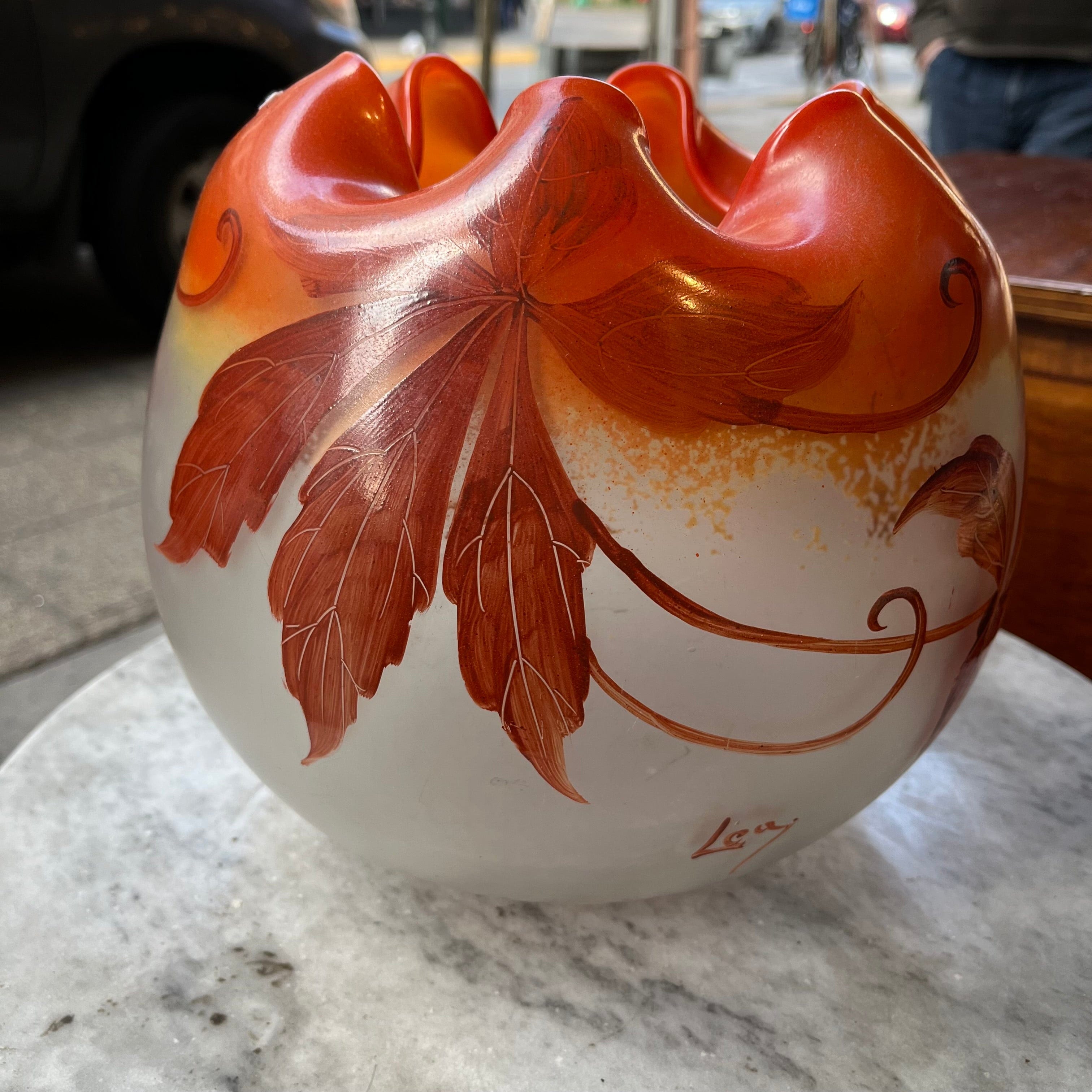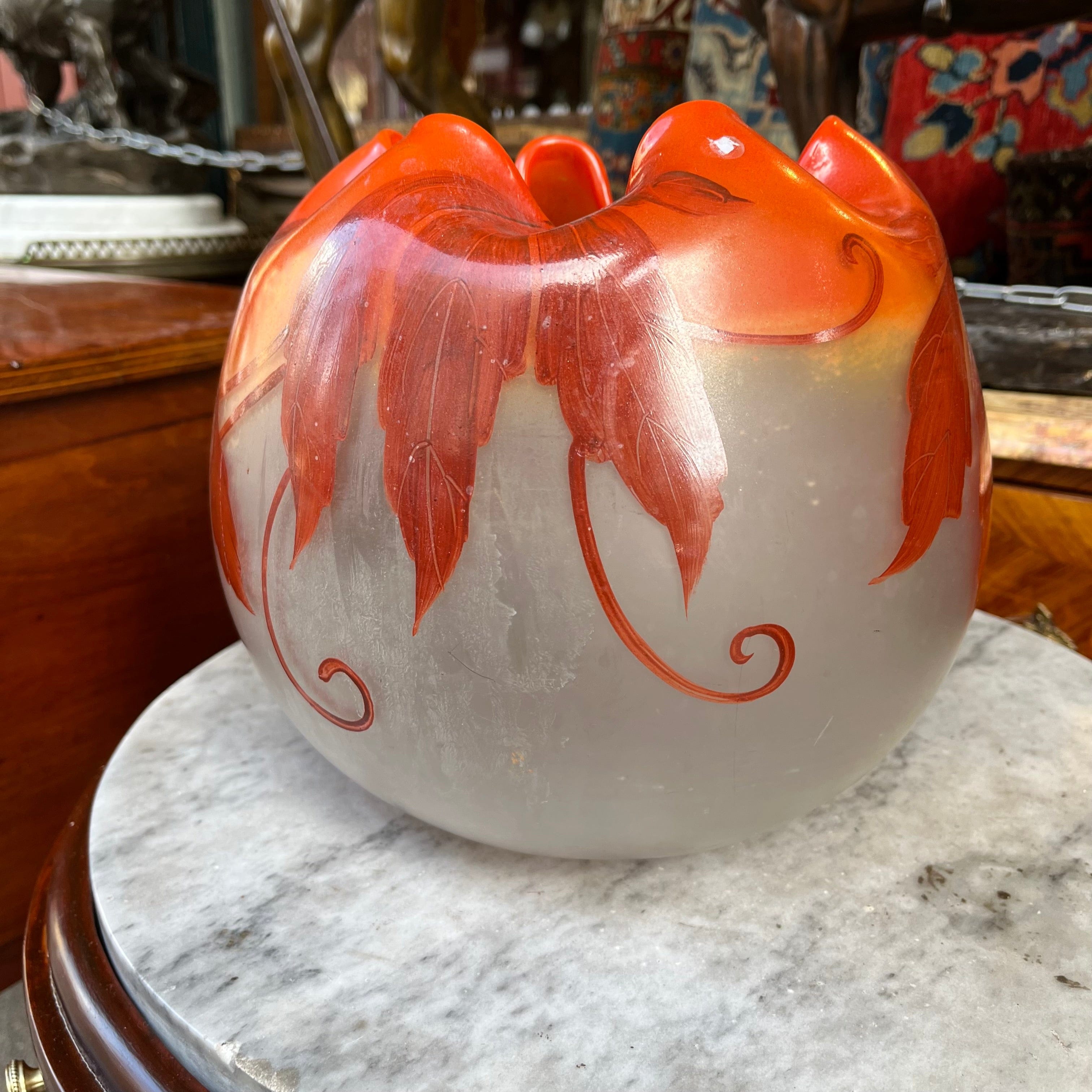 Bellísimo florero, de origen francés, hecho de vidrio opalino blanco y naranja con decoración pintada en motivos vegetales, como hojas otoñales. La pieza está firmada por François Théodore Legras (1839-1916), artista y maestro vidriero francés, destacado exponente las corrientes decorativas de Art Nouveau y Art Decó.