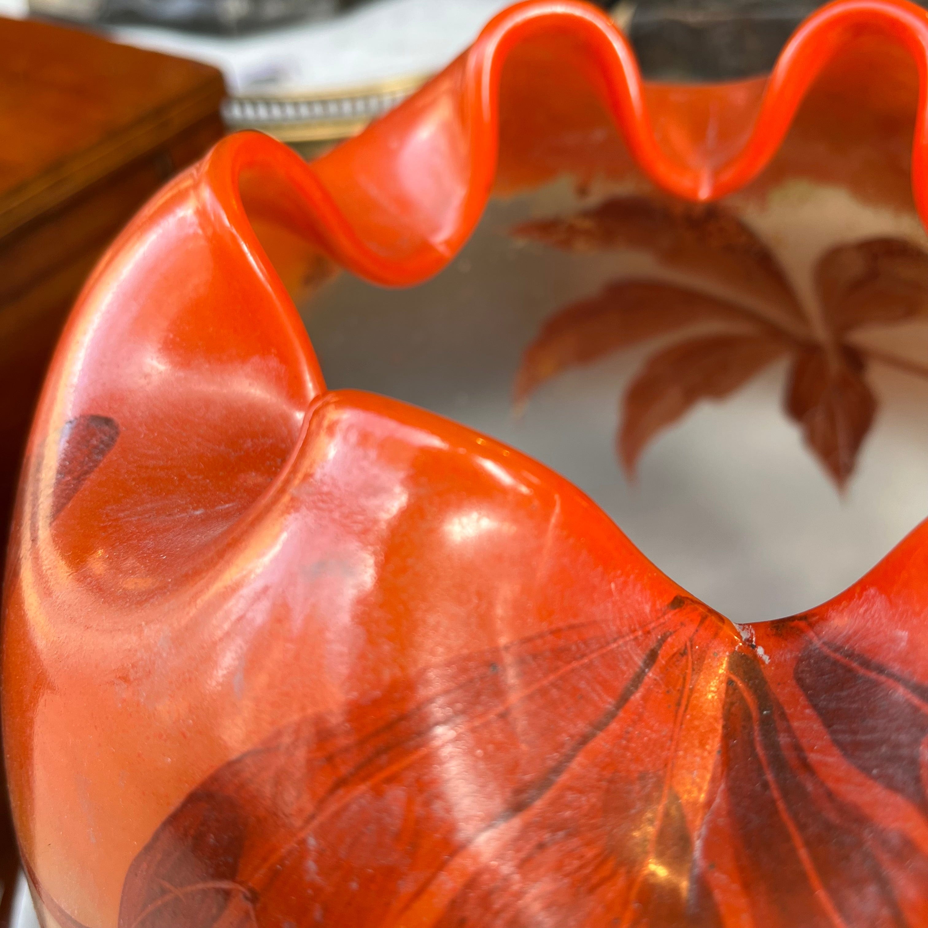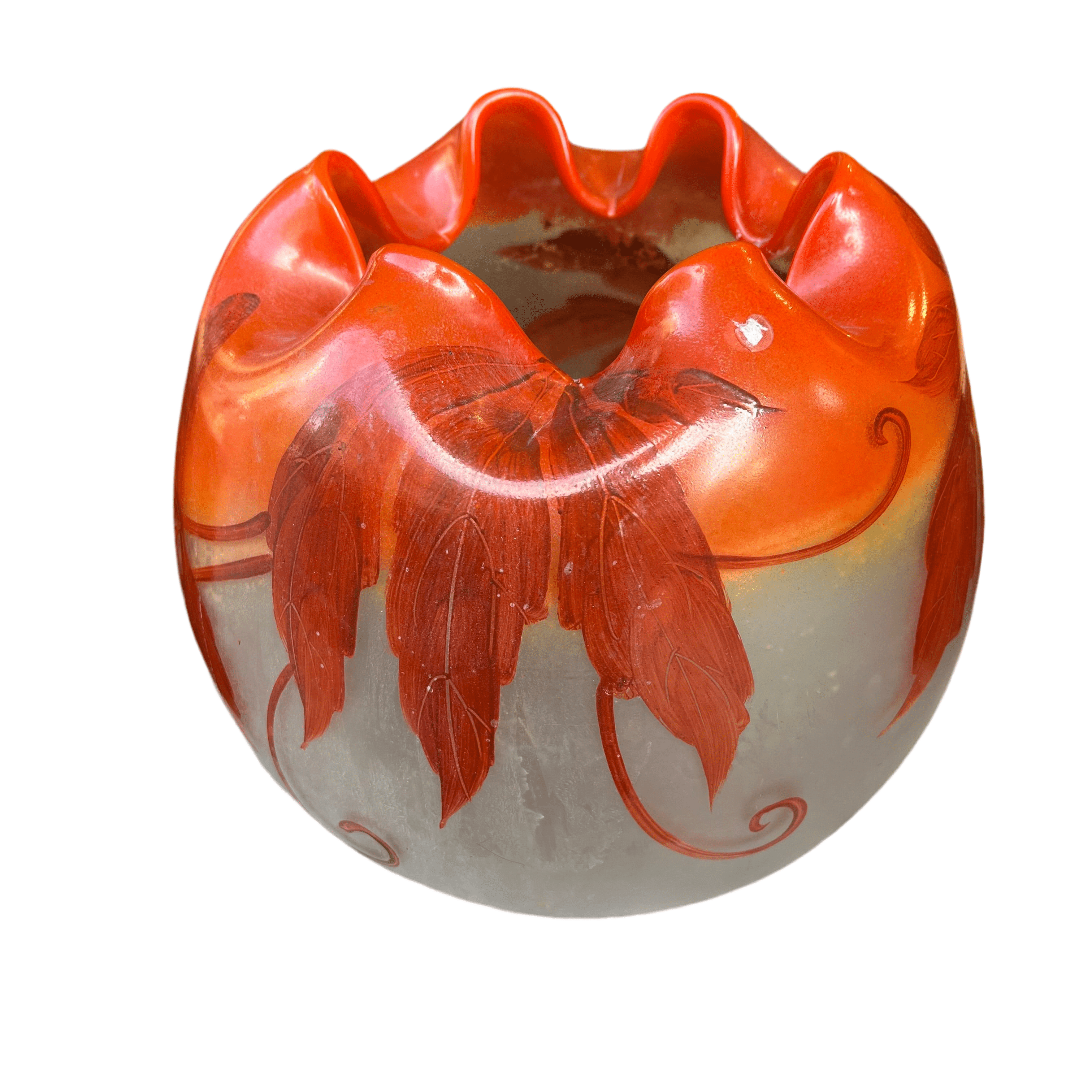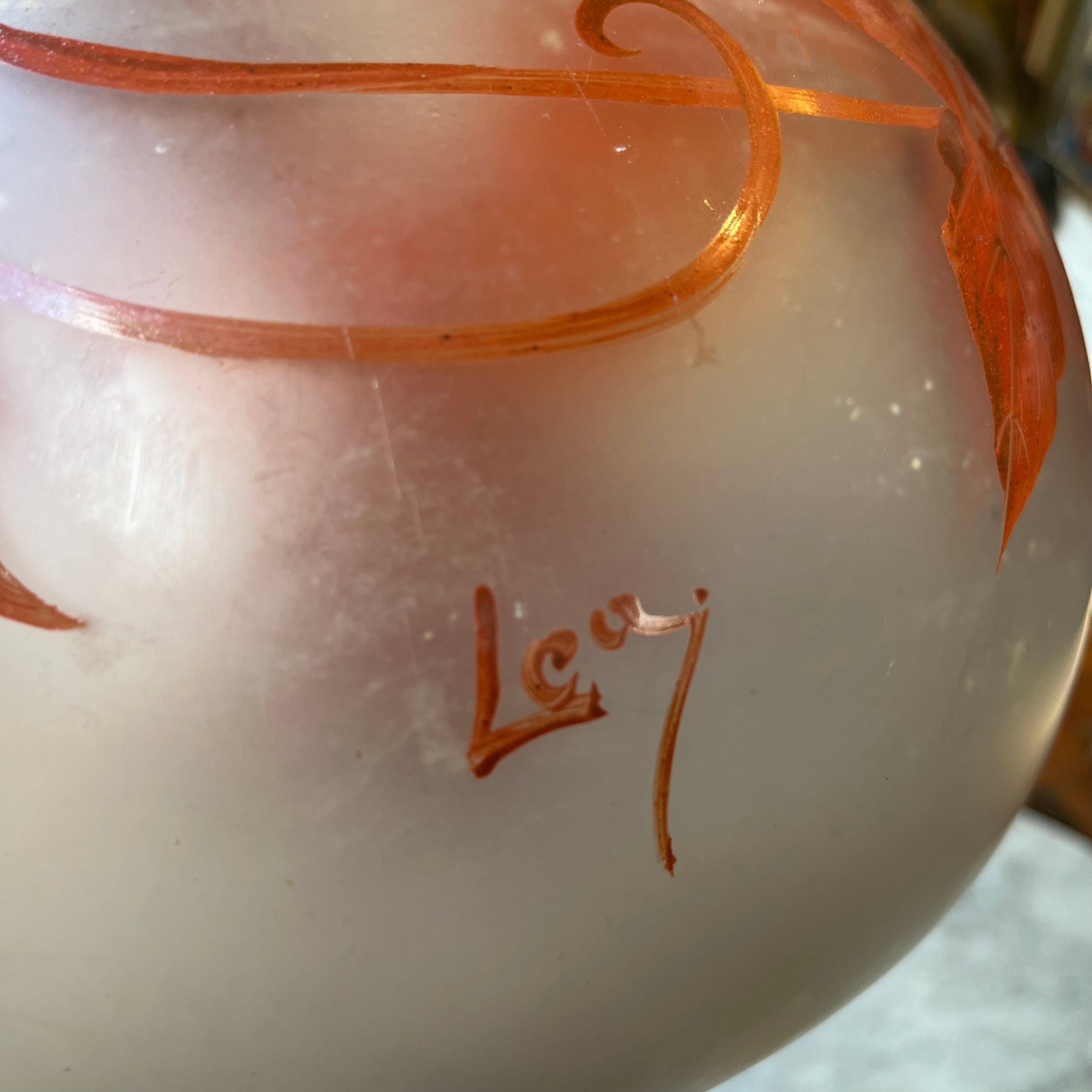 Bellísimo florero, de origen francés, hecho de vidrio opalino blanco y naranja con decoración pintada en motivos vegetales, como hojas otoñales. La pieza está firmada por François Théodore Legras (1839-1916), artista y maestro vidriero francés, destacado exponente las corrientes decorativas de Art Nouveau y Art Decó.