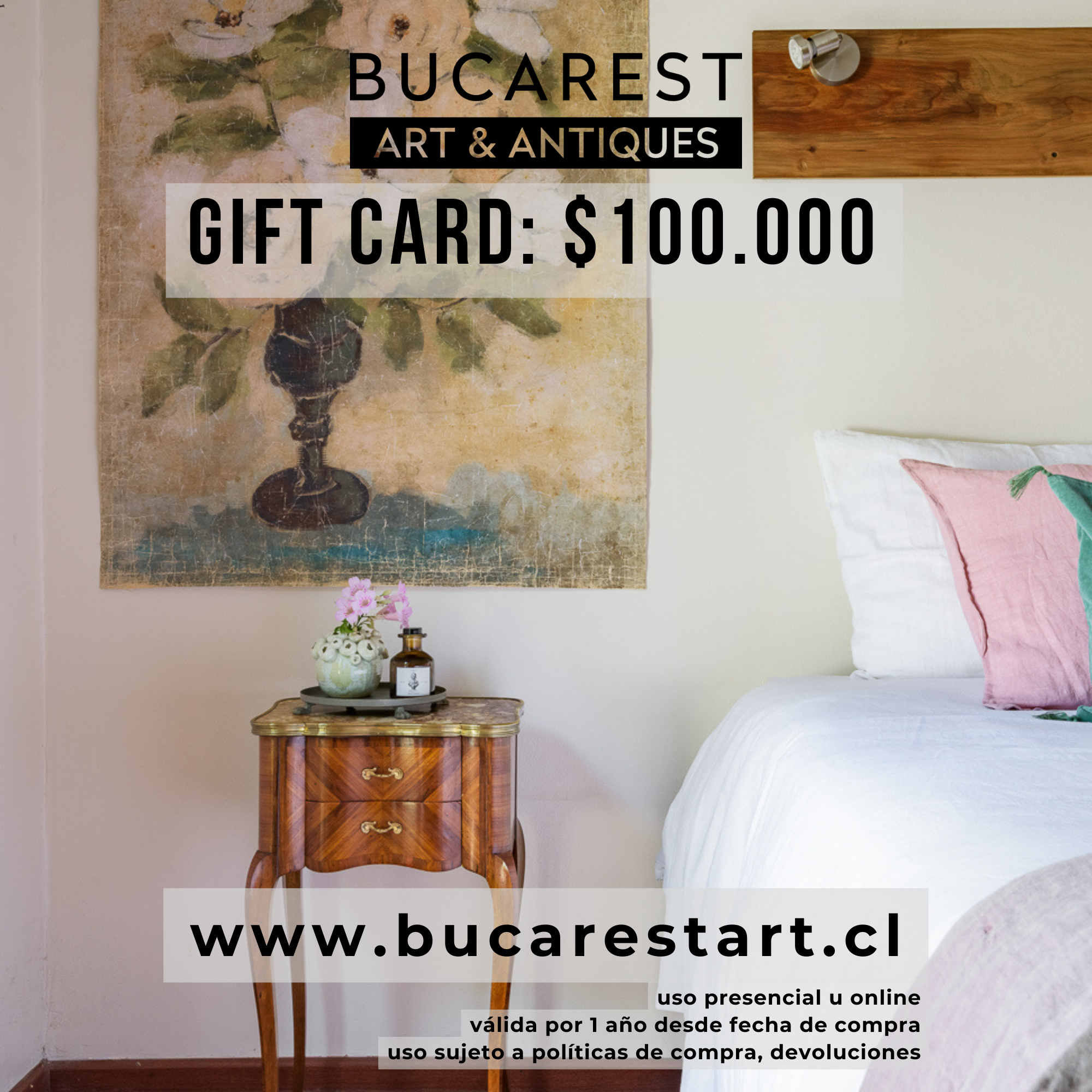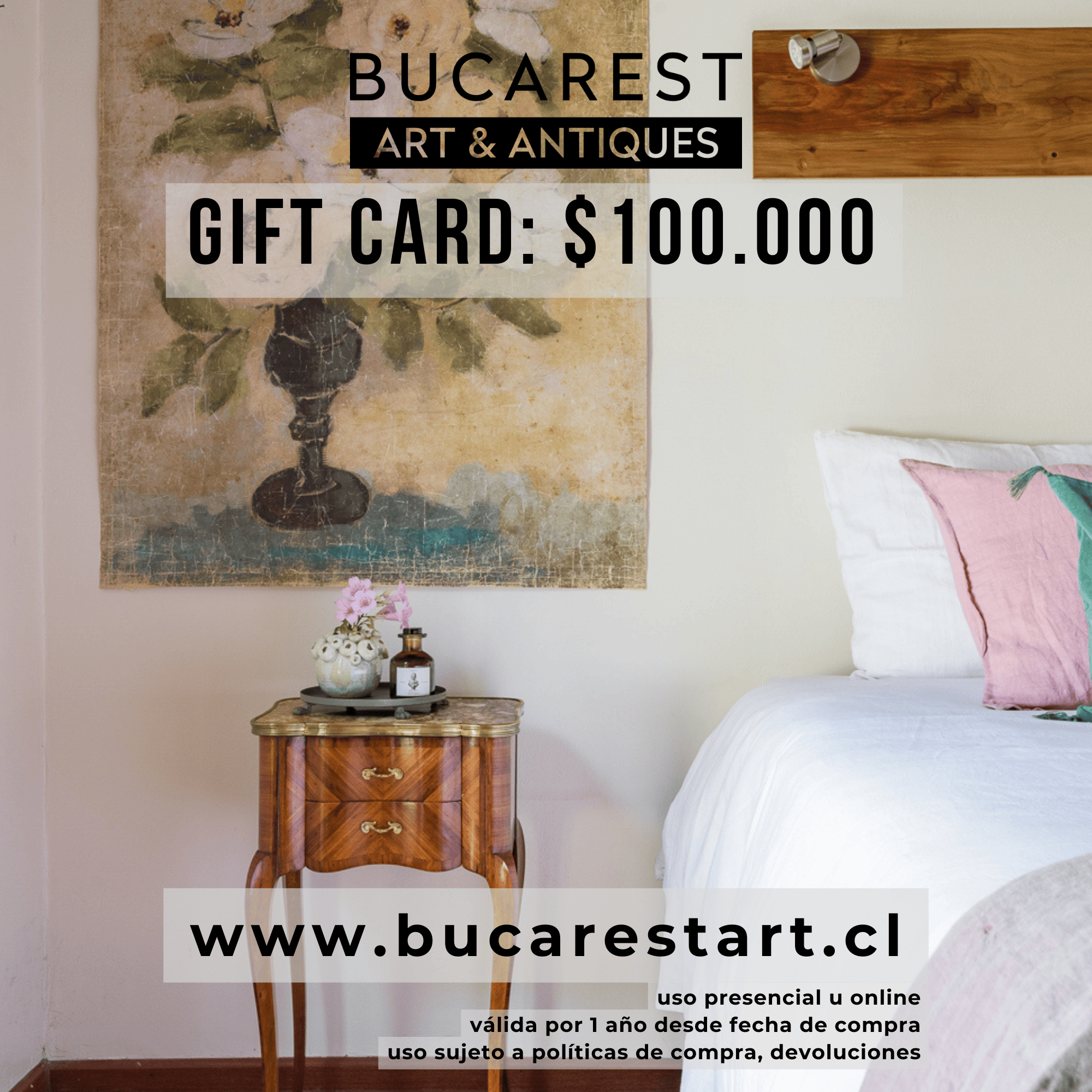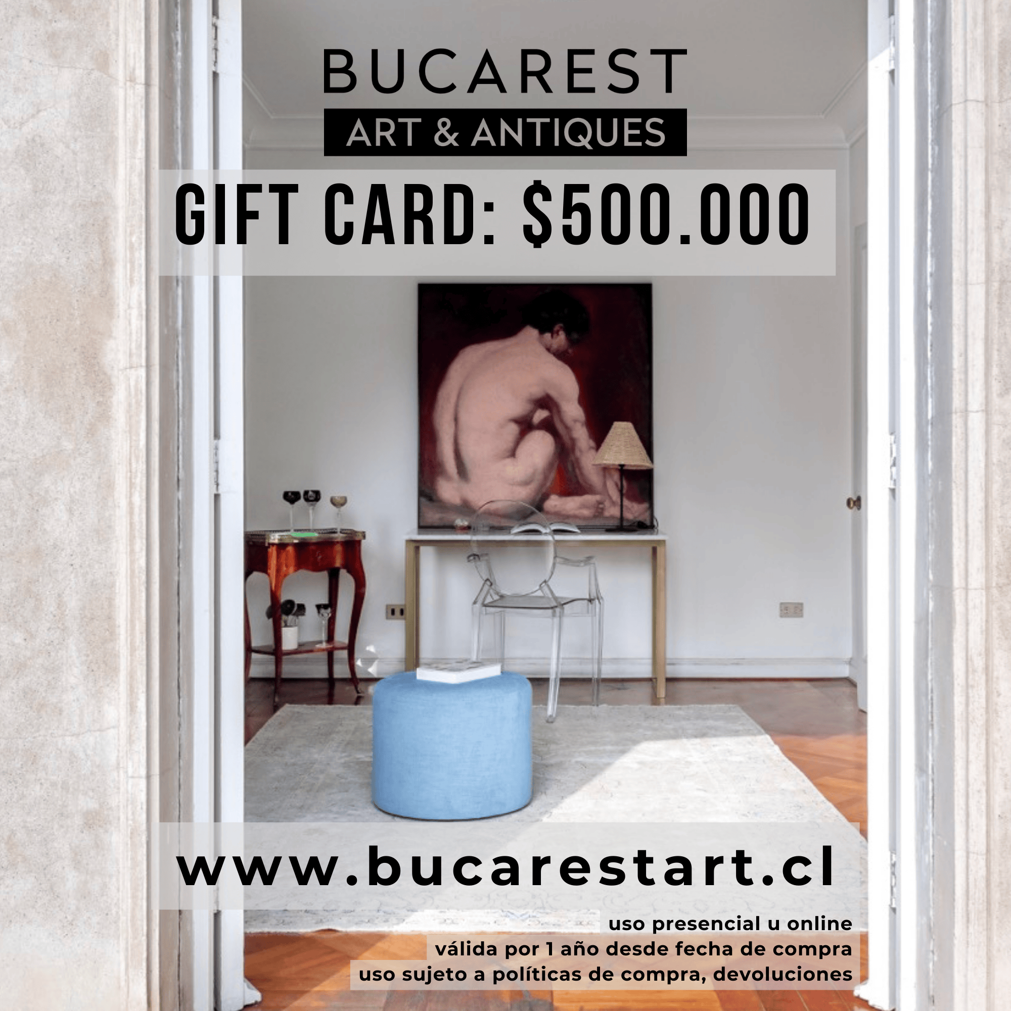 Puerta de entrada a la galería Bucarest. Esta tarjeta de regalo de $100.000 CLP invita al destinatario a descubrir obras originales y piezas de antiqüedad que enriquecen la vida cotidiana. Un presente accesible y elegante para iniciarse en la colección de arte o complementar una colección existente con nuevas adquisiciones.