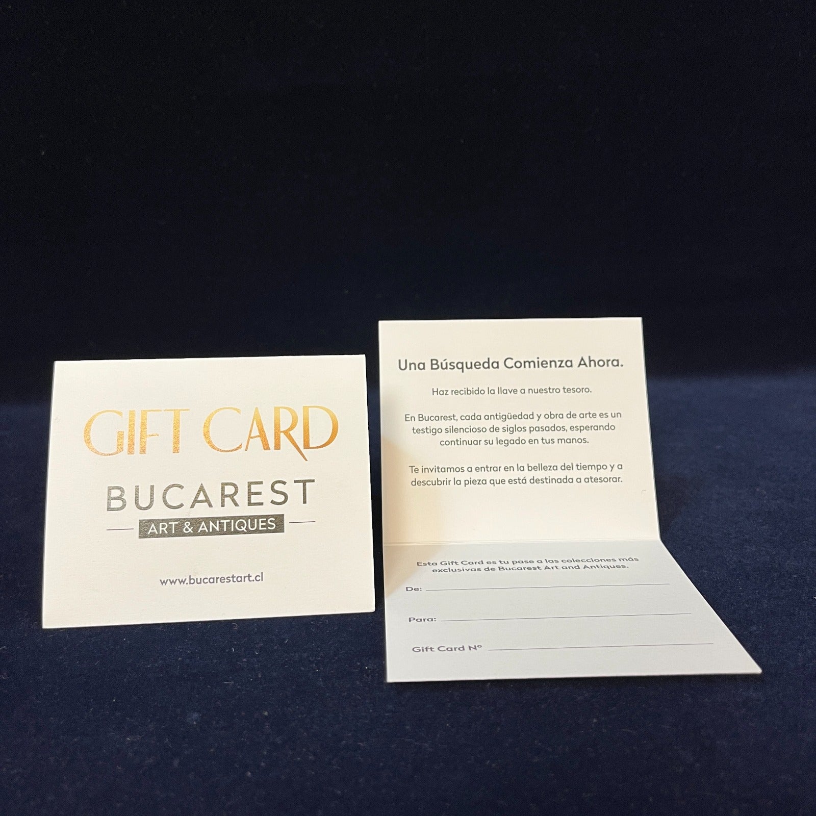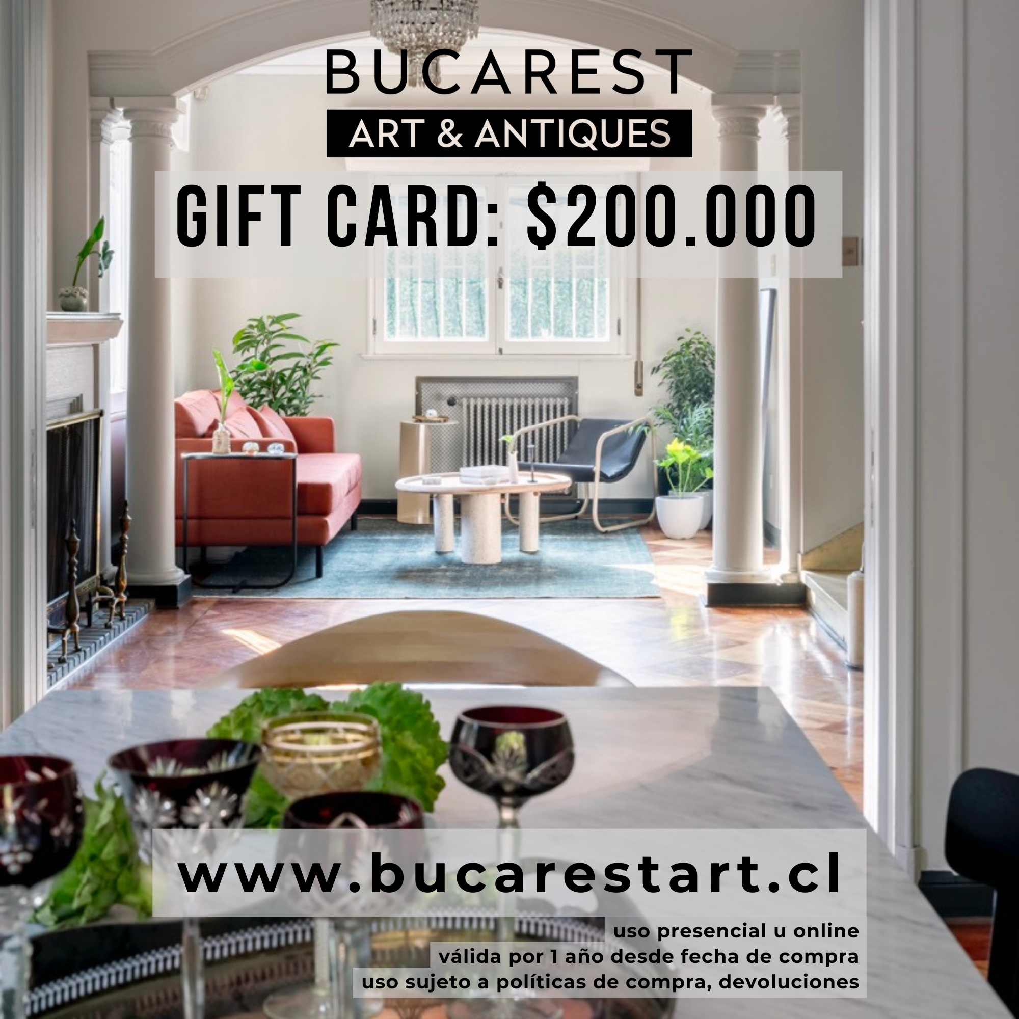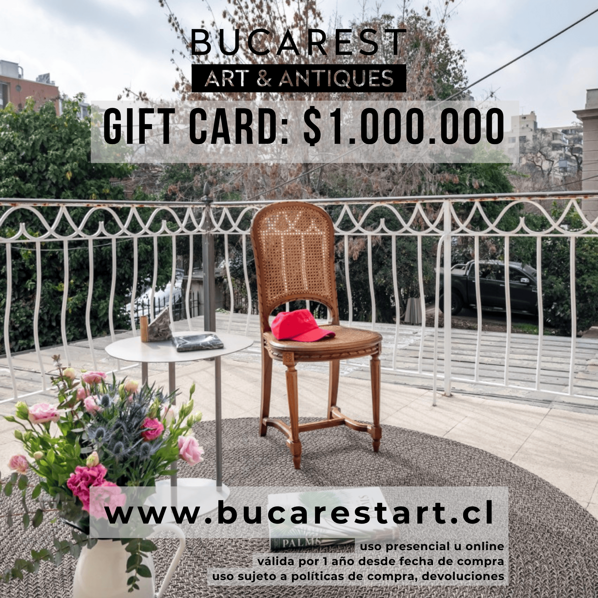 Puerta de entrada a la galería Bucarest. Esta tarjeta de regalo de $100.000 CLP invita al destinatario a descubrir obras originales y piezas de antiqüedad que enriquecen la vida cotidiana. Un presente accesible y elegante para iniciarse en la colección de arte o complementar una colección existente con nuevas adquisiciones.