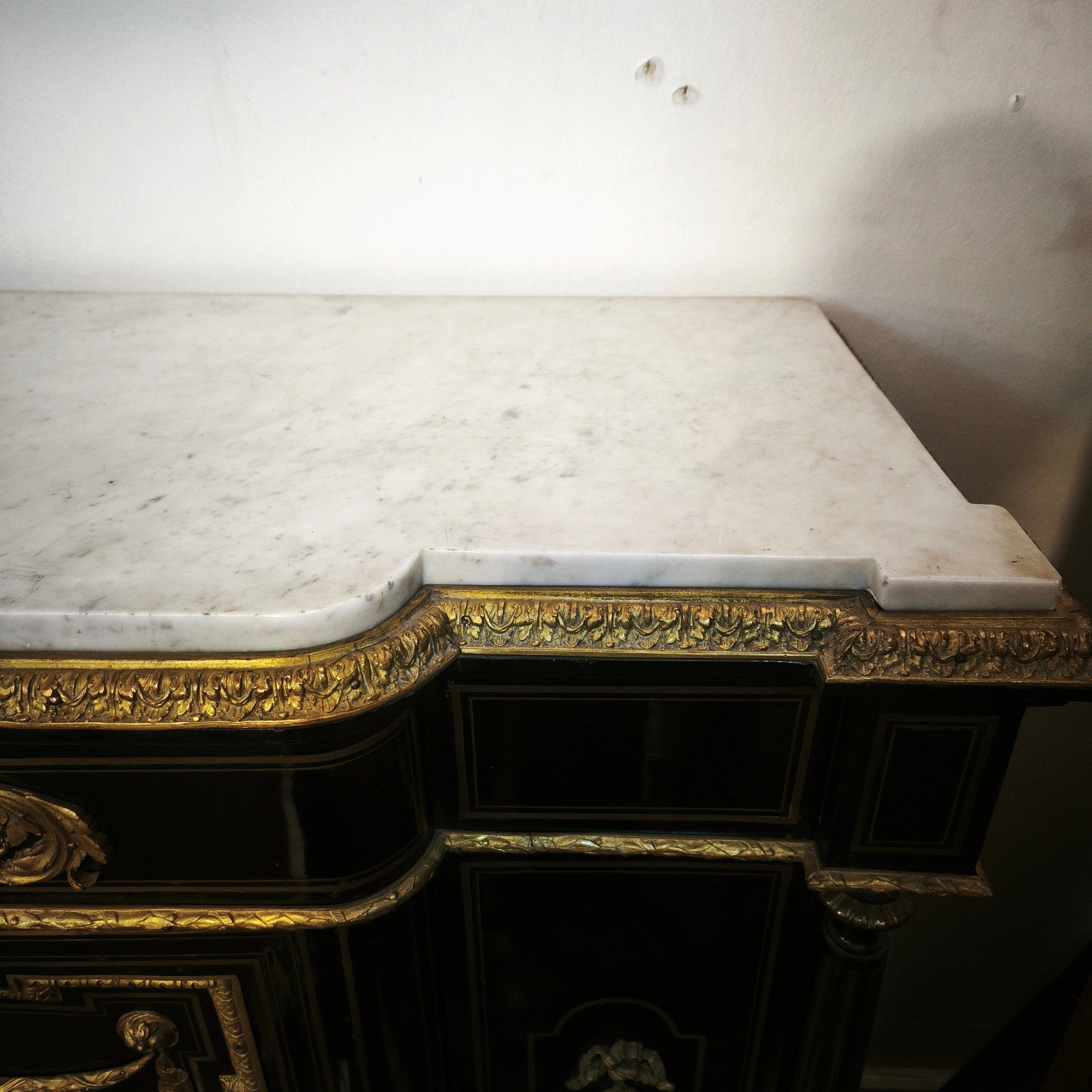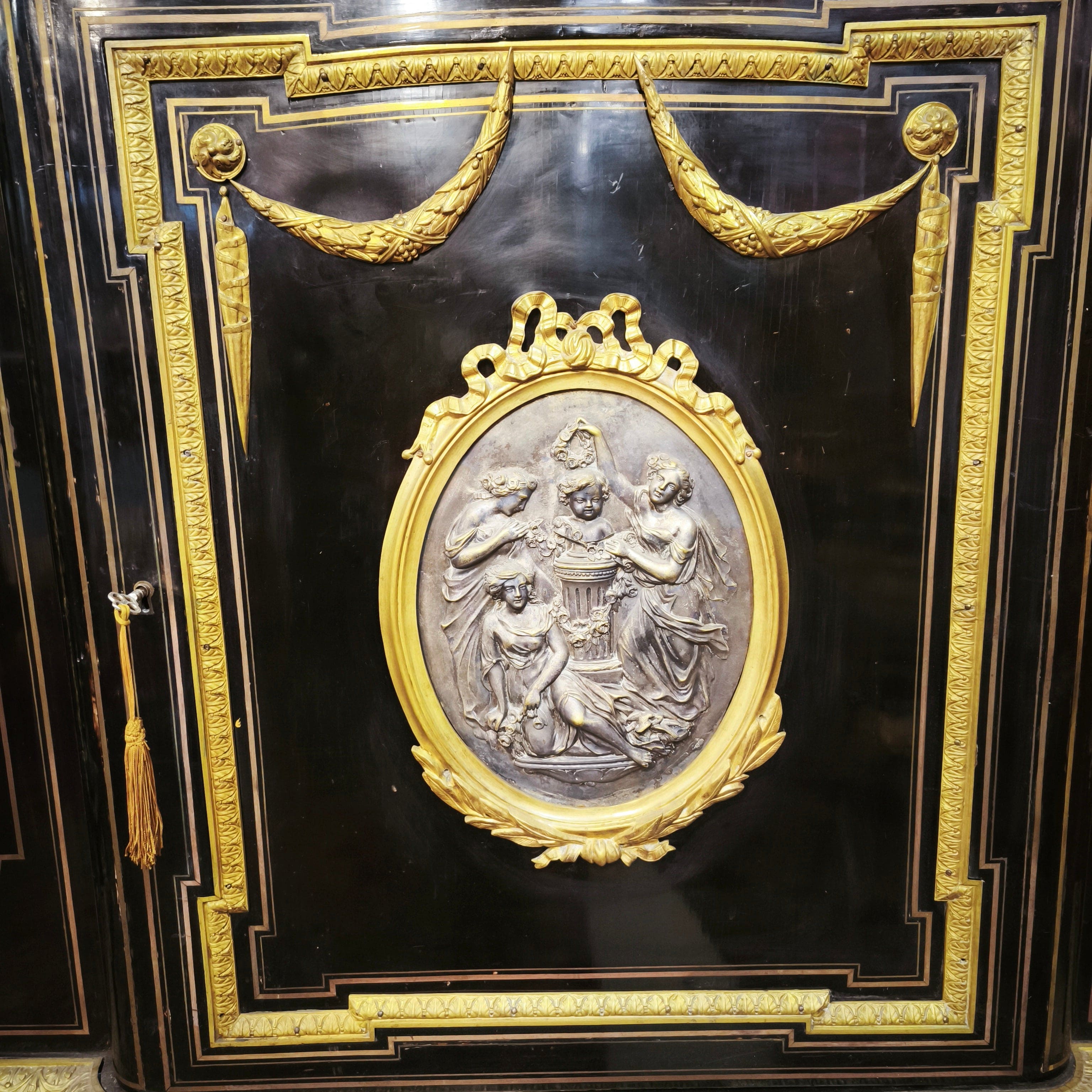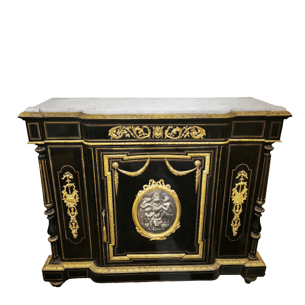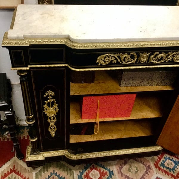 Gran boulle francés de una puerta, estilo Imperio, con maderas de caoba ebanizadas y cubierta de mármol. Cuenta con finos detalles en bronce ormolú, marquetería de bronce y dos repisas en su interior.