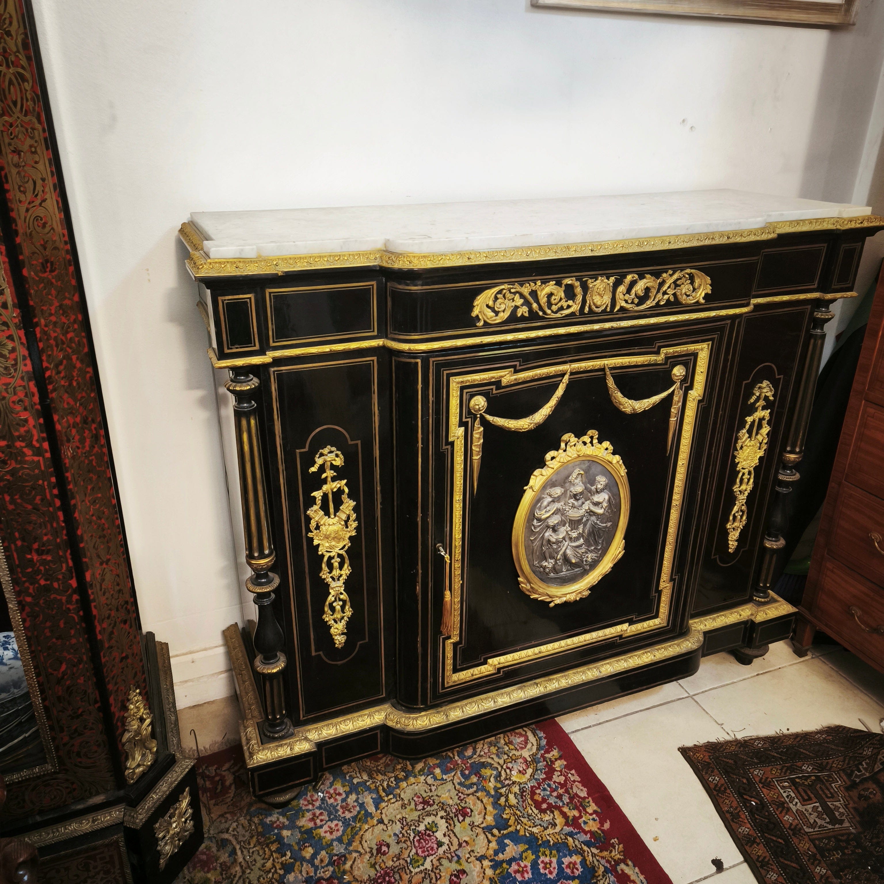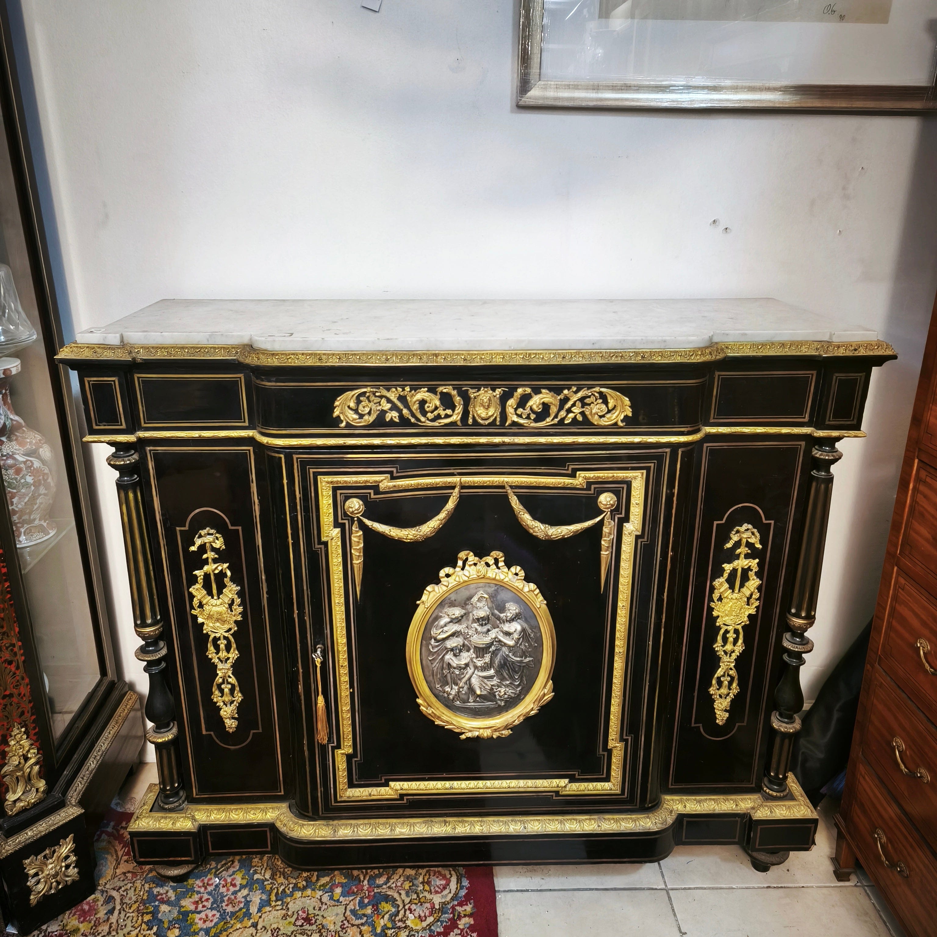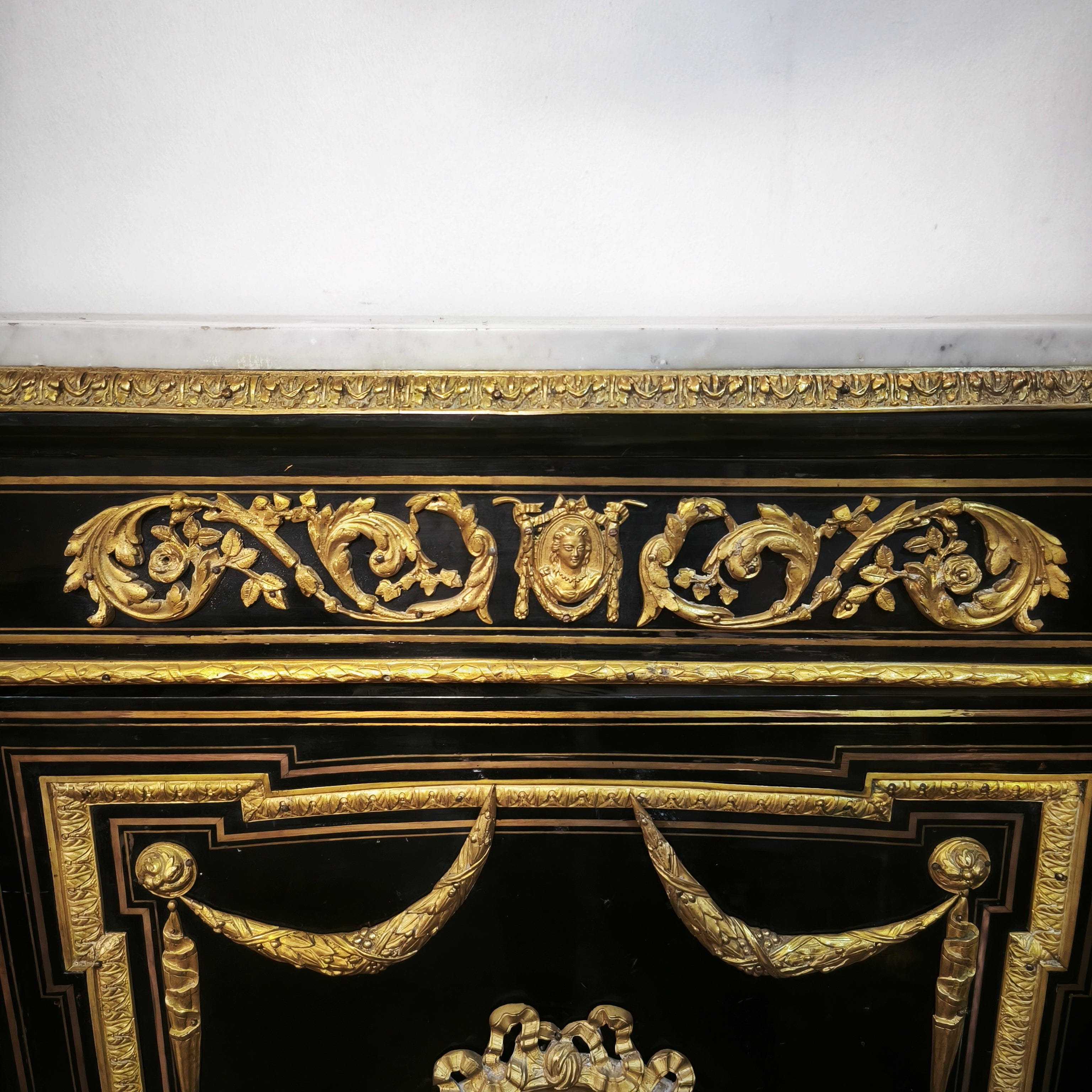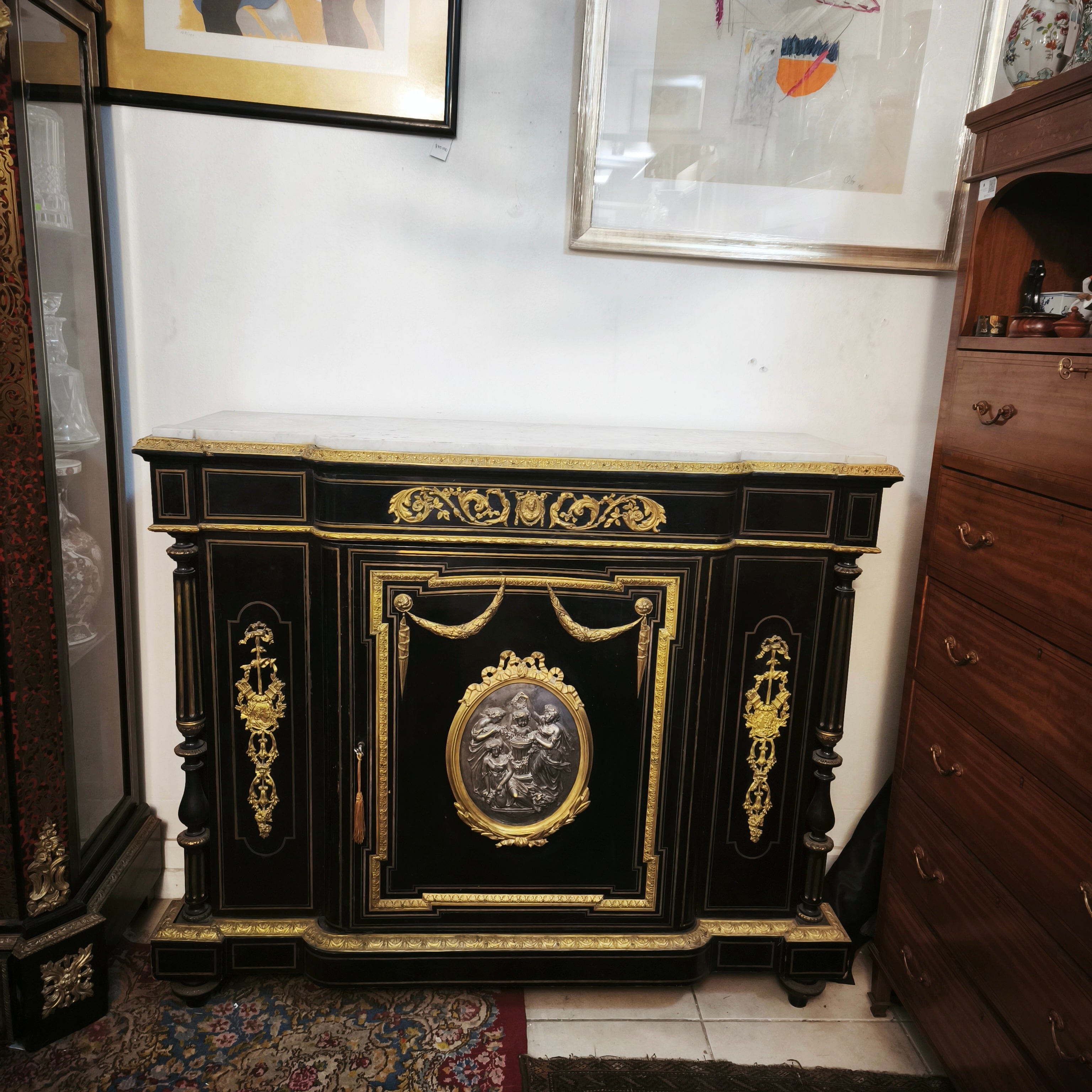 Gran boulle francés de una puerta, estilo Imperio, con maderas de caoba ebanizadas y cubierta de mármol. Cuenta con finos detalles en bronce ormolú, marquetería de bronce y dos repisas en su interior.