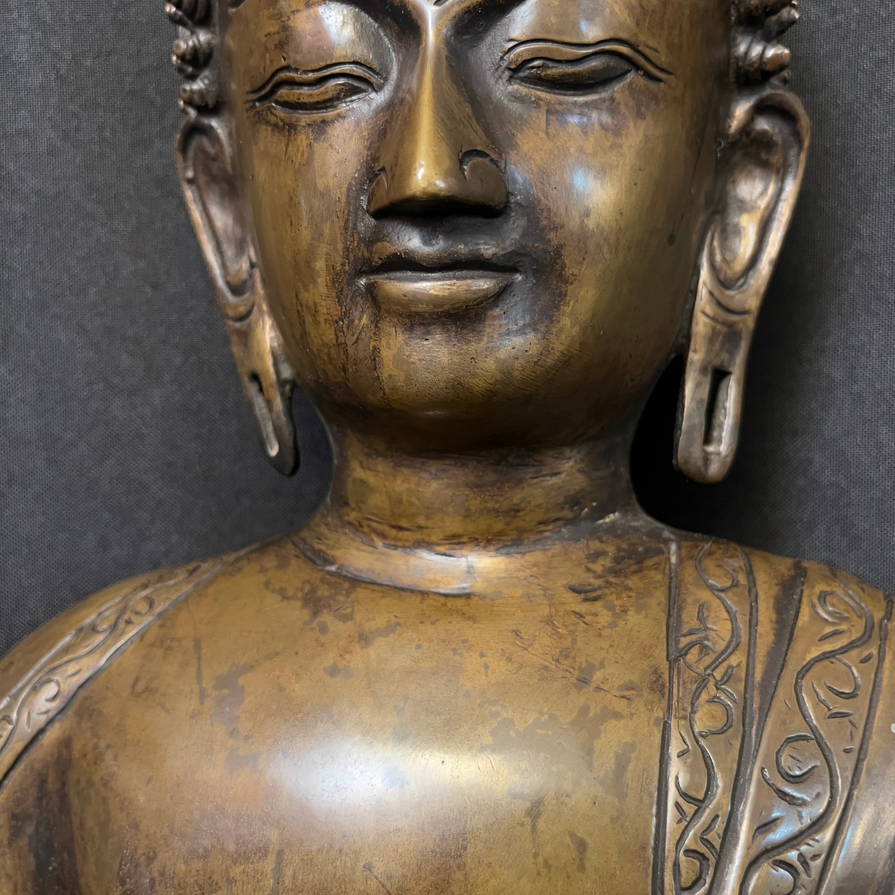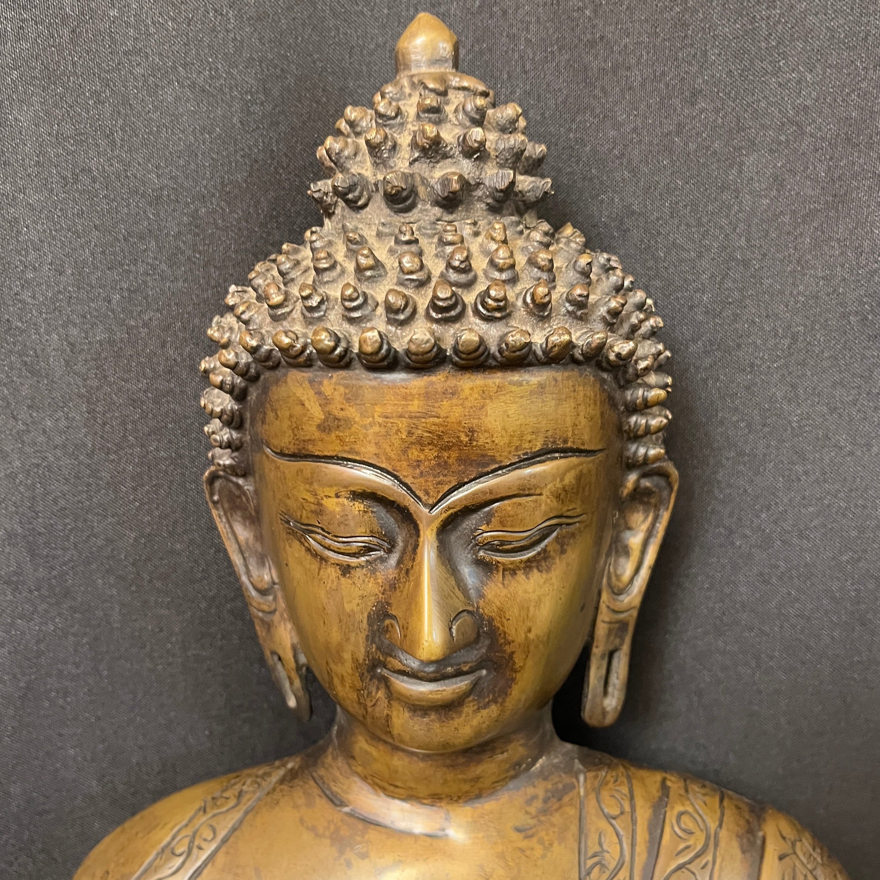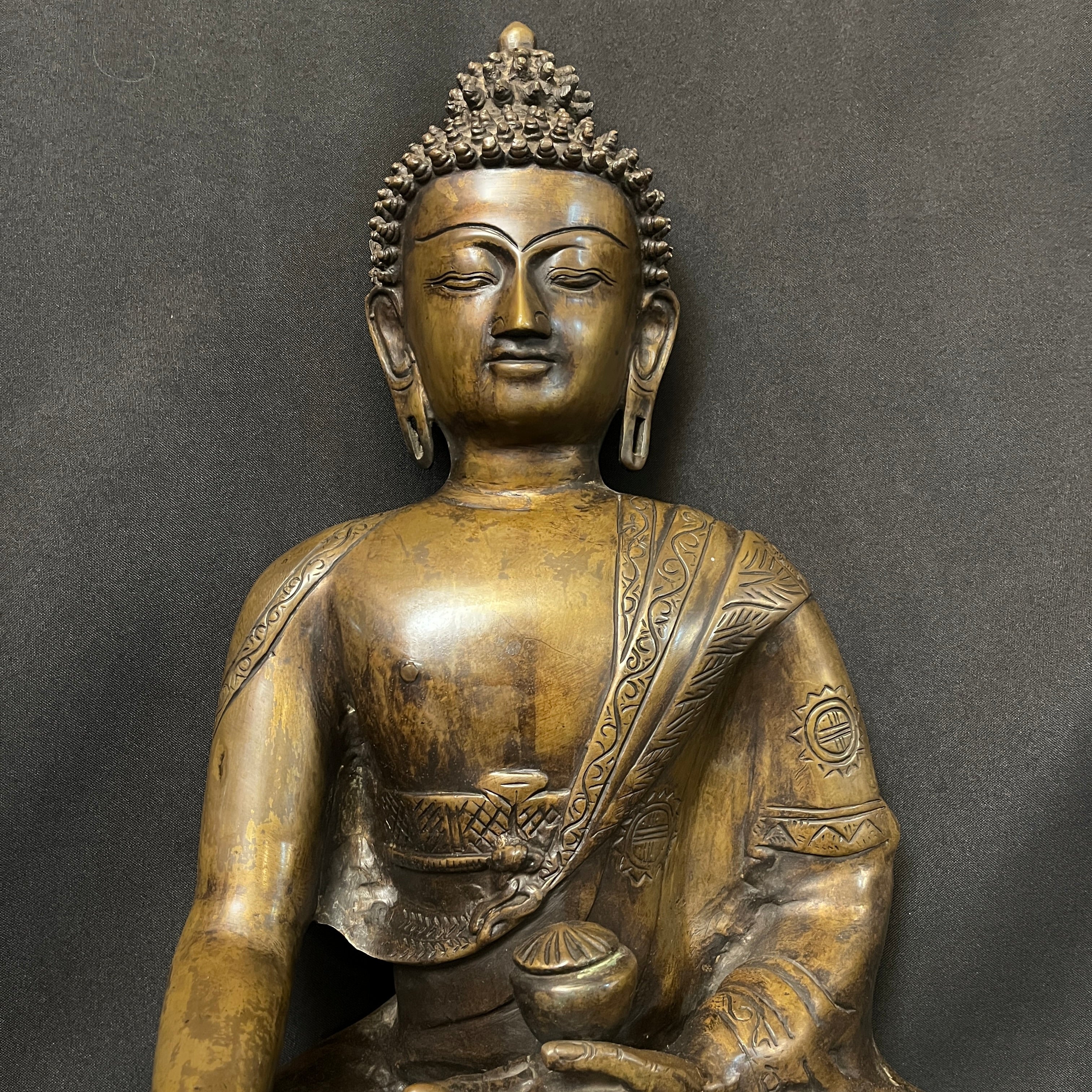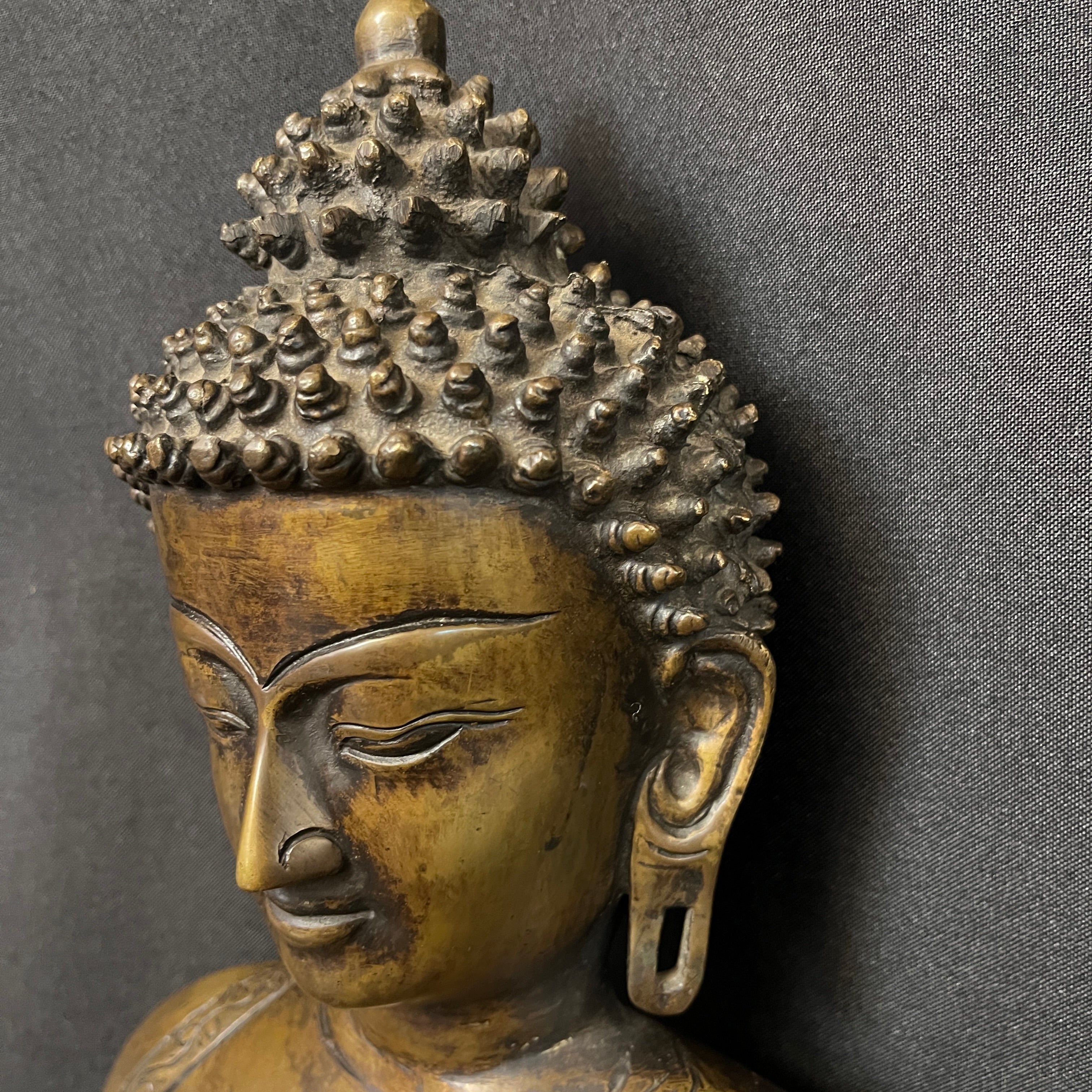 Gran escultura en bronce que representa a Buda Gautama, figura central del budismo. Se presenta en postura de meditación, con la mano derecha en gesto de 'bhūmisparśa mudrā' (tocar la tierra), símbolo de iluminación y verdad inquebrantable. La pieza destaca por su cuidada ejecución, apreciándose con nitidez los pliegues de la vestimenta, la serenidad del rostro y la riqueza ornamental.
