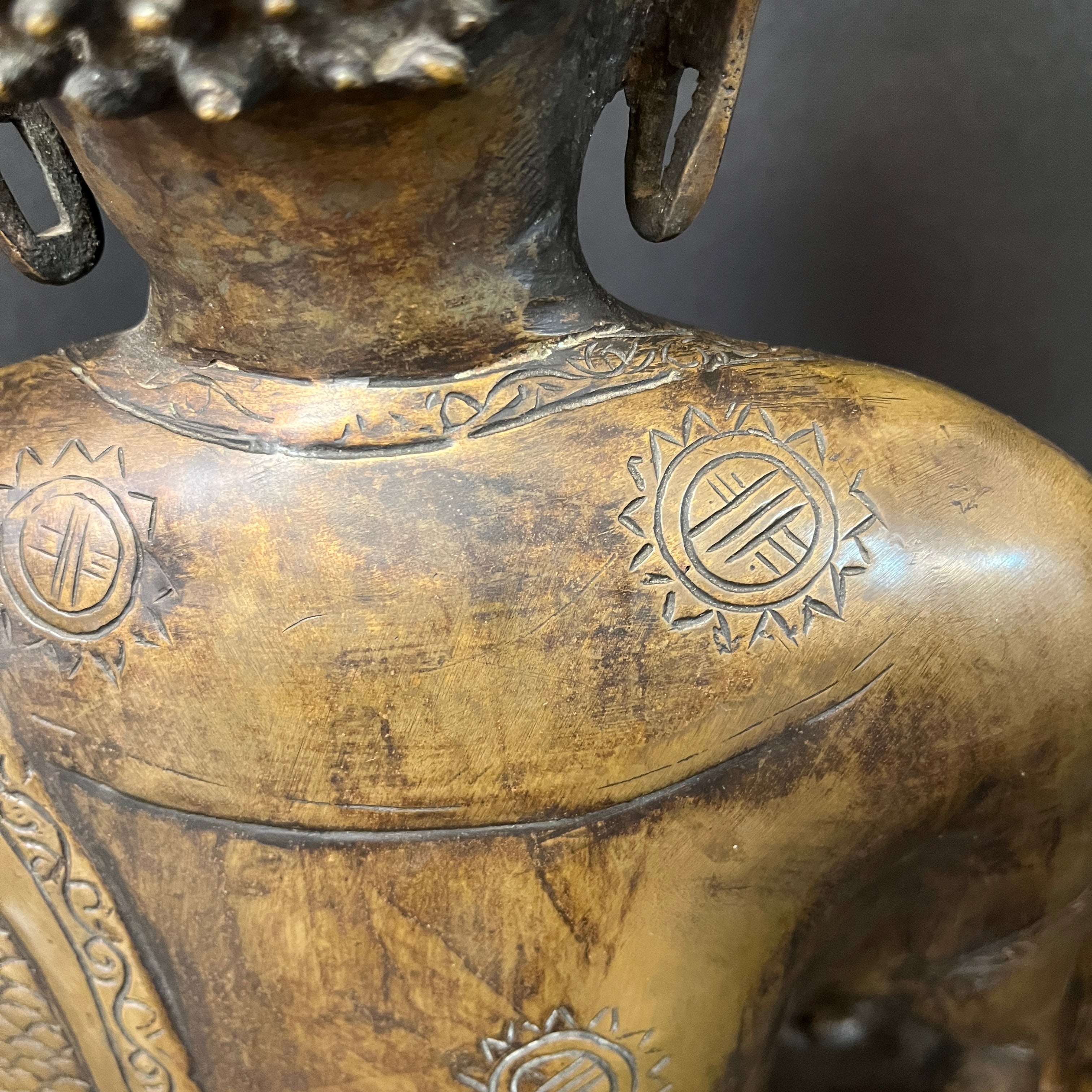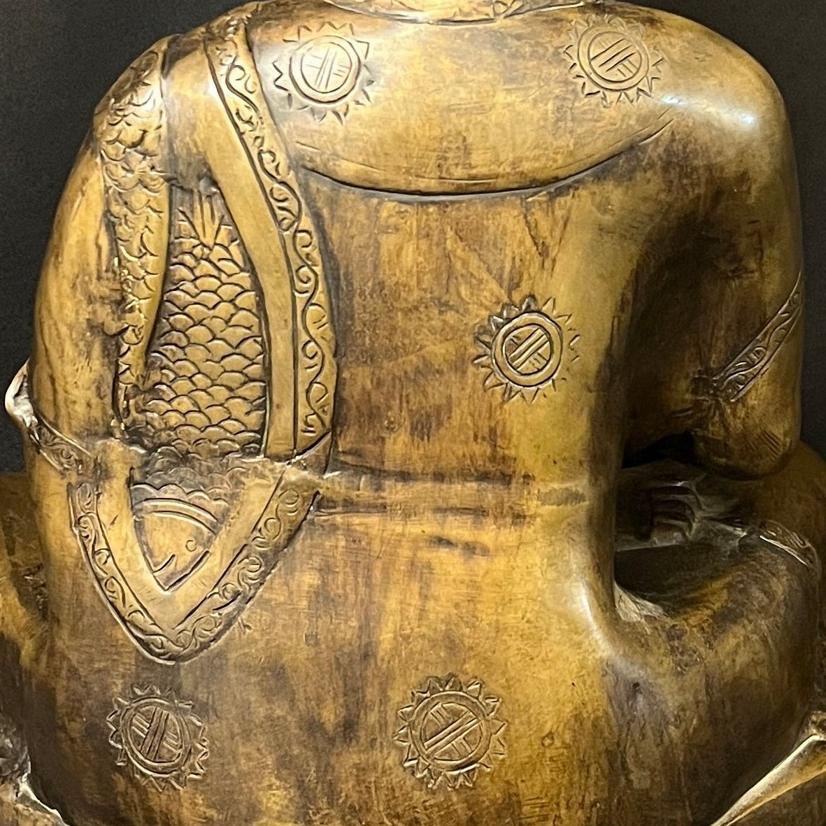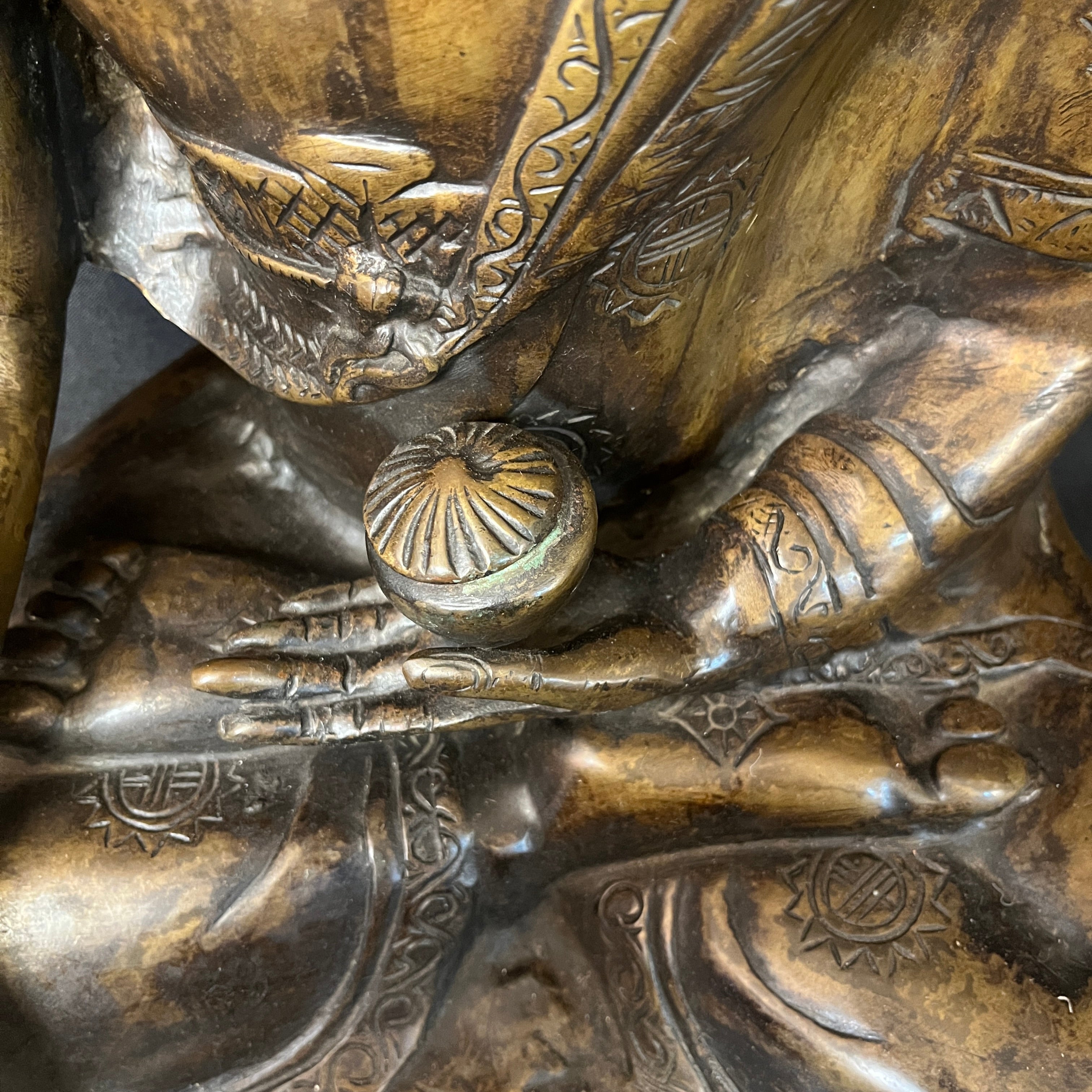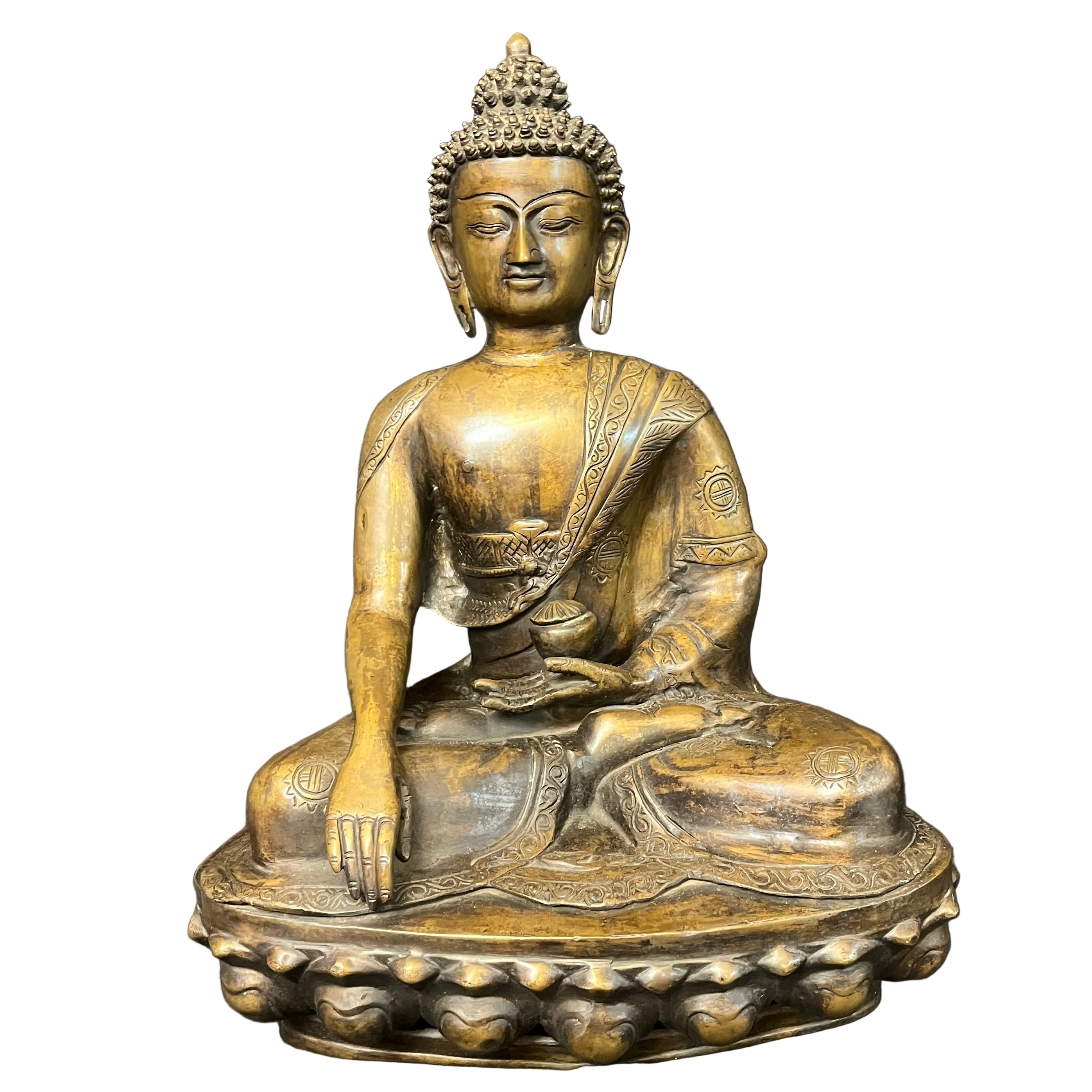 Gran escultura en bronce que representa a Buda Gautama, figura central del budismo. Se presenta en postura de meditación, con la mano derecha en gesto de 'bhūmisparśa mudrā' (tocar la tierra), símbolo de iluminación y verdad inquebrantable. La pieza destaca por su cuidada ejecución, apreciándose con nitidez los pliegues de la vestimenta, la serenidad del rostro y la riqueza ornamental.