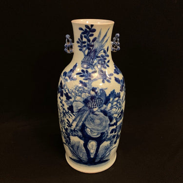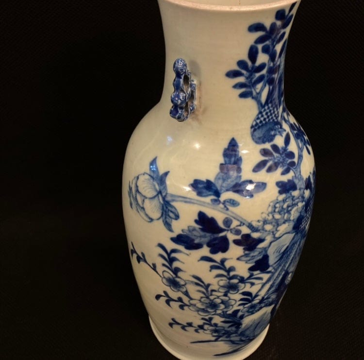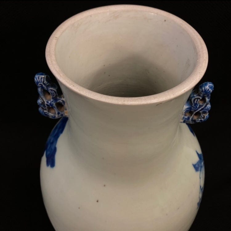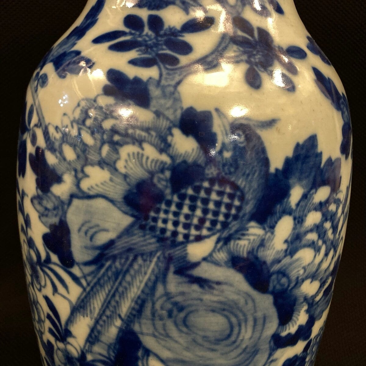 Jarrón chino de gran tamaño de porcelana azul y blanca, con delicado detalle en su cuello. Cuenta con un dibujo de aves y flores en su exterior.