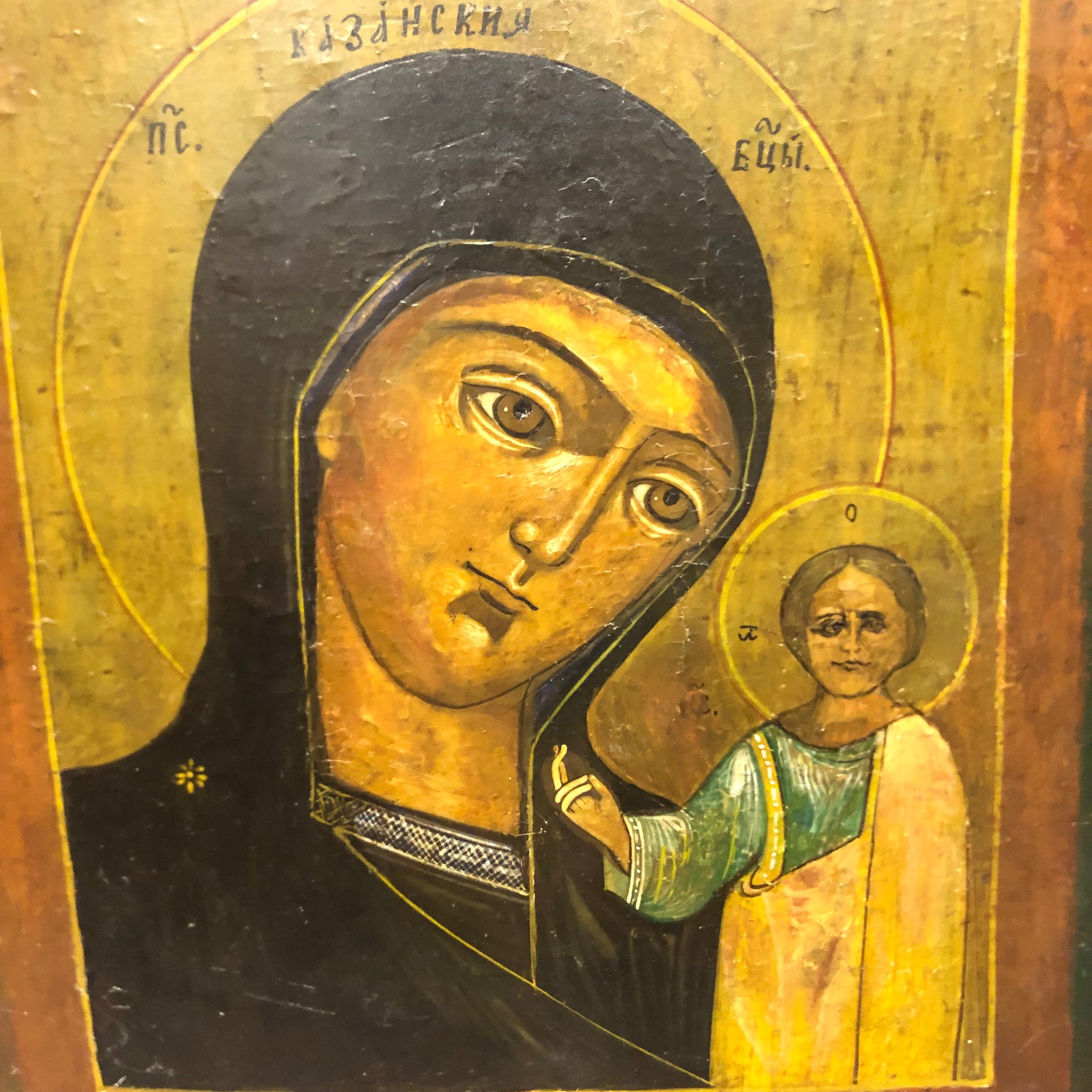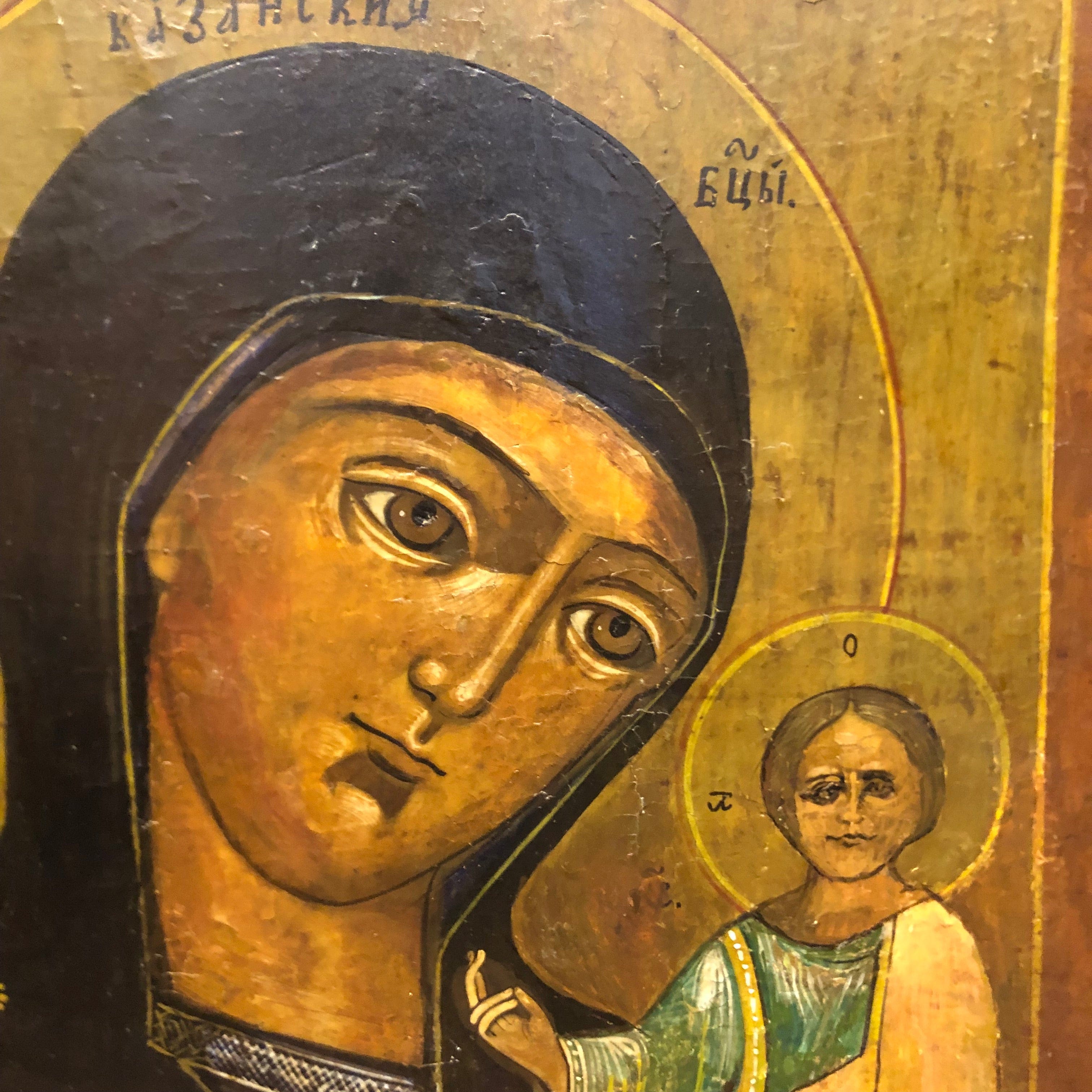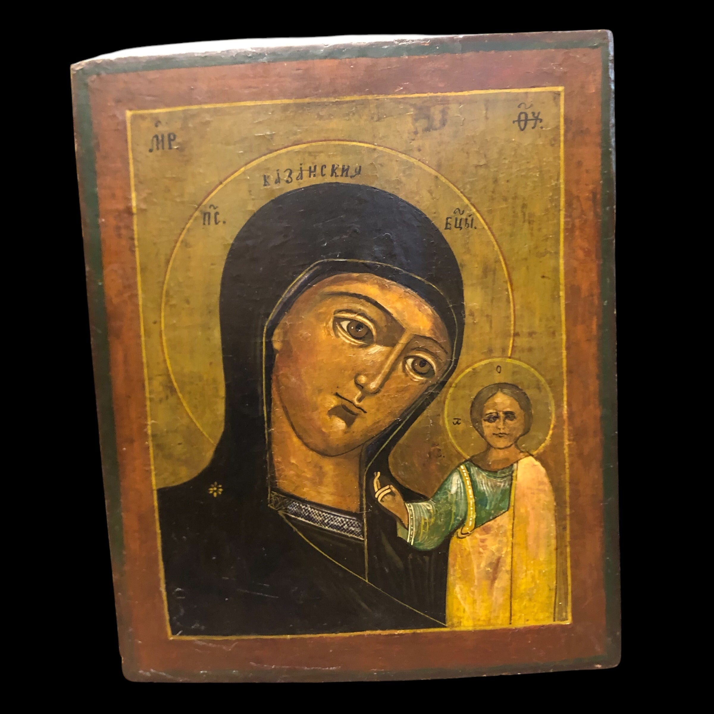 Hermoso y antiguo icono religioso Ruso Ortodoxo en madera policromada, representando a Nuestra Señora de Kazan.