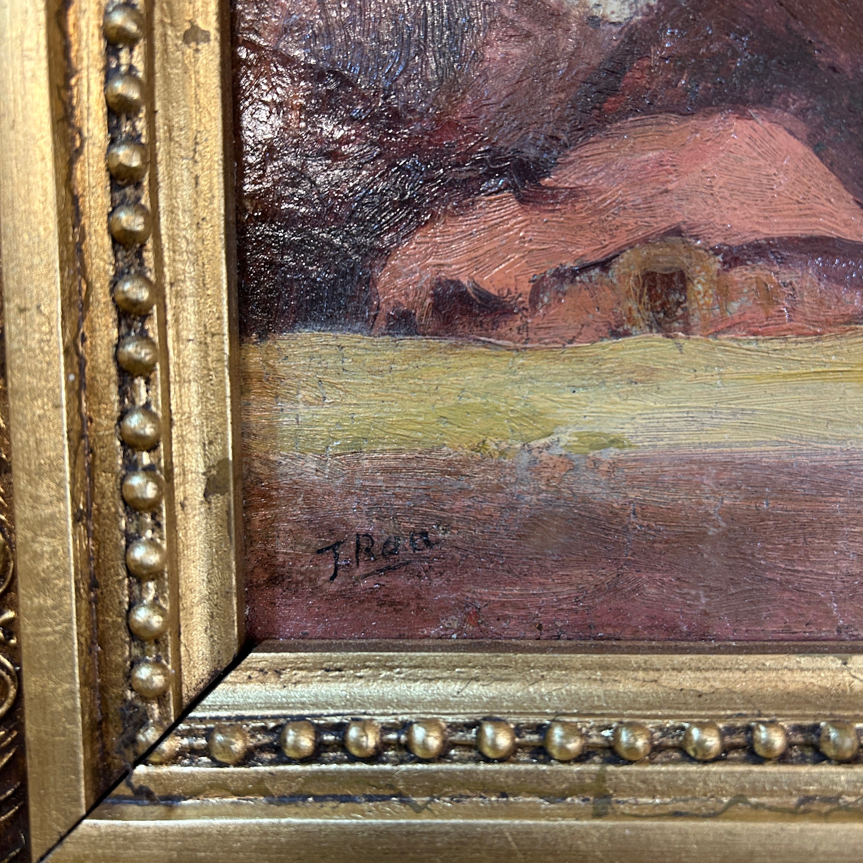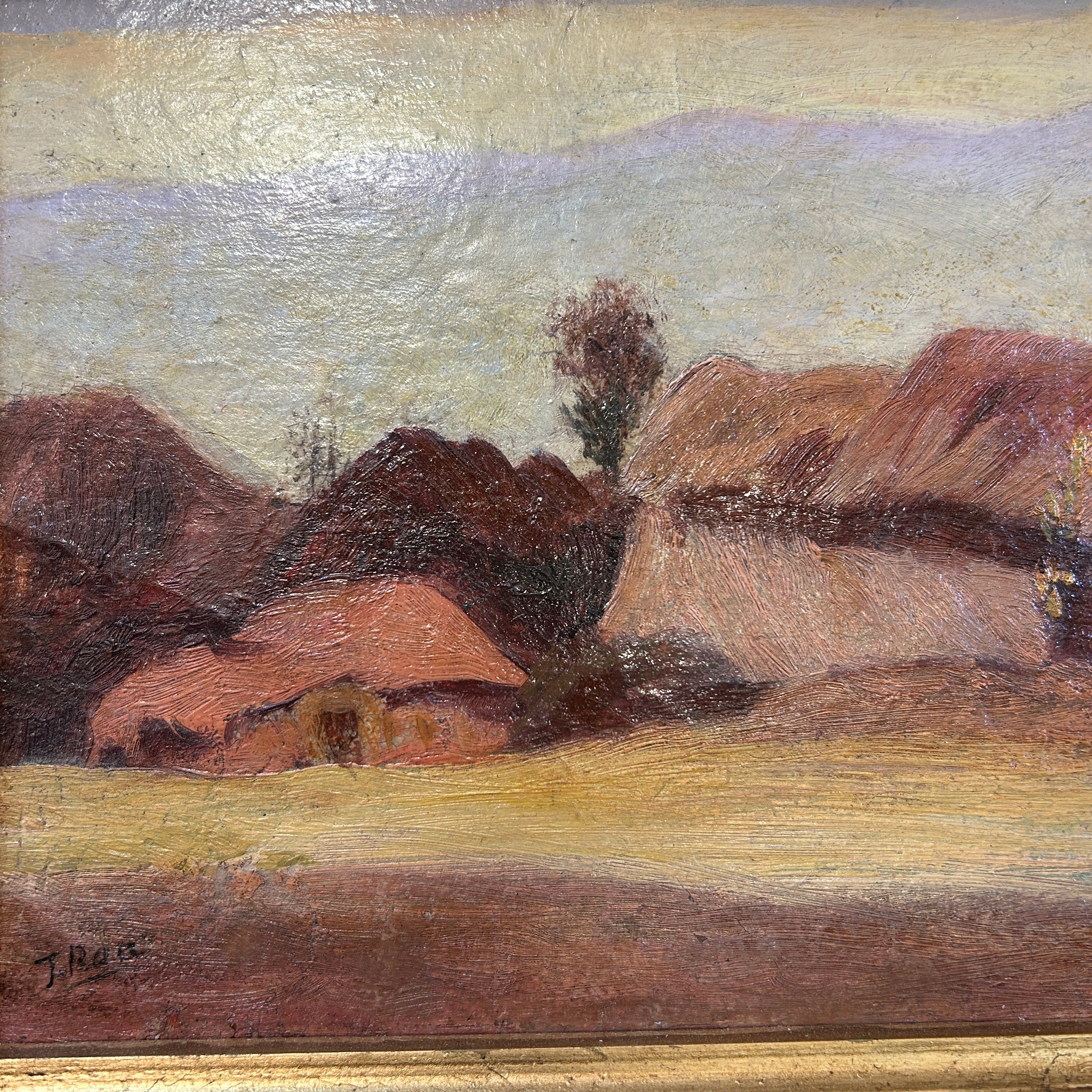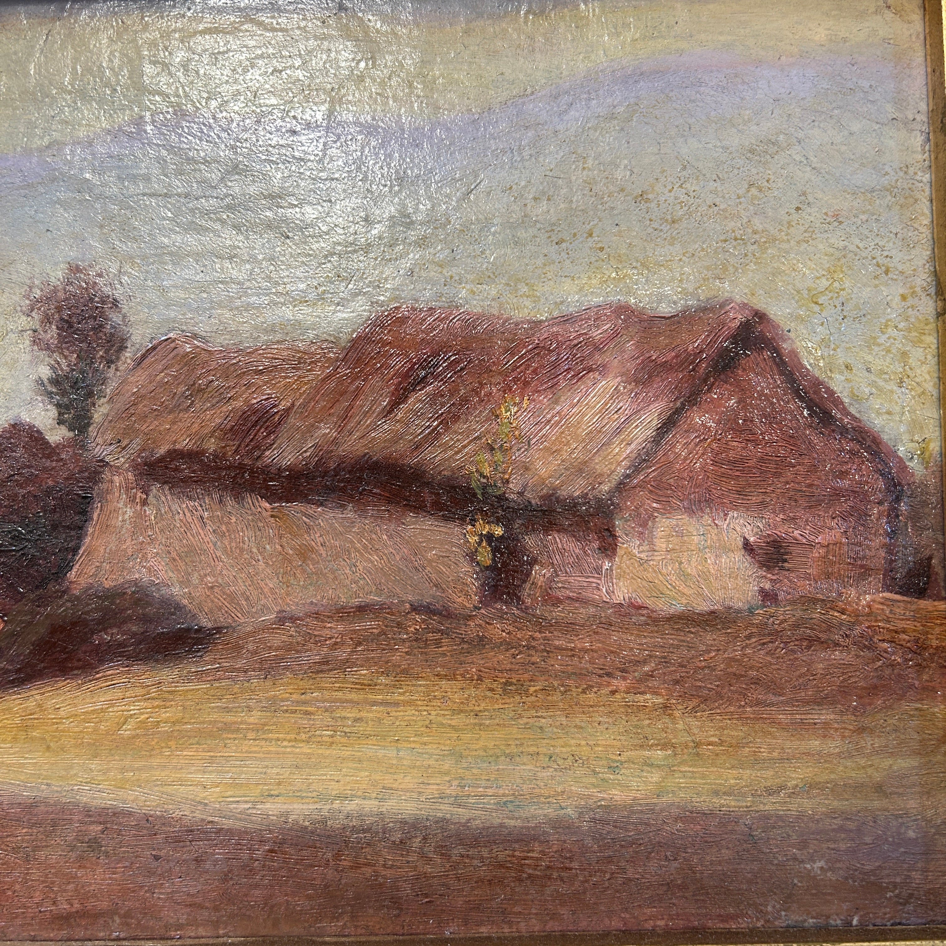 Óleo sobre trupán del artista chileno Israel Roa, representando un paisaje con varias casitas de adobe y techo de paja, en tonos cálidos. La obra tiene un espectacular marco de madera tallado con acabado dorado.