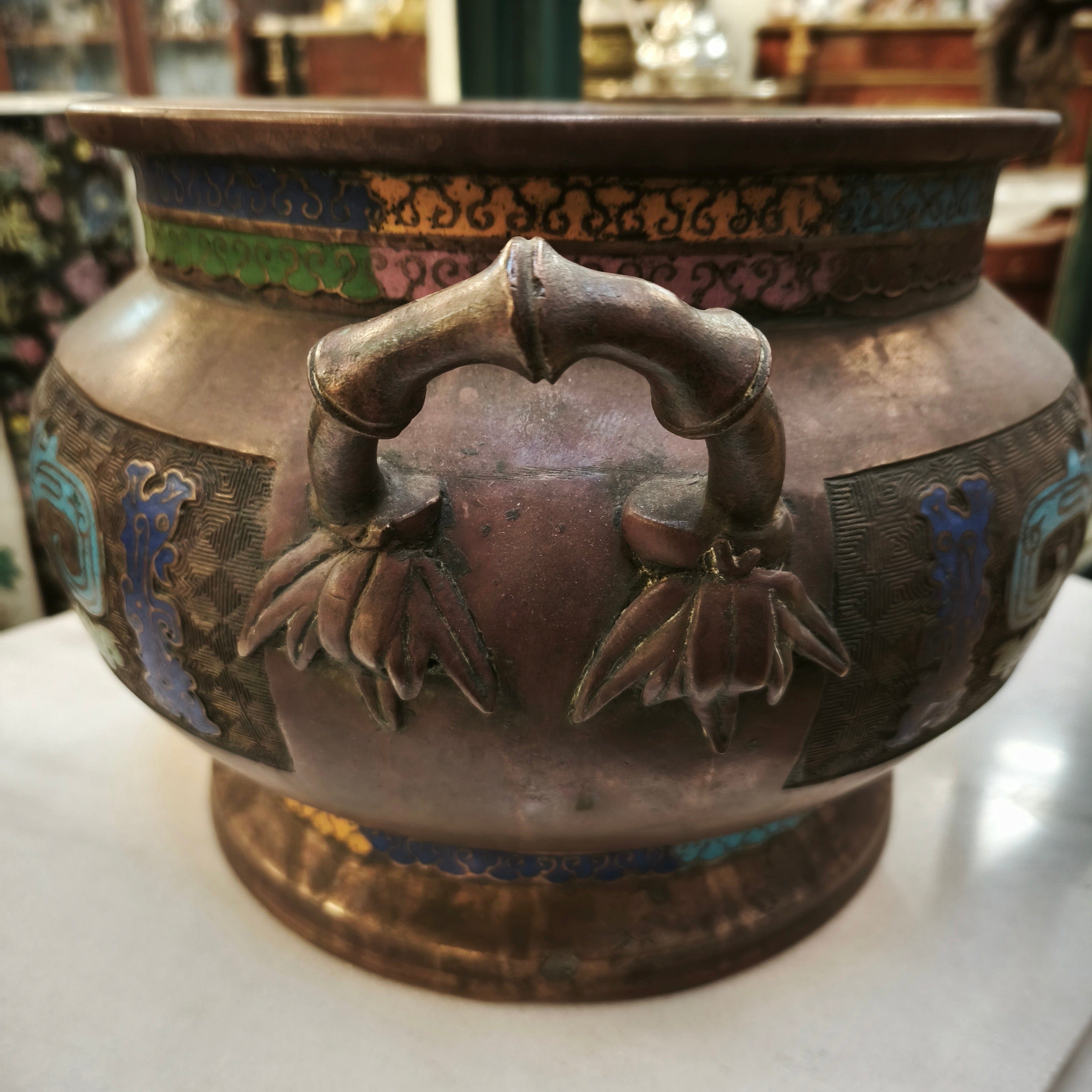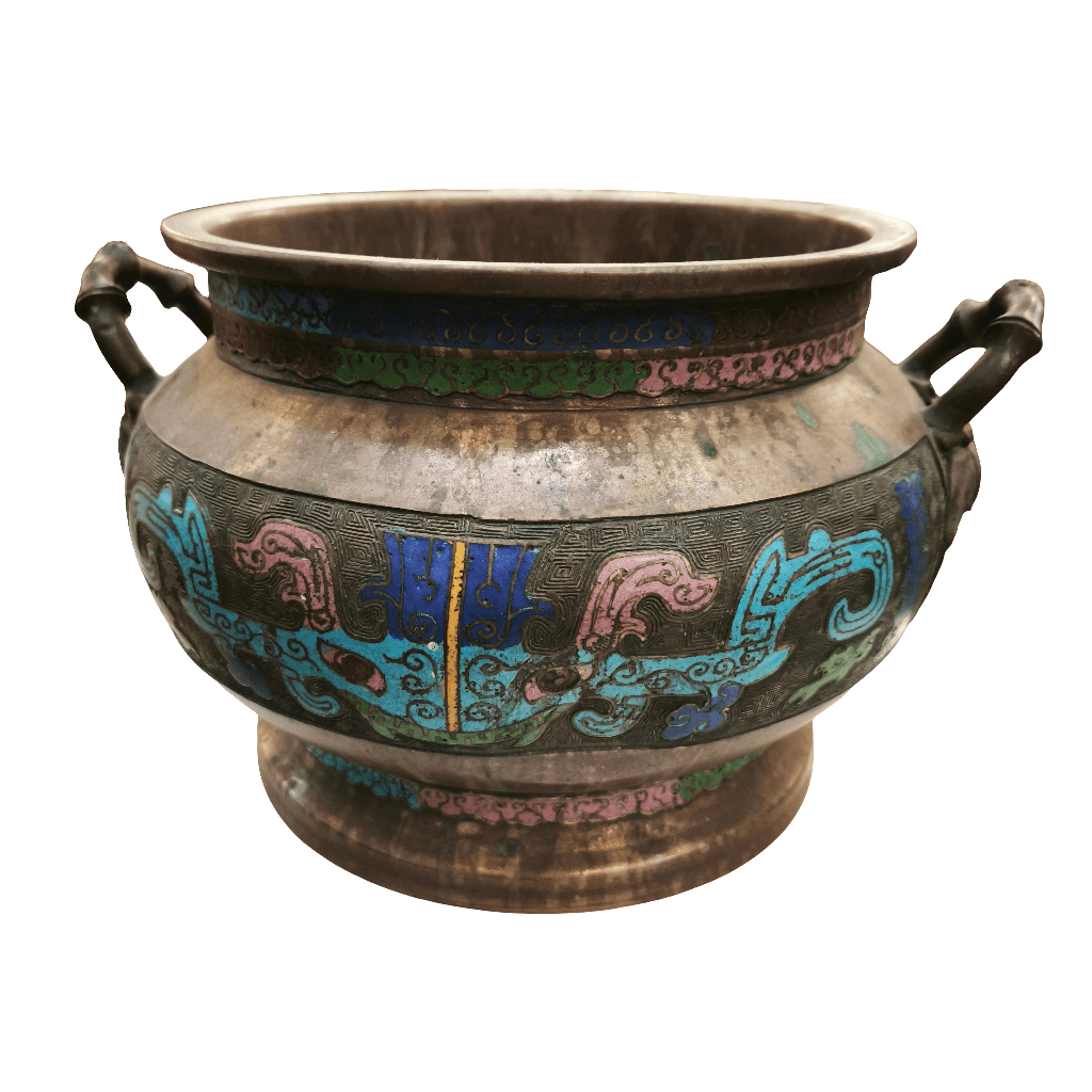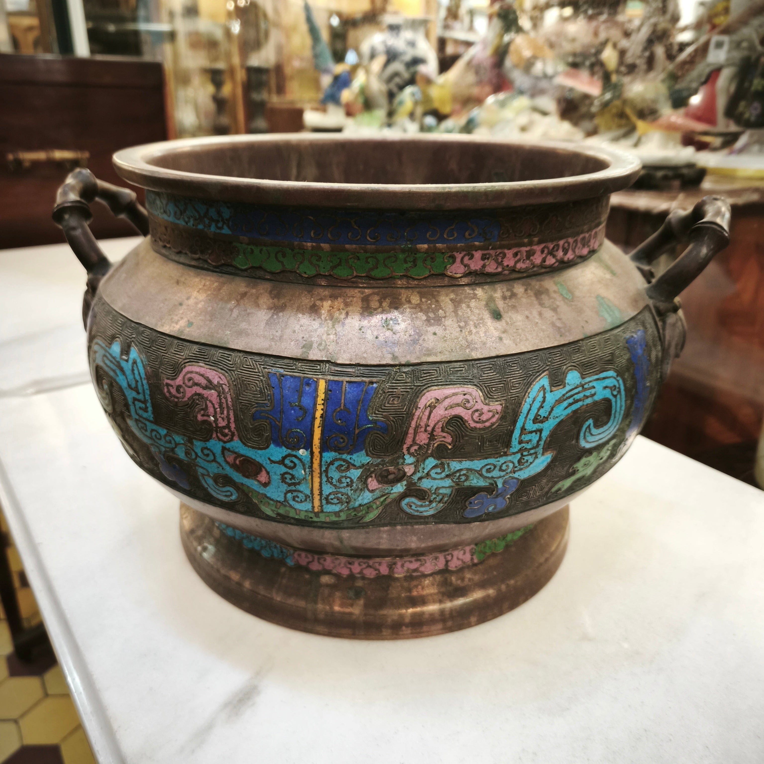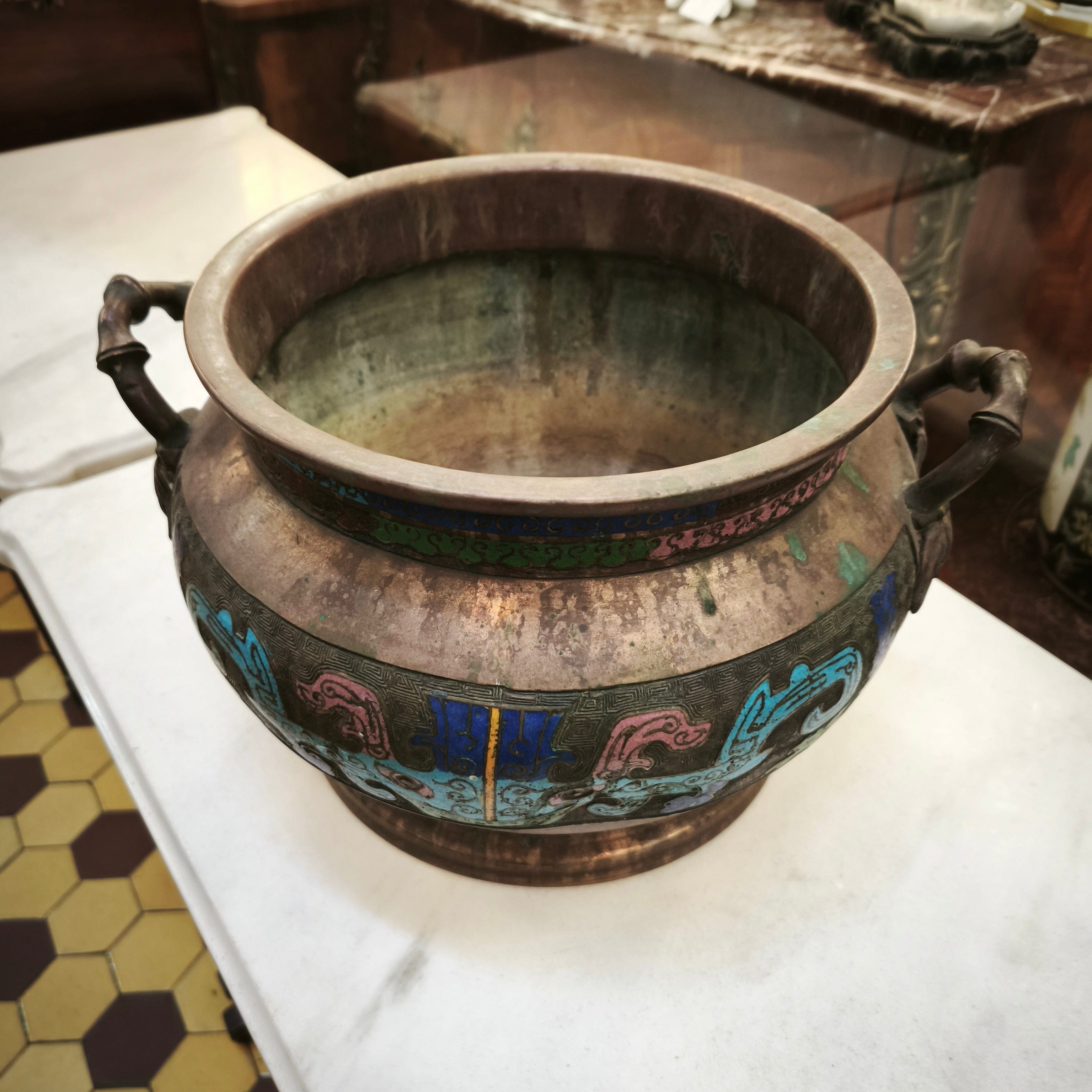 Antigua jardinera, de origen chino, hecho de bronce cloissoné con un bello sincelado en relieves y motivos abstractos, y esmaltes en tonos azules, rosas y verdes.