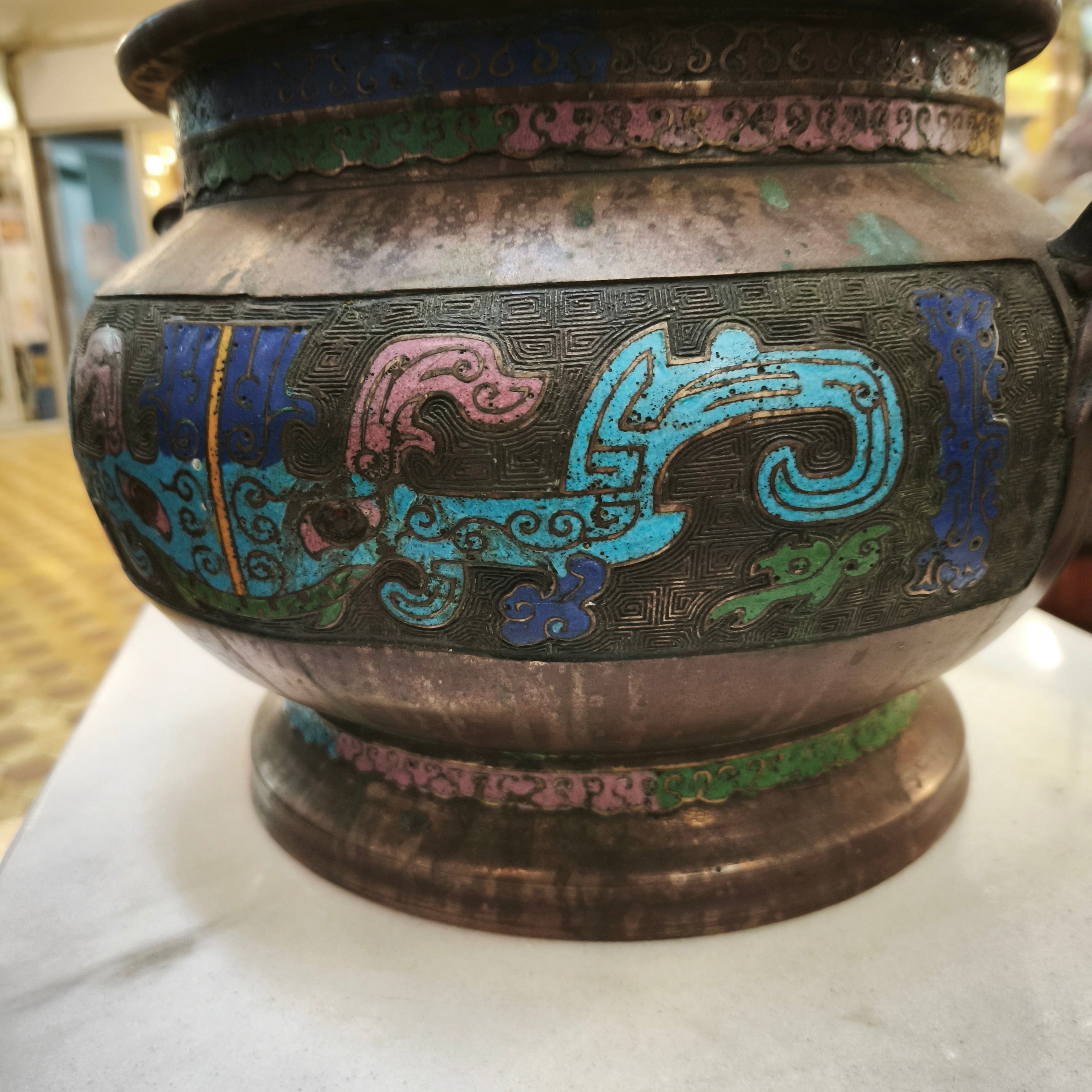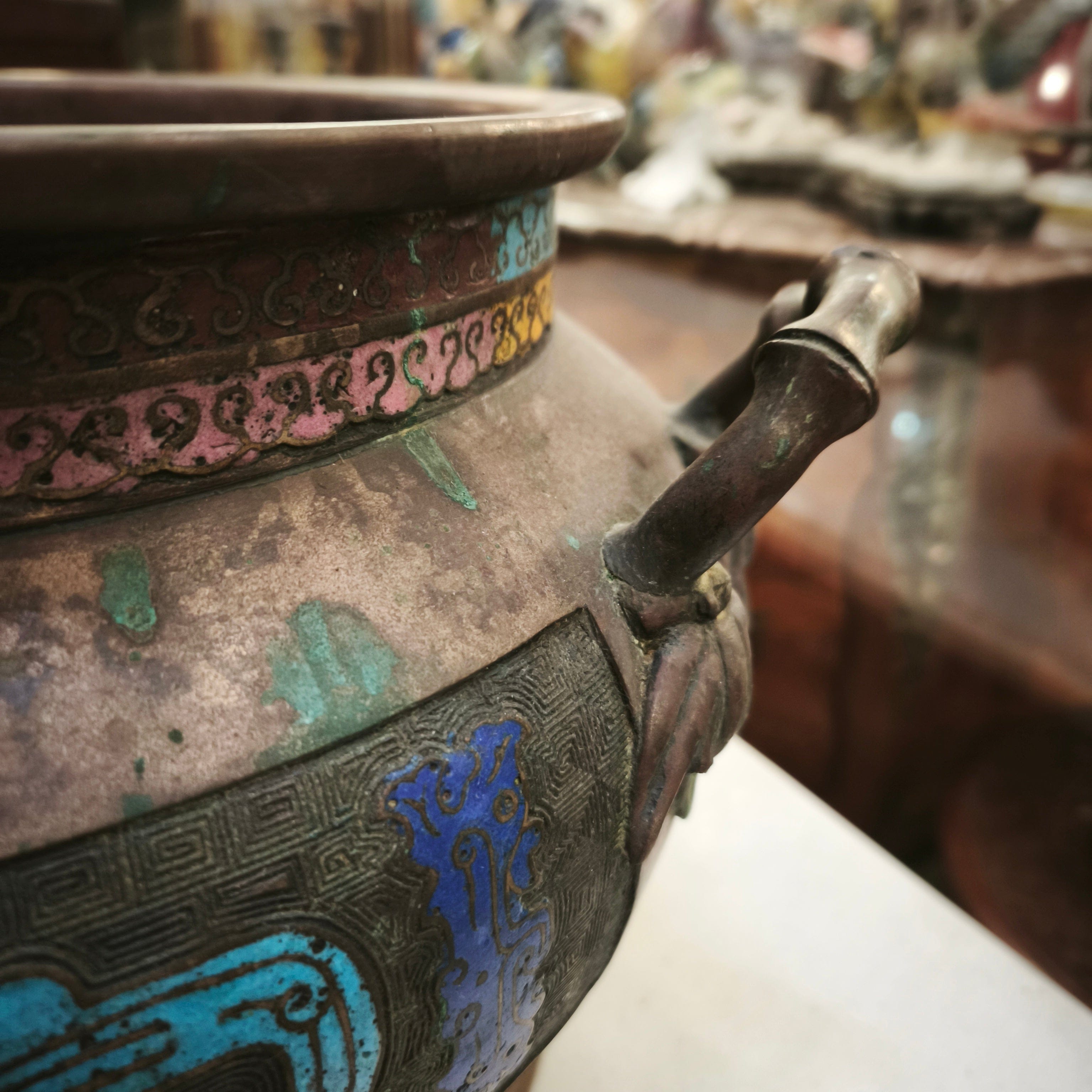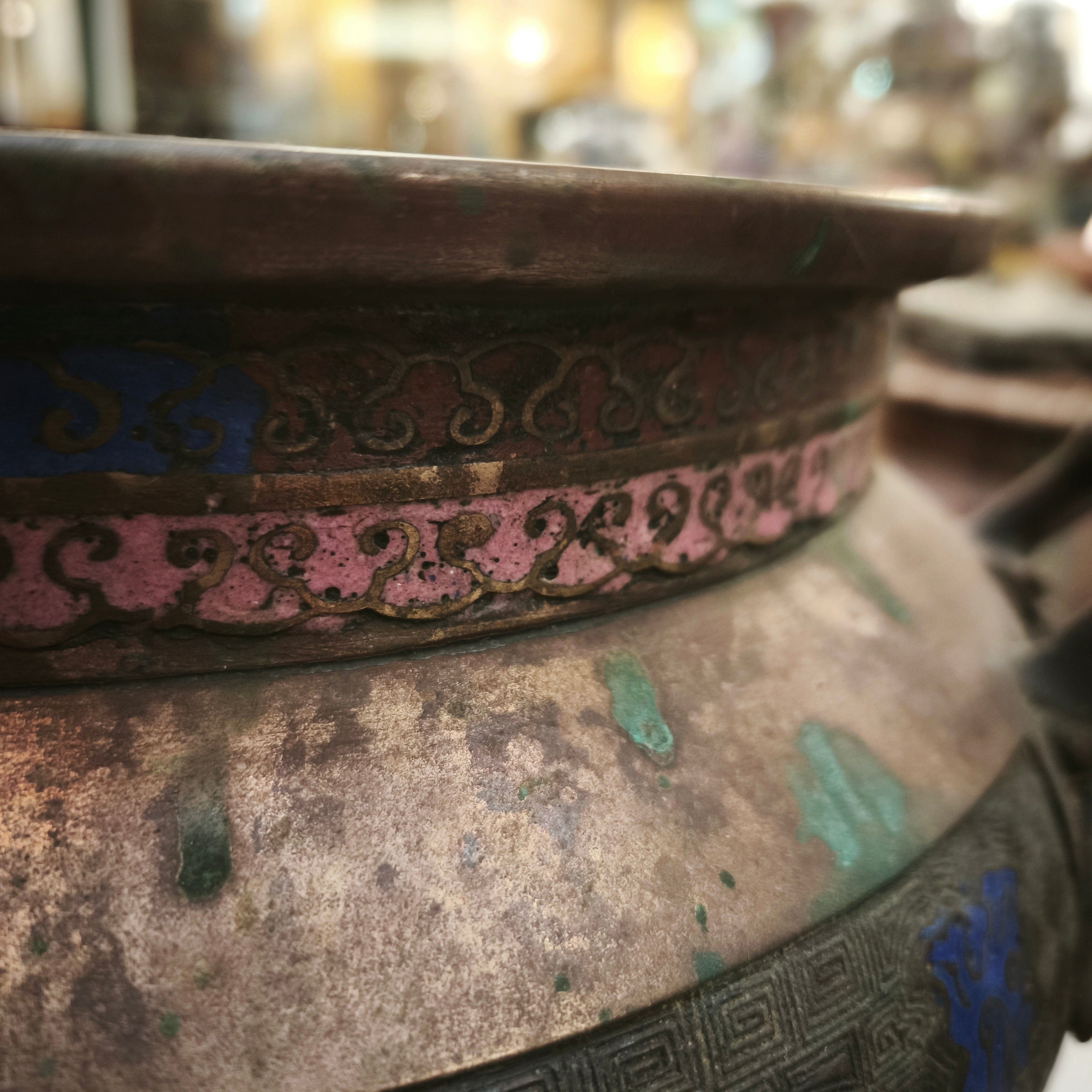 Antigua jardinera, de origen chino, hecho de bronce cloissoné con un bello sincelado en relieves y motivos abstractos, y esmaltes en tonos azules, rosas y verdes.