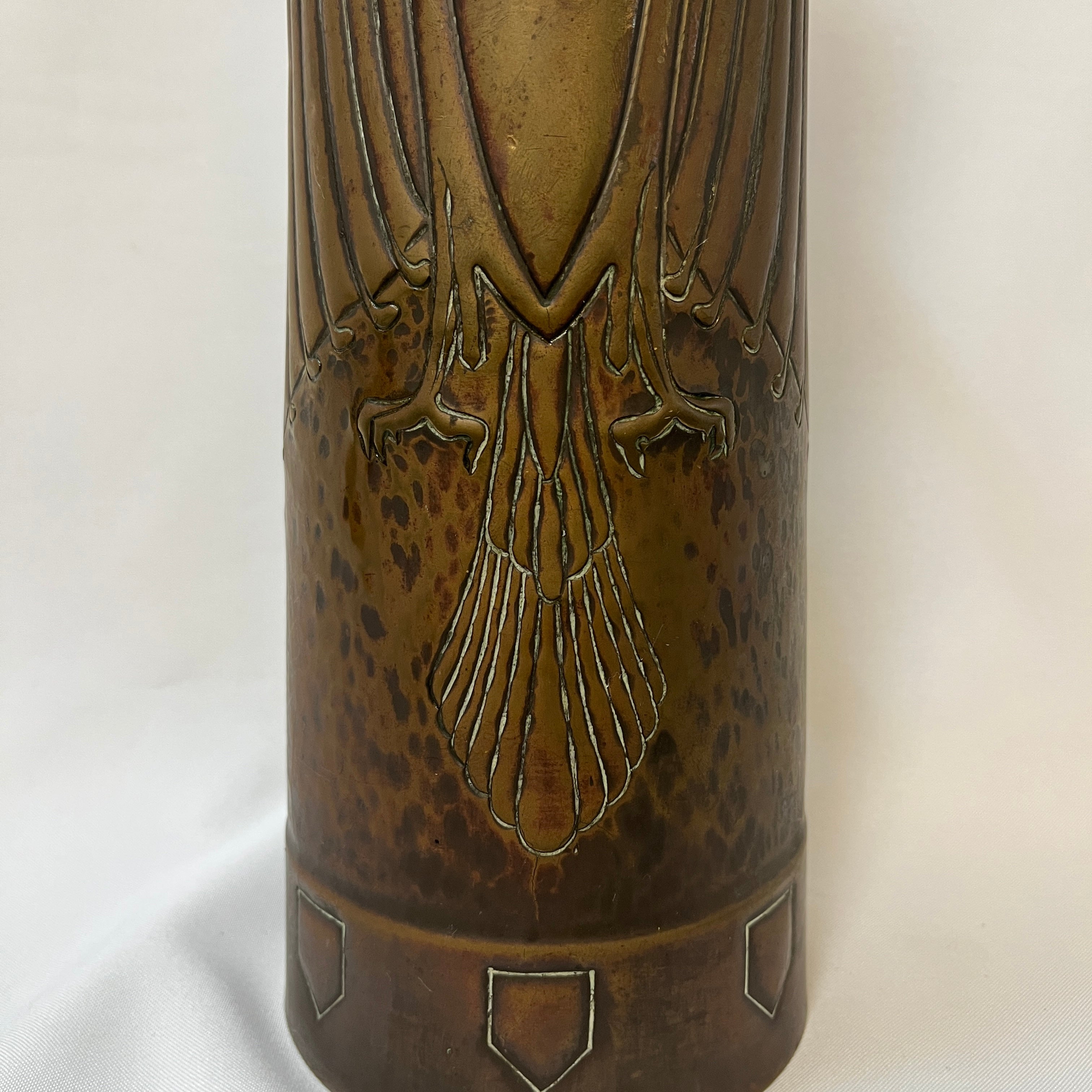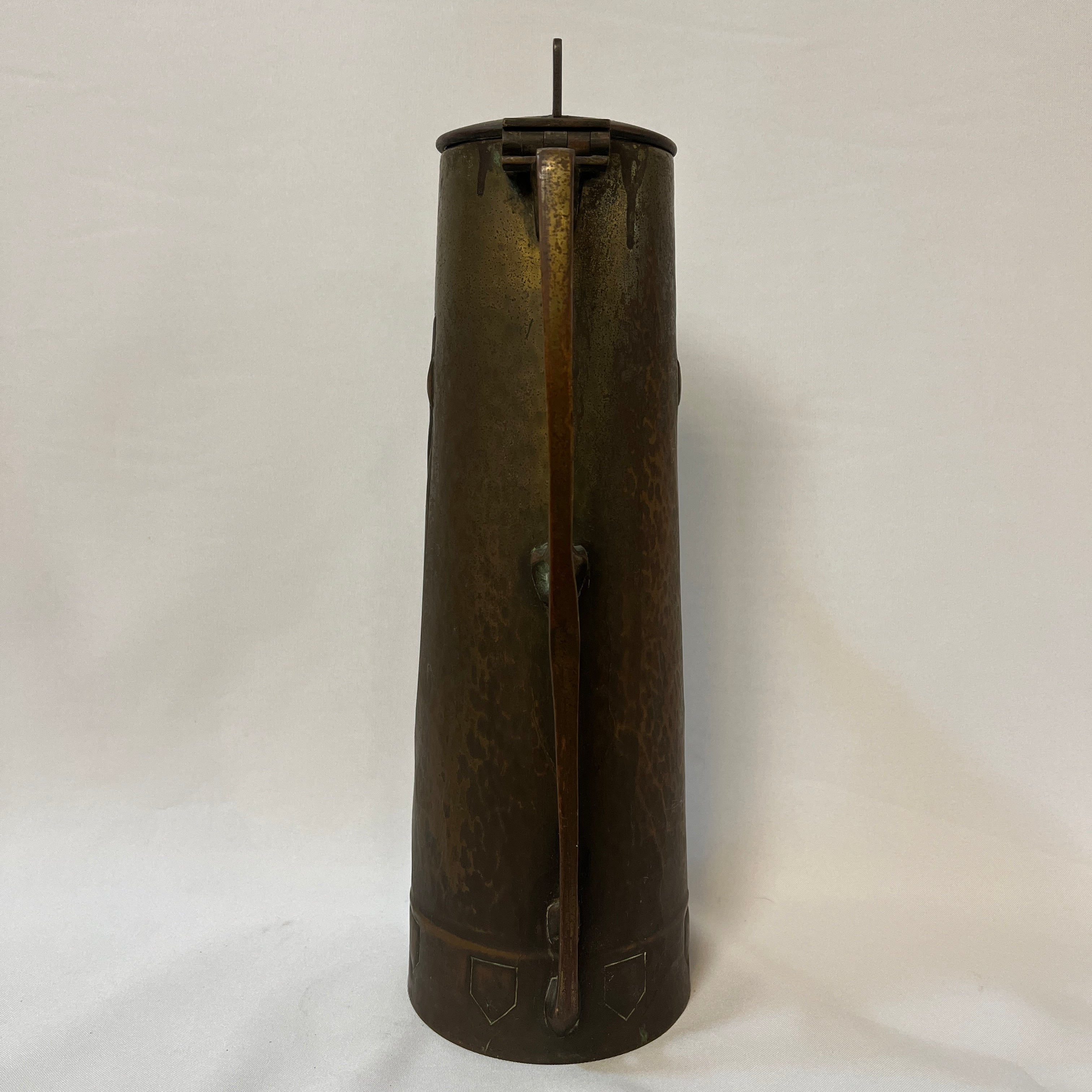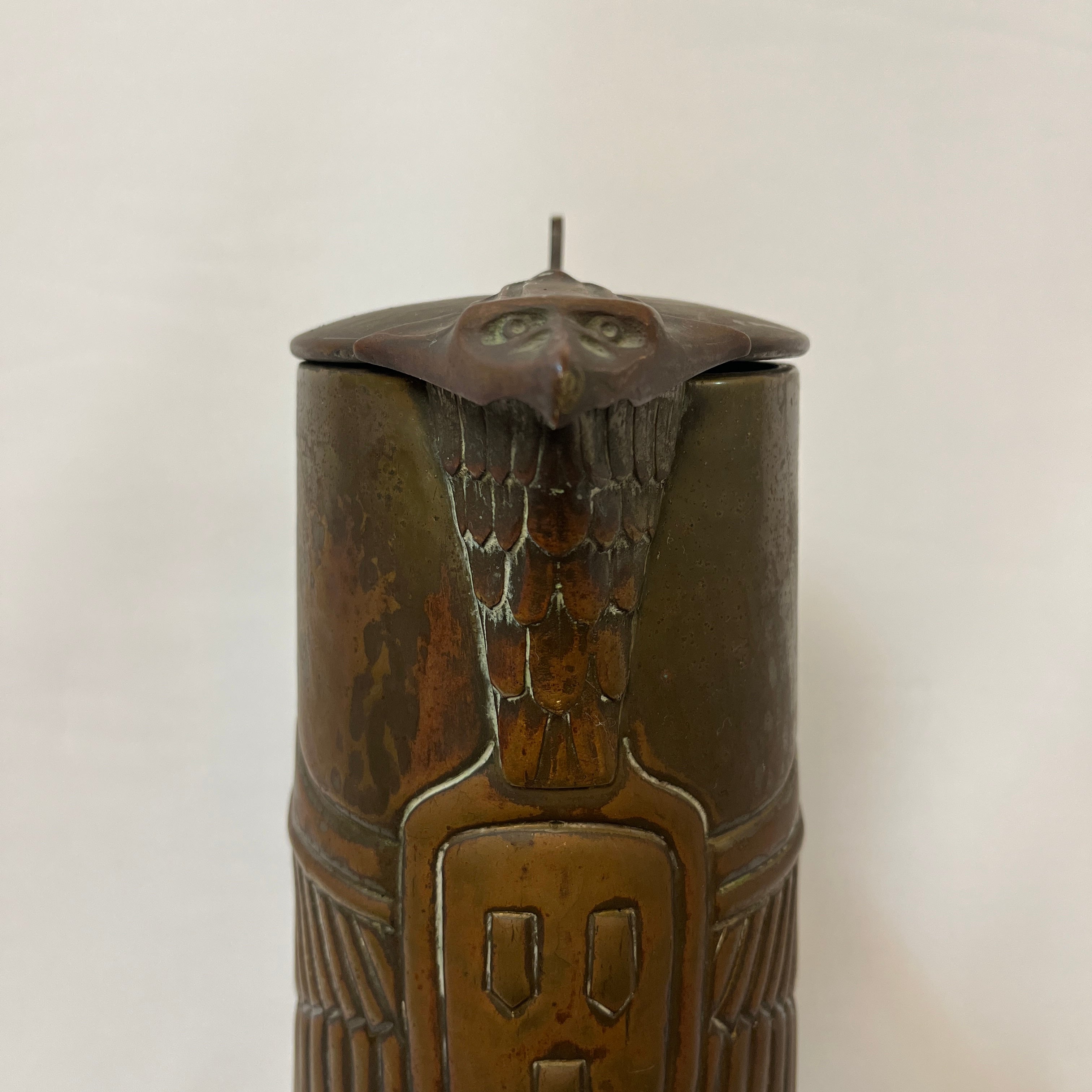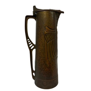 Este objeto es una jarra de cobre envejecido, de estilo Art Nouveau, fabricada en Alemania al rededor de los años 1900. Esta particular pieza de colección destaca por su delicado tallado y manipulación del material, con motivo de águila, muy representativo de Alemania de esos años.