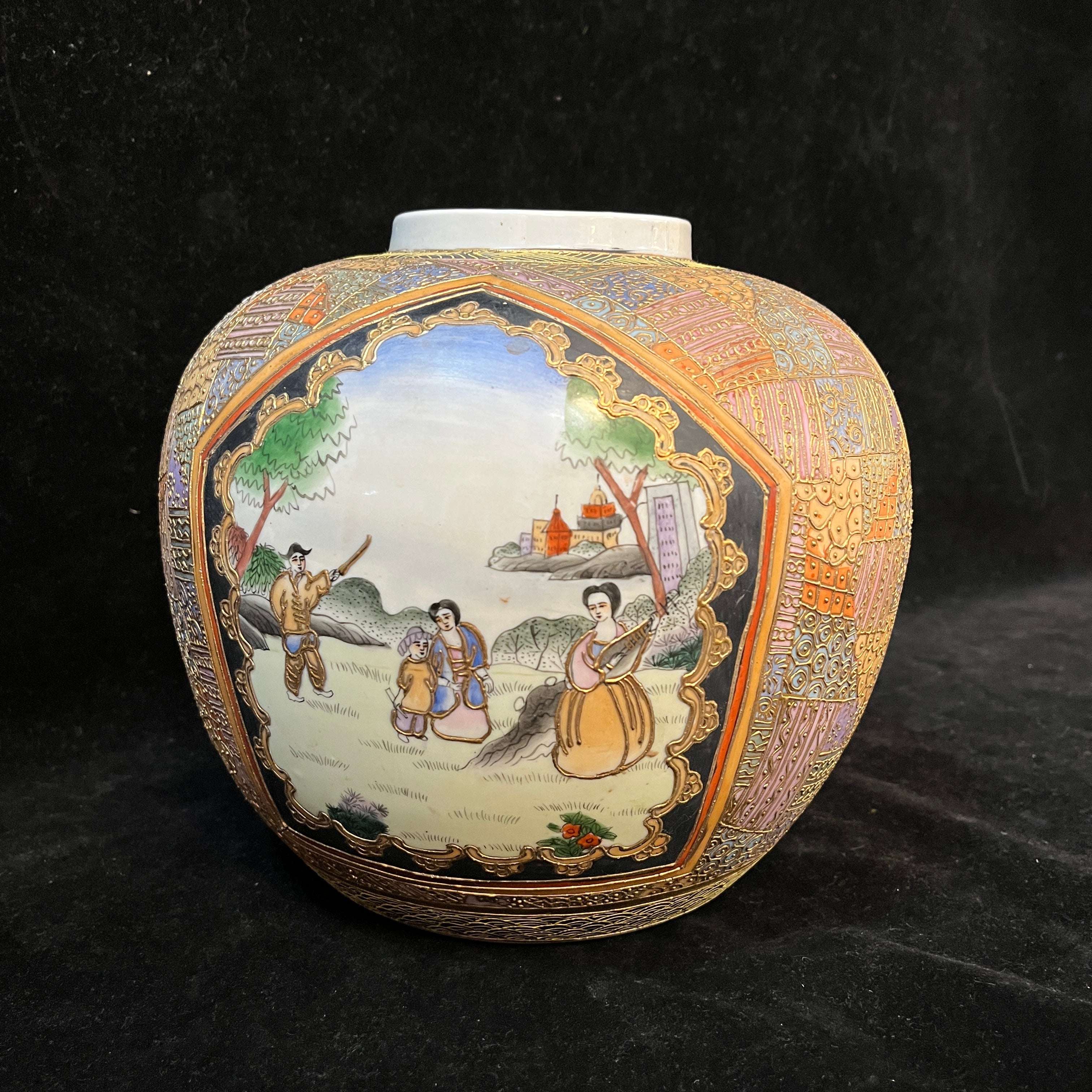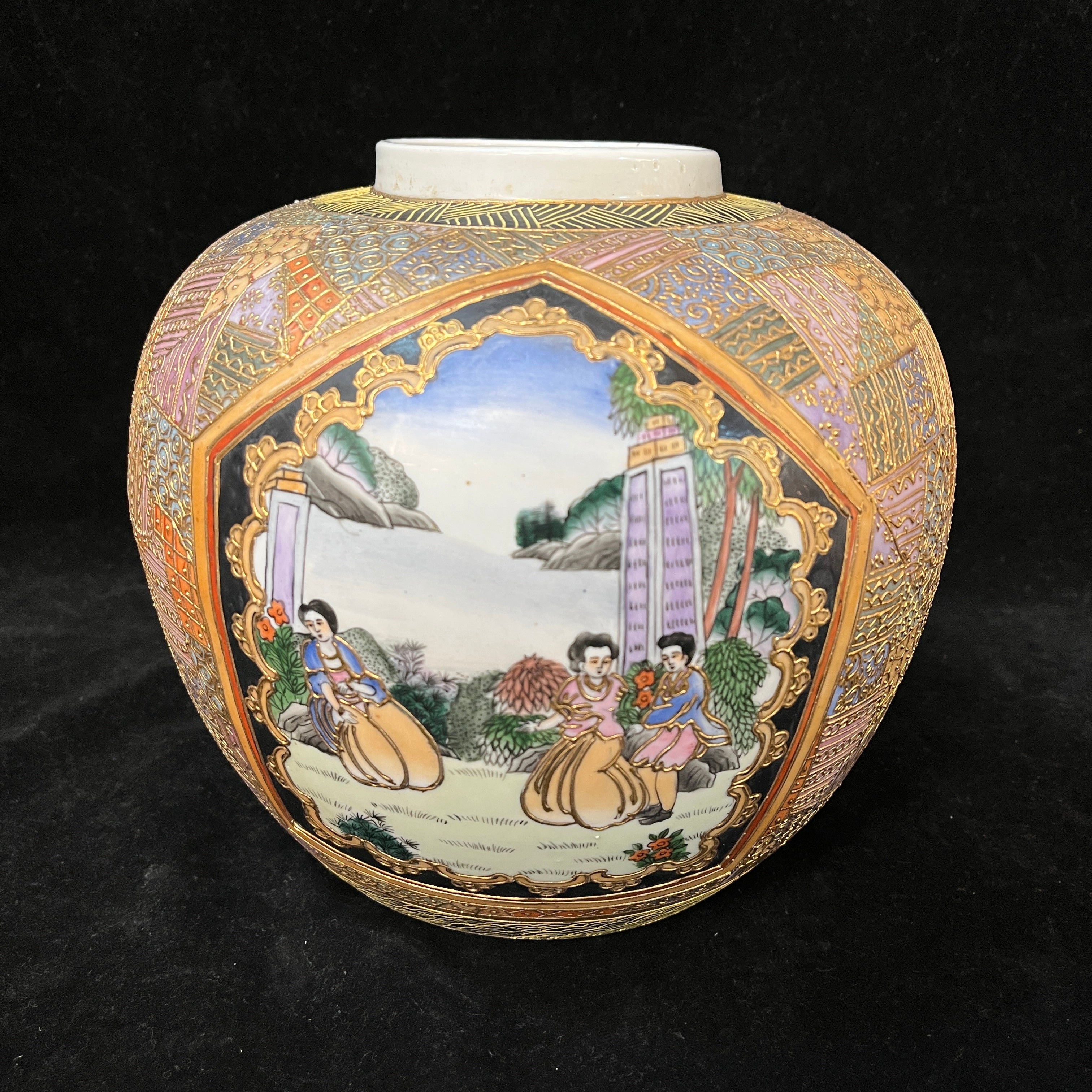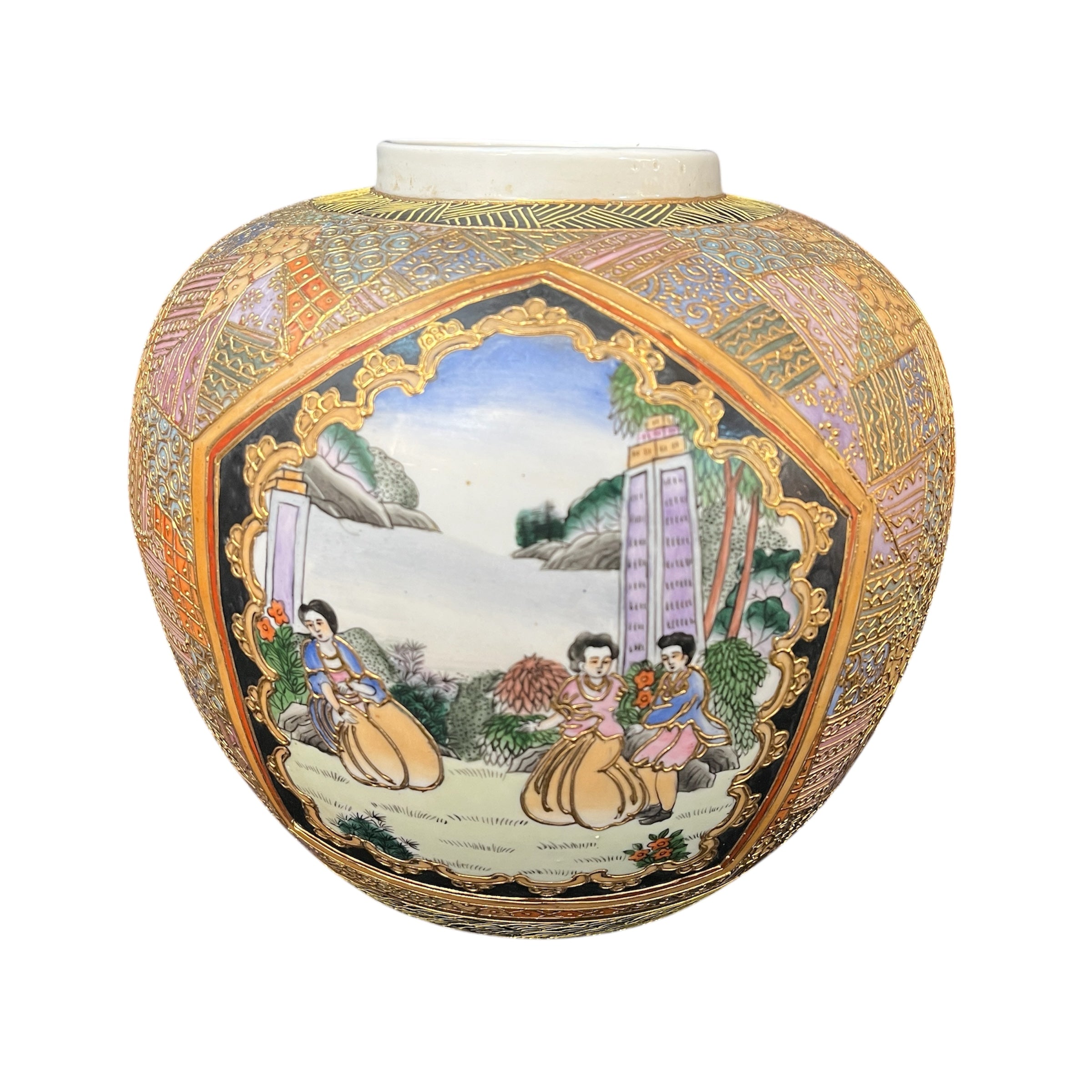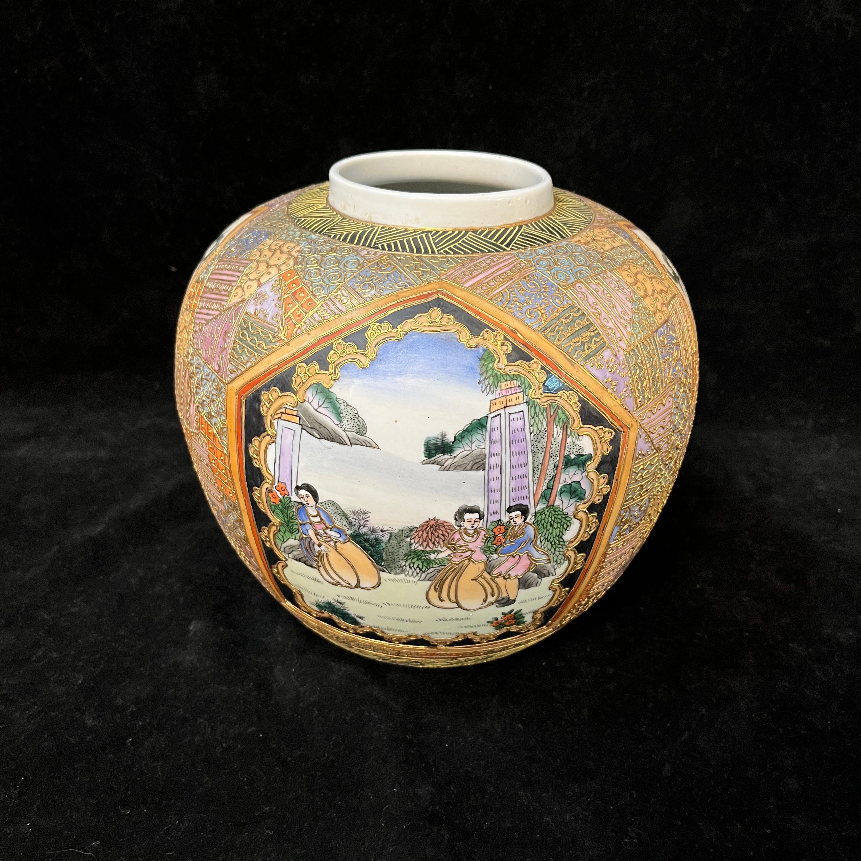 Bello jarrón contemporáneo chino de porcelana, finamente decorado con la técnica Famille Rose, reconocida por su delicada paleta de colores suaves y detalle pictórico. La pieza presenta escenas con figuras humanas con vestimentas tradicionales, representadas en contextos típicos de la cultura china. Estas escenas se alternan con medallones florales, todo enmarcado por intrincados patrones geométricos en diversos tonos, realzados con detalles en dorado que unifican armoniosamente el conjunto.