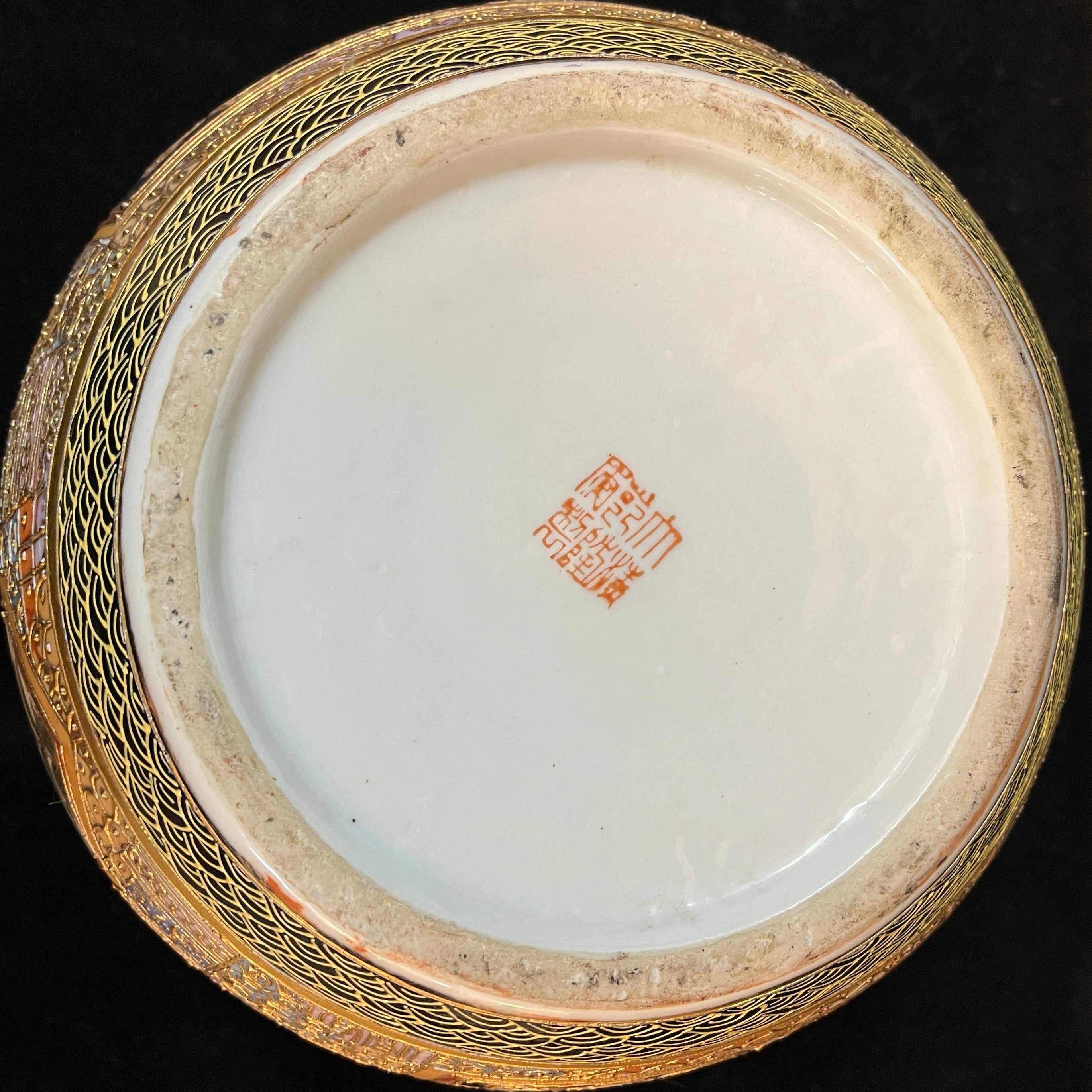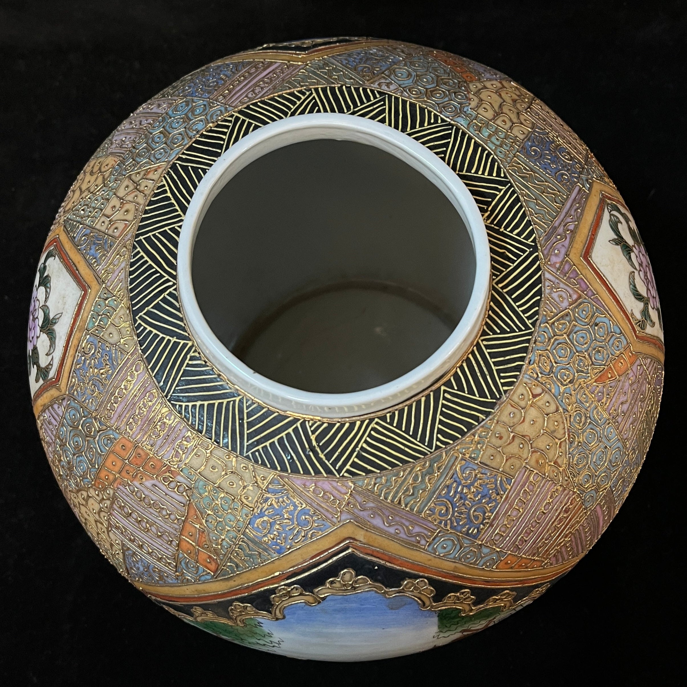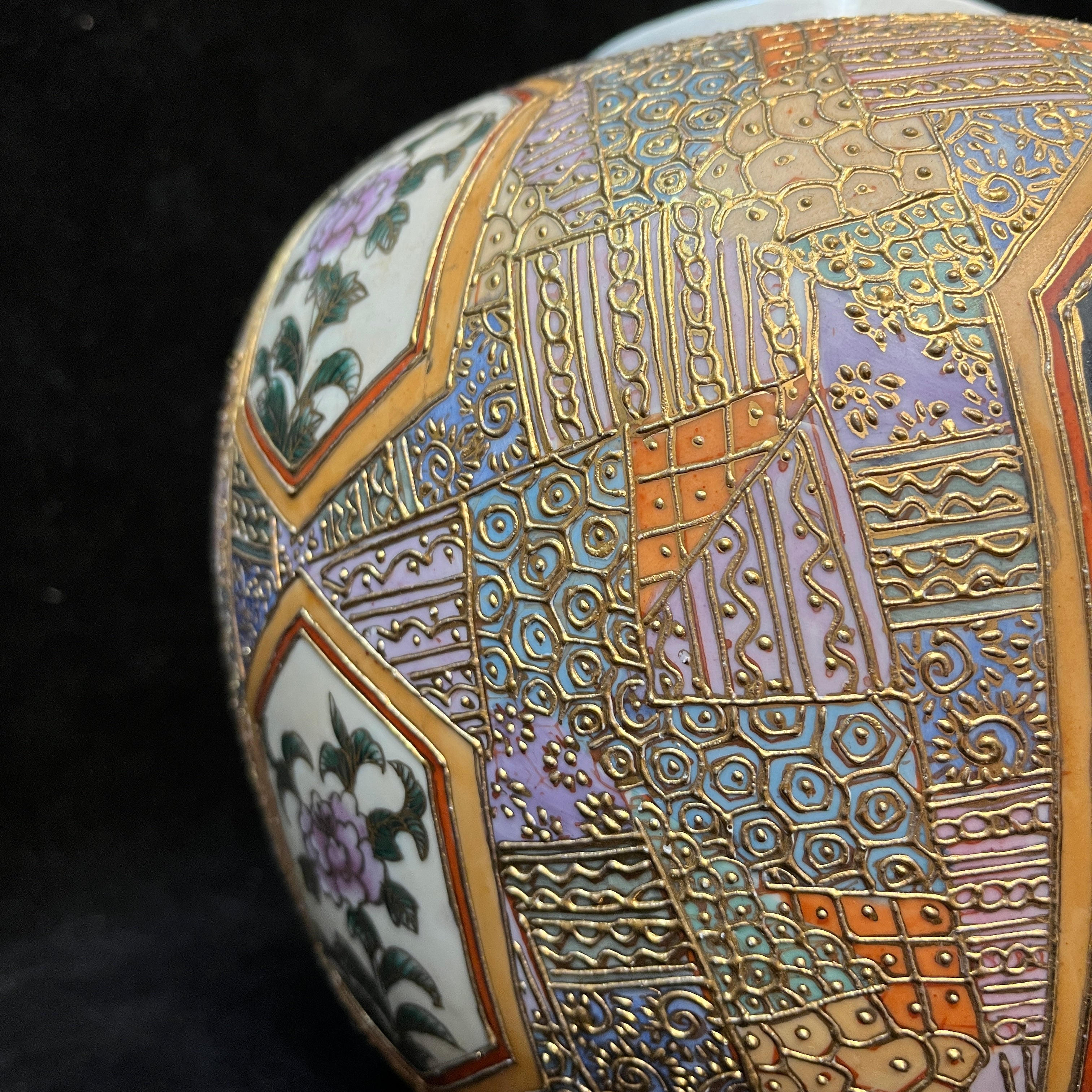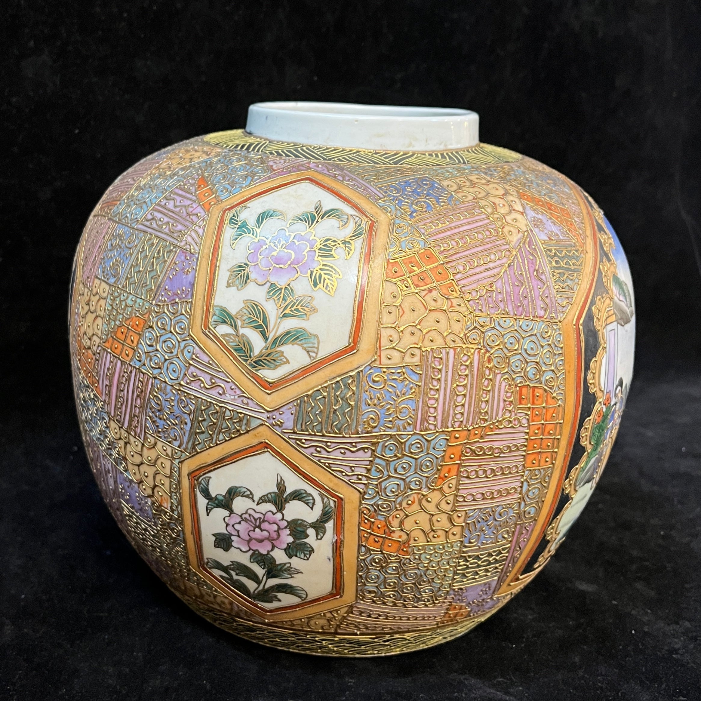 Bello jarrón contemporáneo chino de porcelana, finamente decorado con la técnica Famille Rose, reconocida por su delicada paleta de colores suaves y detalle pictórico. La pieza presenta escenas con figuras humanas con vestimentas tradicionales, representadas en contextos típicos de la cultura china. Estas escenas se alternan con medallones florales, todo enmarcado por intrincados patrones geométricos en diversos tonos, realzados con detalles en dorado que unifican armoniosamente el conjunto.