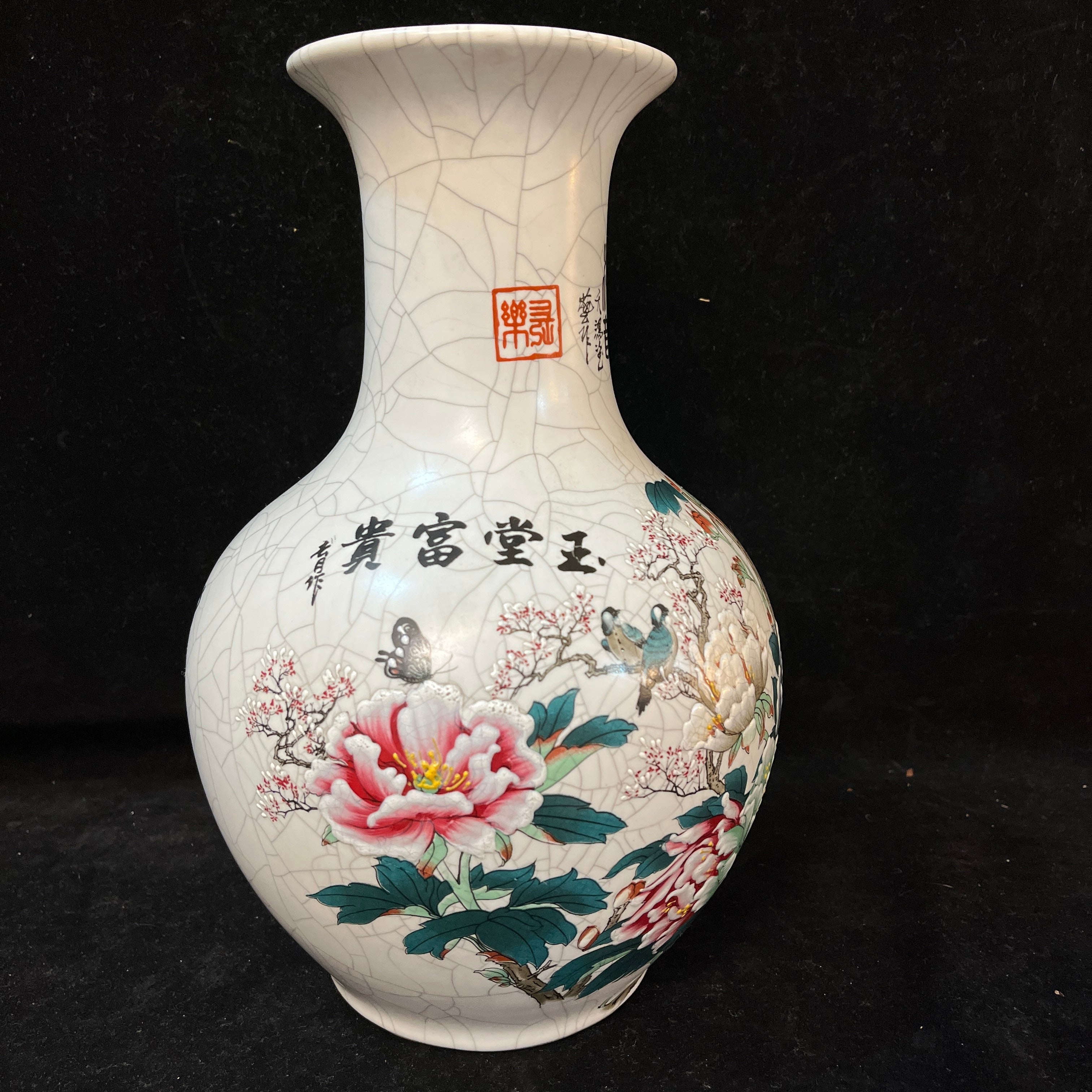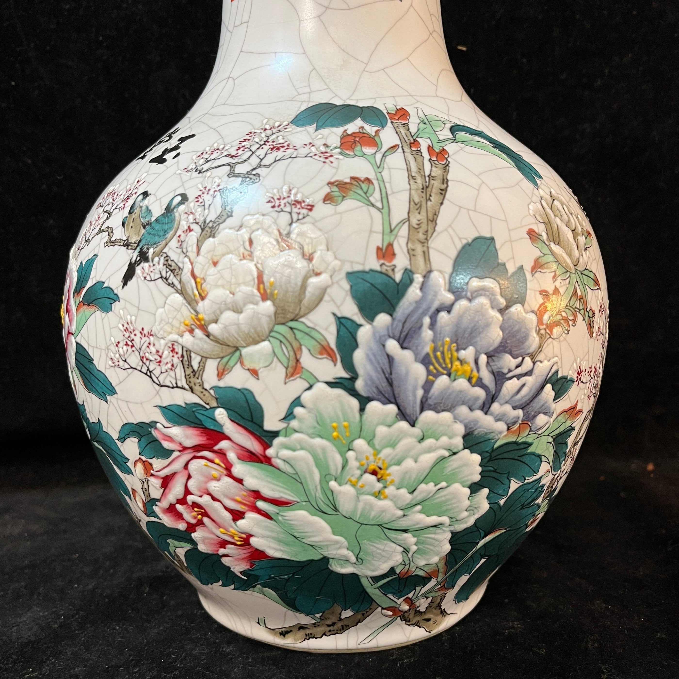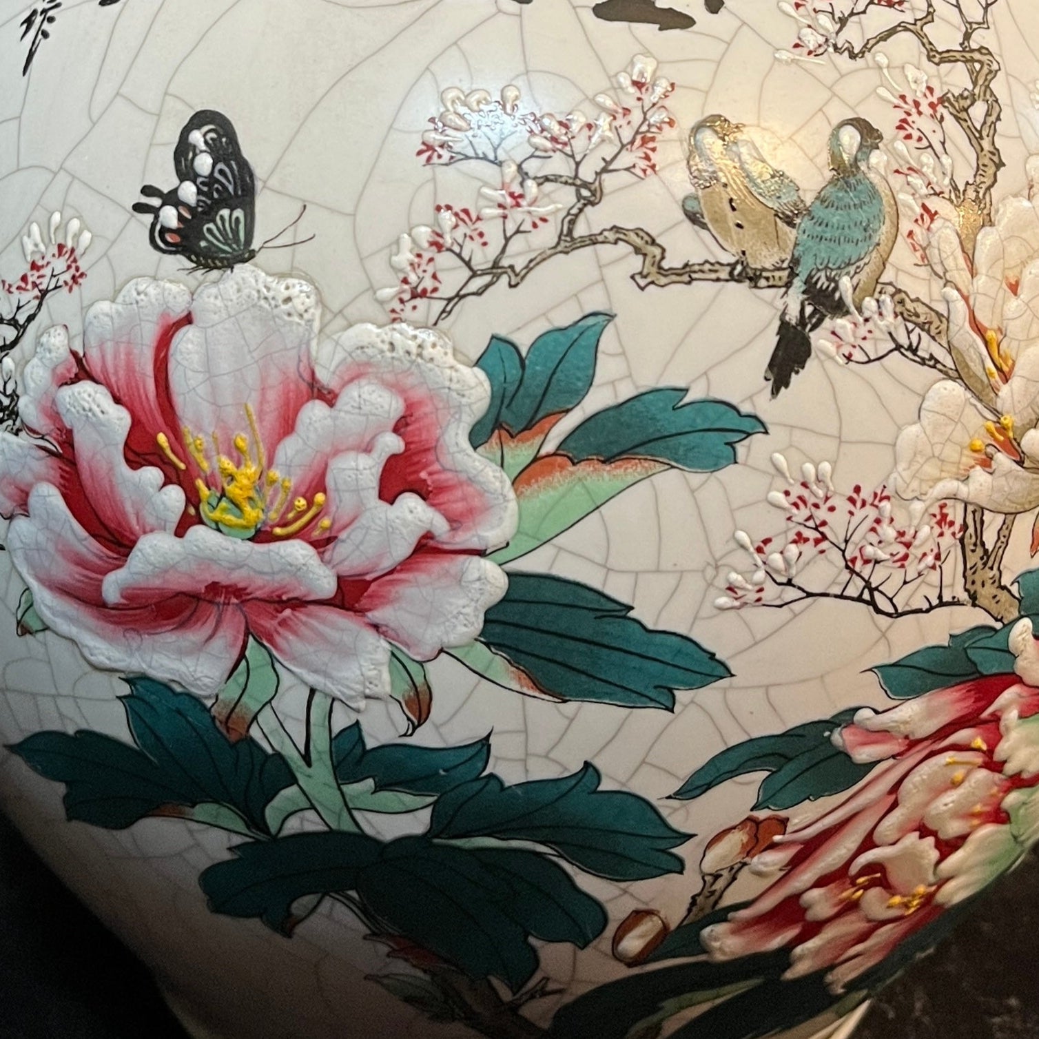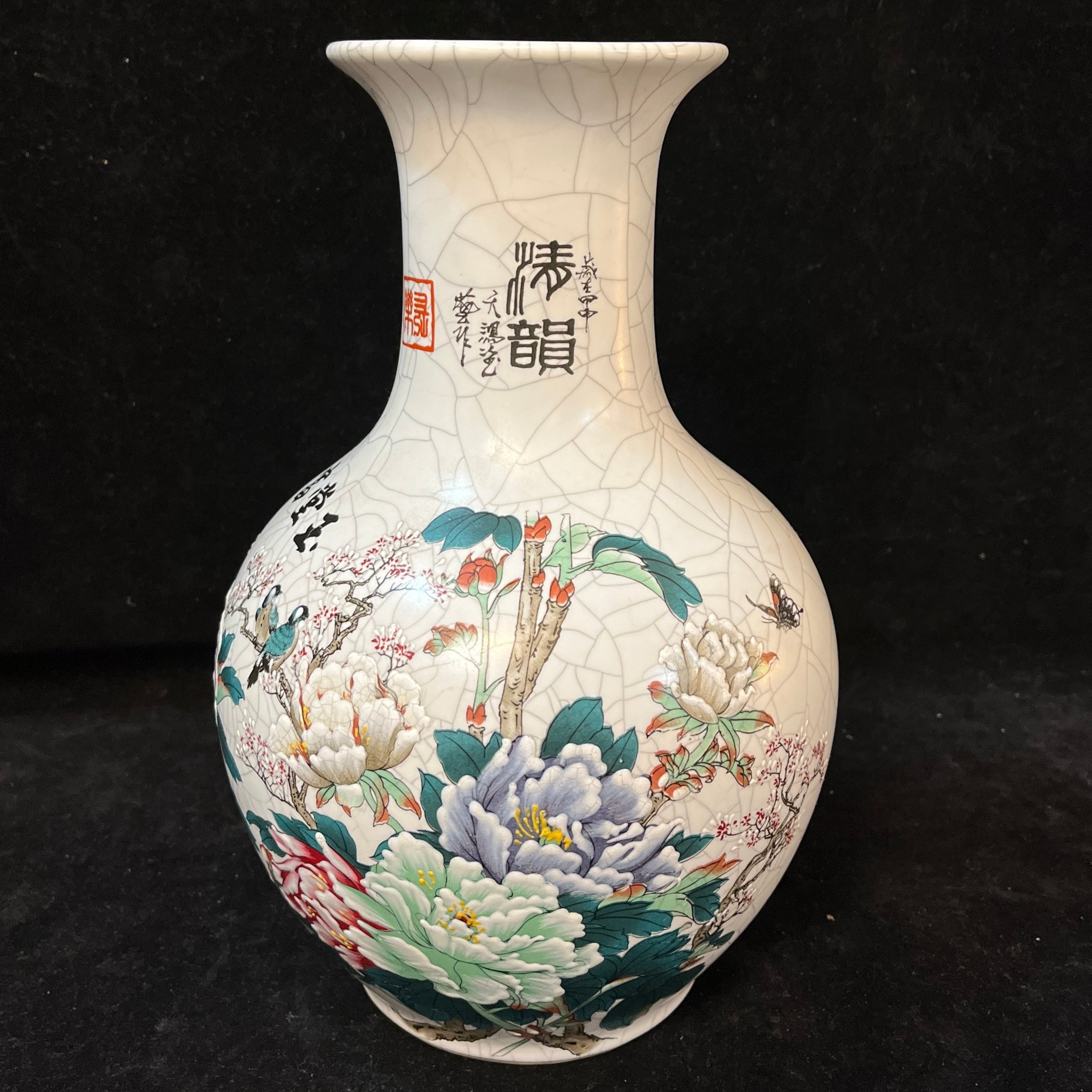 Hermoso jarrón contemporáneo chino de loza 'Famille Rose', con delicado craquelado, finamente decorado con una escena natural que incluye flores, mariposas, árboles y aves. La composición se complementa con un elegante poema en caligrafía china, que evoca la armonía y la belleza del mundo natural.