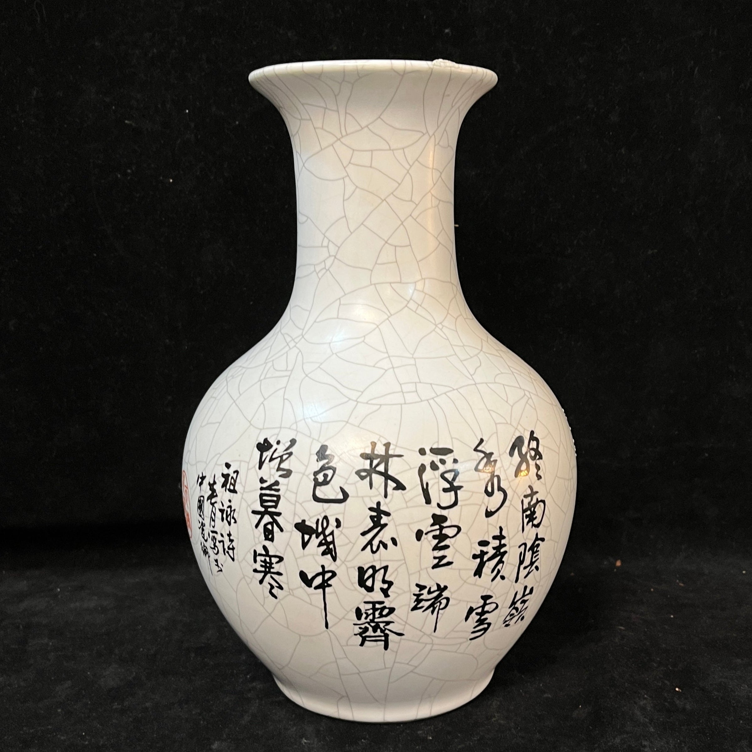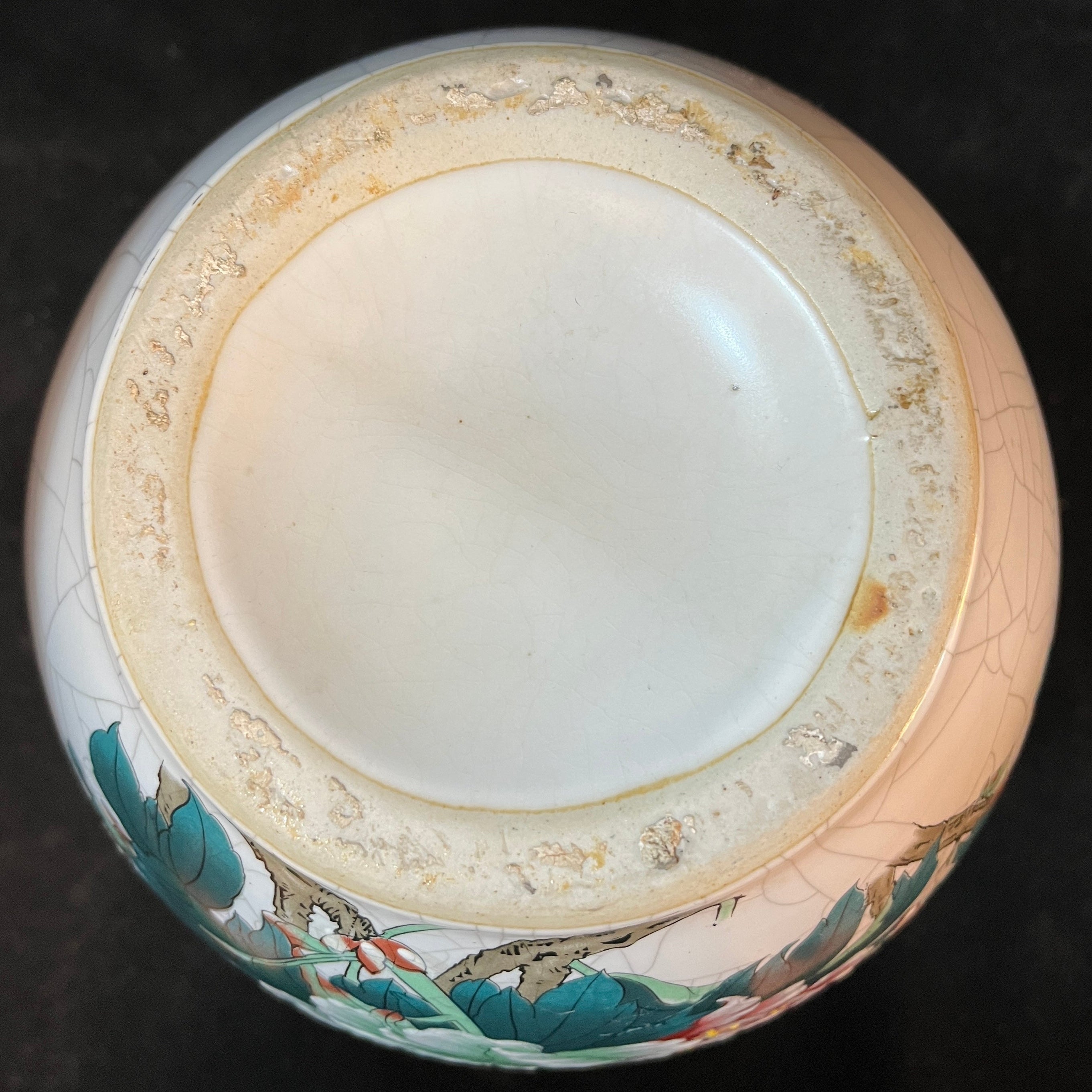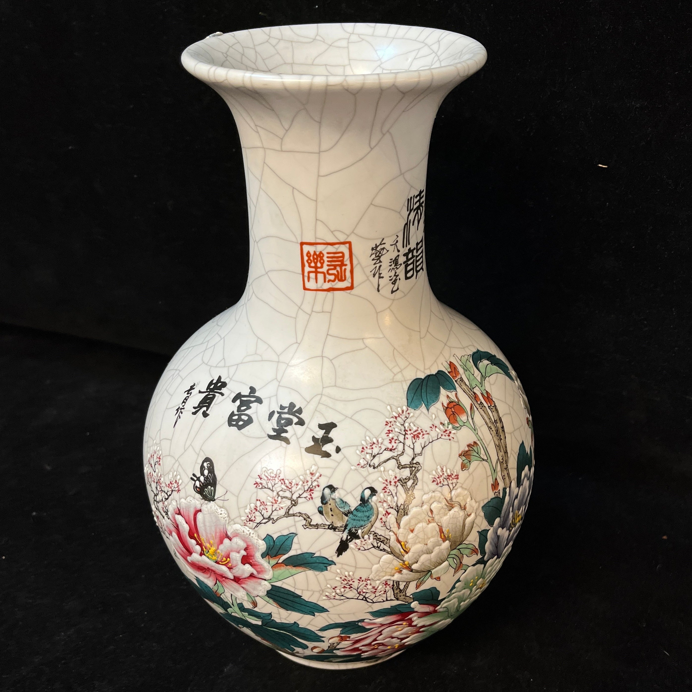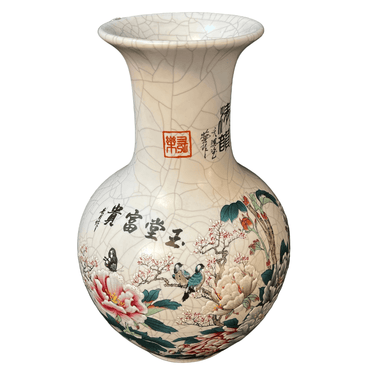 Hermoso jarrón contemporáneo chino de loza 'Famille Rose', con delicado craquelado, finamente decorado con una escena natural que incluye flores, mariposas, árboles y aves. La composición se complementa con un elegante poema en caligrafía china, que evoca la armonía y la belleza del mundo natural.