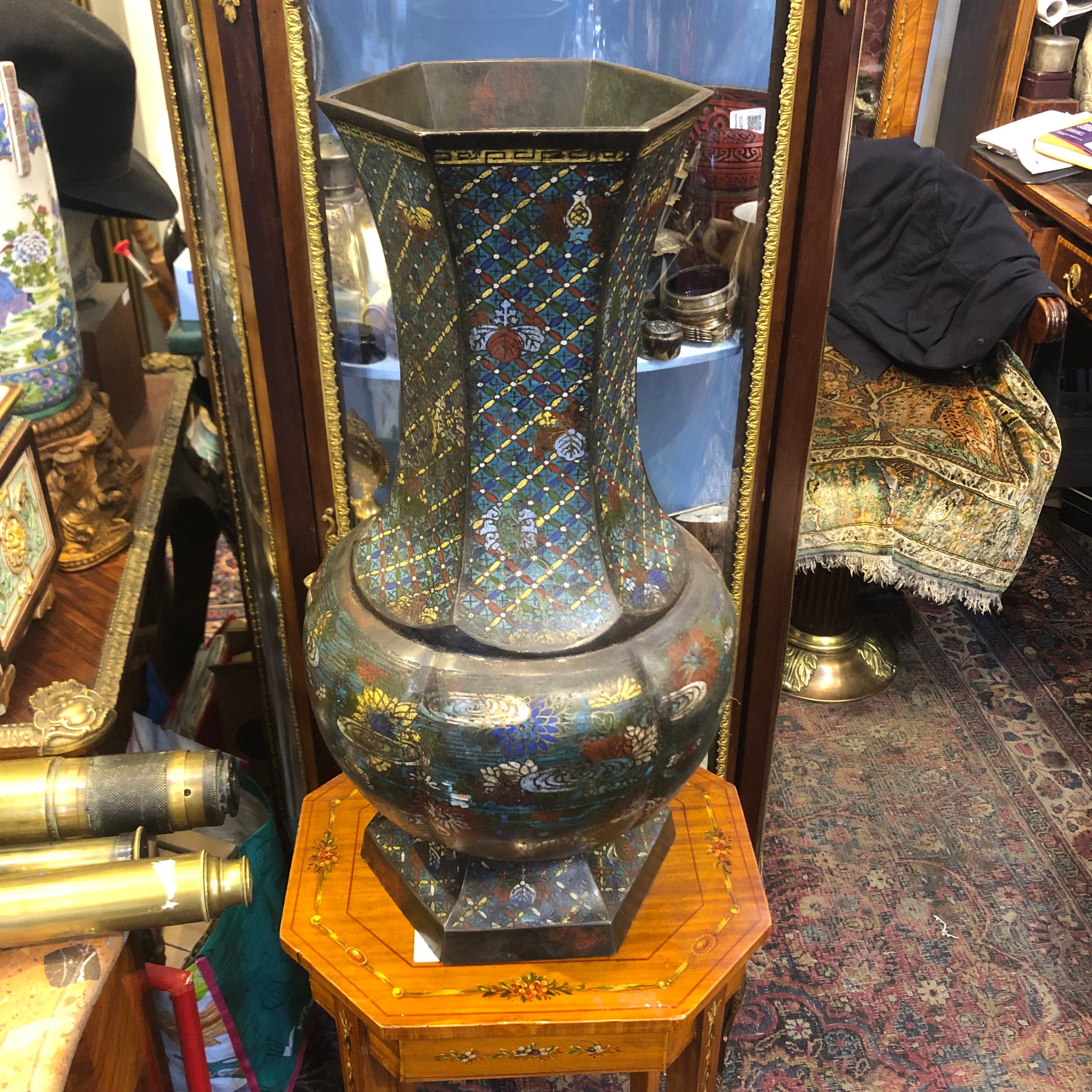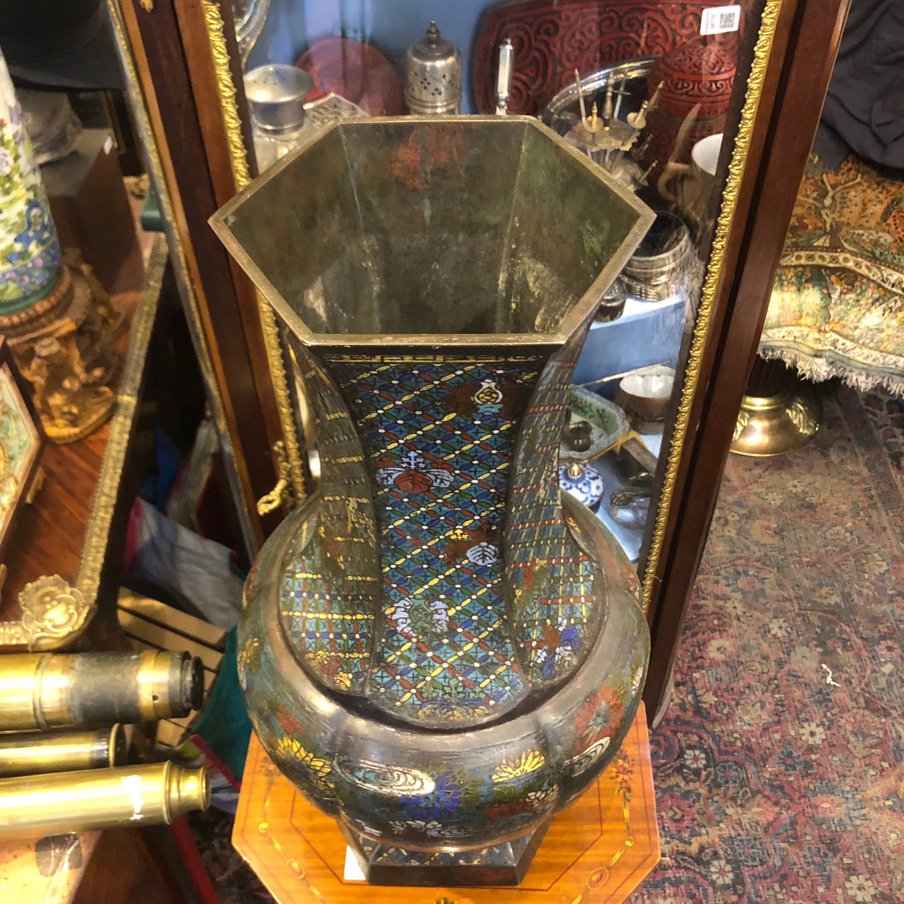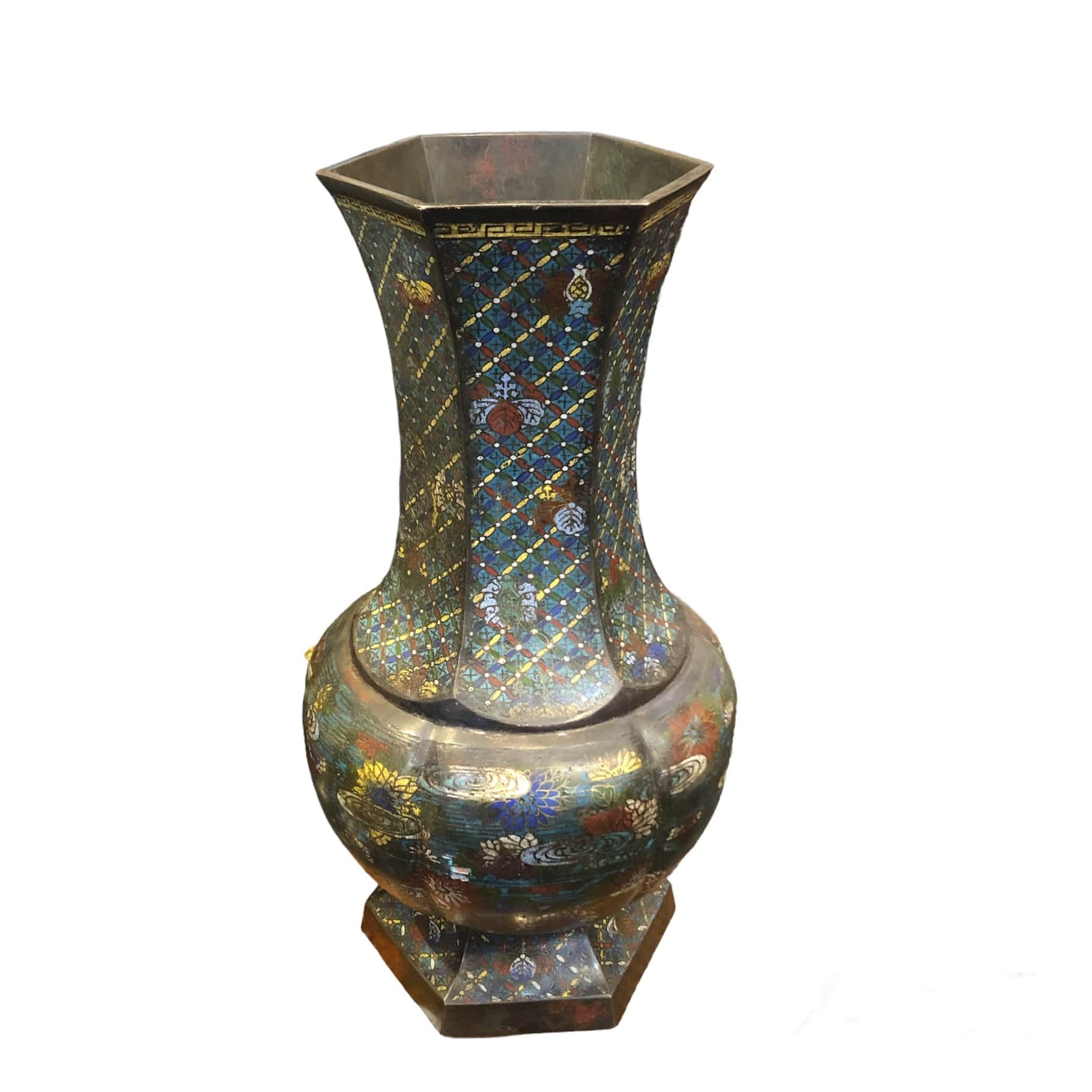 Bello jarrón con boca hexagonal y diseño de flores en varios colores, en técnica cloissoné.