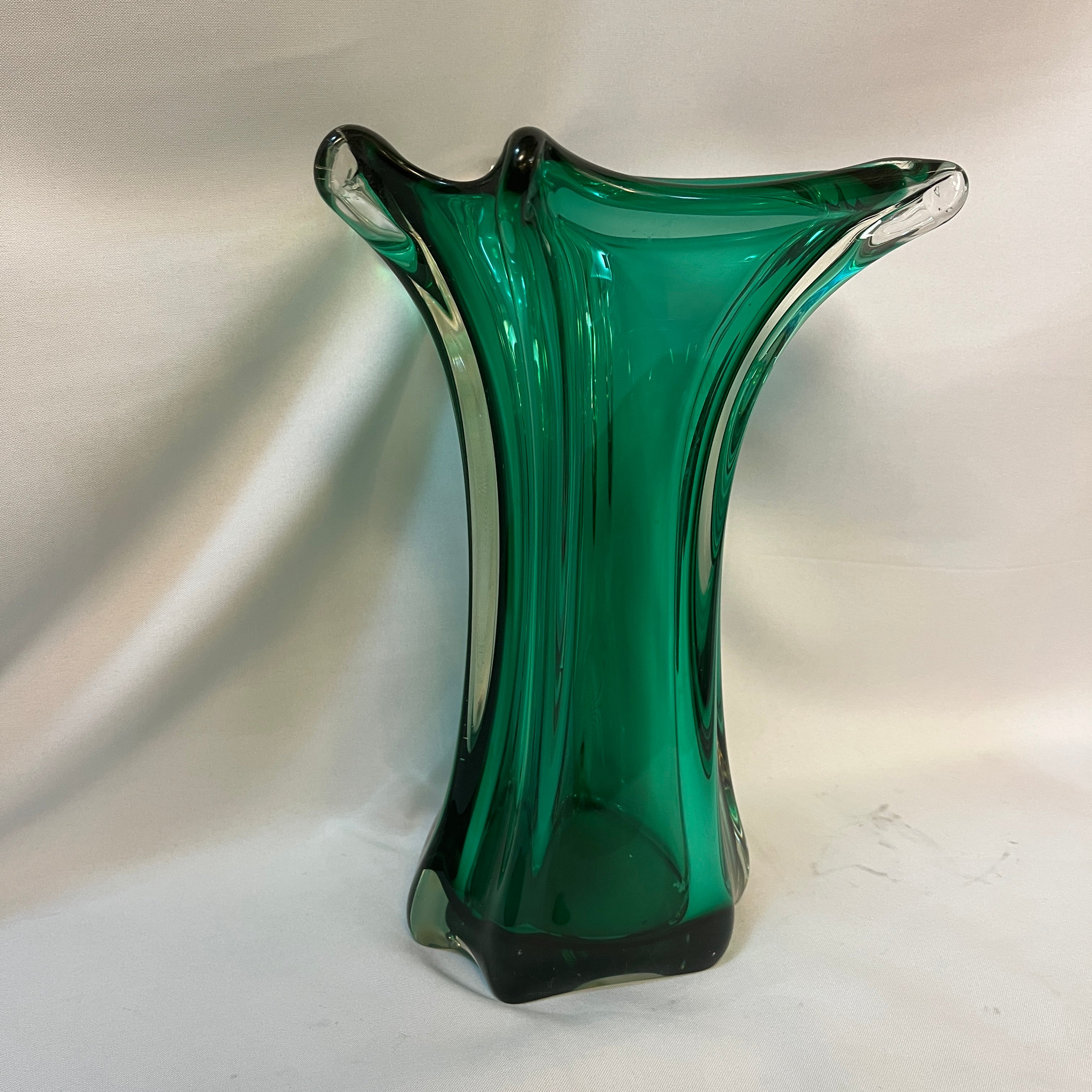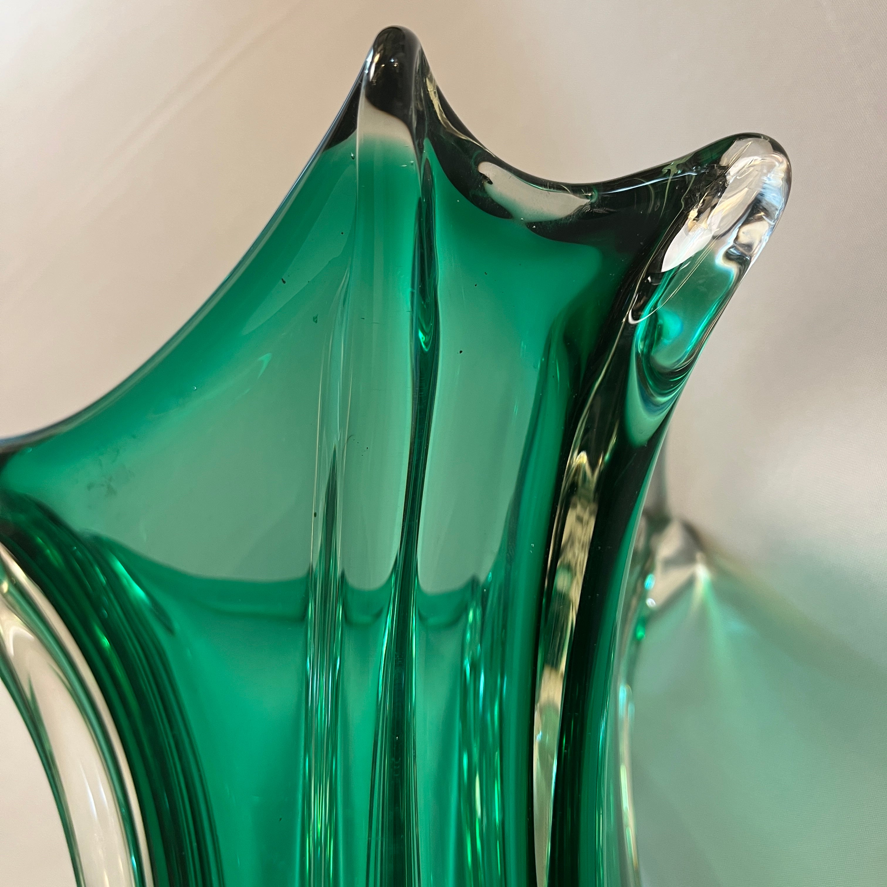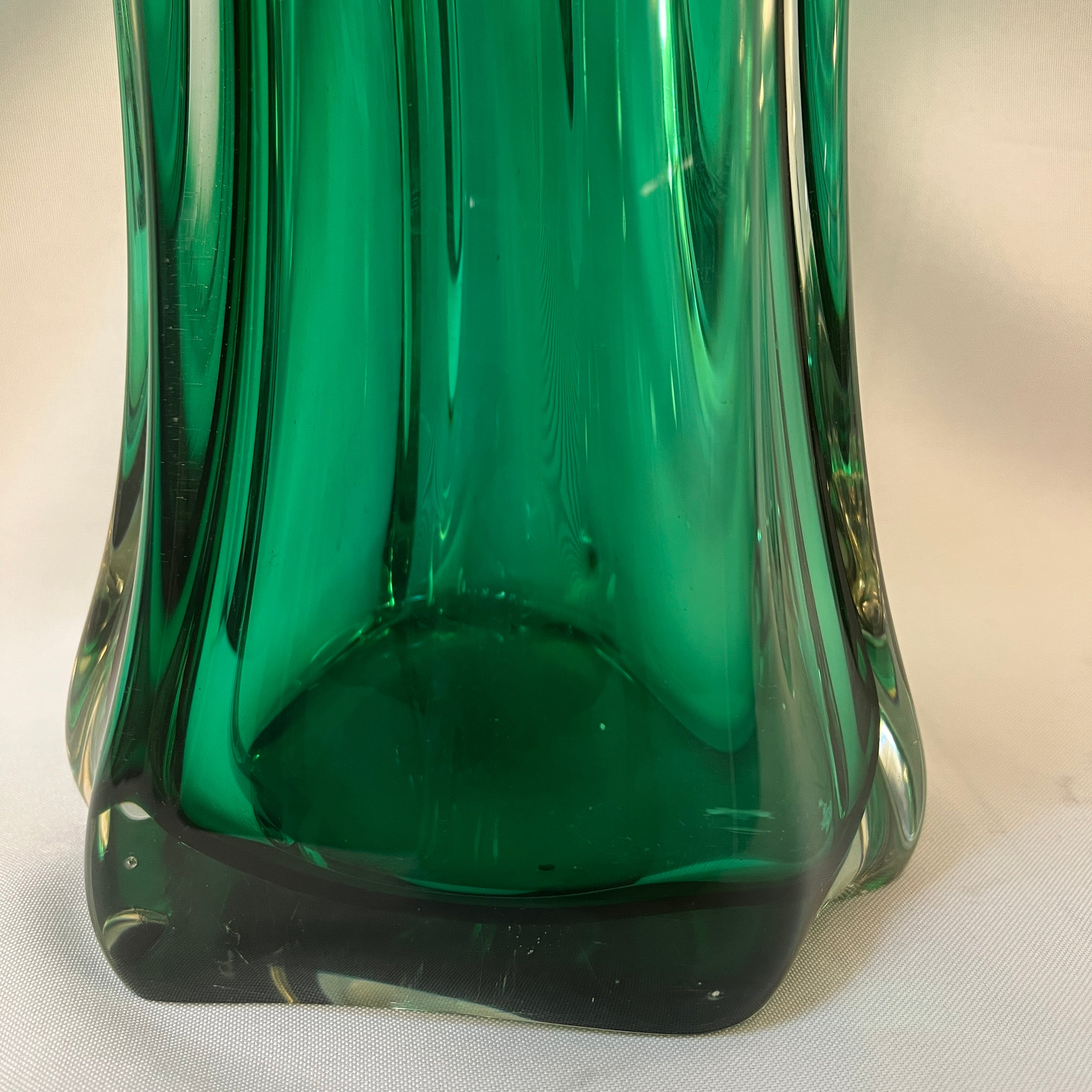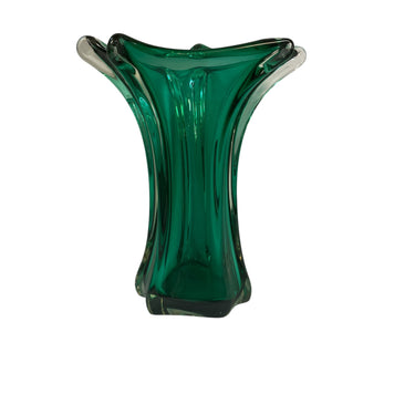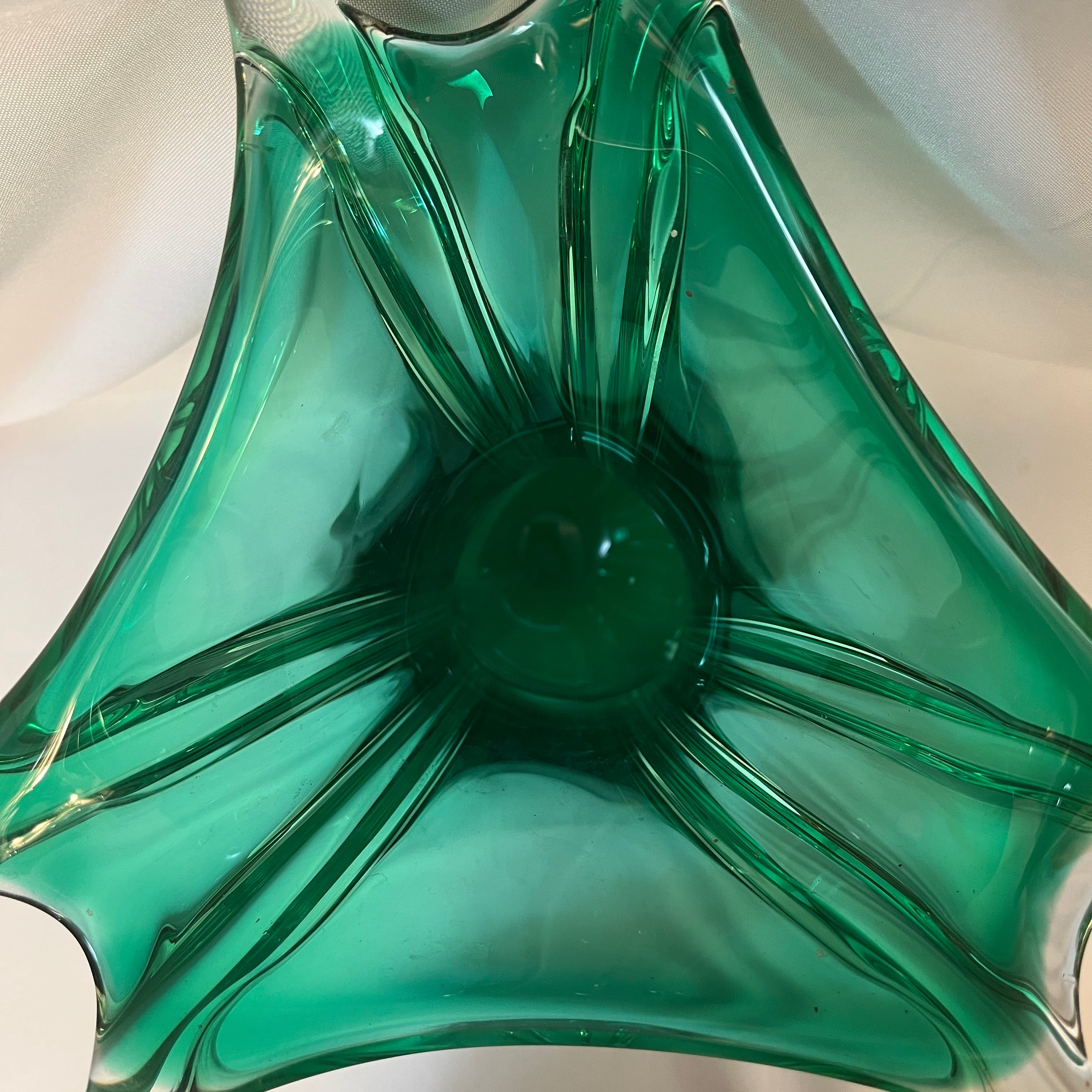 Hermoso jarrón de cristal de la prestigiosa marca belga Van Saint Lambert de un verde intenso magnético que logra realzar la delicadas formas curvilíneas.
