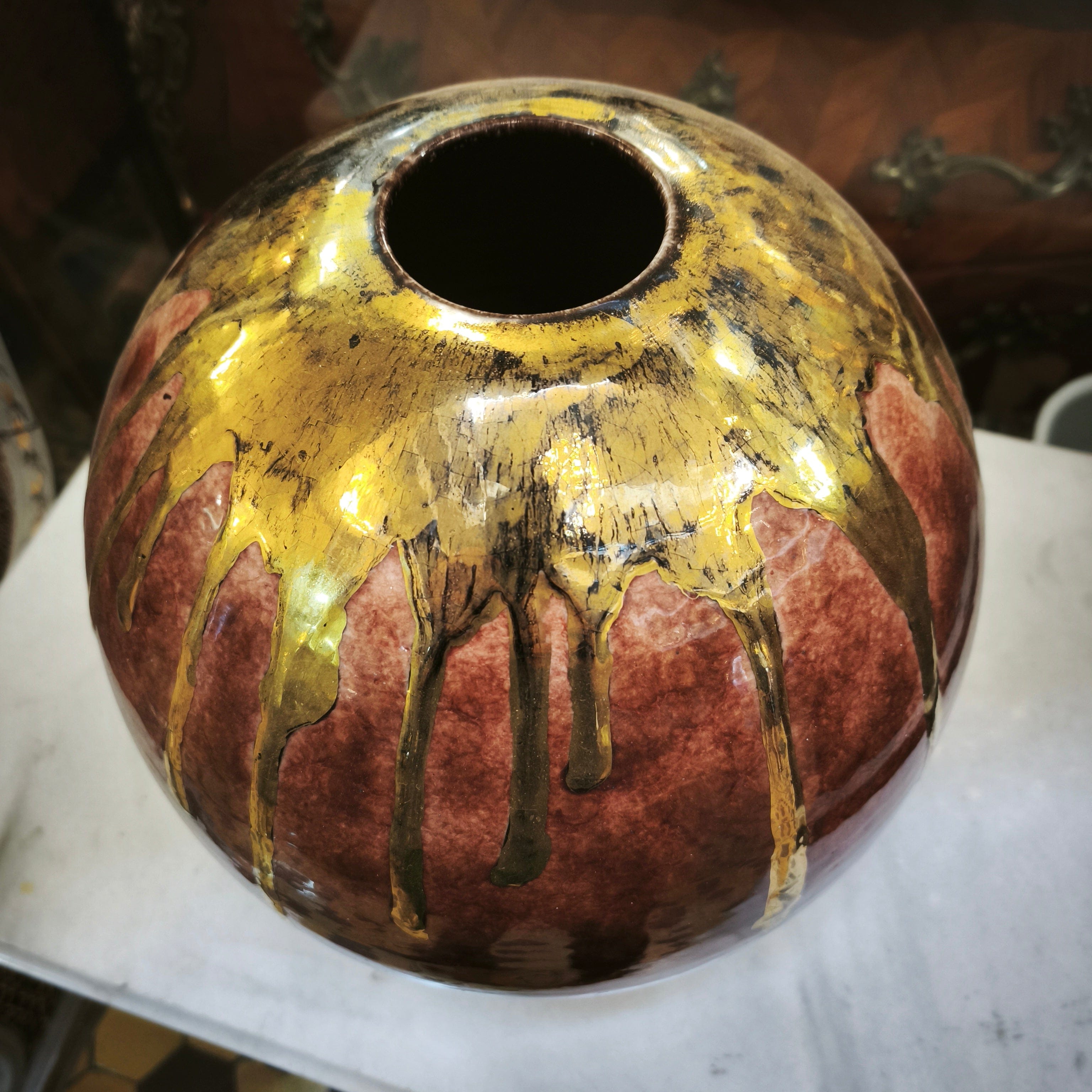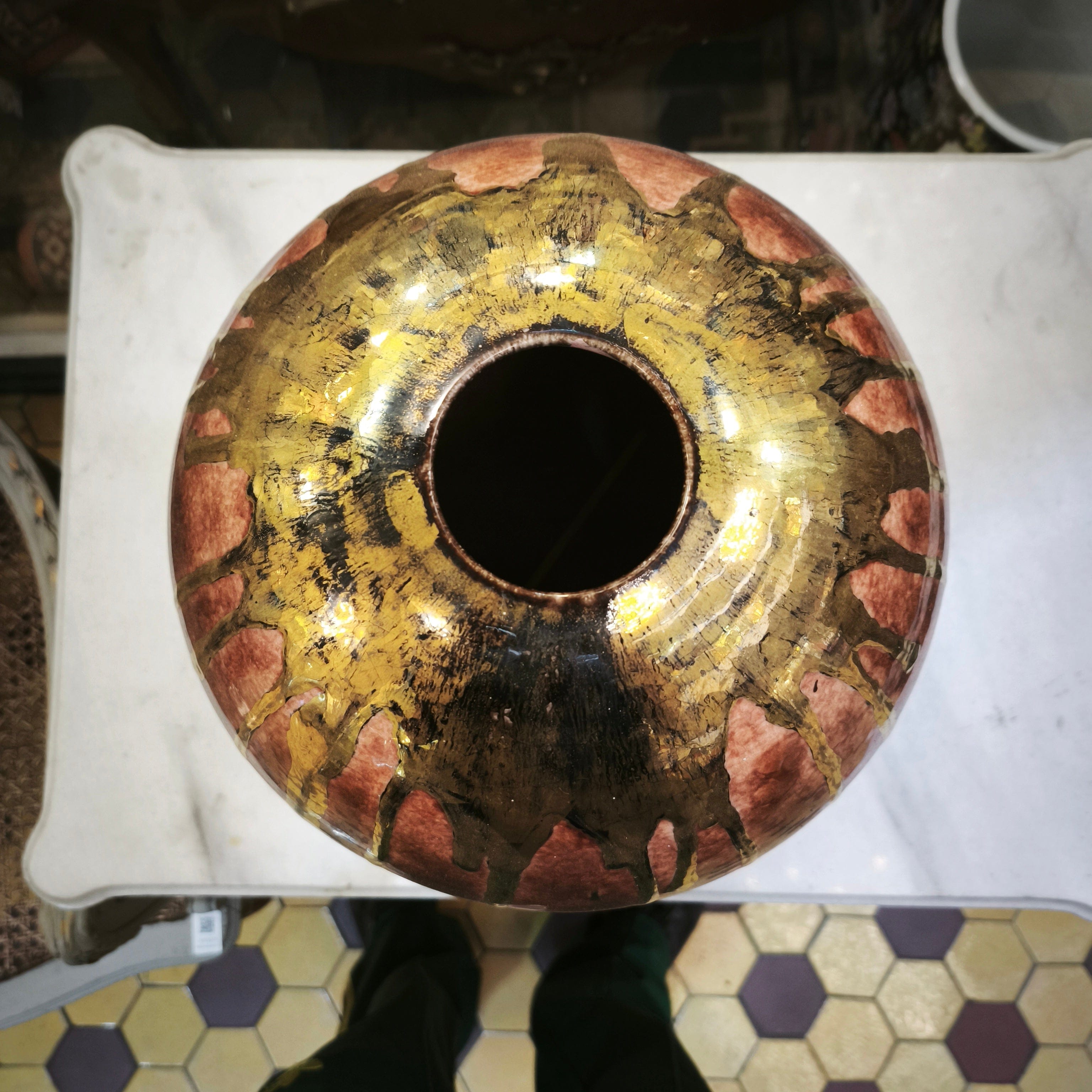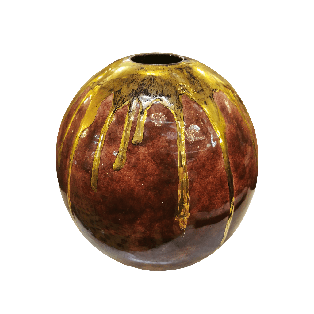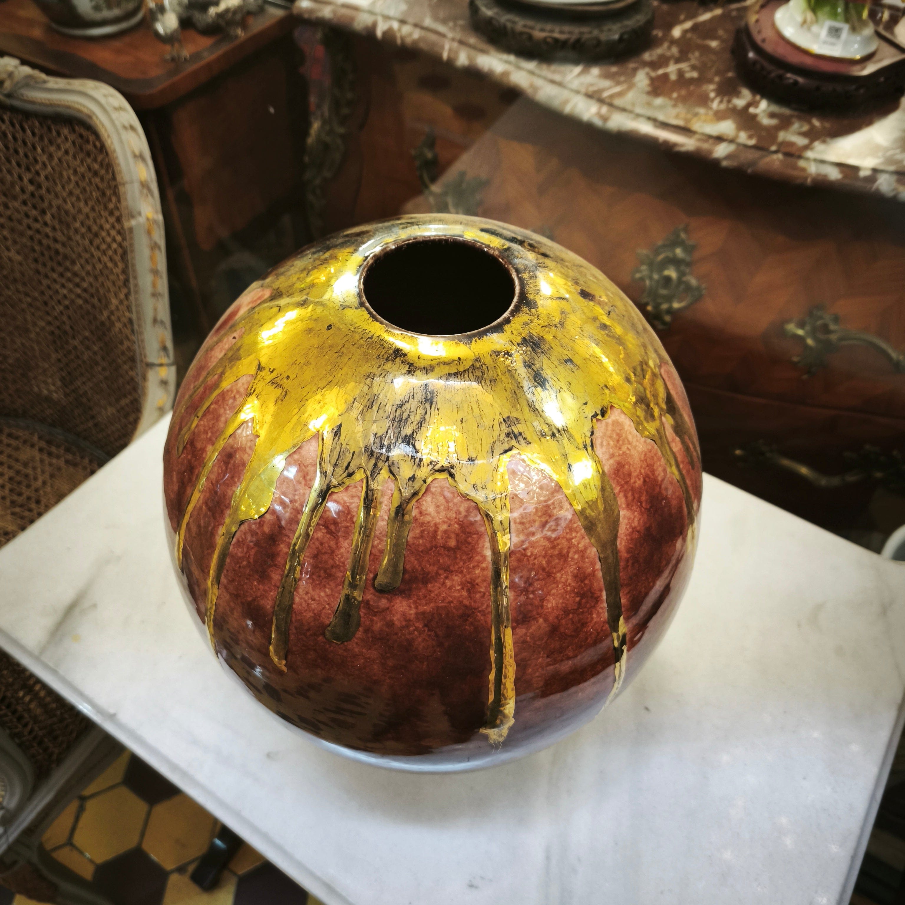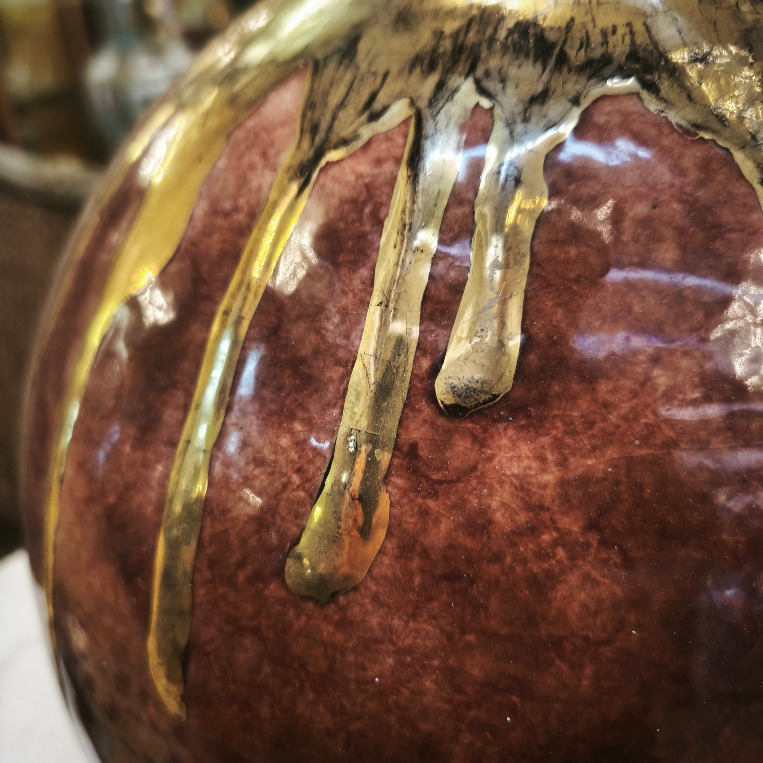 Espectacular jarrón de cerámica francesa estilo Art Deco, con un bello esmaltado en efecto marmolado en un tono café rojizo, con un esmalte dorado brillante en su boca, que chorrea hacia abajo por la pieza.