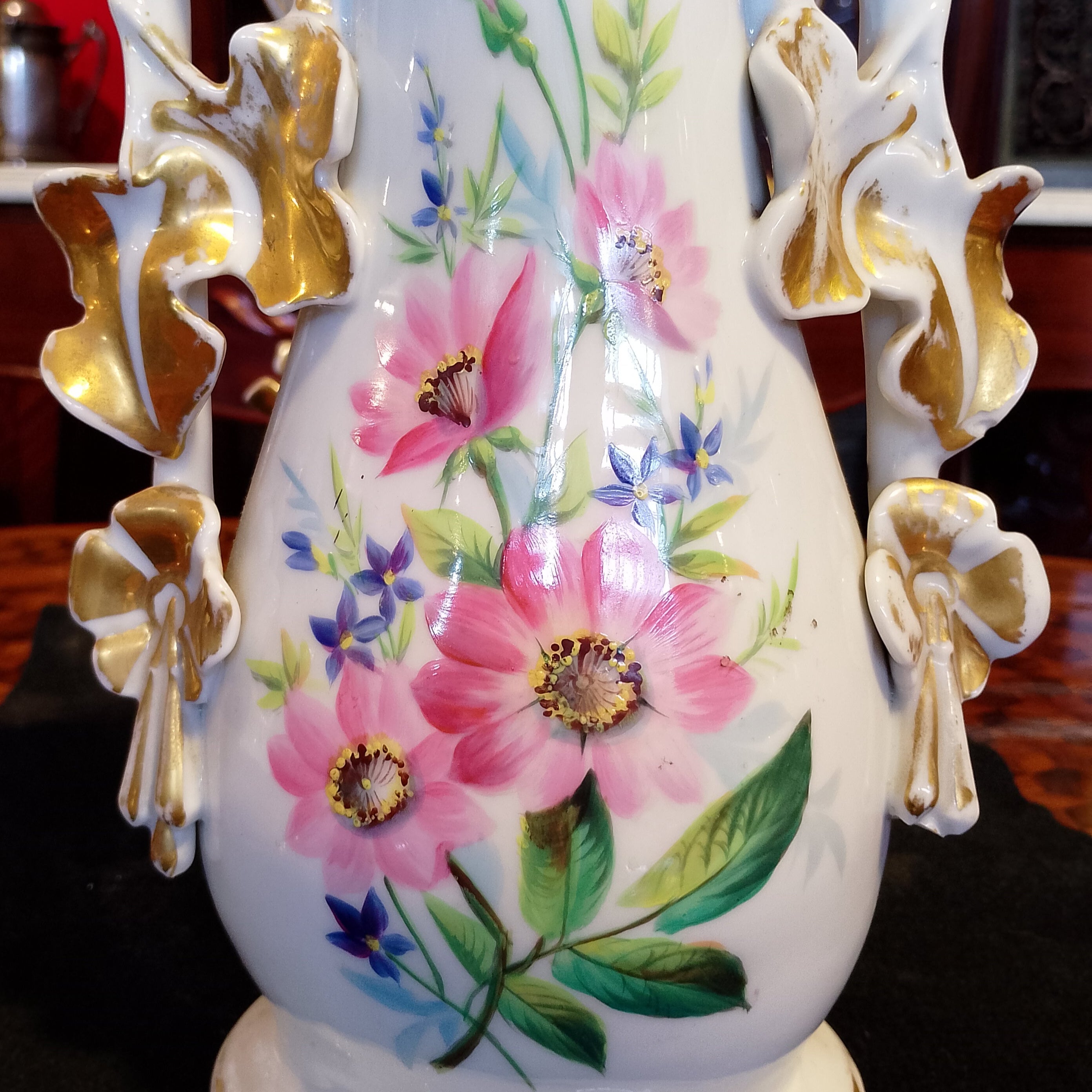 Hermoso jarrón isabelino Vieux Paris, pintado a mano, con un diseño floral en que predominan los colores vivos y el dorado, dando luminosidad y elegancia a su ambiente.
