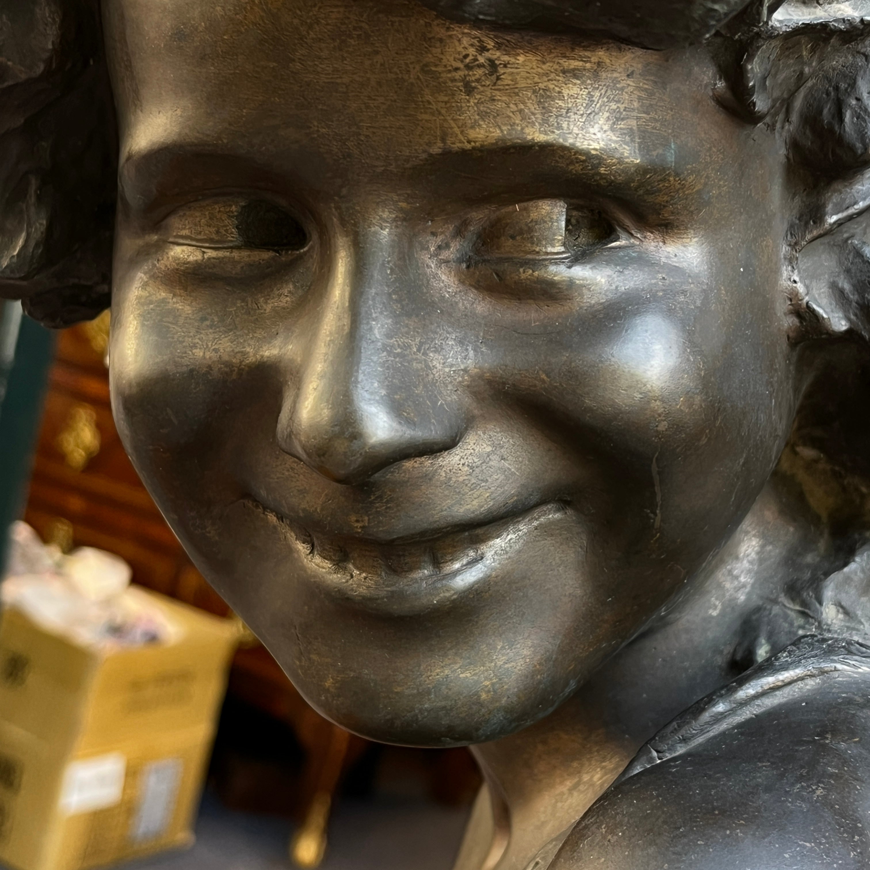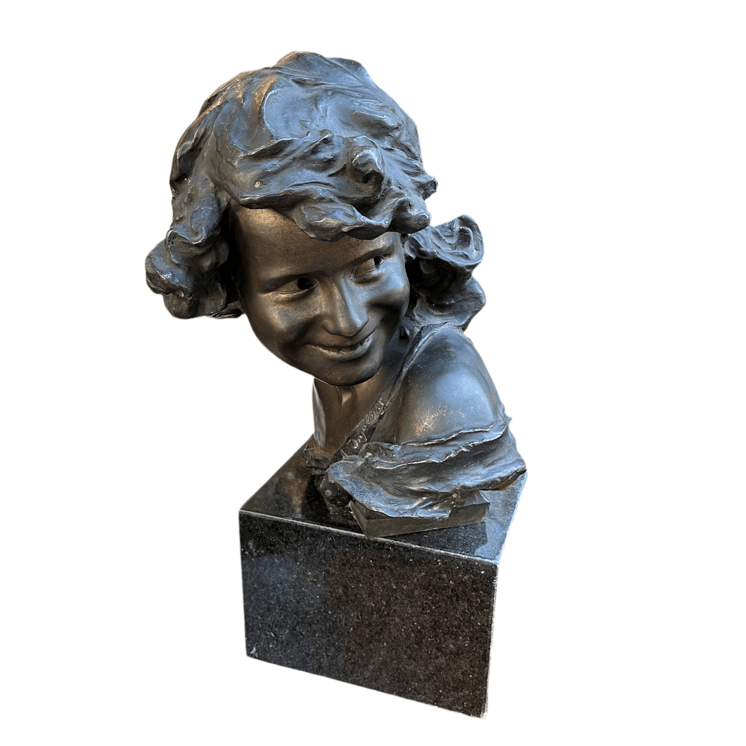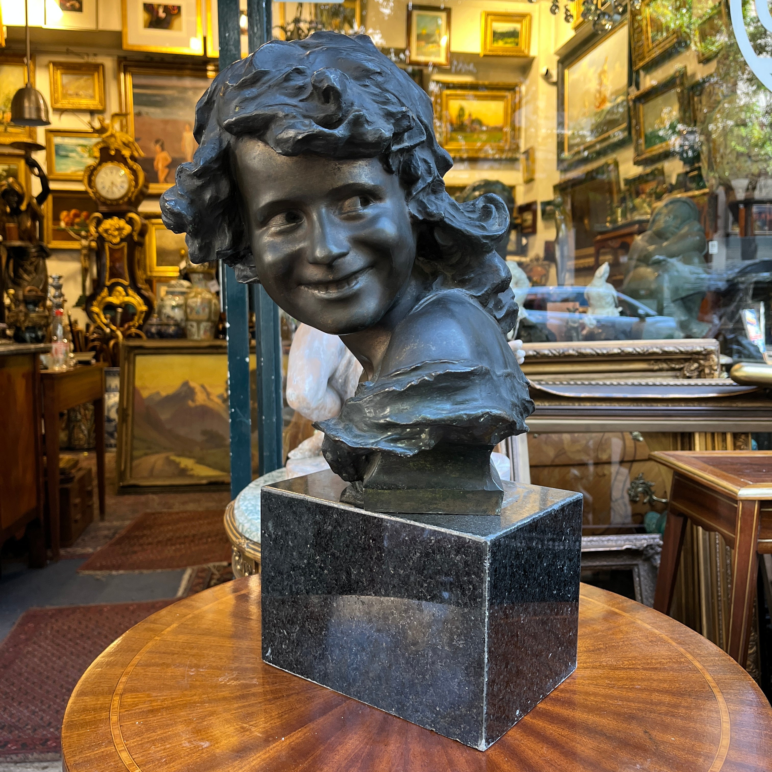 Escultura de bronce, de origen francés, firmado por Jean Antoine Injalbert (1845-1933), escultor francés perteneciente al movimiento Neobarroco. La escultura es un busto de una niña, capturada con un gesto misterioso y risueño. La pieza tiene una base de mármol cuadrada de color negro.