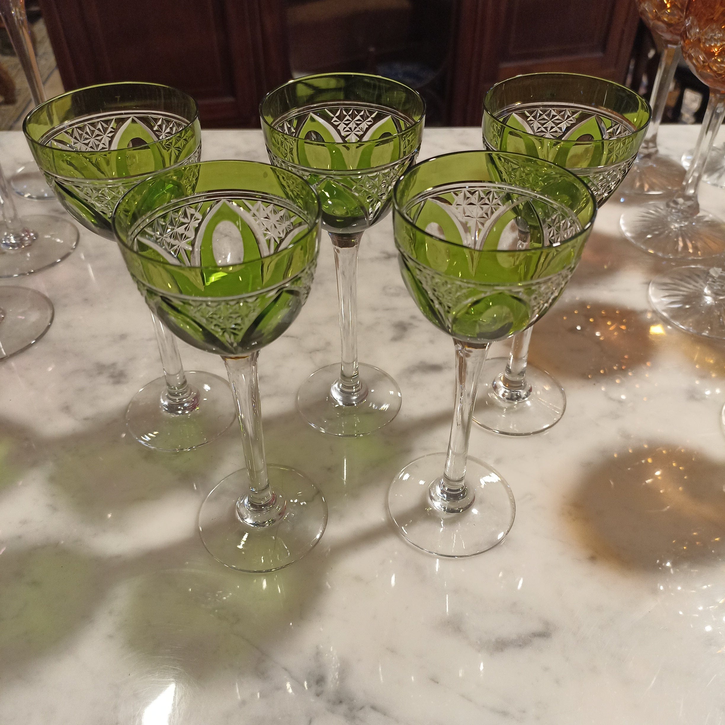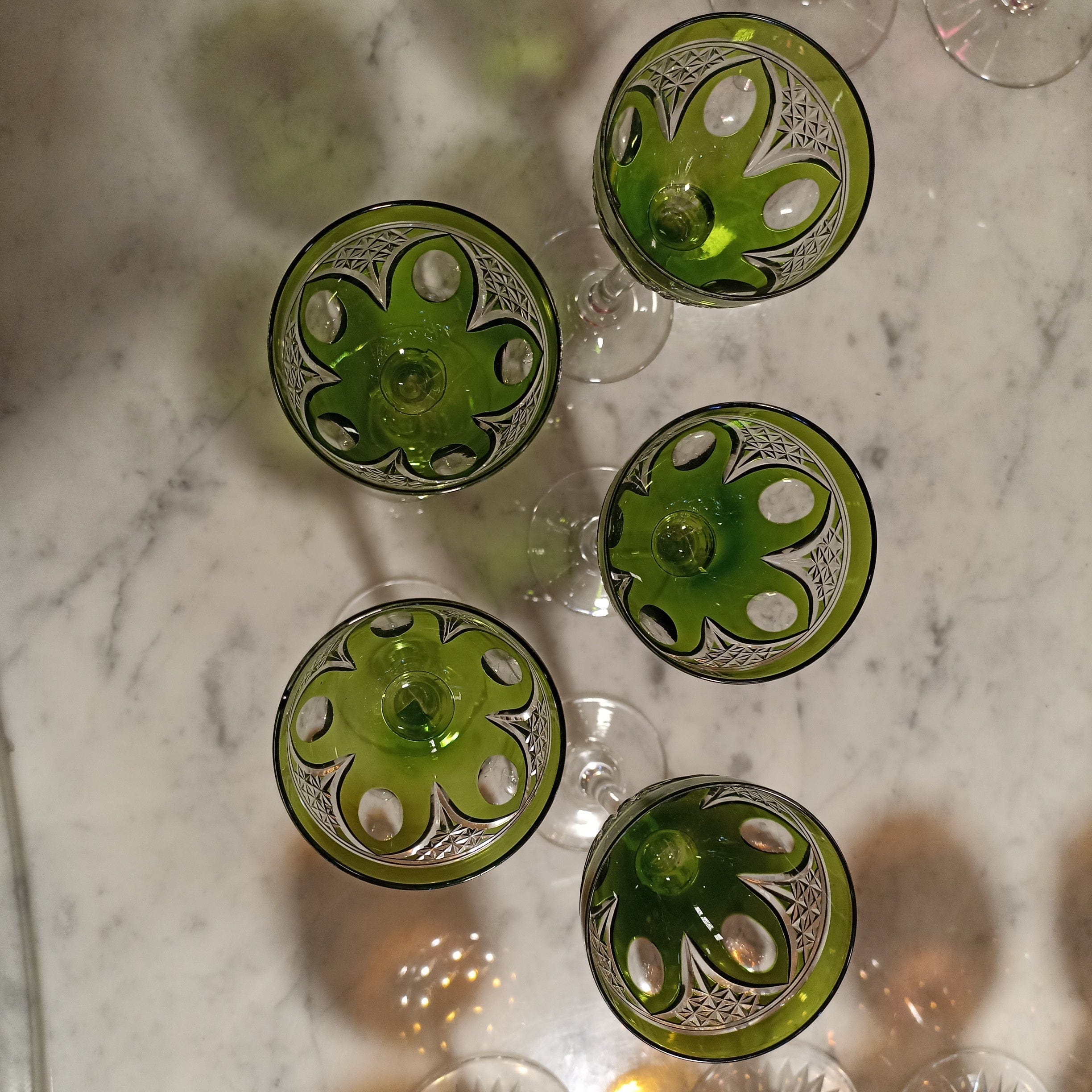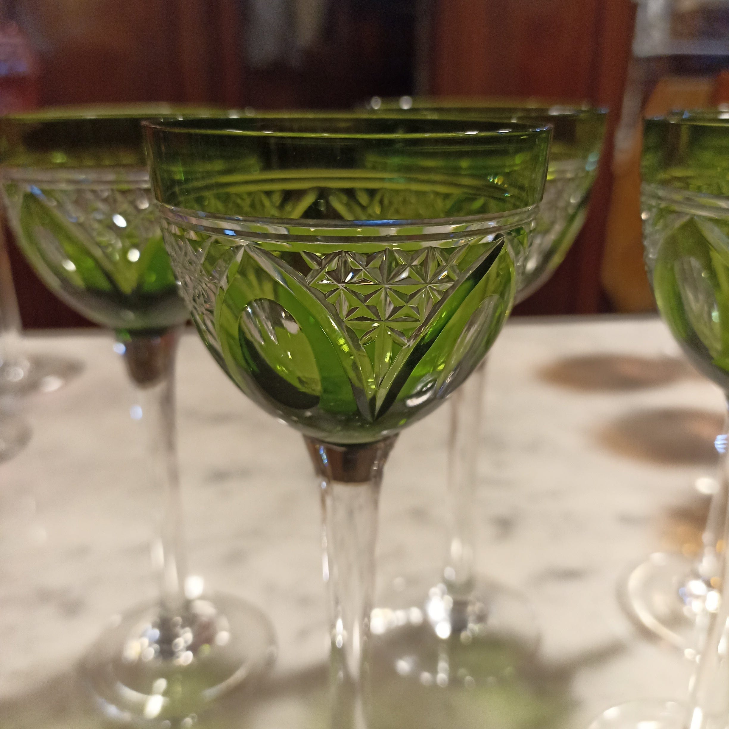 Finísimo juego de cinco copas de vino blanco de cristal tallado Nancy, francés en tono verde.