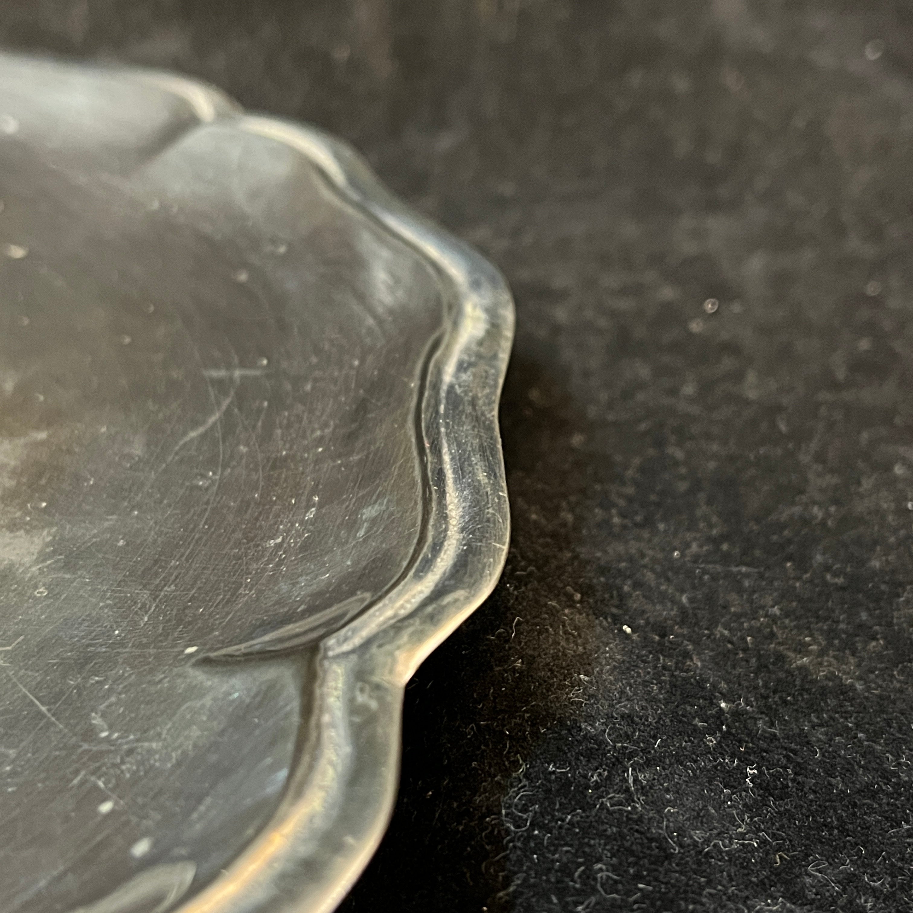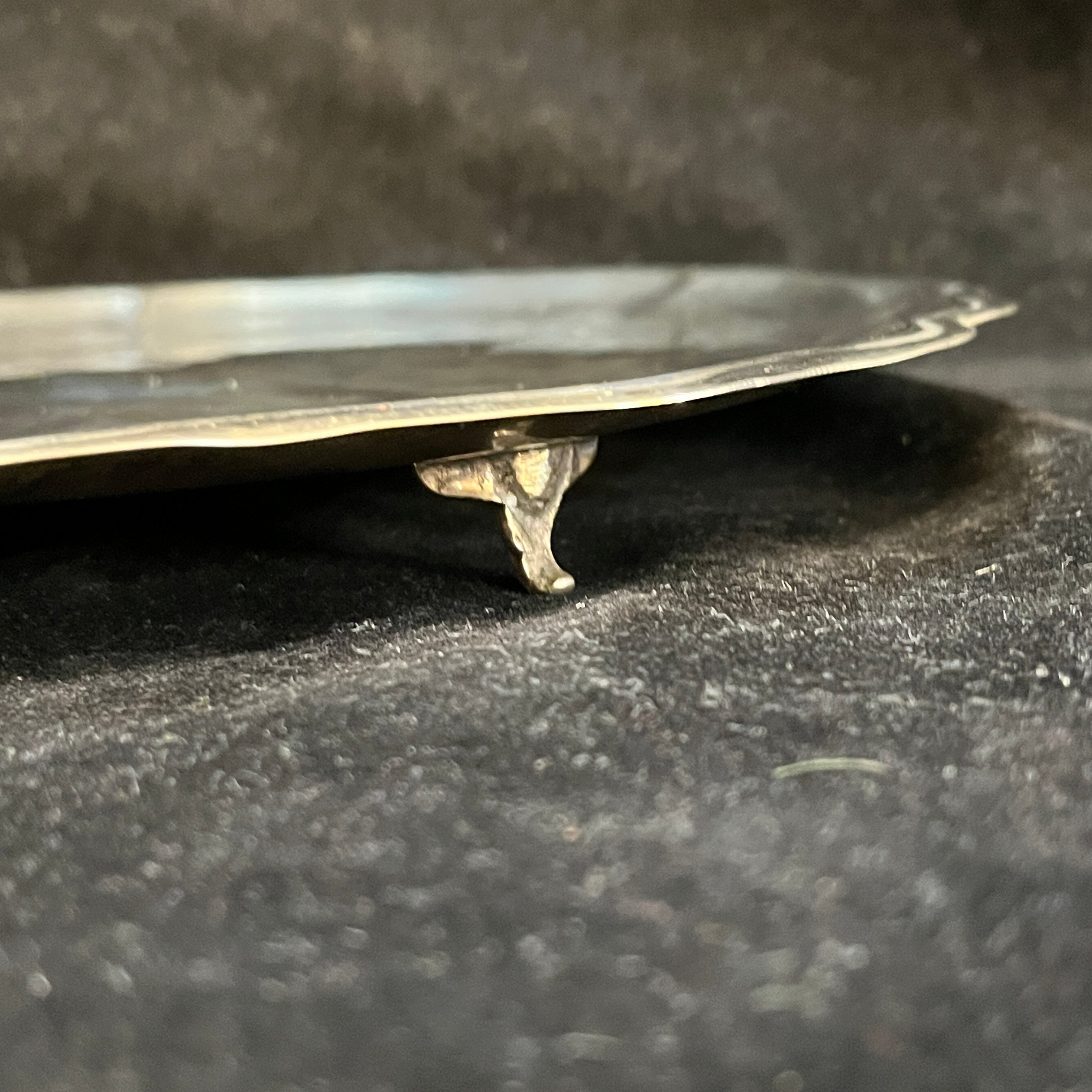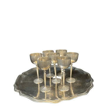 Elegante juego de 7 copitas de plaqué con un bello diseño en relieves florales en su boca y base. El conjunto viene con una bandeja, también de plaqué, con terminaciones curvas y tres patitas.