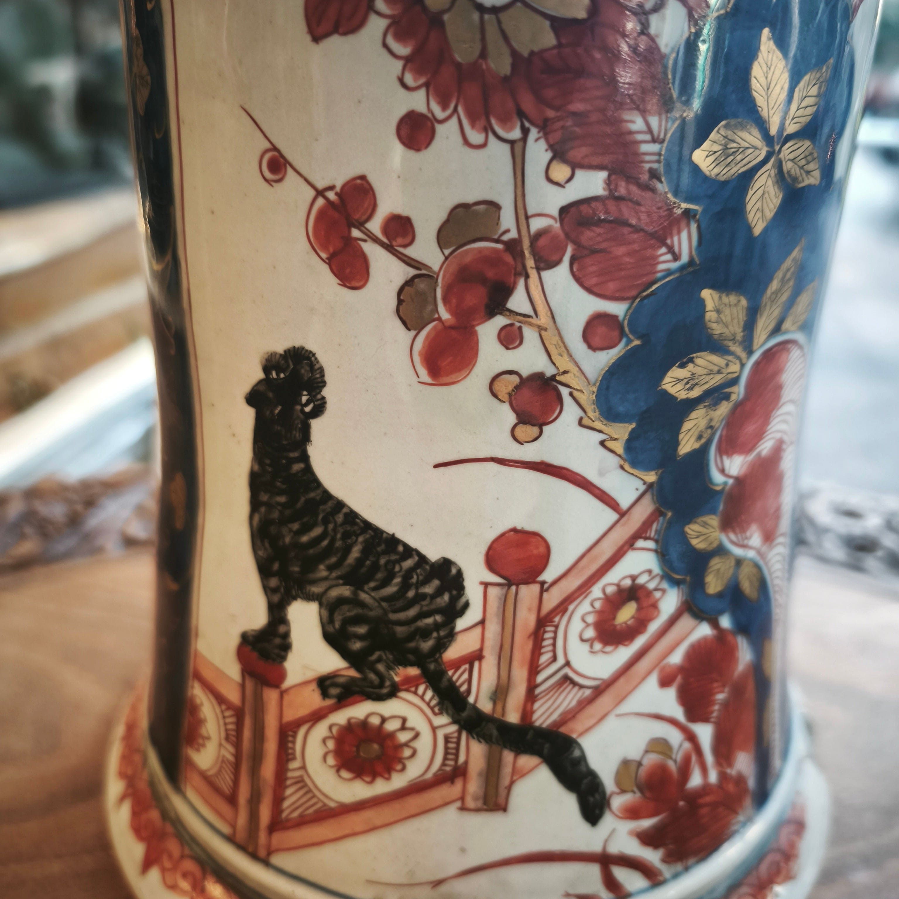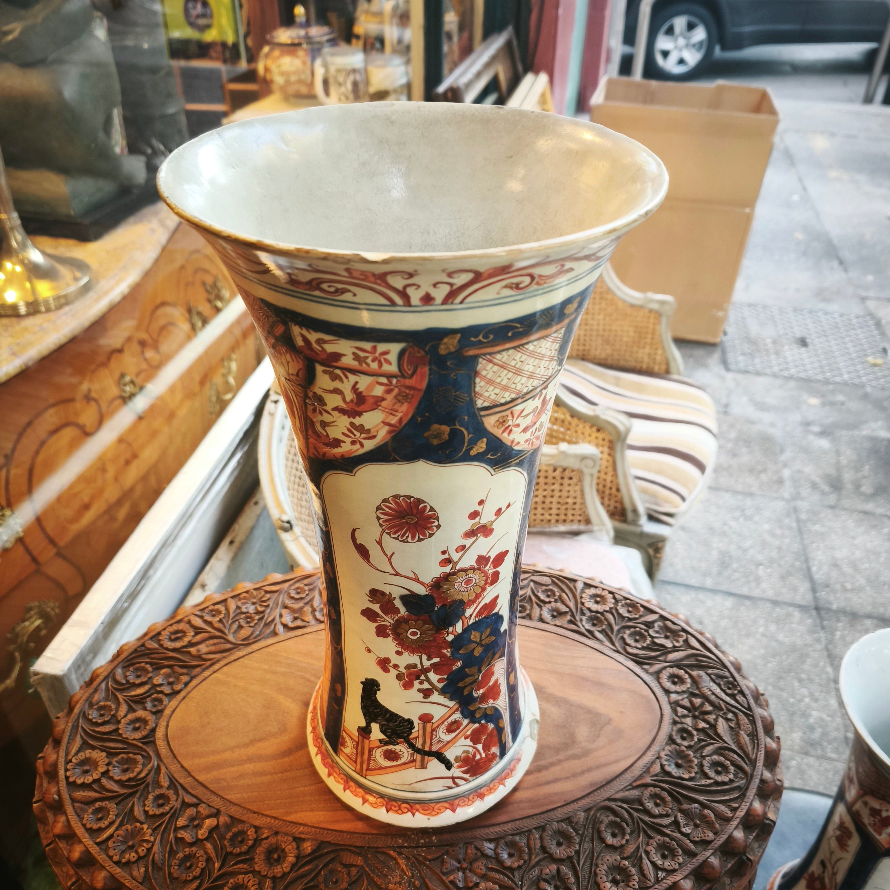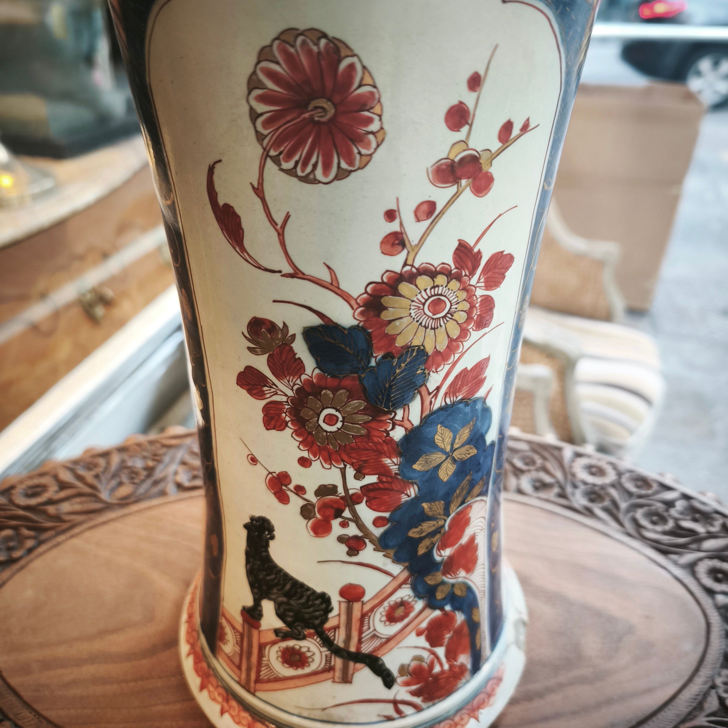 Bellísimo juego de jarrones de origen chino antiguos, hechos de porcelana pintada a mano en tonos rojos y azules, con motivos florales y pequeñas escenas, entre las cuales destacan la de una pantera contemplado un jardín.