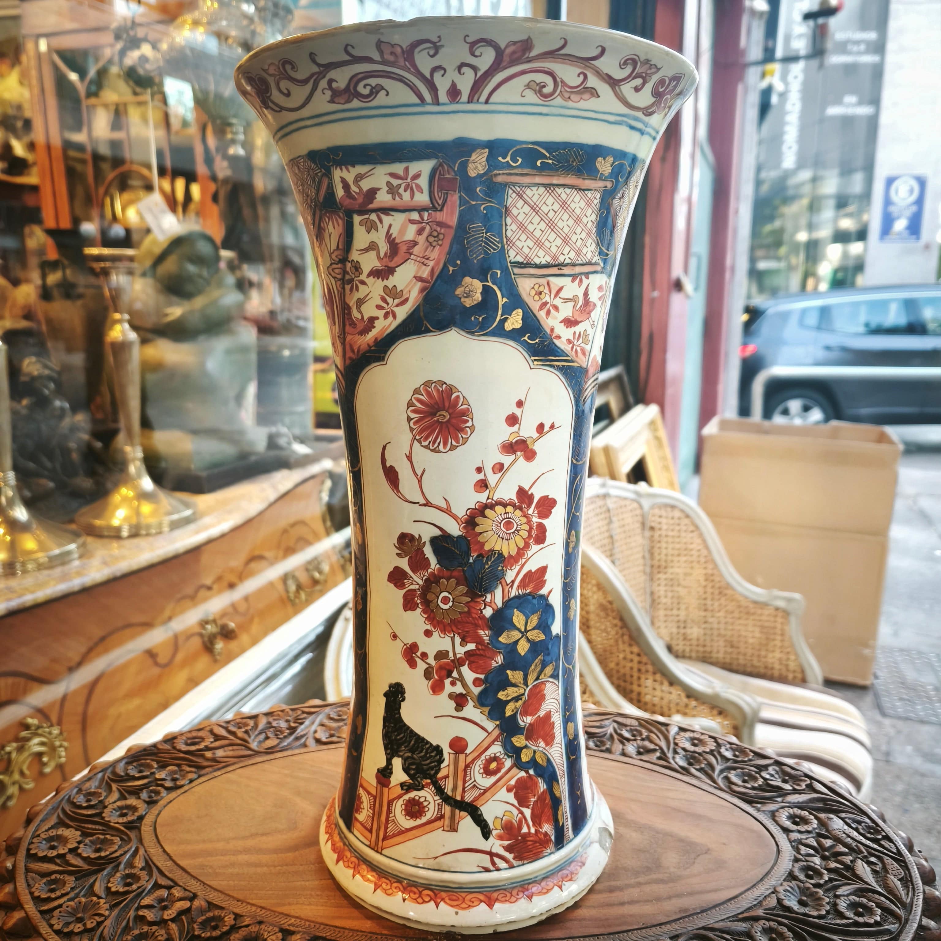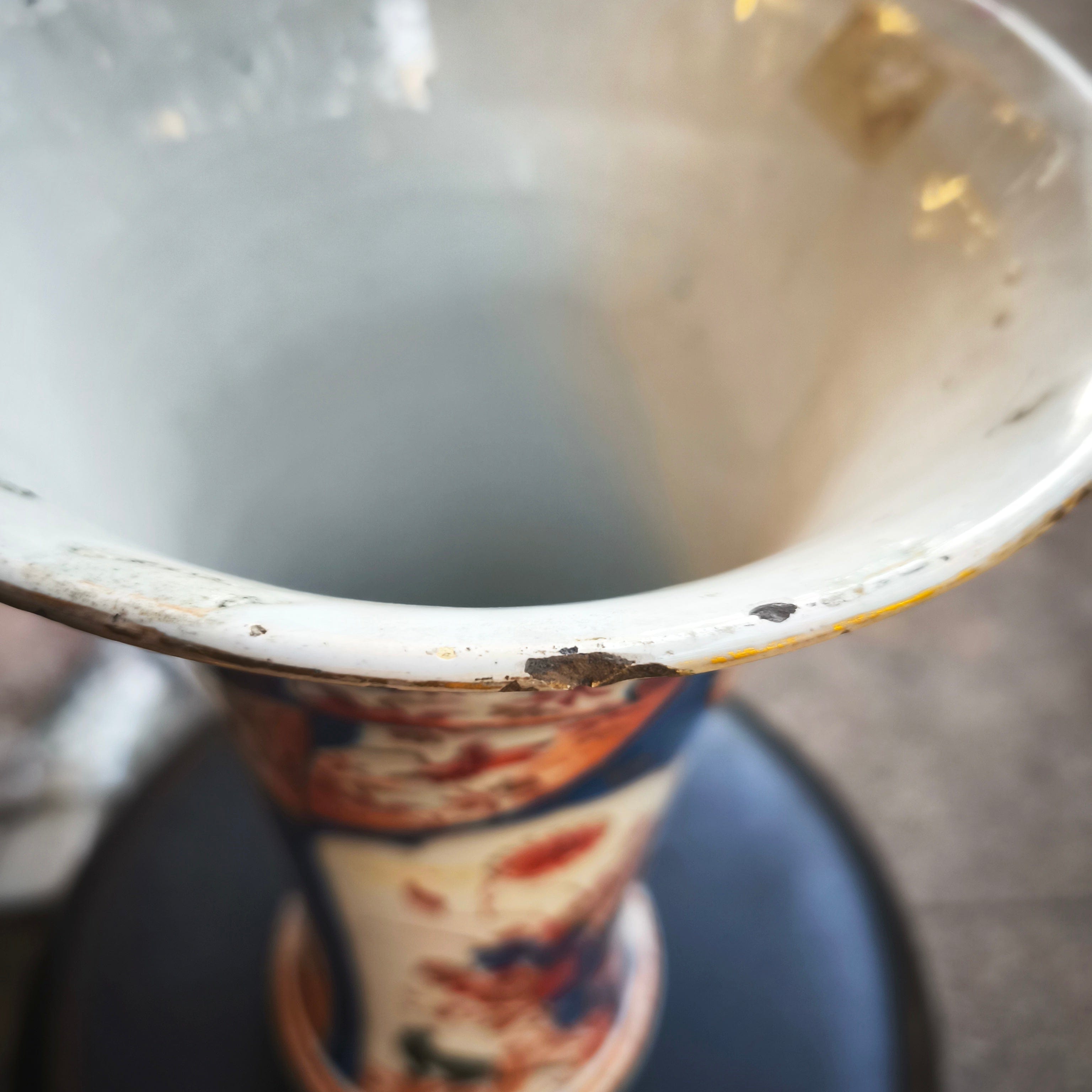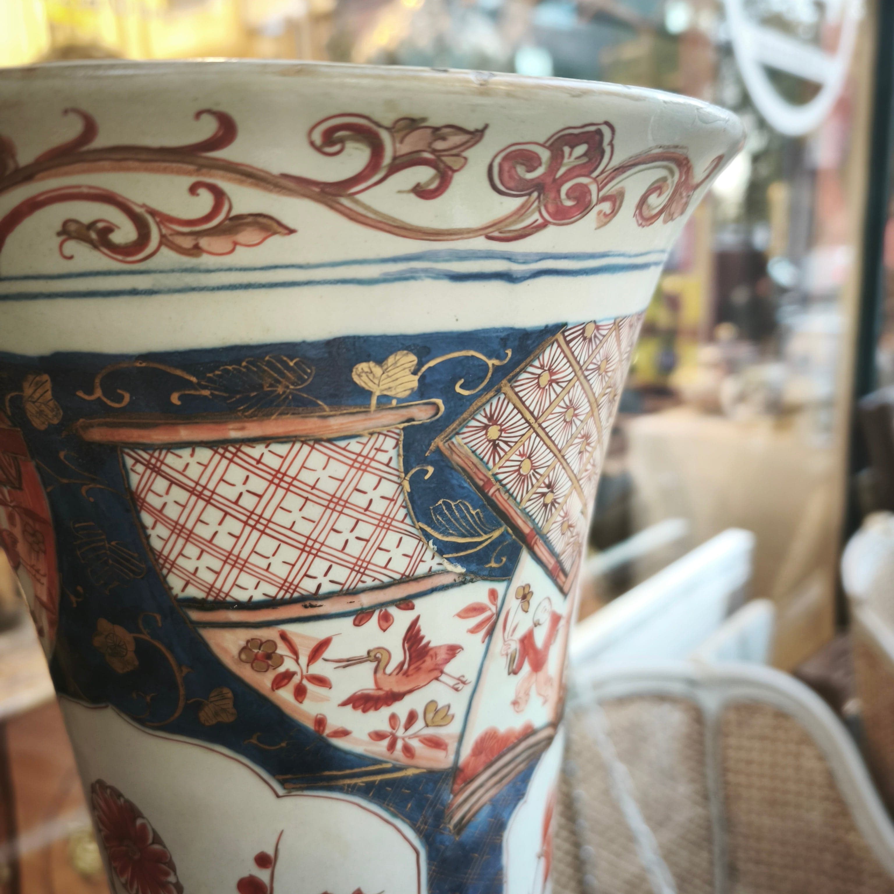 Bellísimo juego de jarrones de origen chino antiguos, hechos de porcelana pintada a mano en tonos rojos y azules, con motivos florales y pequeñas escenas, entre las cuales destacan la de una pantera contemplado un jardín.