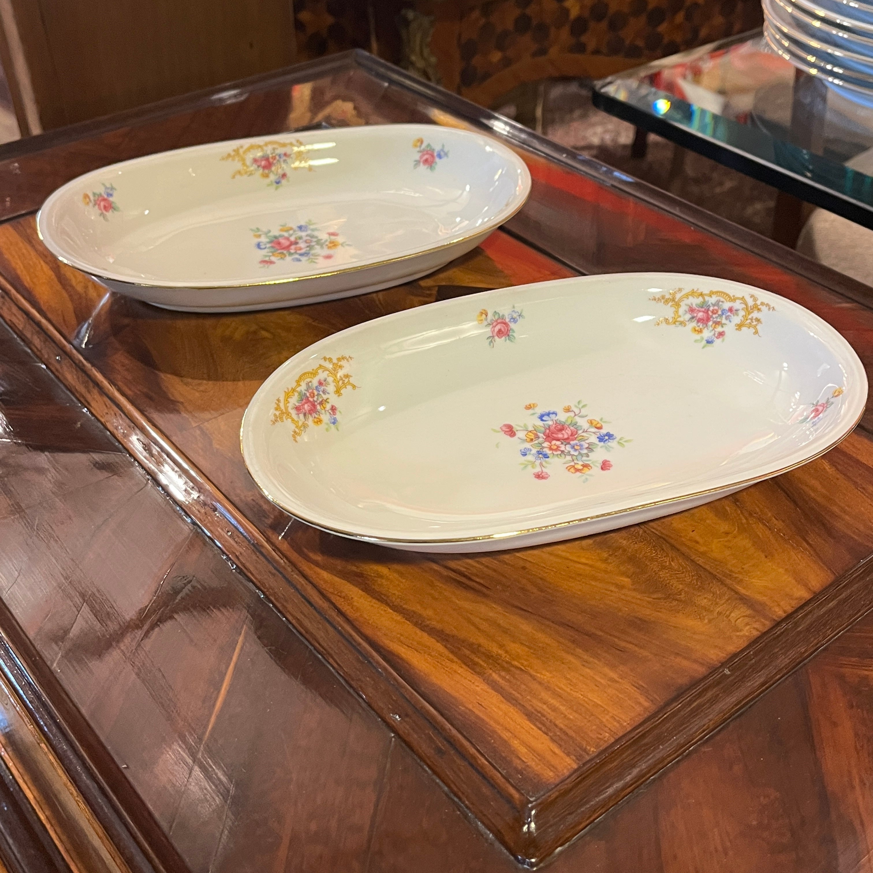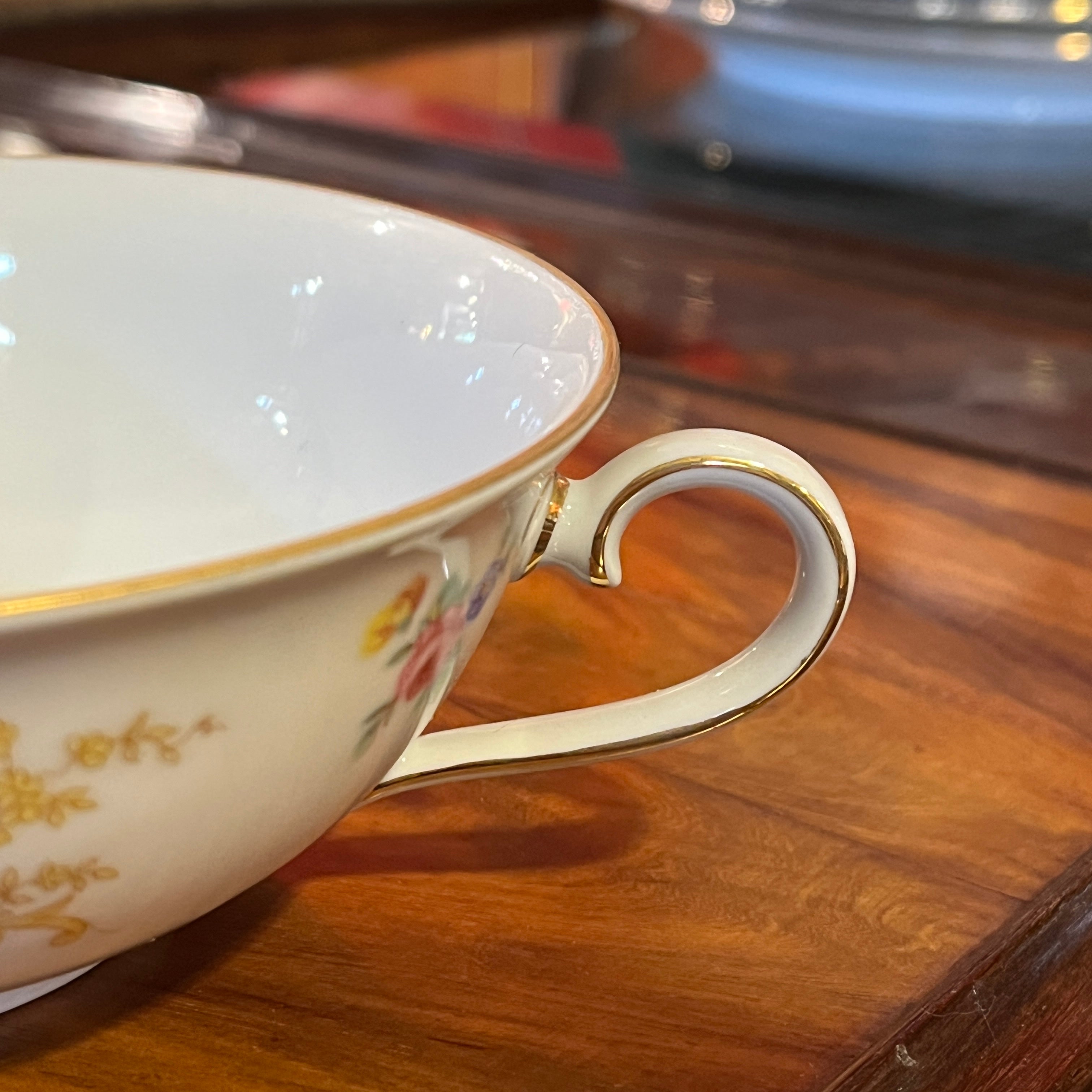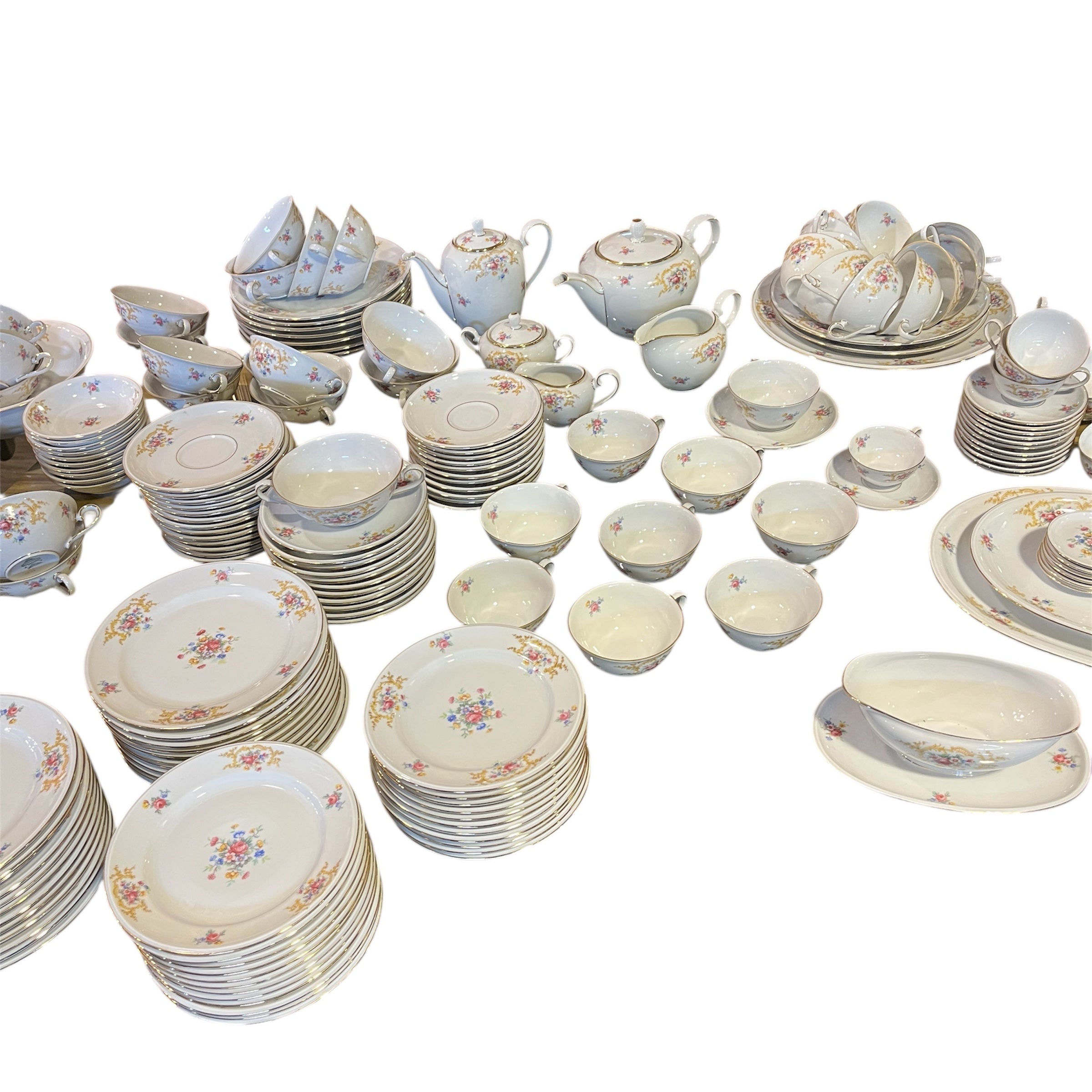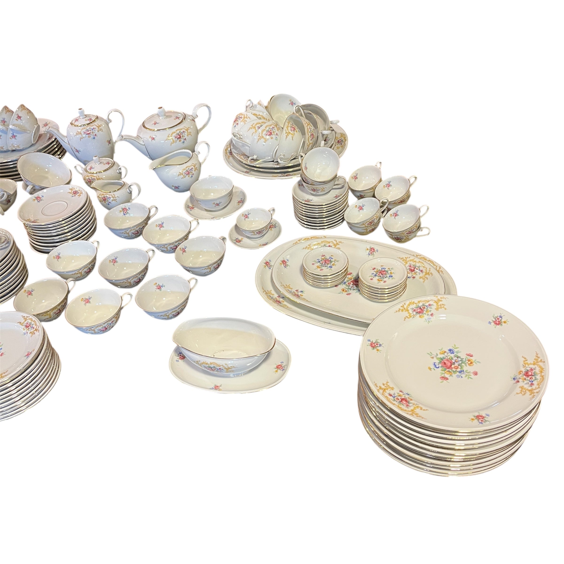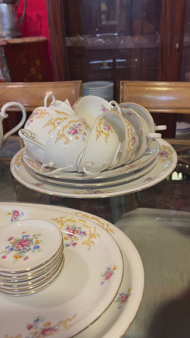 Gran juego de porcelana alemana Hutschenreuter, con un delicado diseño de flores y guirnaldas doradas, con terminaciones en dorado en sus asas y bordes. El juego incluye el juego de mesa, juego de té, café y diversas piezas de servir.