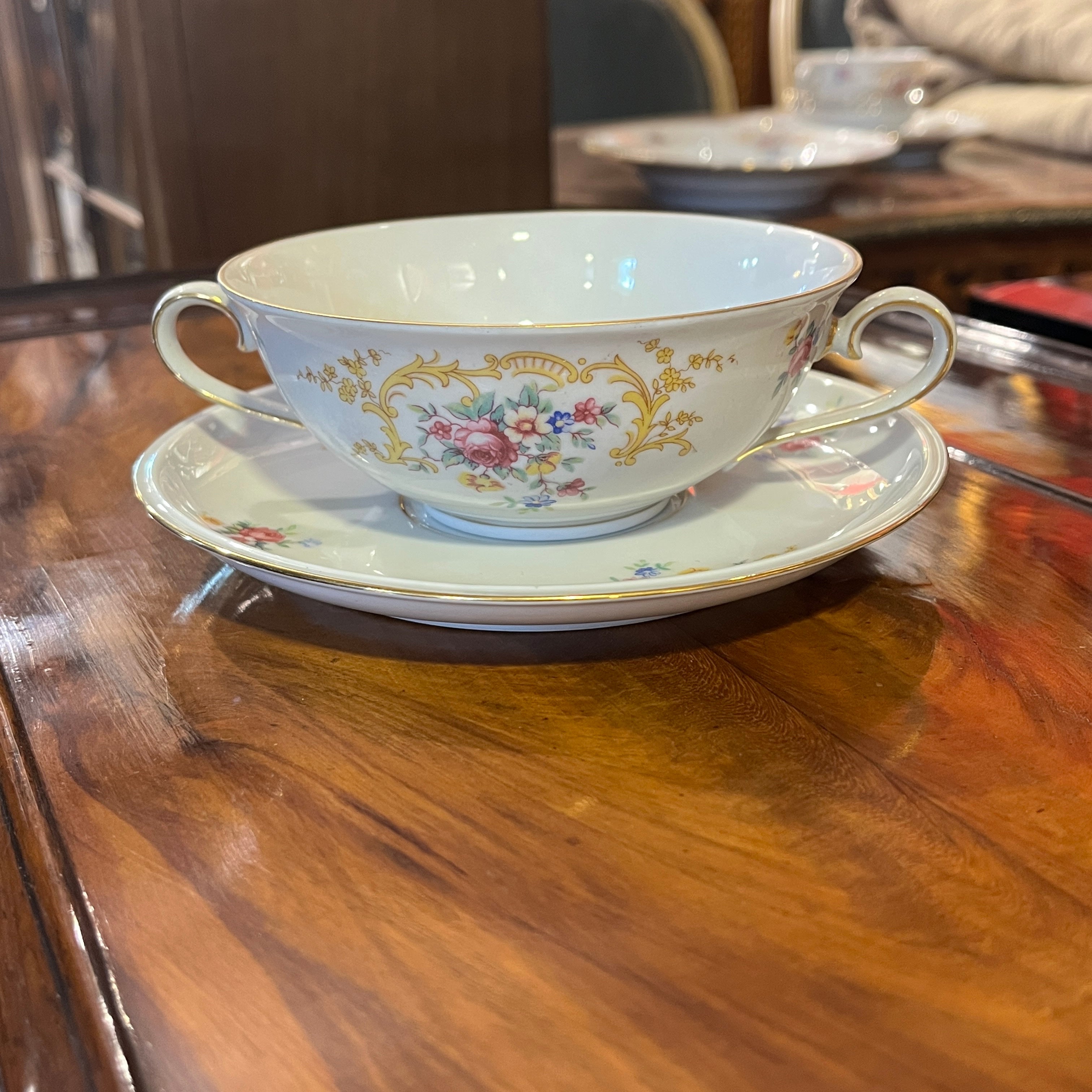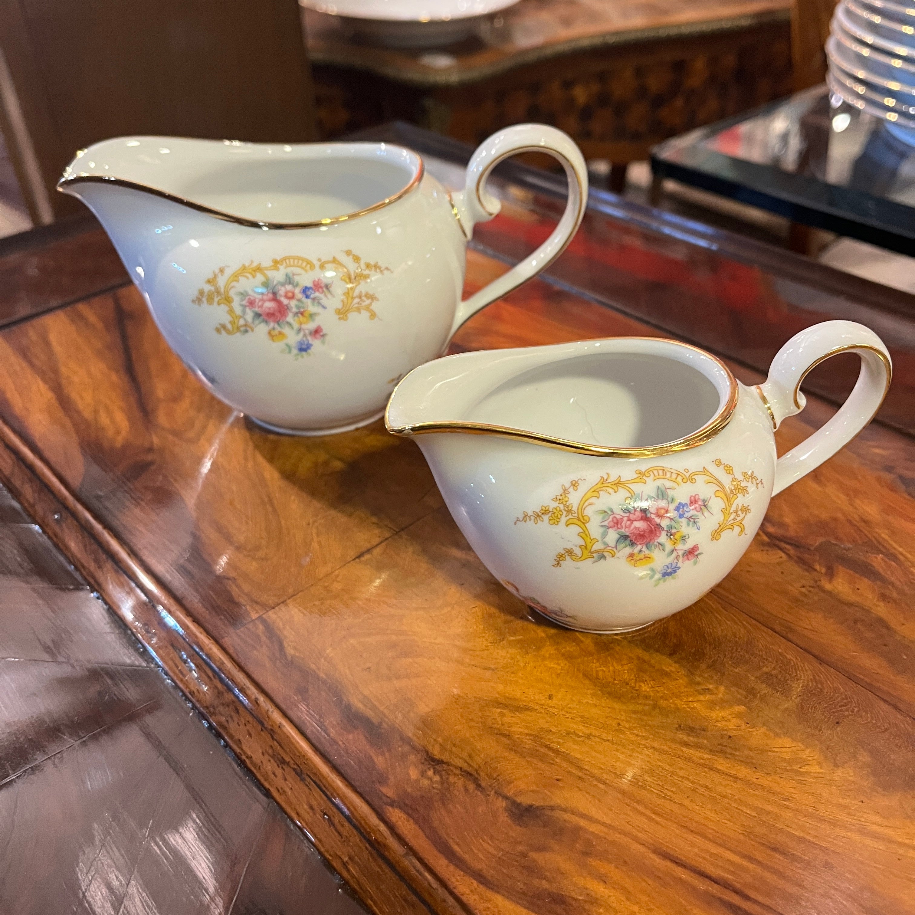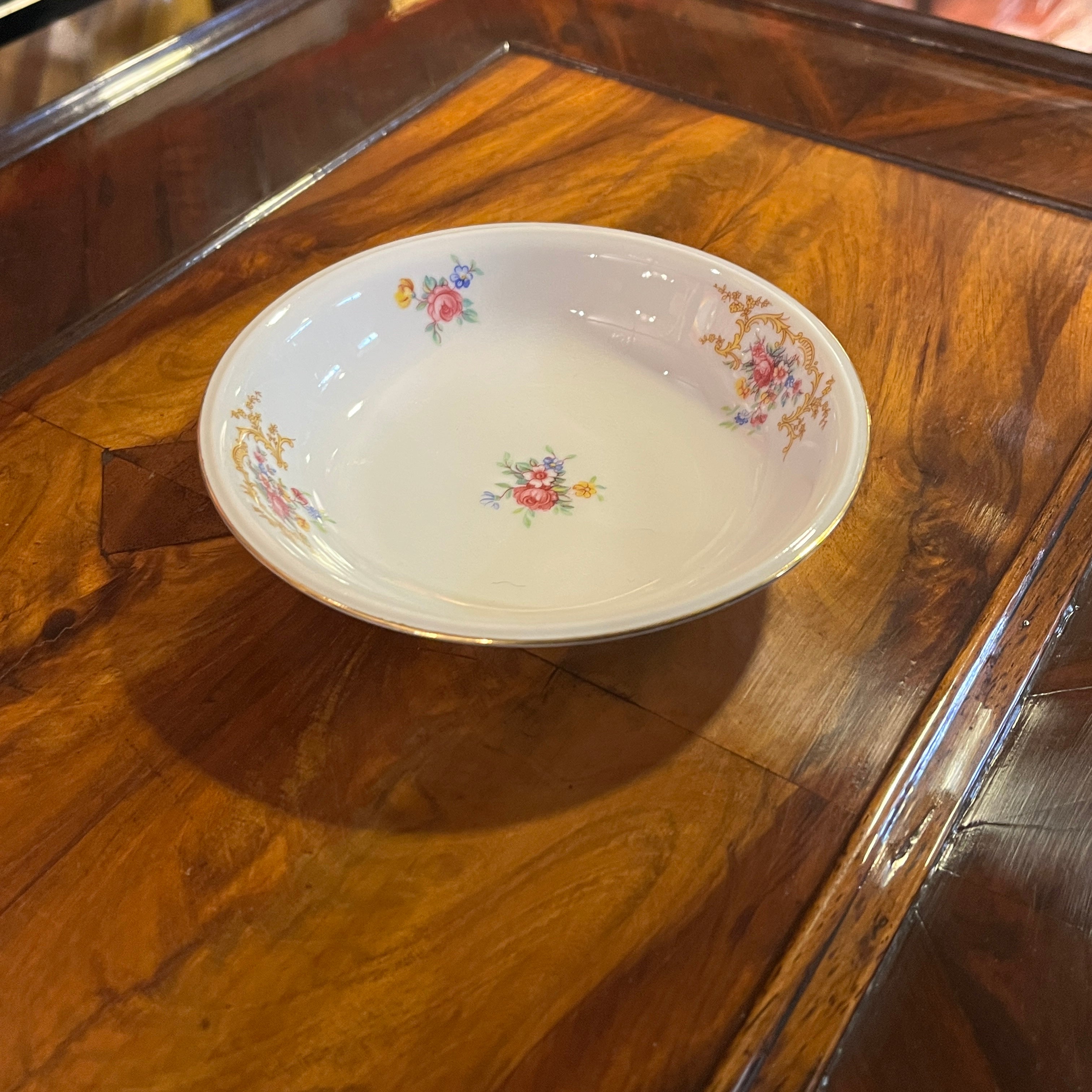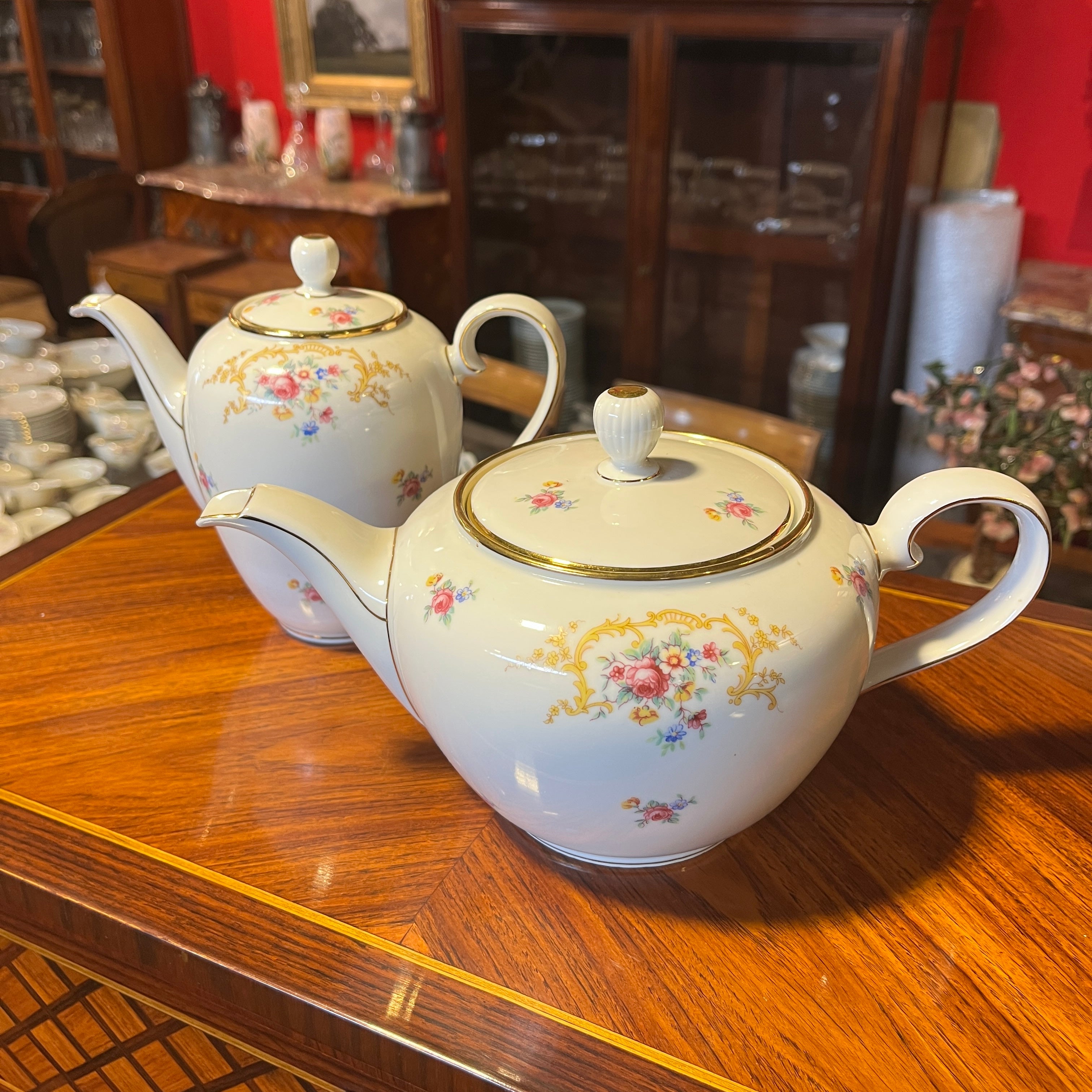 Gran juego de porcelana alemana Hutschenreuter, con un delicado diseño de flores y guirnaldas doradas, con terminaciones en dorado en sus asas y bordes. El juego incluye el juego de mesa, juego de té, café y diversas piezas de servir.