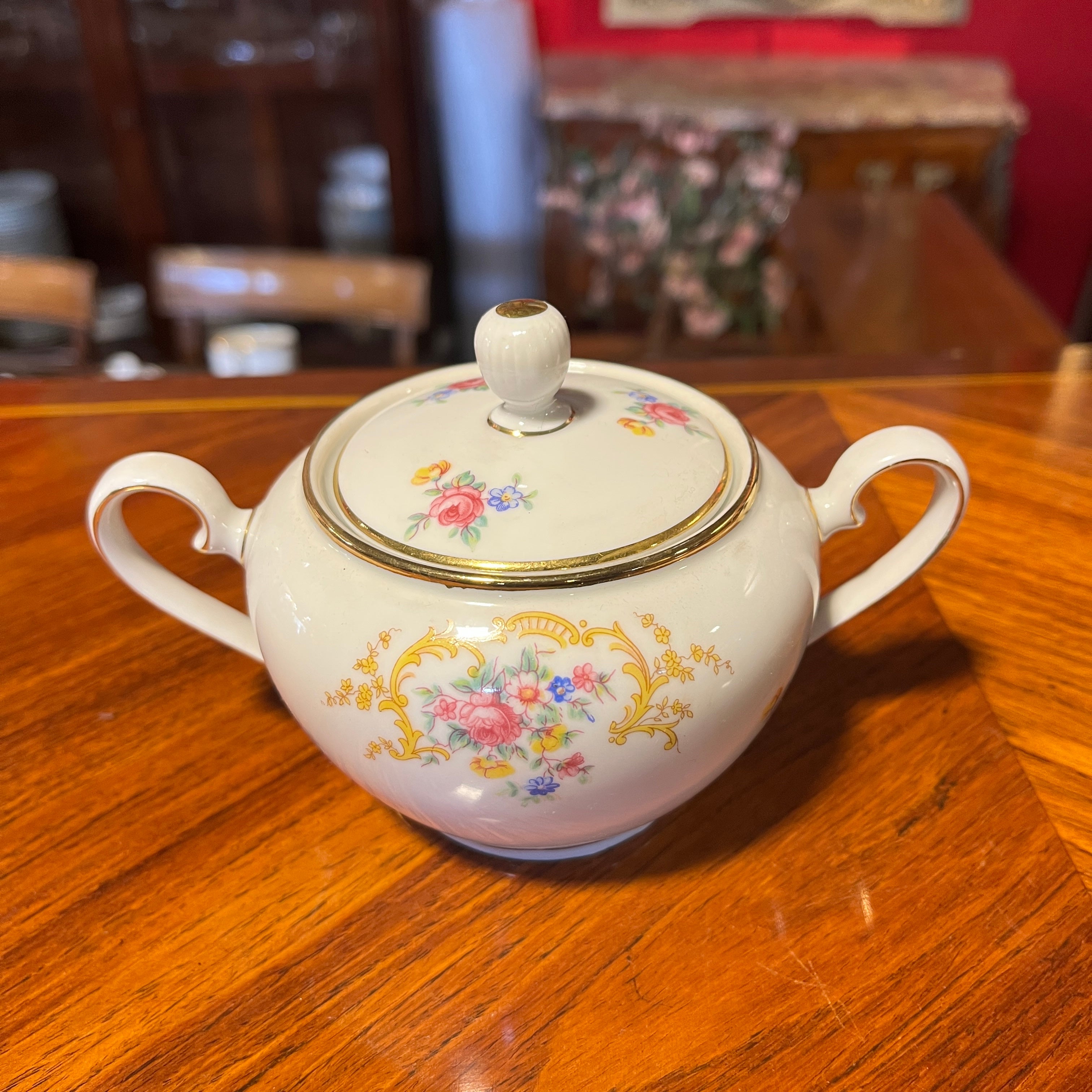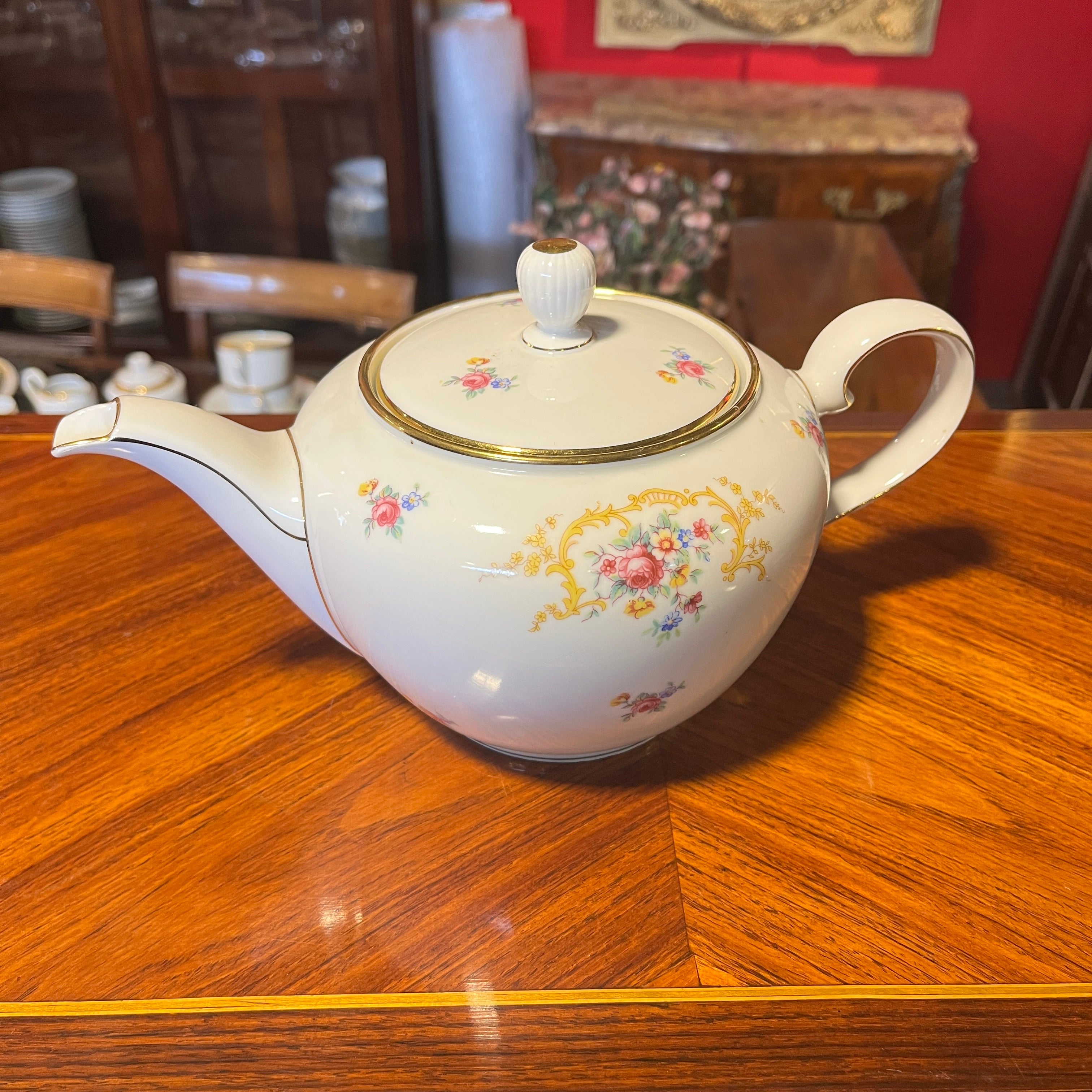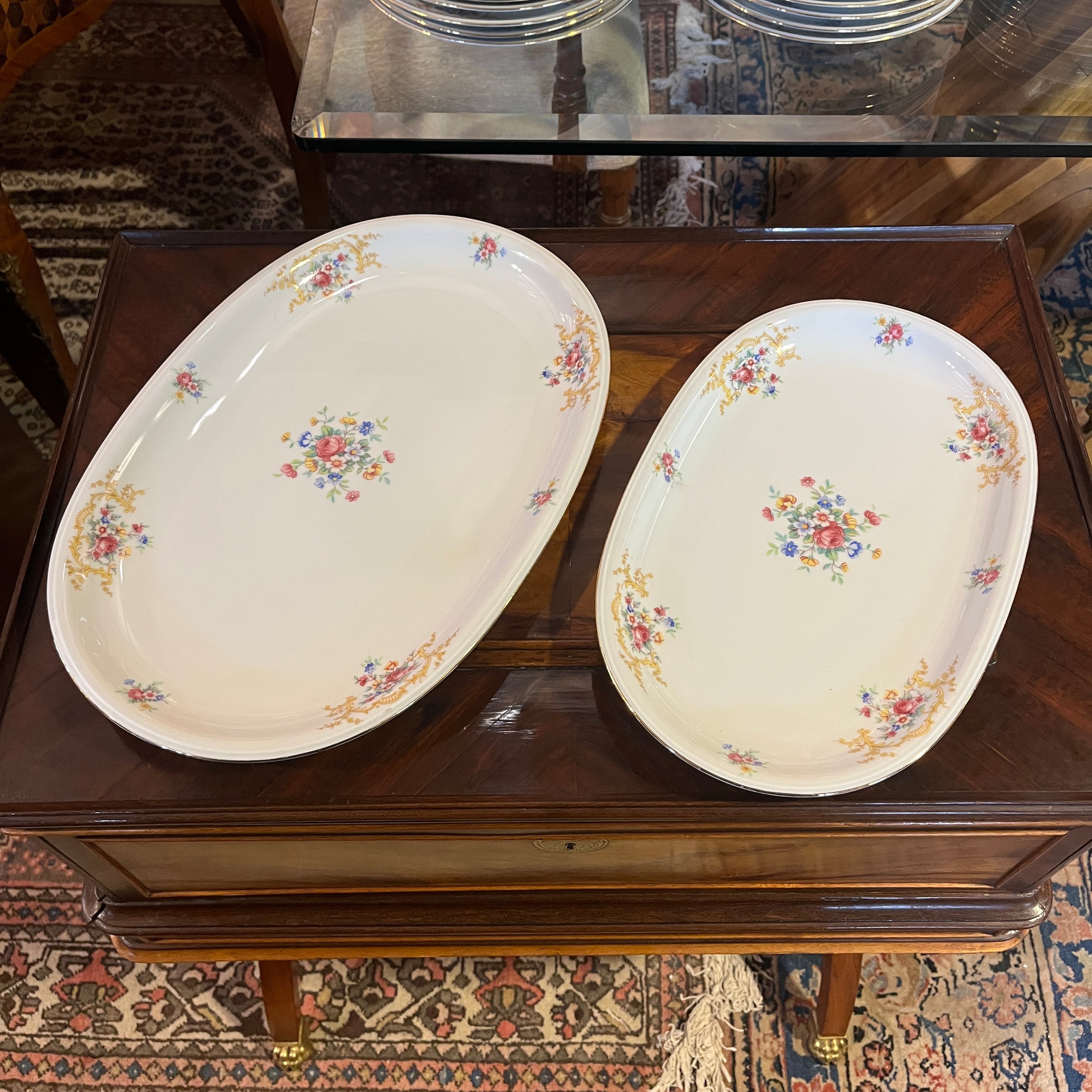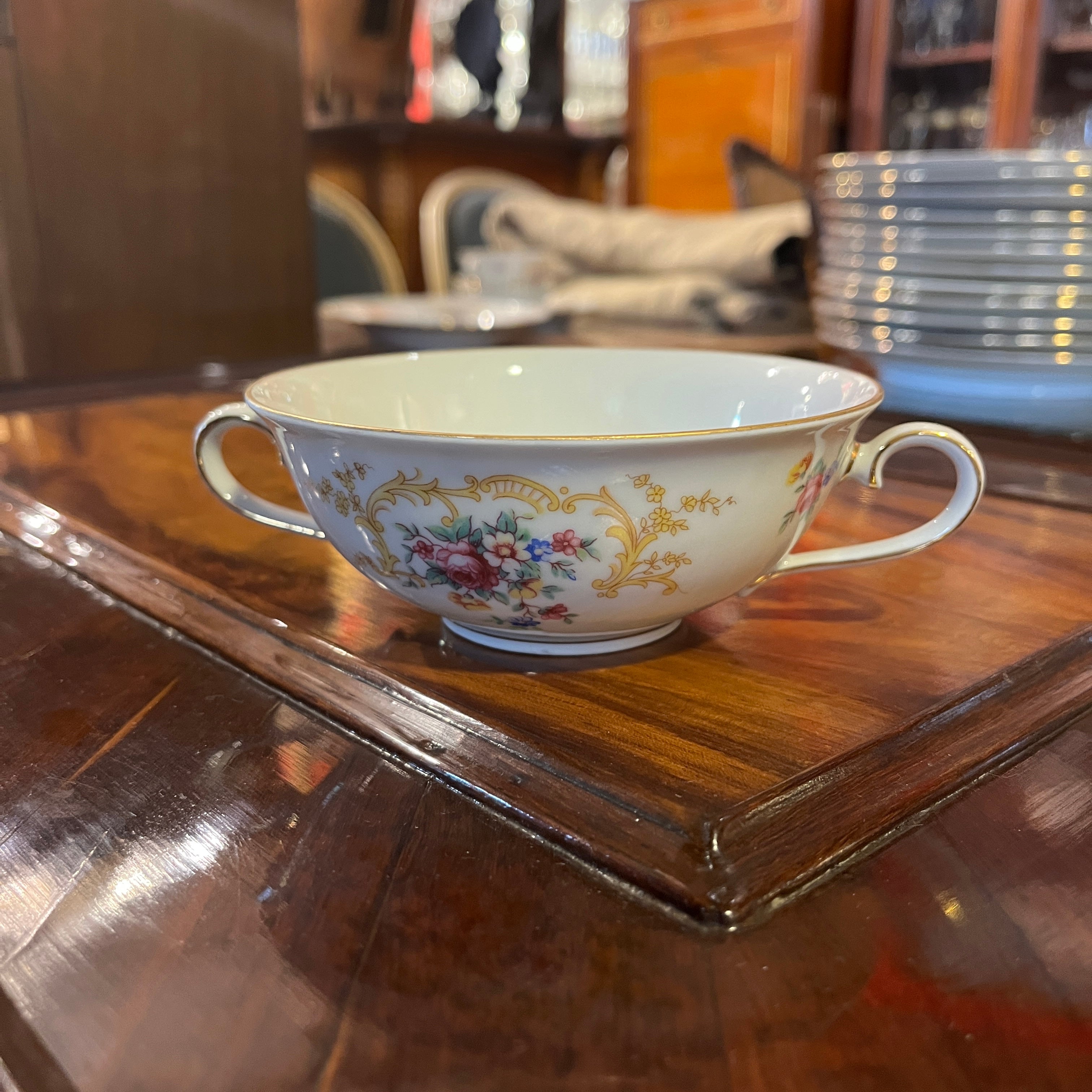 Gran juego de porcelana alemana Hutschenreuter, con un delicado diseño de flores y guirnaldas doradas, con terminaciones en dorado en sus asas y bordes. El juego incluye el juego de mesa, juego de té, café y diversas piezas de servir.