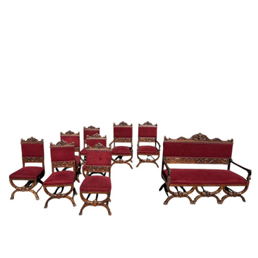 Gran juego de salón de origen francés y estilo renacentista compuesto de 9 piezas: un sillón de tres cuerpos, dos sitiales y seis sillas, todas con estructura de madera tallada en relieves decorados y tapizadas en un llamativo terciopelo rojo. Podemos identificar el estilo renacentista de estas piezas por sus patas de cruceta tallada y los motivos de ángeles en su respaldo.