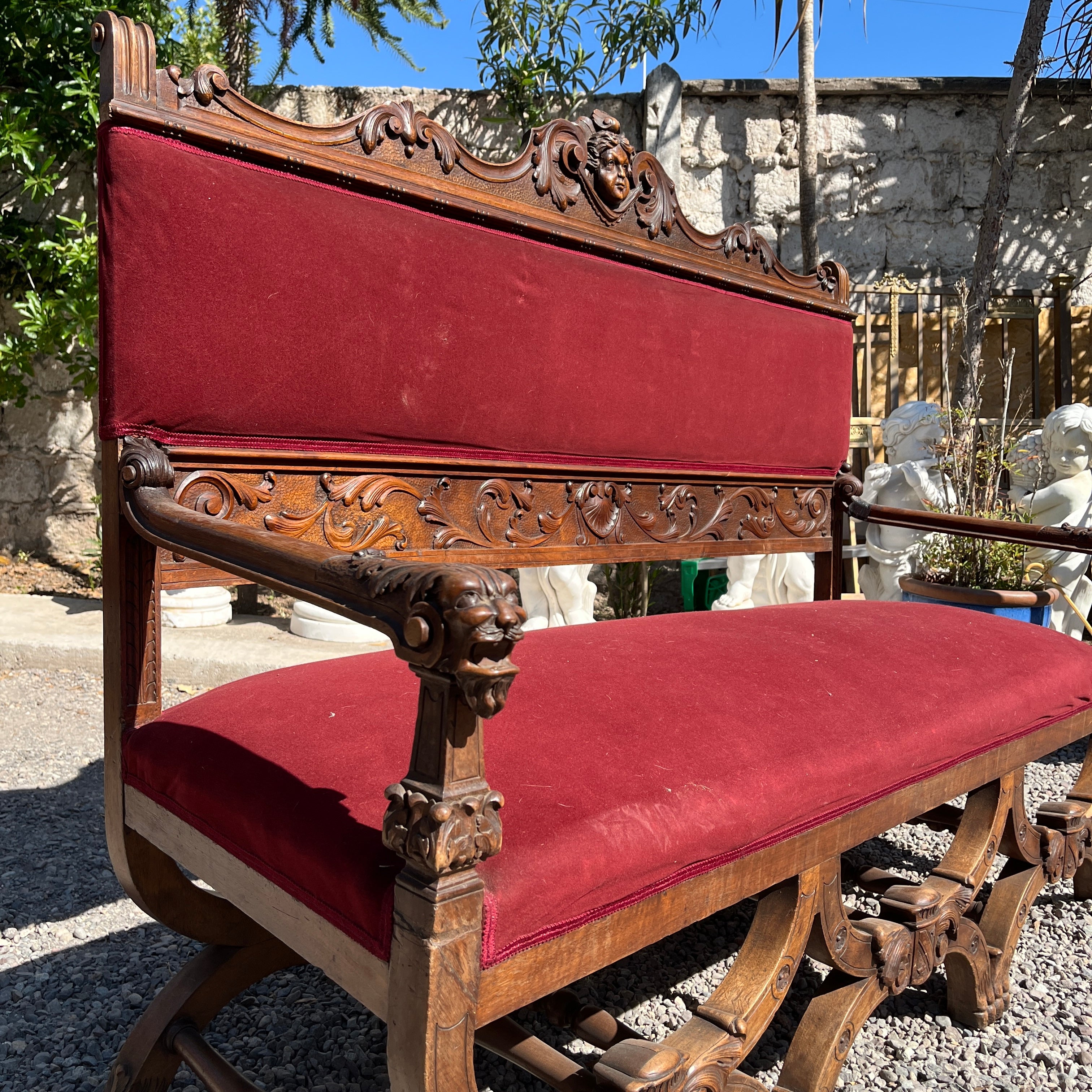 Juego de salón francés estilo Renacentista 9 piezas madera tallada y tapiz terciopelo rojo
