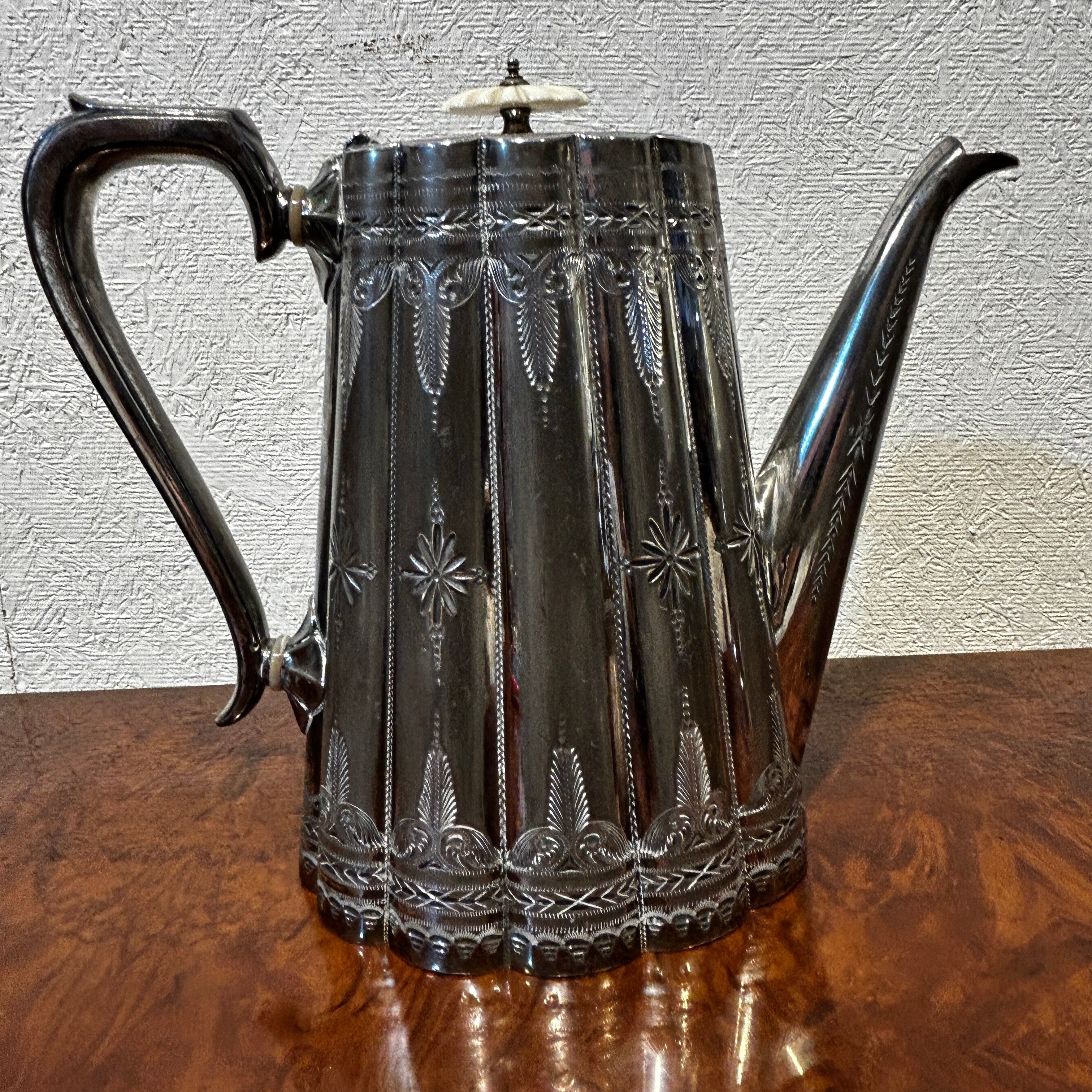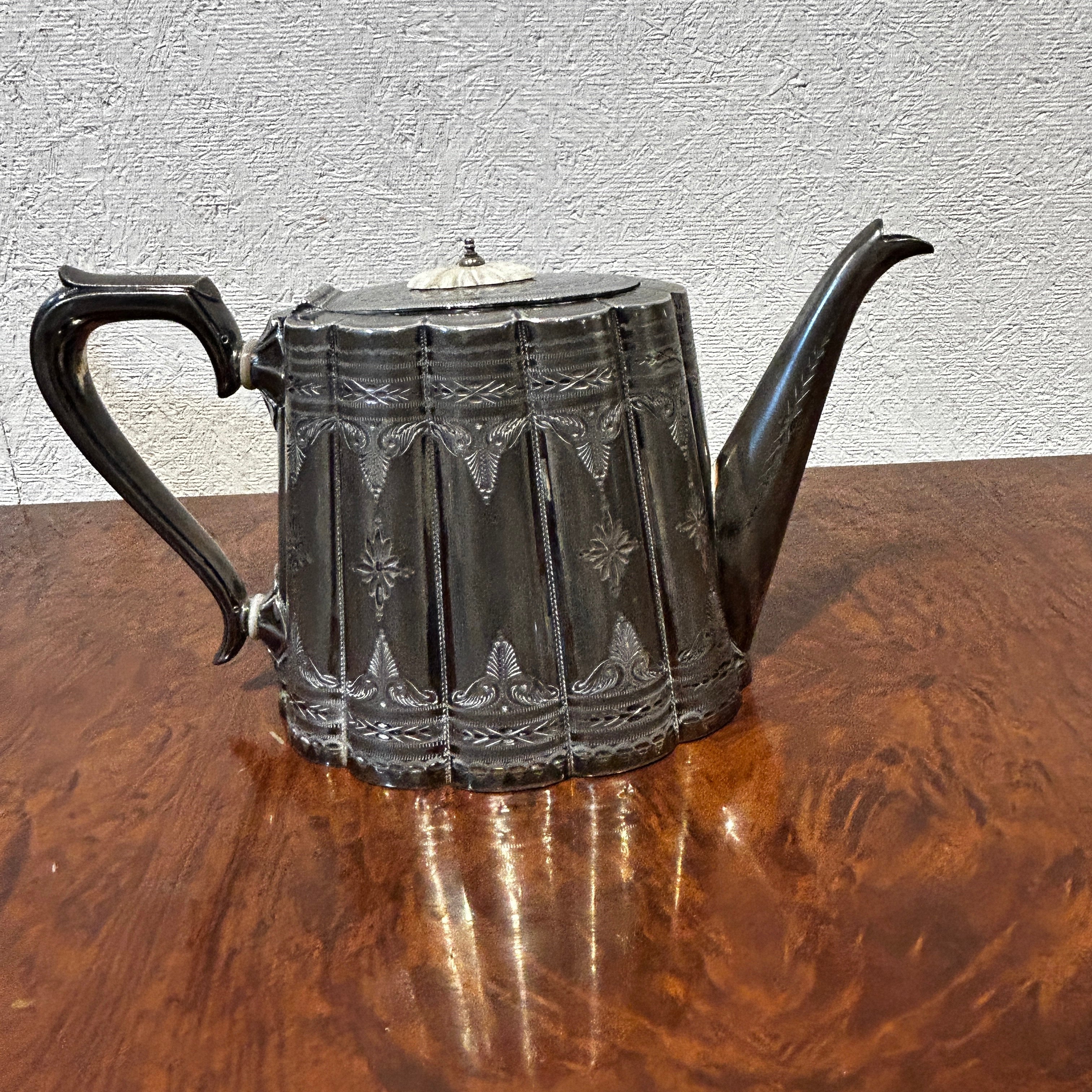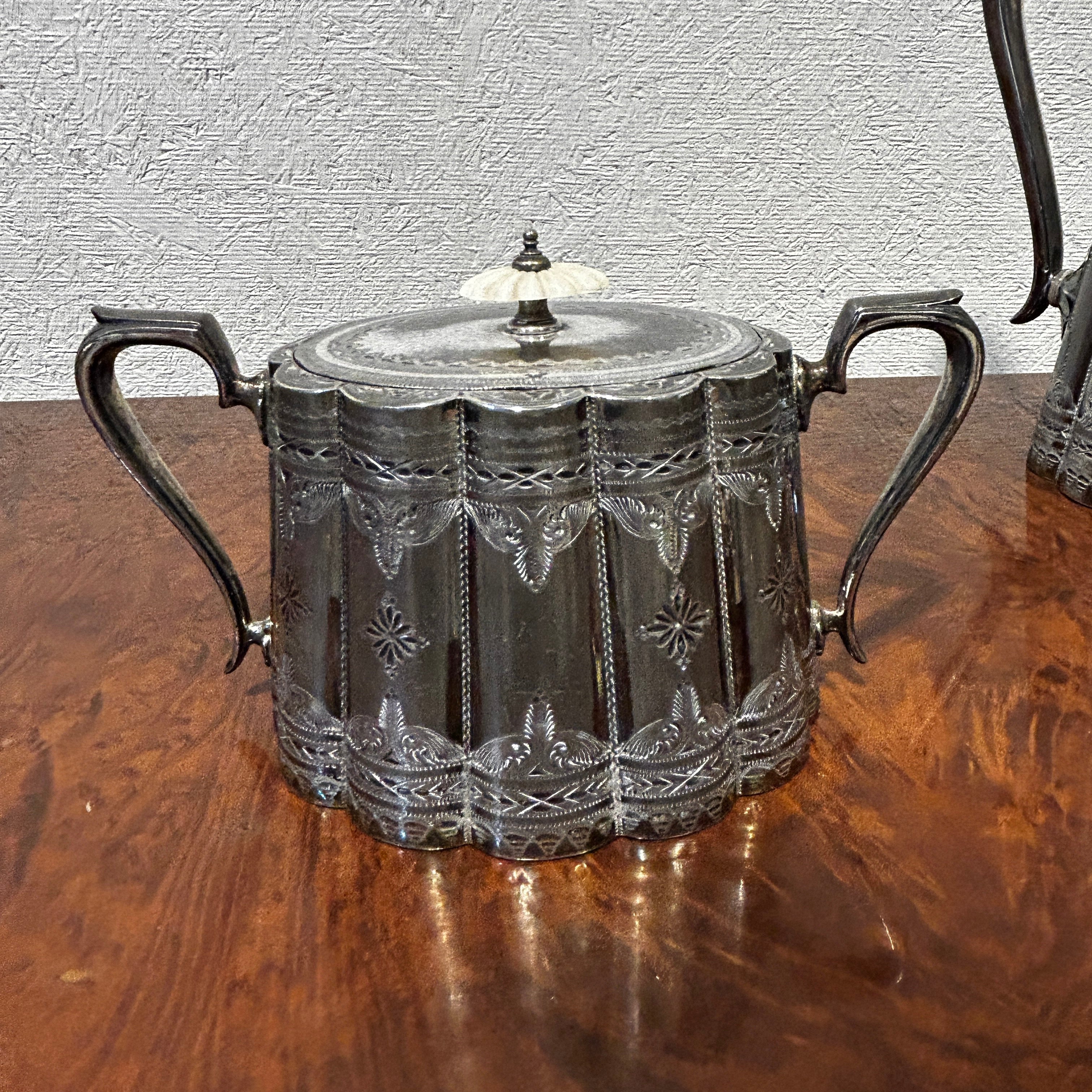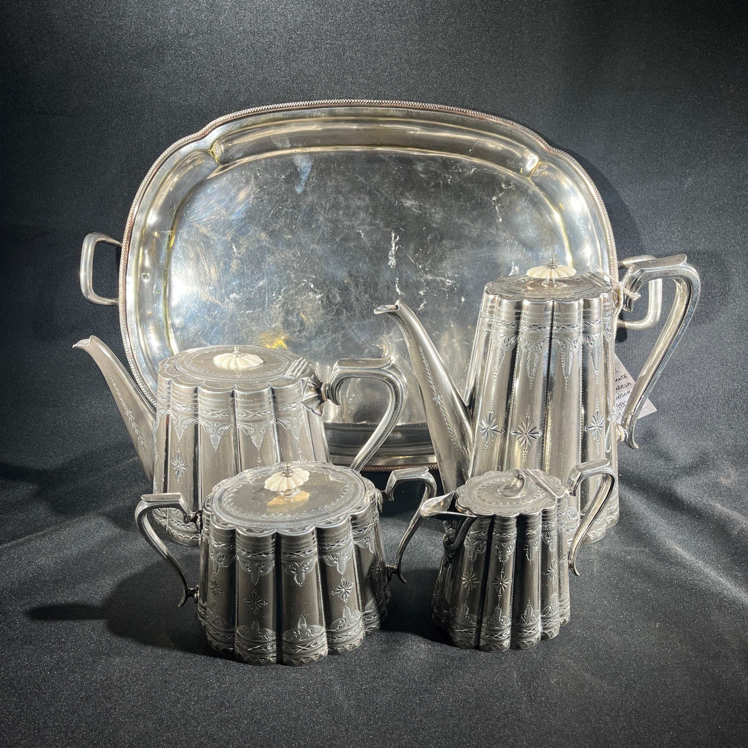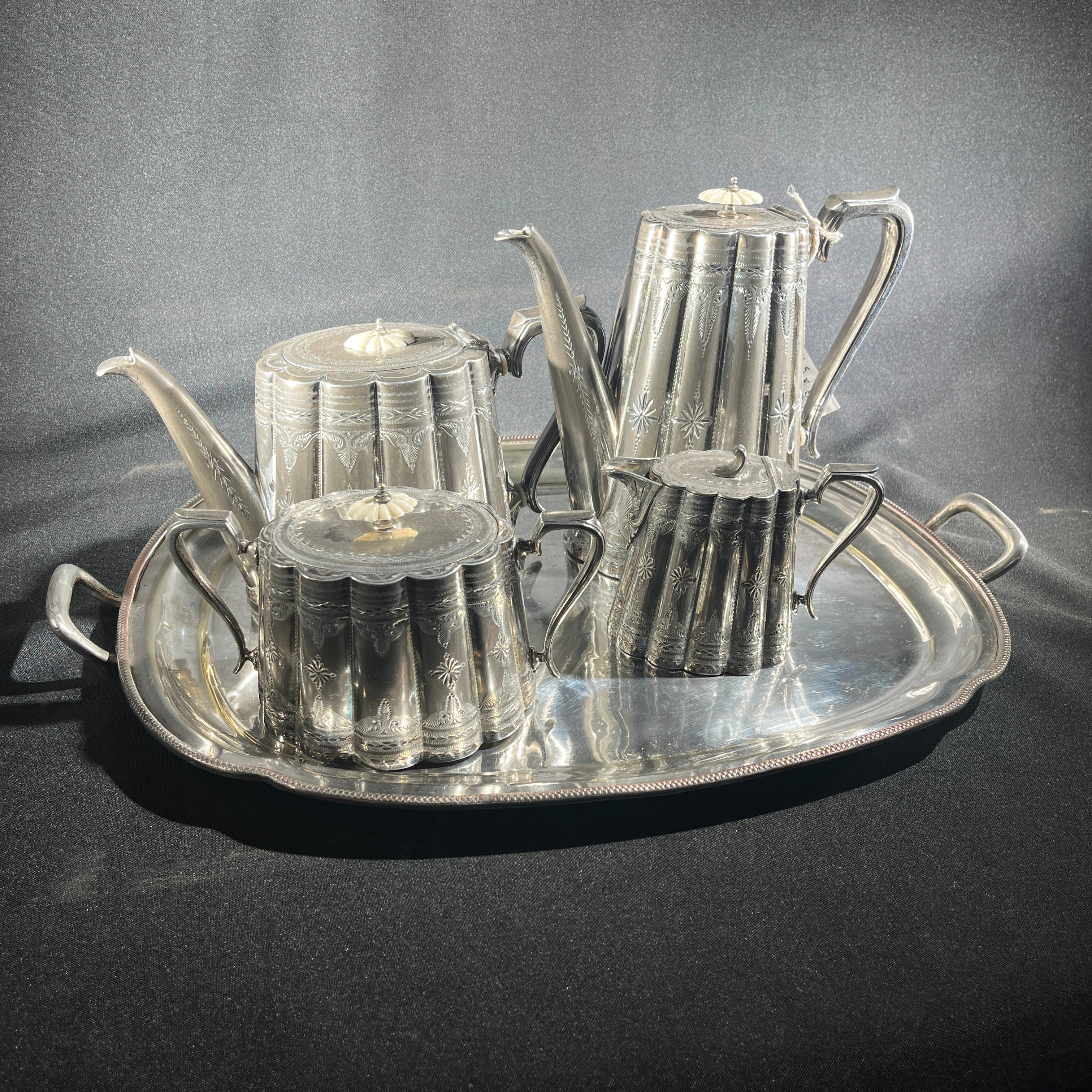 Juego de té de plaqué inglés Sheffield pre Art Nouveau con aislantes de marfil y bandeja de plaqué 5 piezas