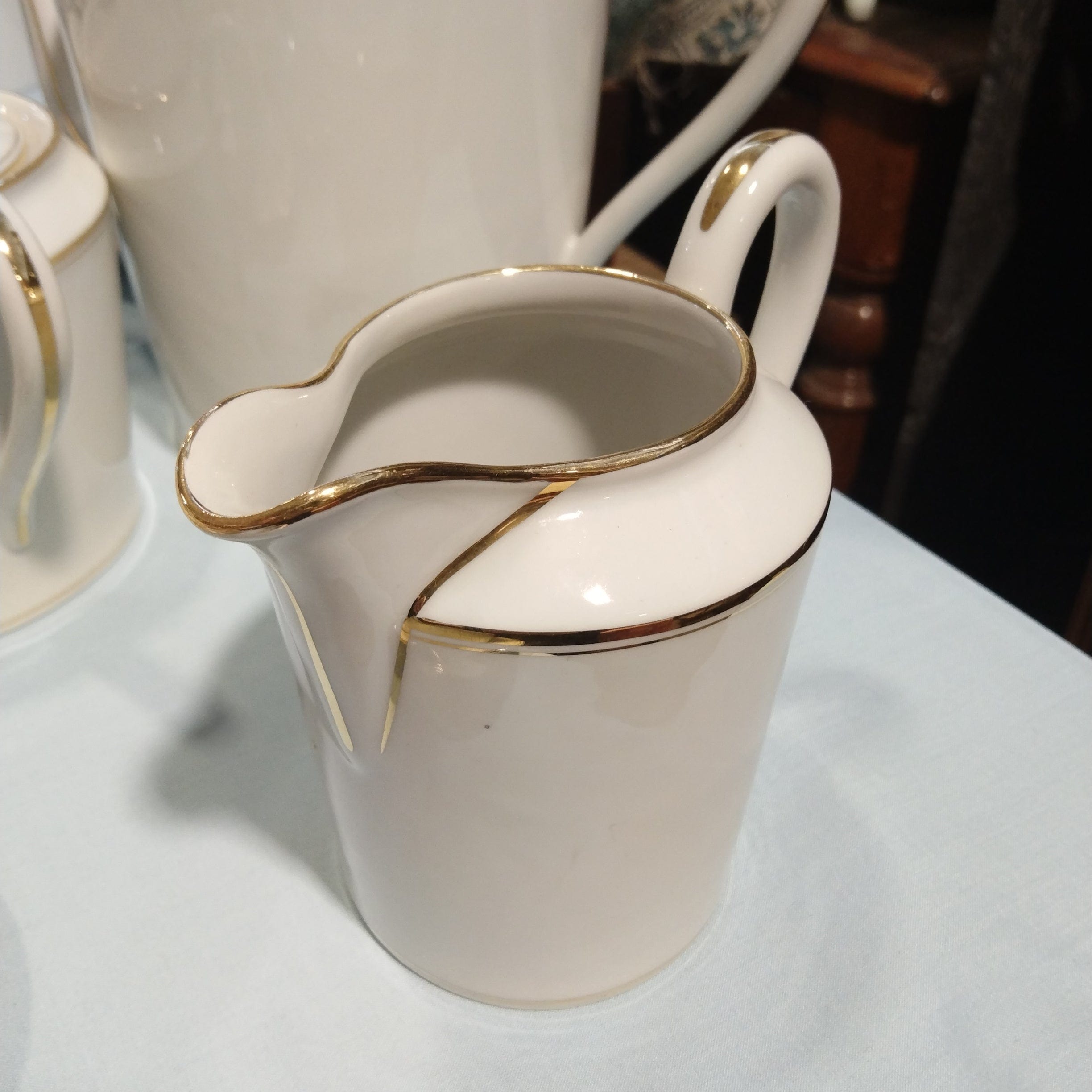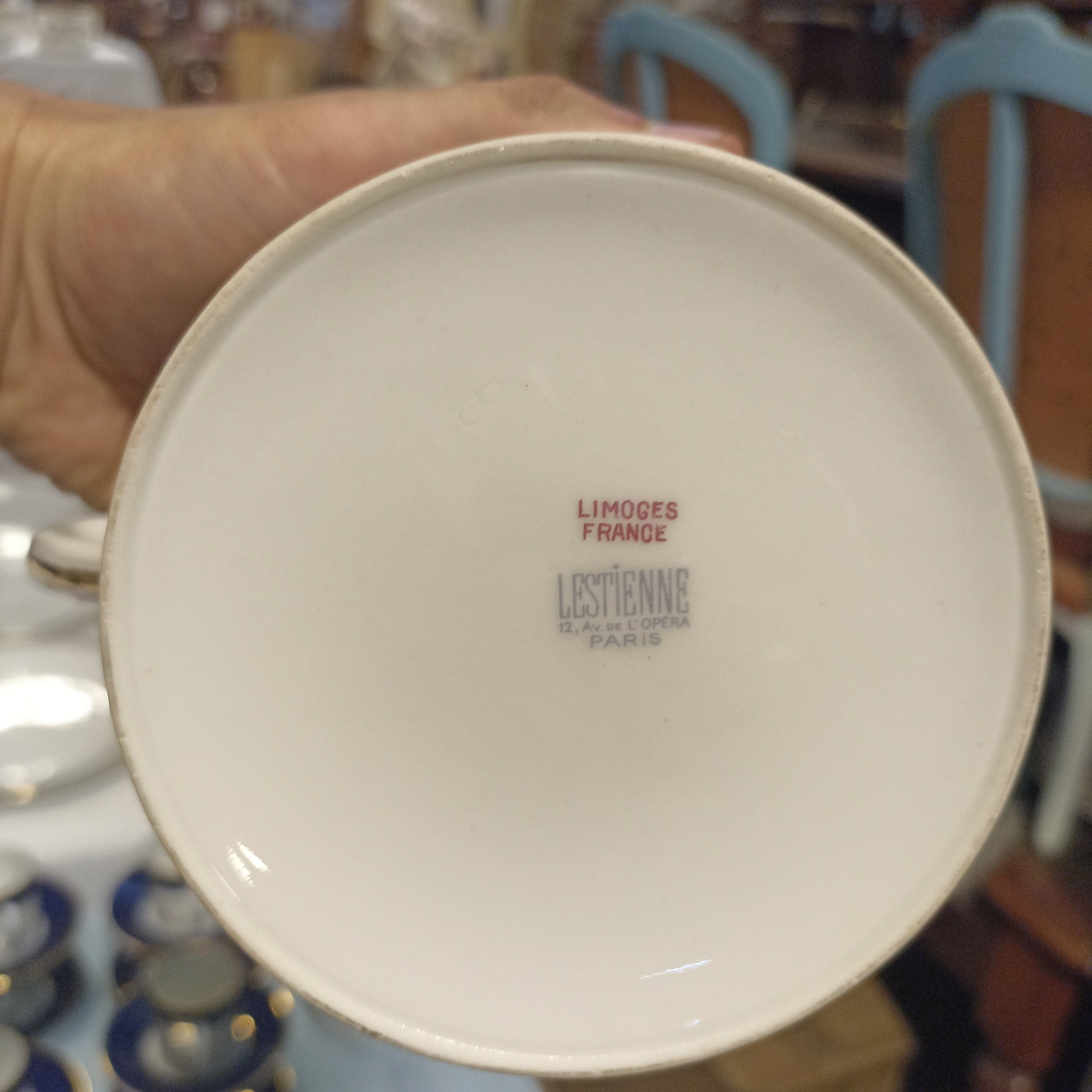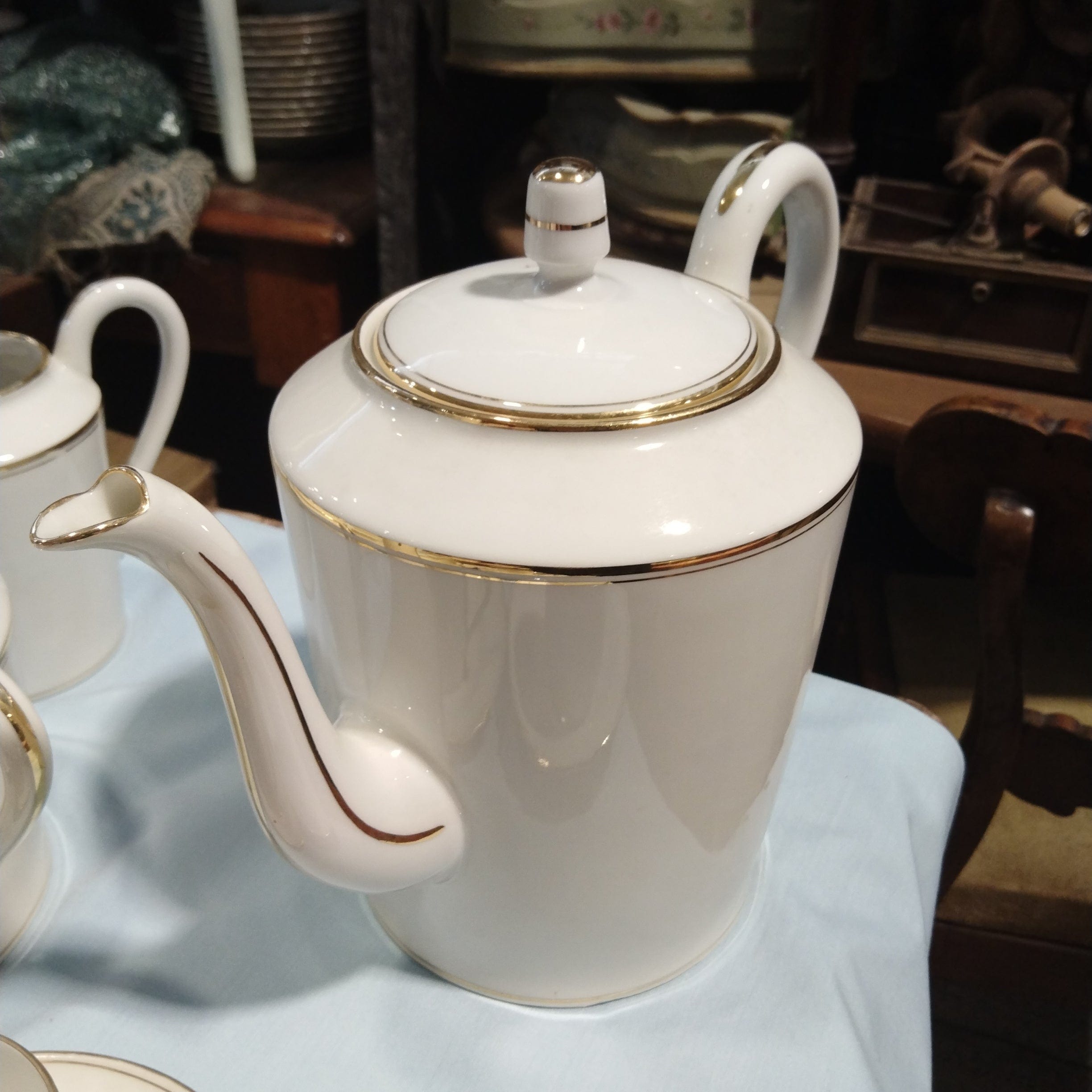 Elegante juego de té de porcelana francesa Limoges, con bellos detalles en dorado.