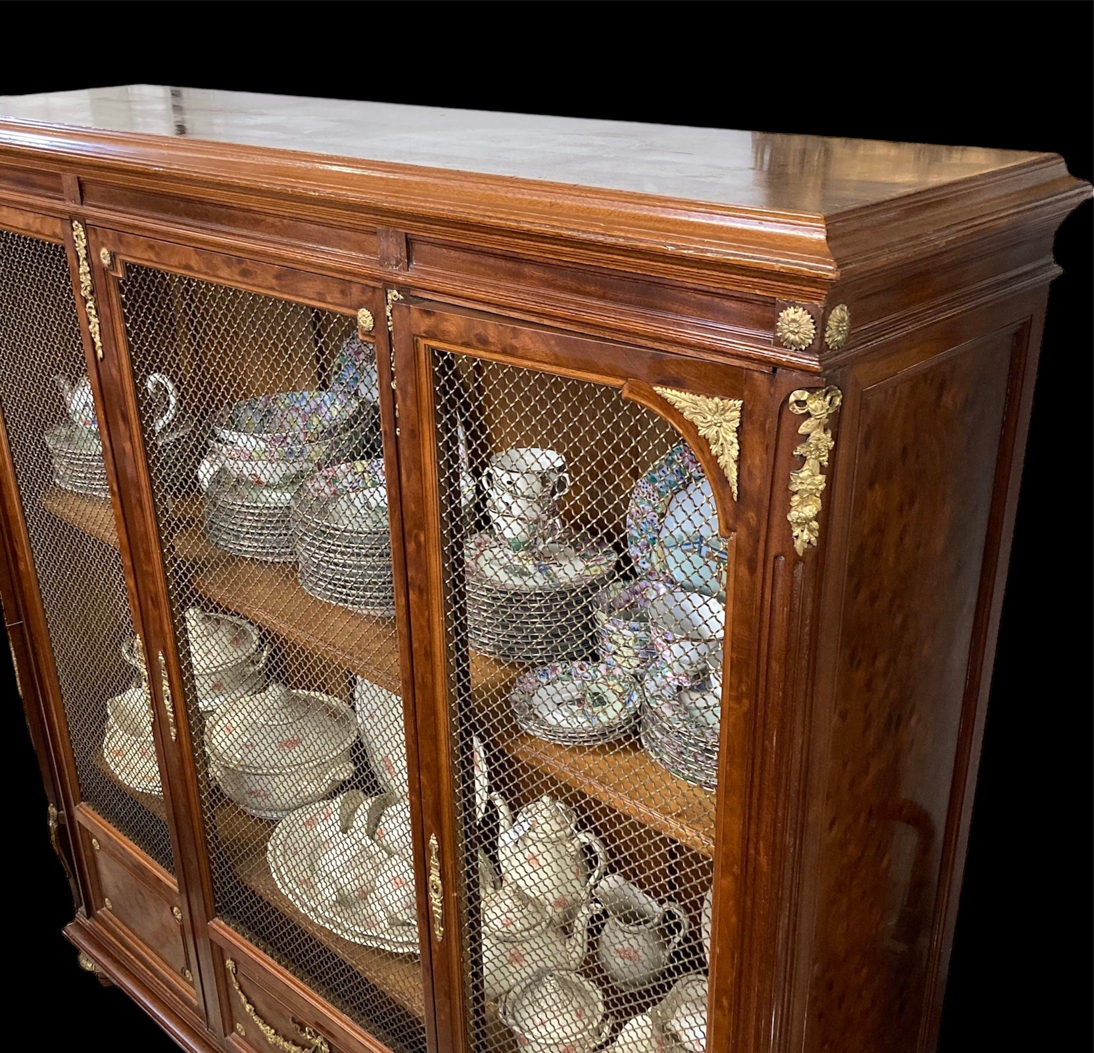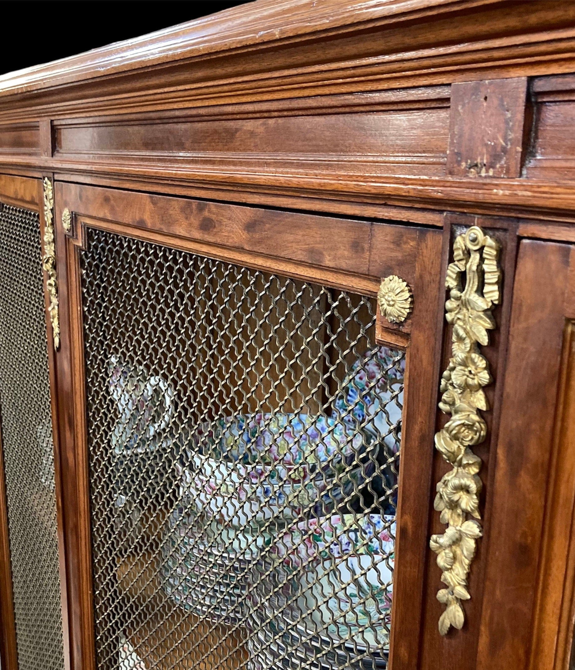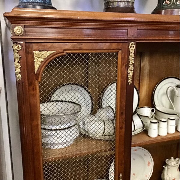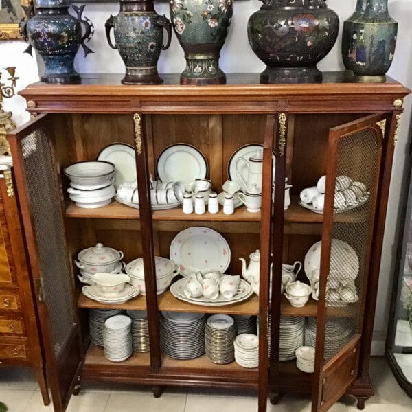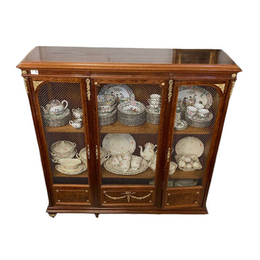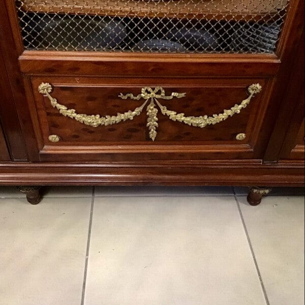 Amplio librero en madera de caoba. Cuenta con tres puertas con rejilla para ventilación. En el interior tiene dos niveles que le otorgan gran capacidad de organización y almacenaje. Cuenta con aplicaciones de bronce y cerradura con llave.