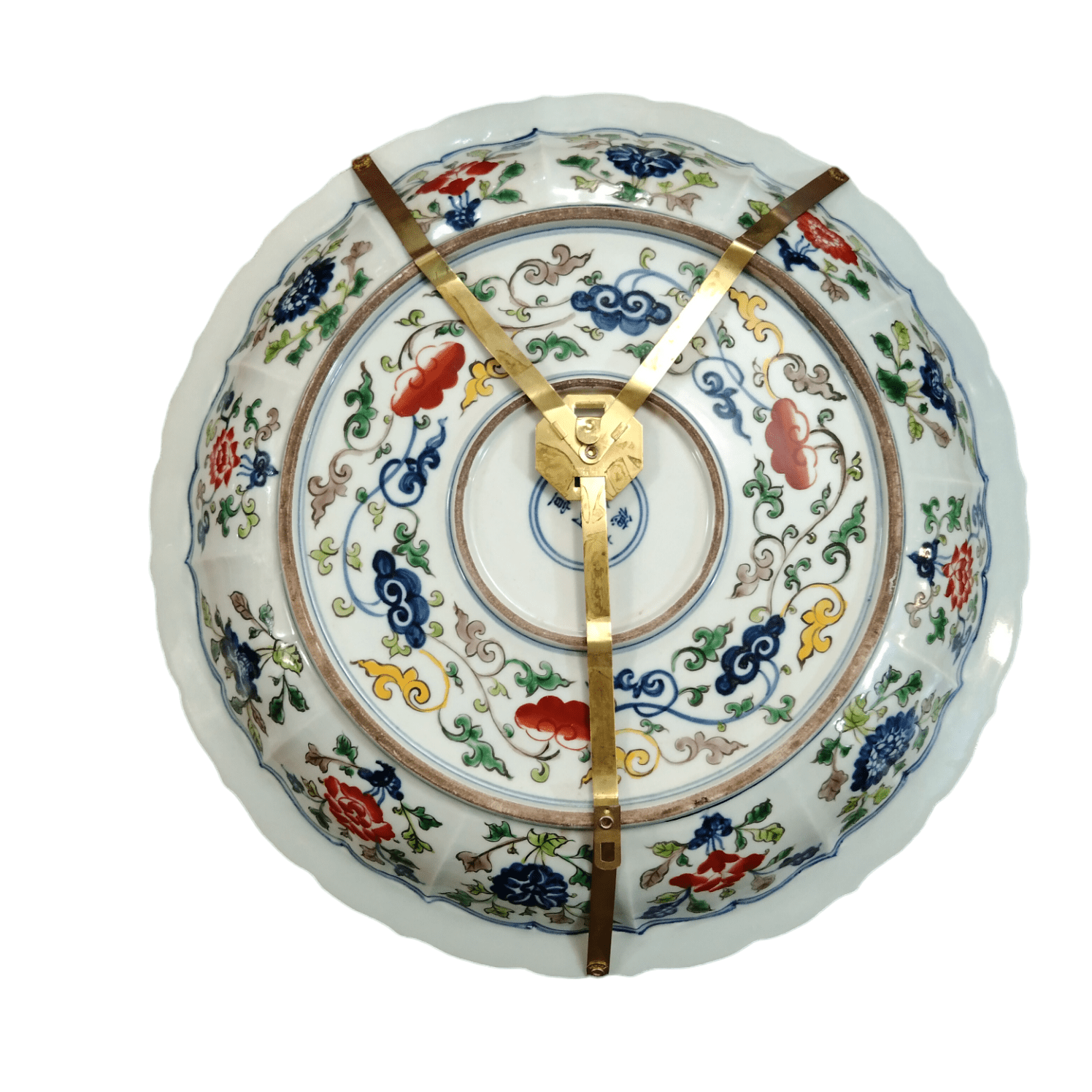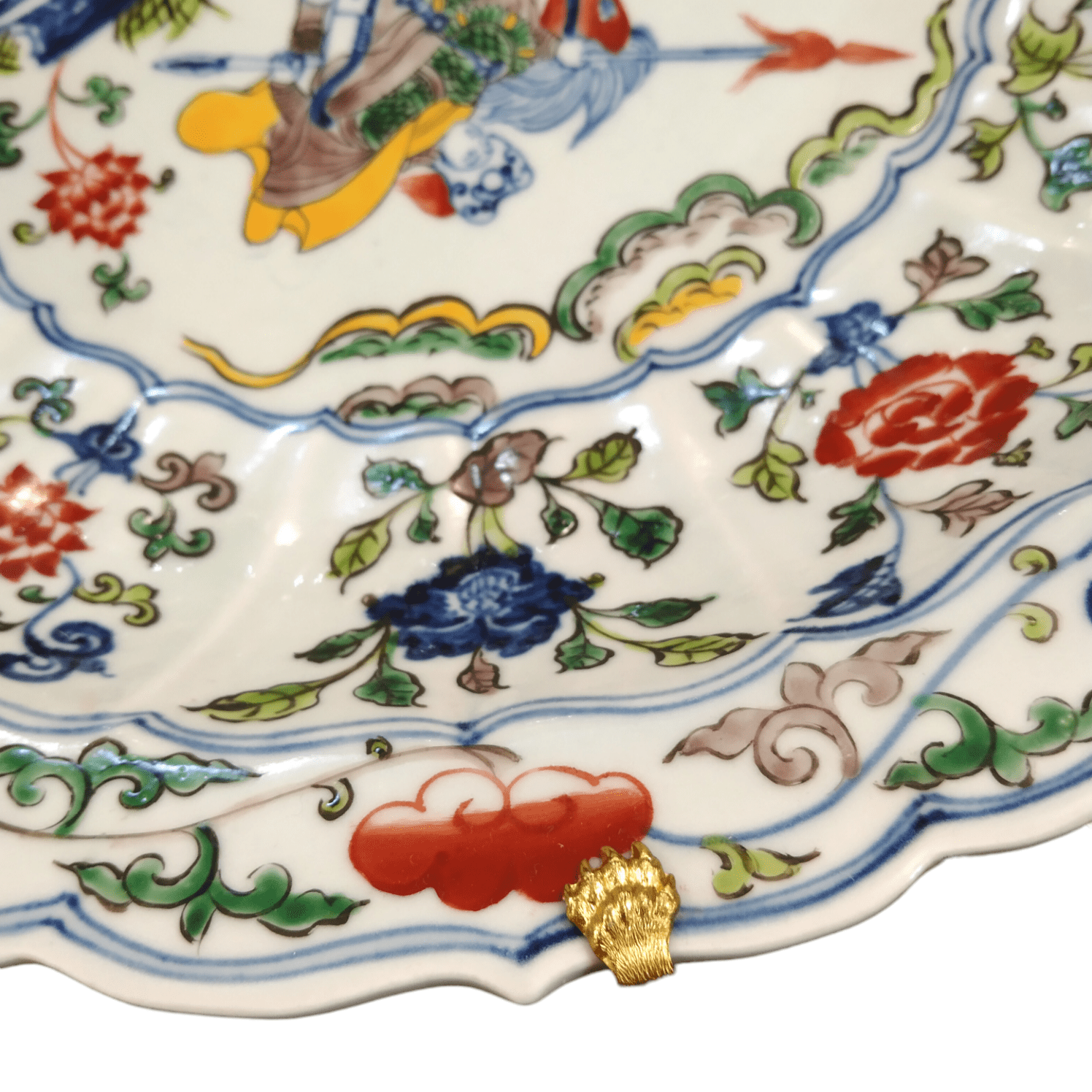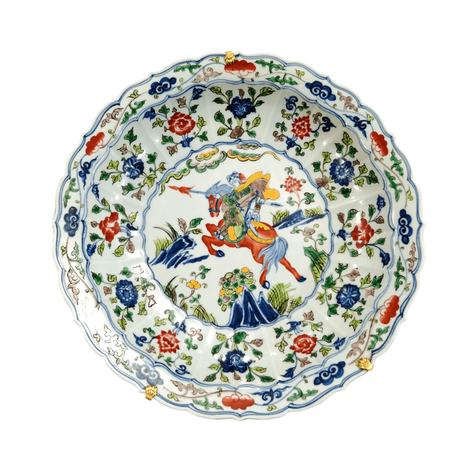 Pieza de loza decorativa con diseños pintados a mano en motivos florales, con un jinete y su caballo en el centro. Estructura de gancho dorado en su parte posterior que termina en unos bellos detalles dorados que afirman la pieza.