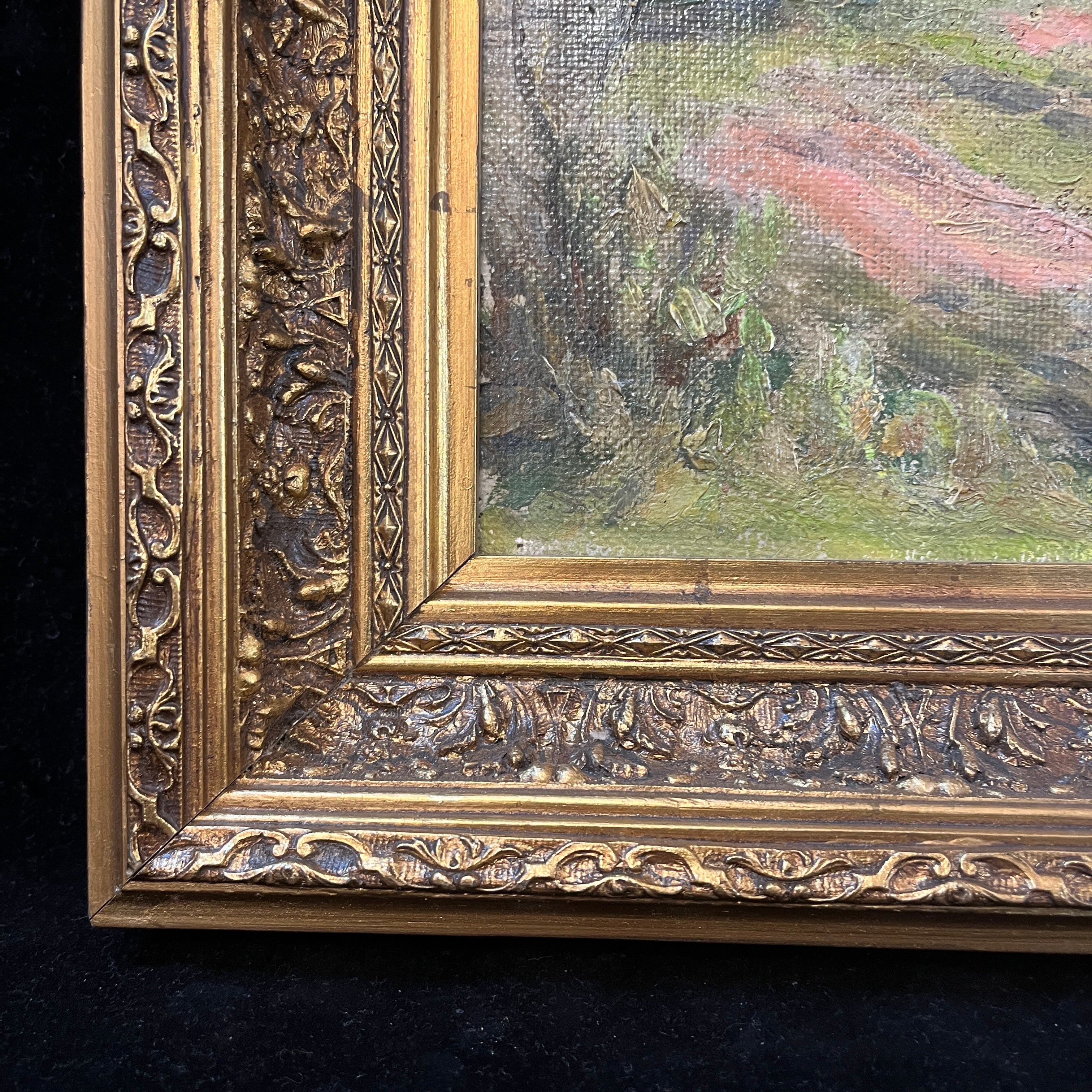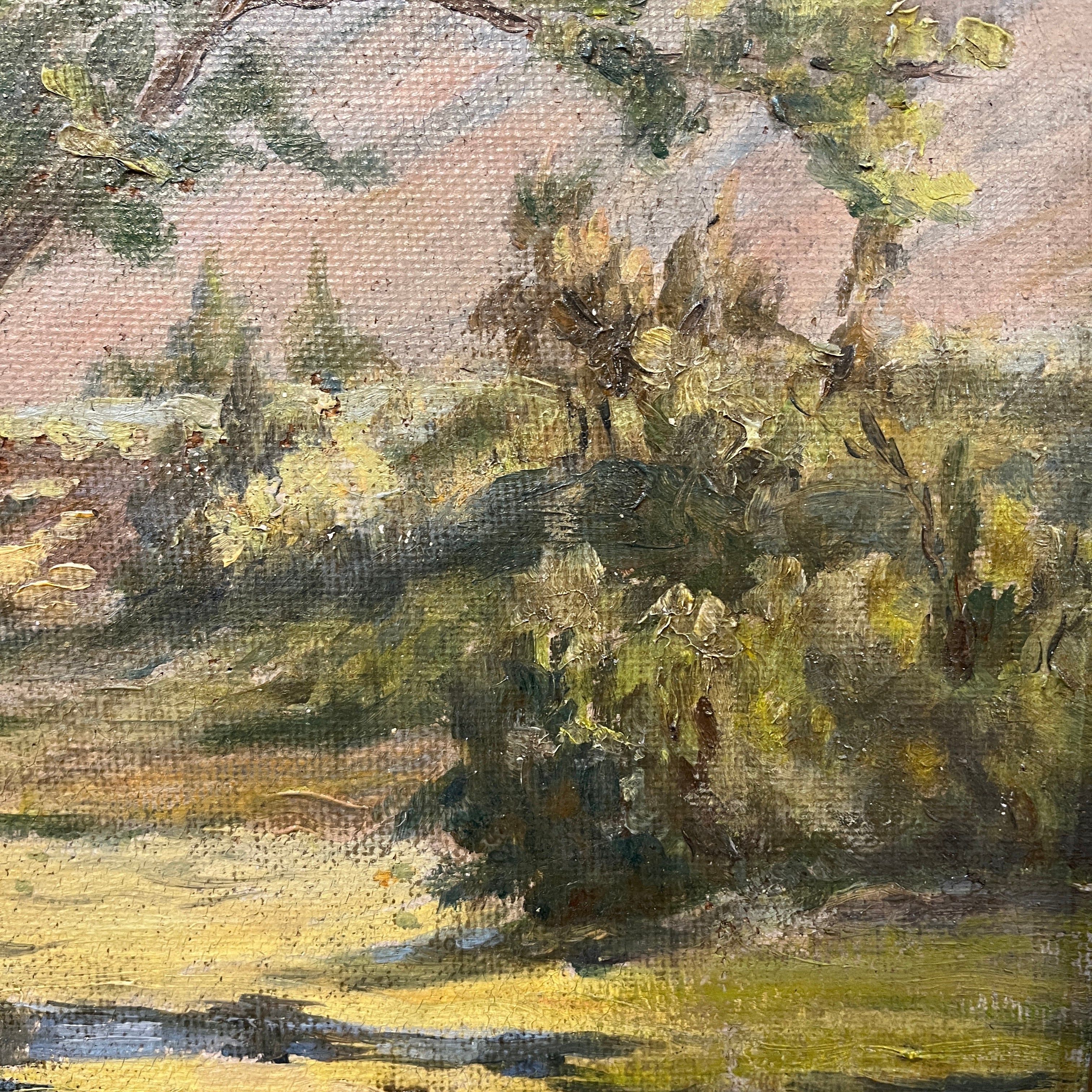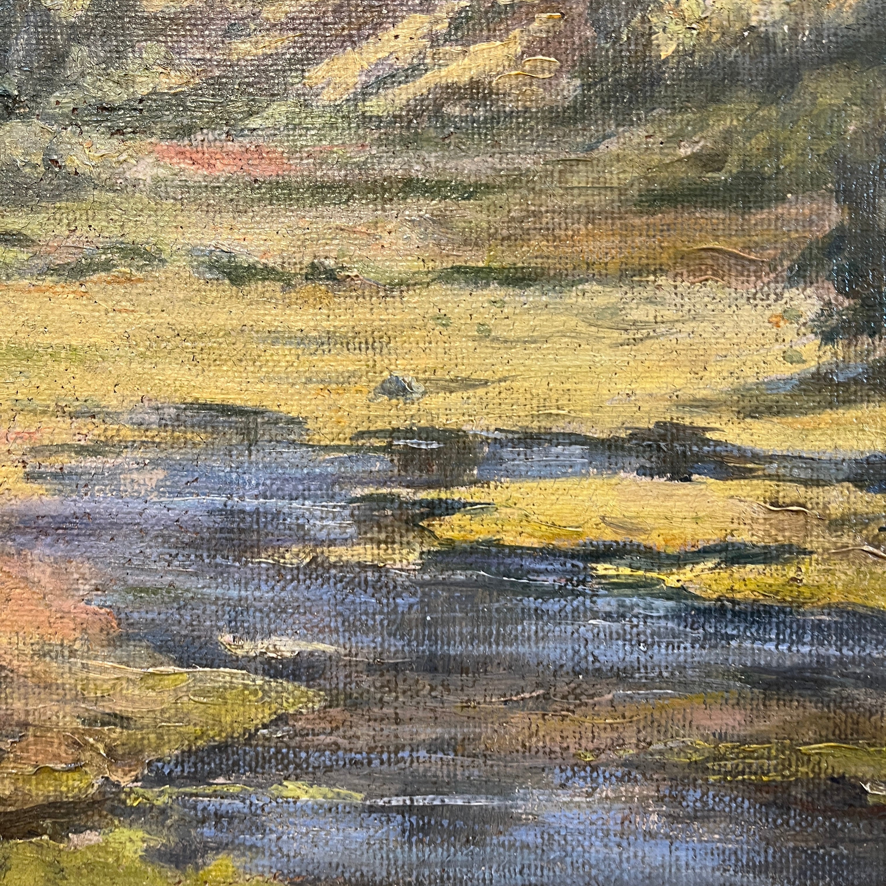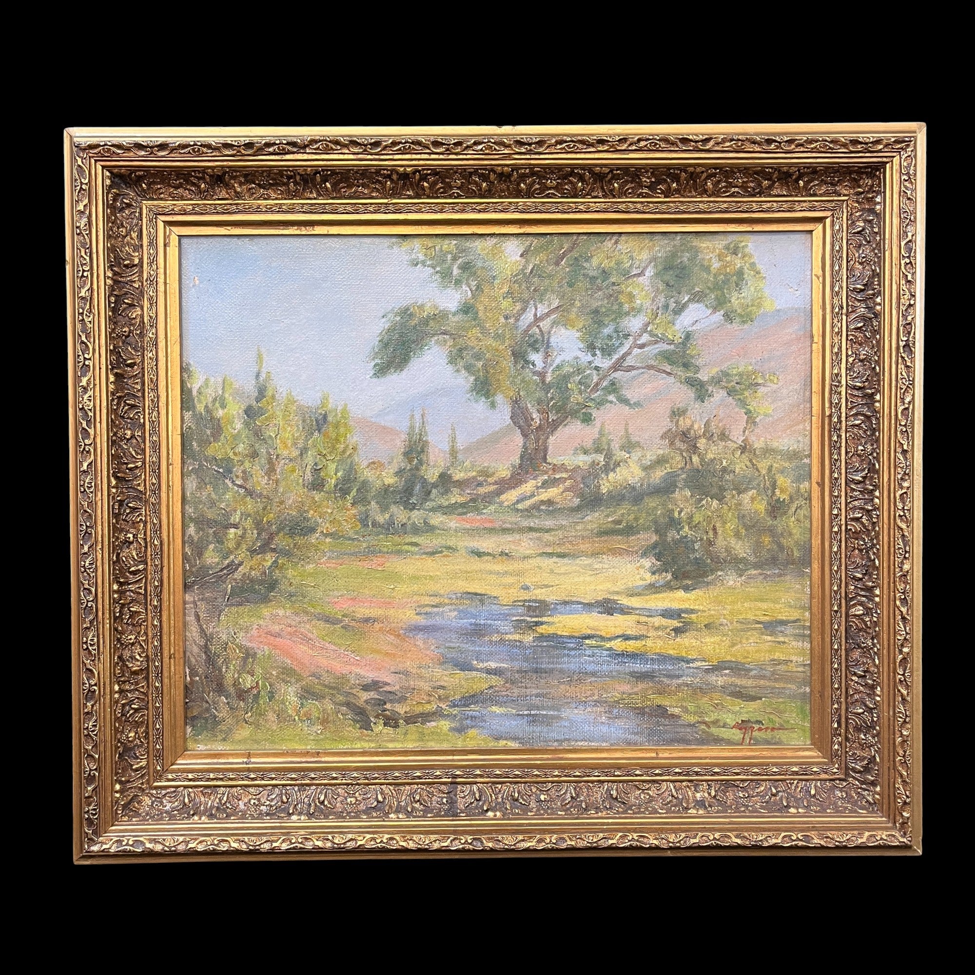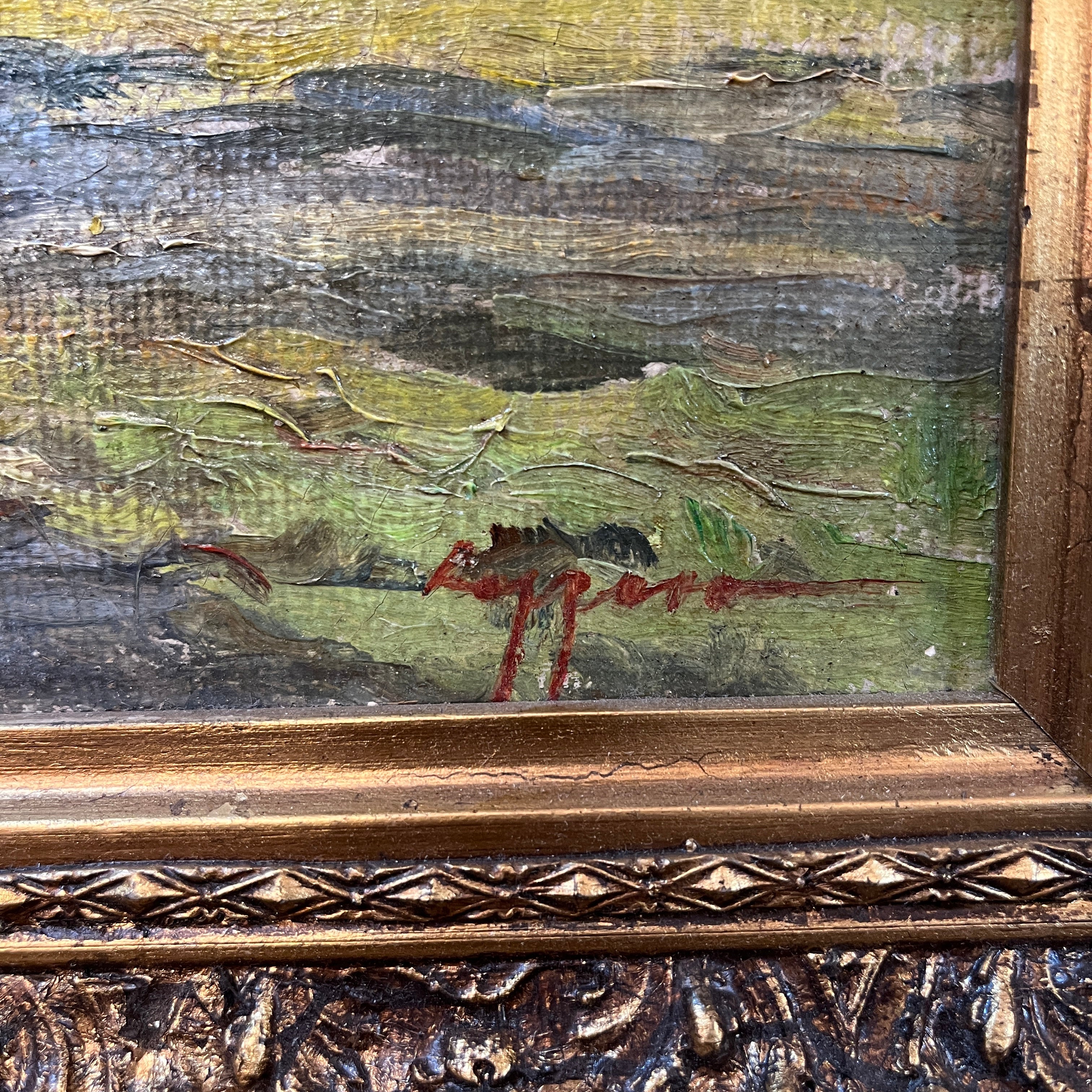 Hermoso óleo sobre tela del artista chileno Luis Lazzaro, representando un terreno bajo y con presencia de agua en el campo chileno conocido popularmente como "vega" o "veguita". La obra cuenta con un marco de madera y yeso pintado de dorado.