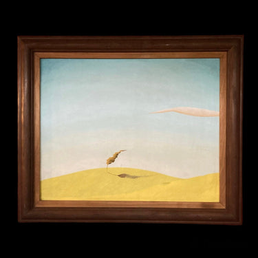 Óleo sobre tela del pintor chileno Marcos Farias. El cuadro retrata un paisaje campestre en tono onírico. Marco de alerce.