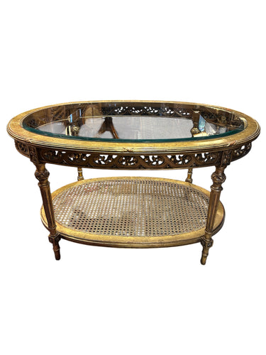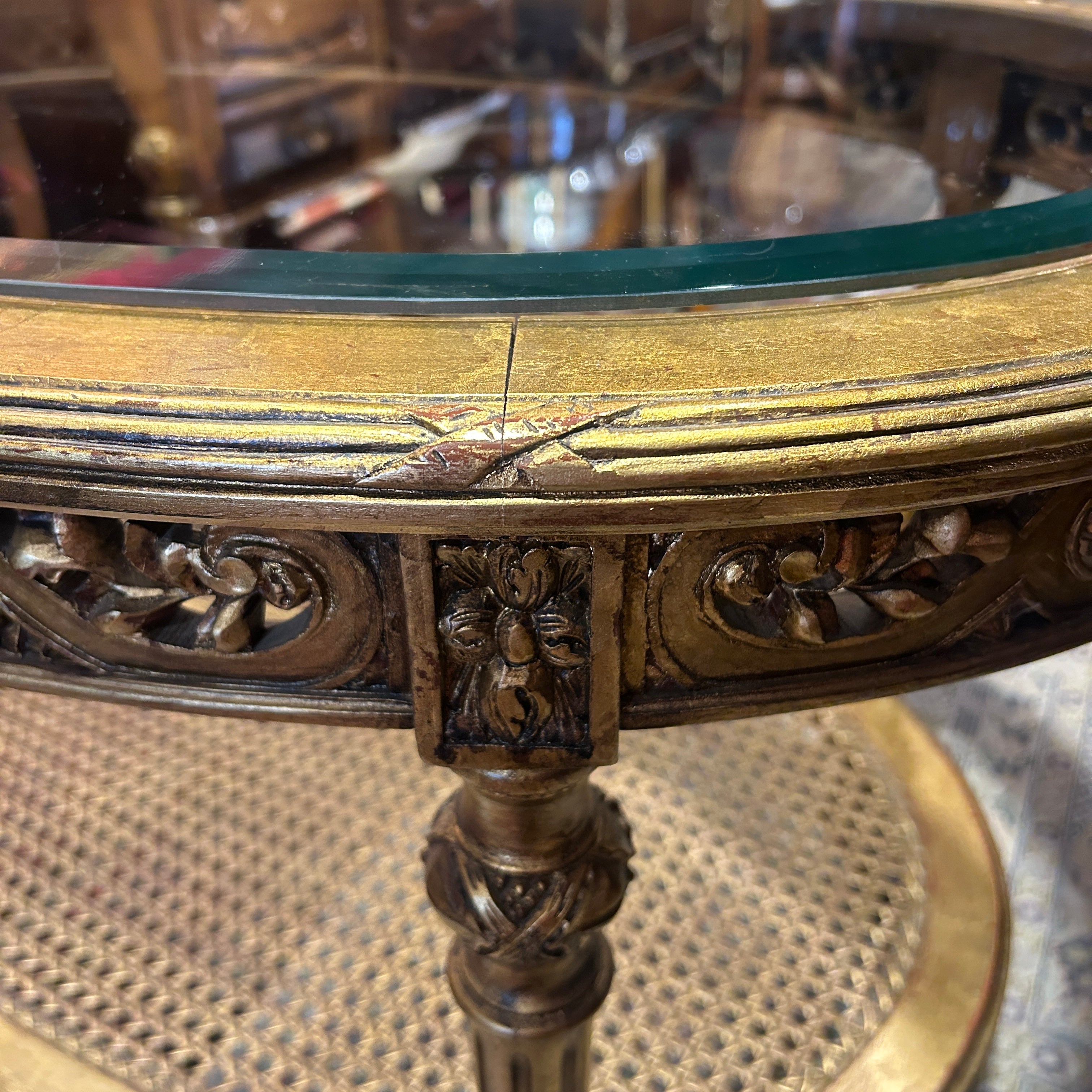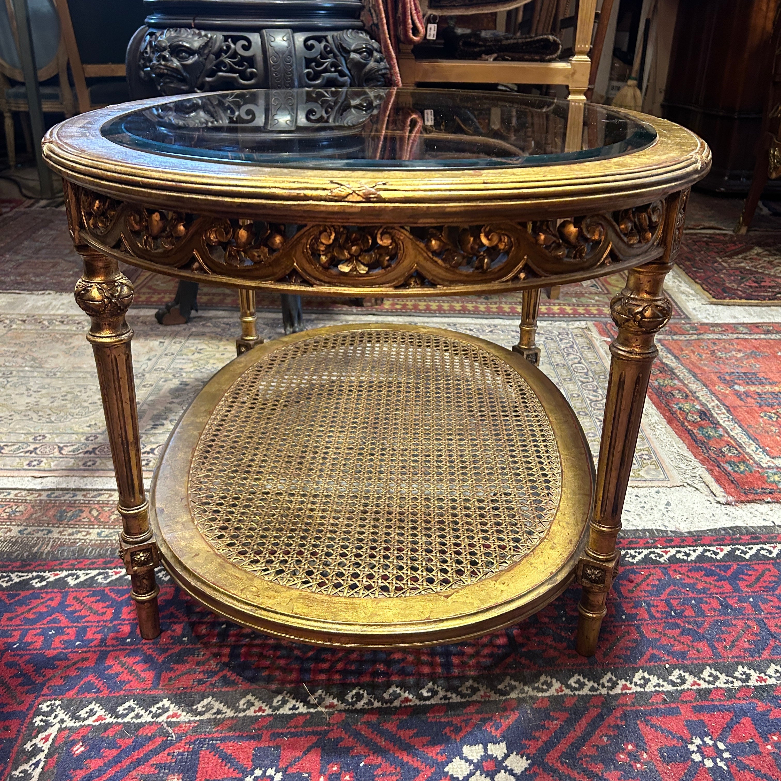 Bella mesa centro francesa de mitad del siglo XX, estilo Luis XVI dorada con doble cubierta. Tiene vidrio vicelado en la cubierta superior y junco en la cubierta inferior.