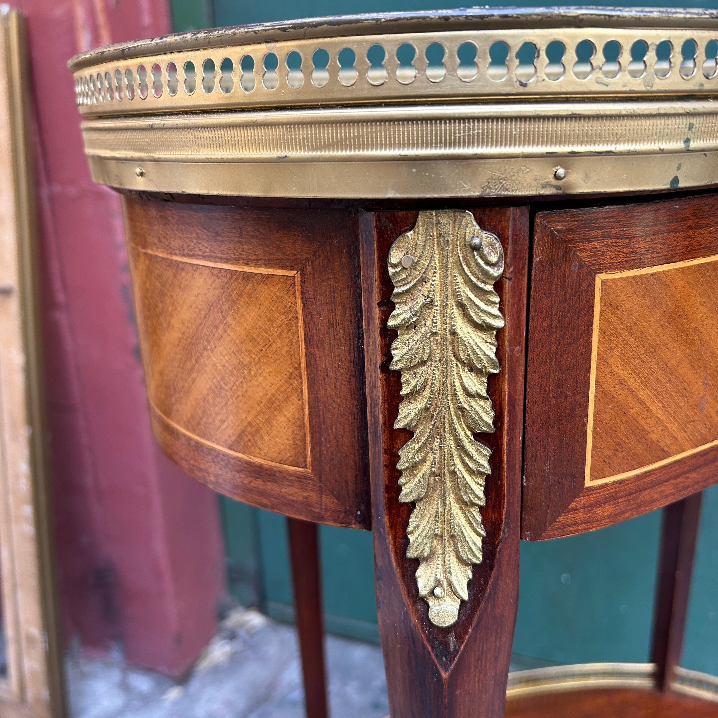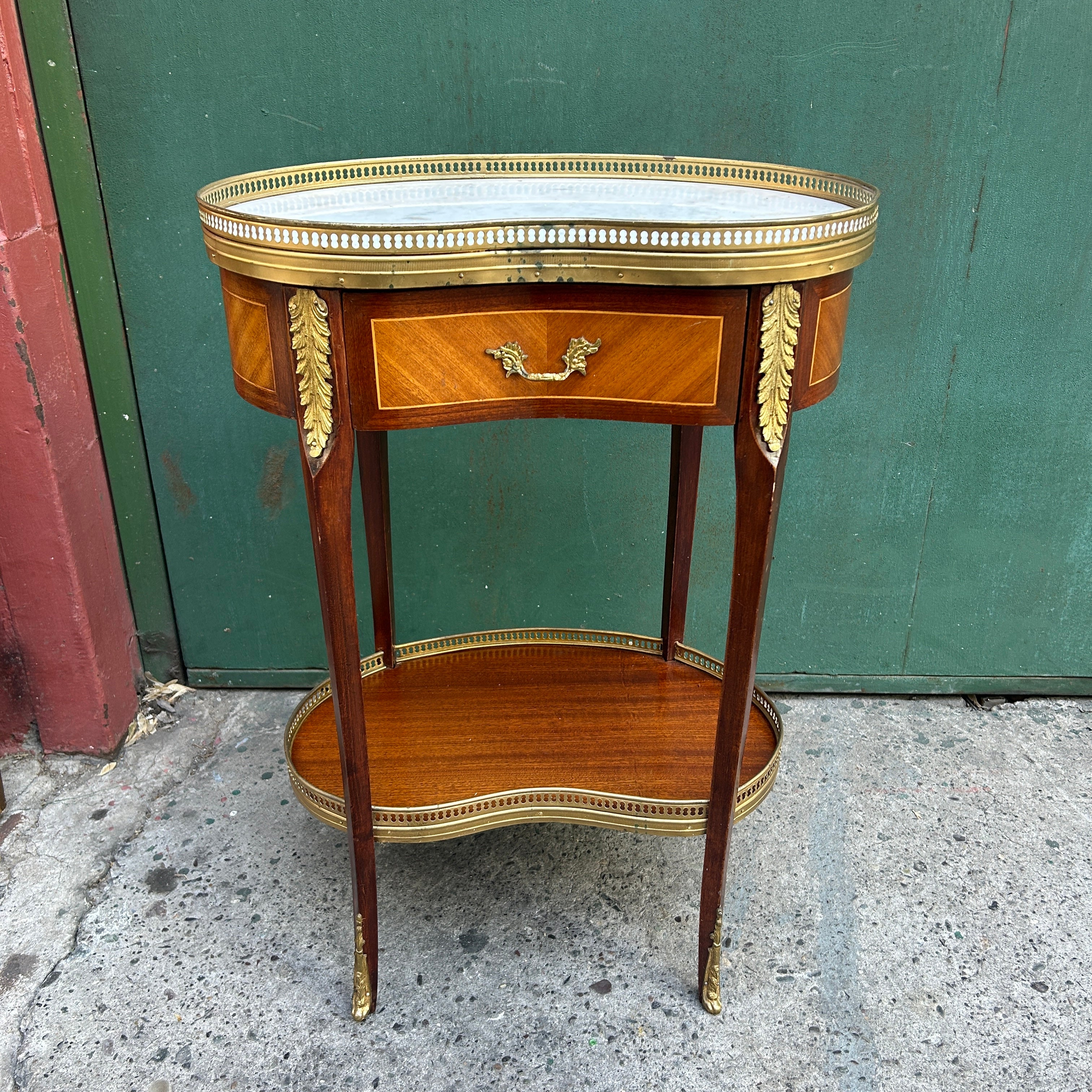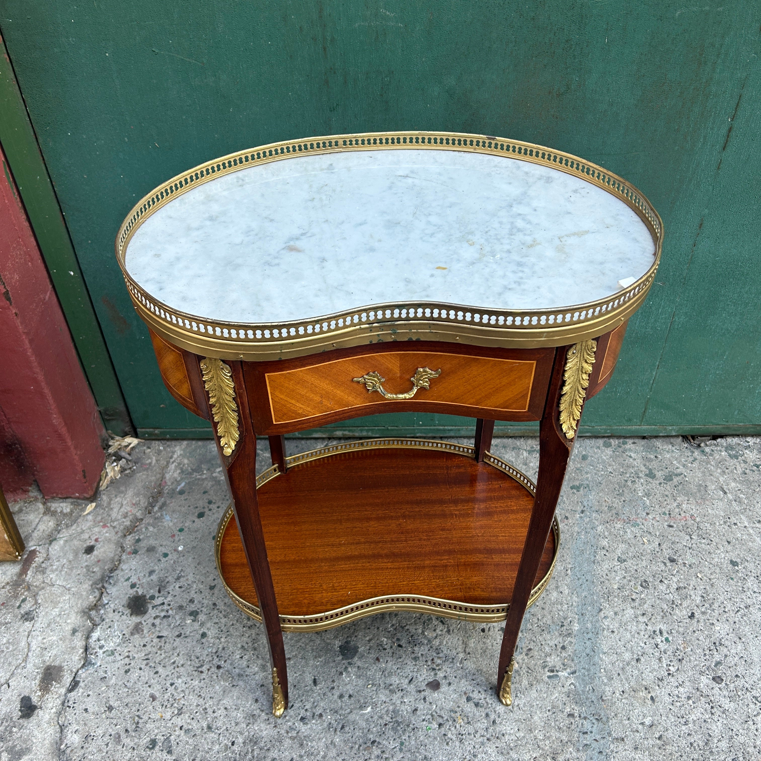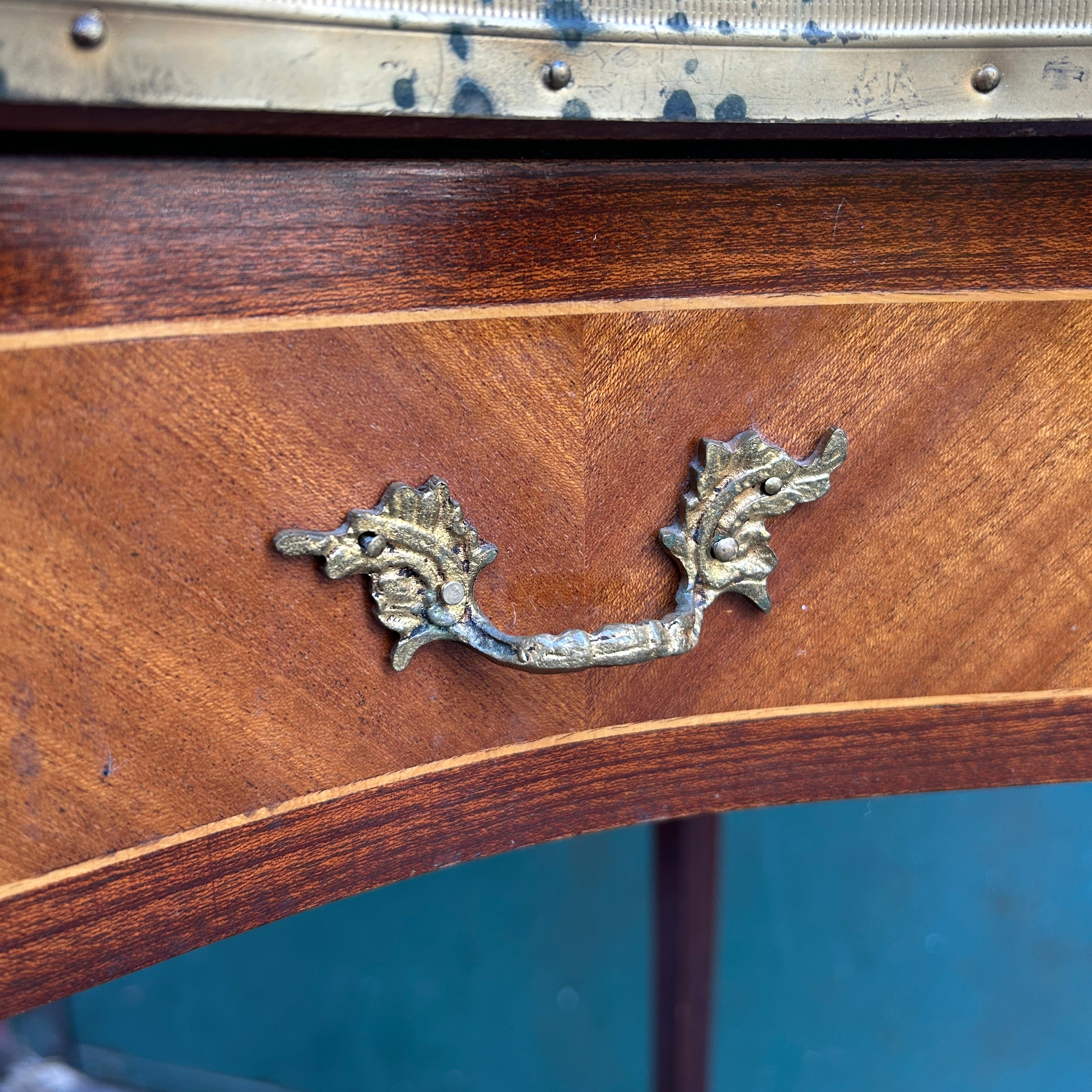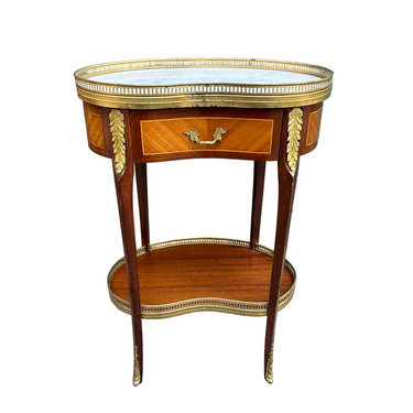 Bella mesa auxiliar, de origen francés estilo Luis XV, con forma de riñón. La mesa, de madera enchapada en caoba, tiene una elegante cubierta de mármol y aplicaciones, tiradores y cintillos de bronce en su galería. Además del espacio de su cubierta, tiene un cajón para almacenaje y una galería inferior.