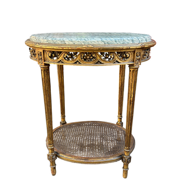 Bella mesa de apoyo francesa estilo Luis XVI, hecha en madera tallada con decorados calados, patas talladas, una bandeja inferior con enjuncado y elegante cubierta de mármol verde veteado.